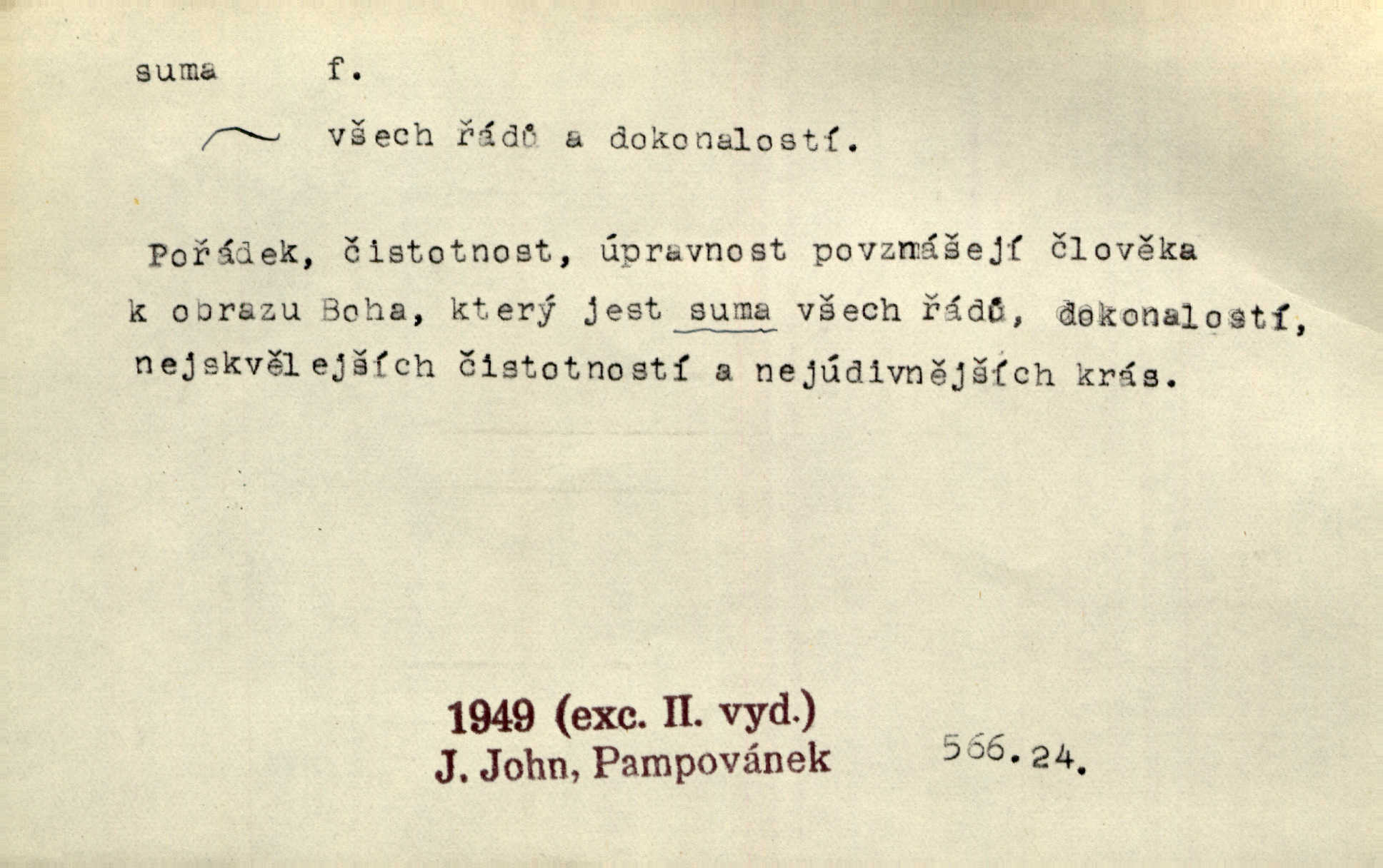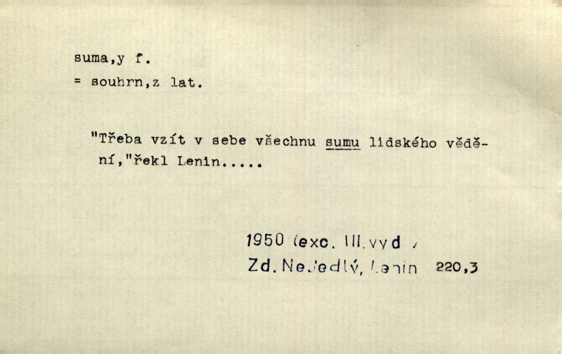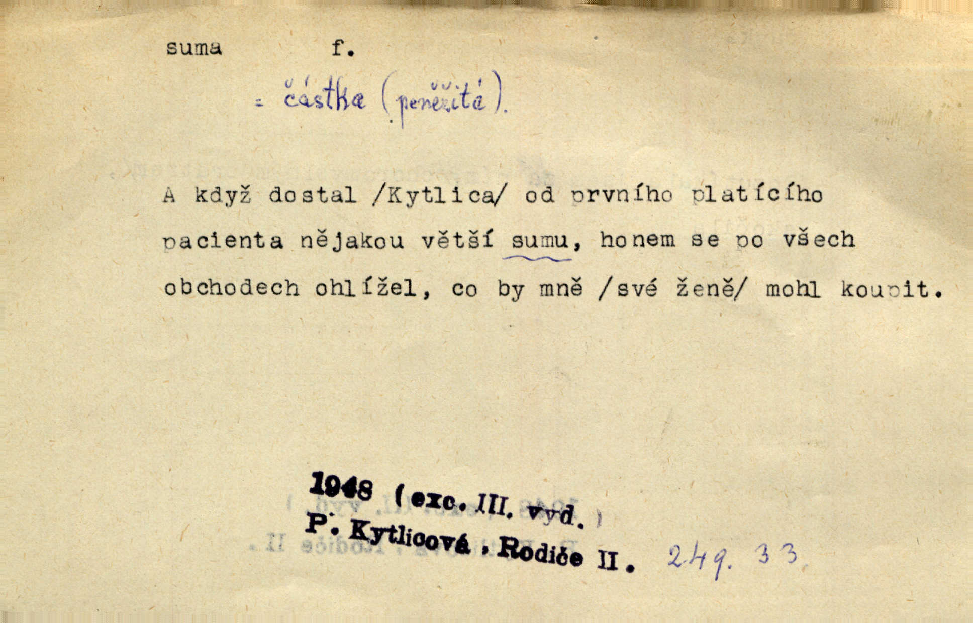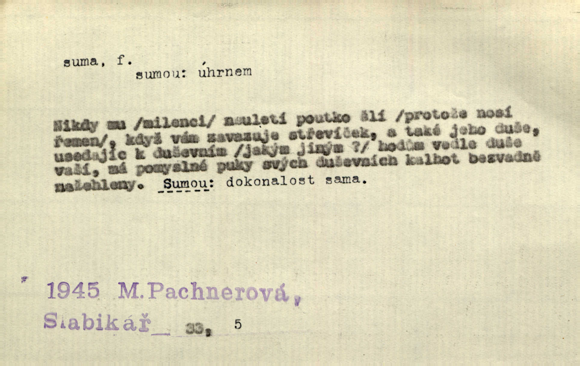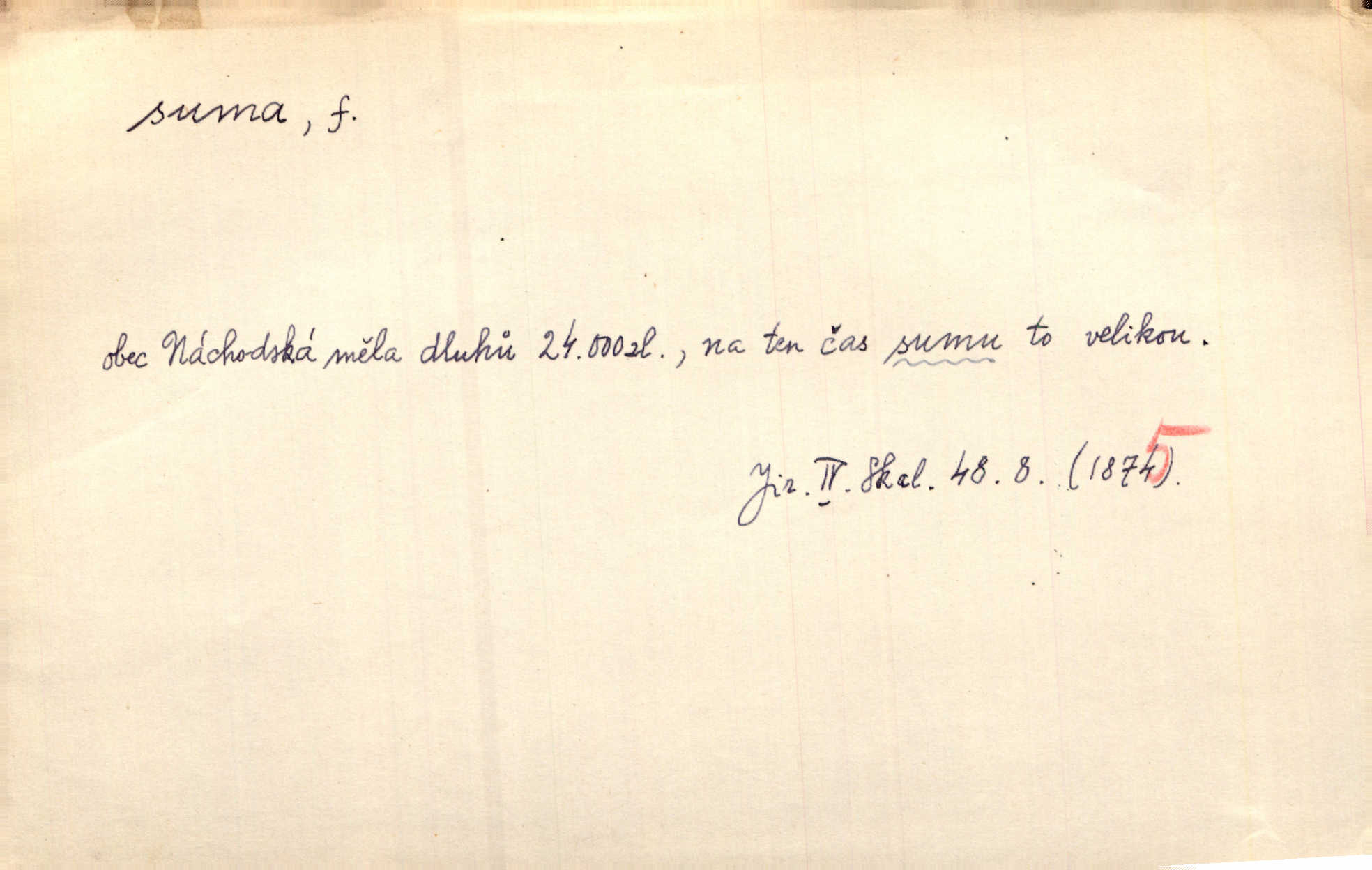 - suma, -y f. (větší) množství peněz, částka. Policie pátrala po členech tajného spolku, vypisovala ohromné sumy na jejich hlavy. Zey. Obec Náchodská měla dluhů 24 000 zl., na ten čas sumu to velikou. Jir. Vyléval v nich [básních] mnoho bolu a shrábnul za ně značnou sumu. Sob. Jaké úžasné sumy peněz vyhazují se za věci, které jen zdánlivě sloužiti mají k ozdobě. V. Mrš. Osmdesát tisíc zde leží po tři měsíce bez úroků. Taková suma! Bozd. D Řidč. (větší) množství něčeho vůbec. Již pouhý výčet vám naznačí tu sumu materiálu, již kniha zpracovává. Čteme. Mdloba a rozčarování splývalo v jedinou ohromnou sumu lásky. Sez. Summa vědomostí nepovznáší lid, aniž ho vzdělává; lid jako národ vzdělává se pouze summou své historie. Staš. D Poněk. zast. celkový počet, souhrn, úhrn. Summa všech domácích obyvatelů království [je]: 3,686.363. Pal. Cesta do Prahy byla nepochybně summou vší vévodovy ochoty. Pek. Suma vášně deseti nejohnivějších Evropanek nevyrovná se její lásce. Lier. D Zast. jádro, souhrn nejpodstatnějších částí nějakého celku. Náboženství podle Bonusa, abych podal nejstručnější summu z něho, jest pro člověka, ne člověk pro náboženství. Šal. Ukojení [vášní] považuji za cíl a summu svého života. Hol. Pryč od lidí, to suma moudrosti. Jir. Suma návrhu Hlasivcova byla, aby obtížná robota [byla] zrušena. Jir. D suma sumárum zast. hovor. celkem, úhrnem. A suma sumárum — starý macek si mě oblíbil. Herrm. — V. t. sumou.