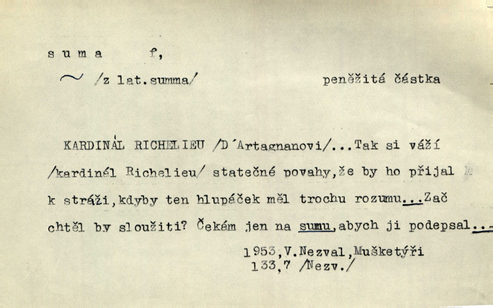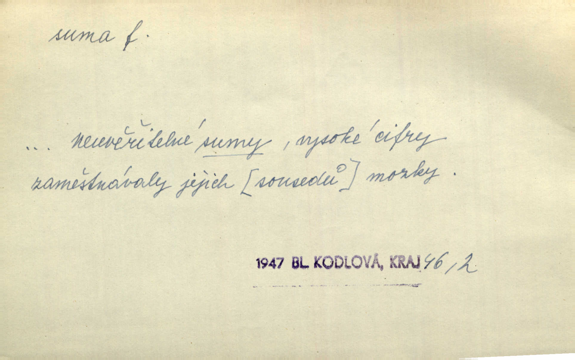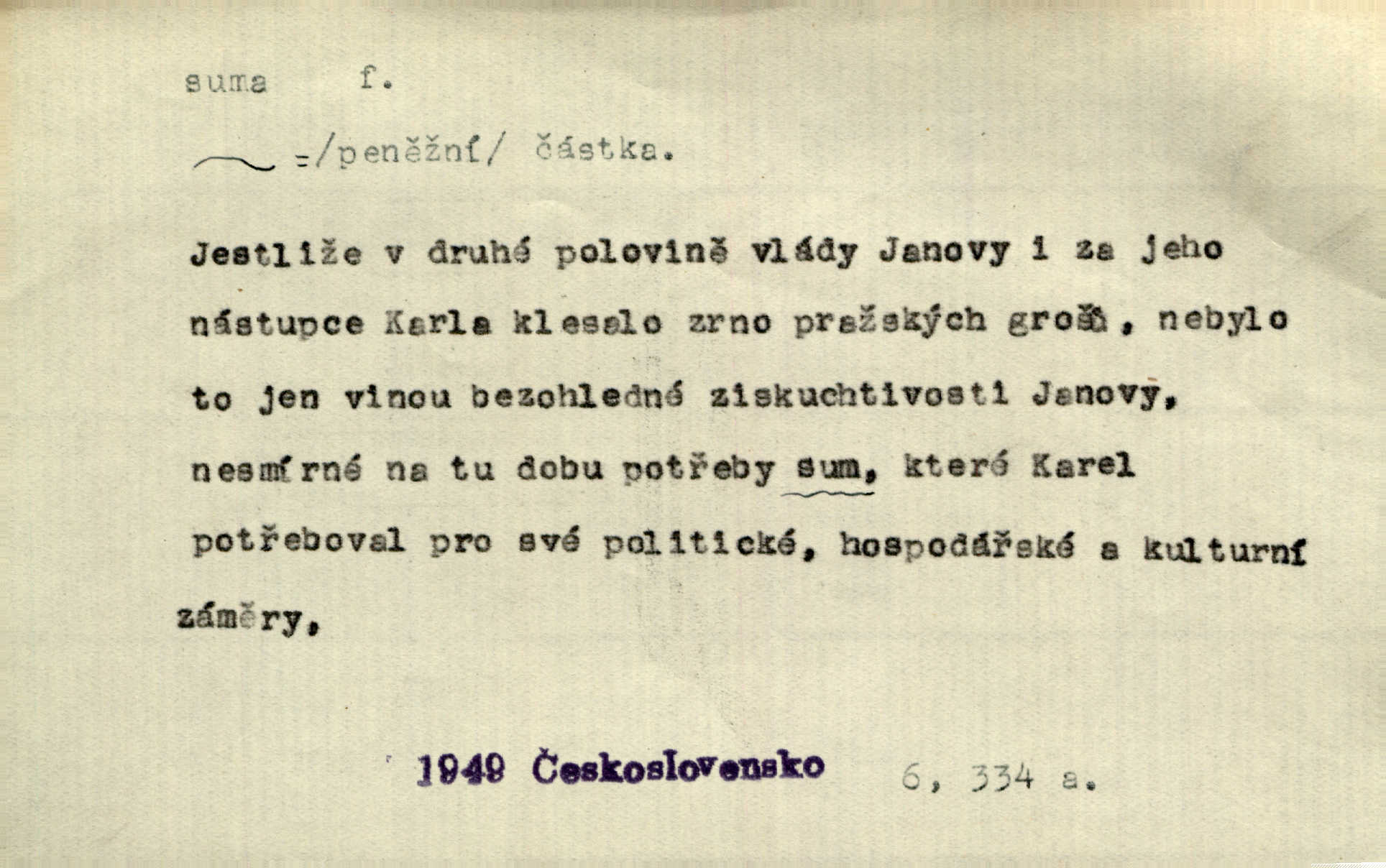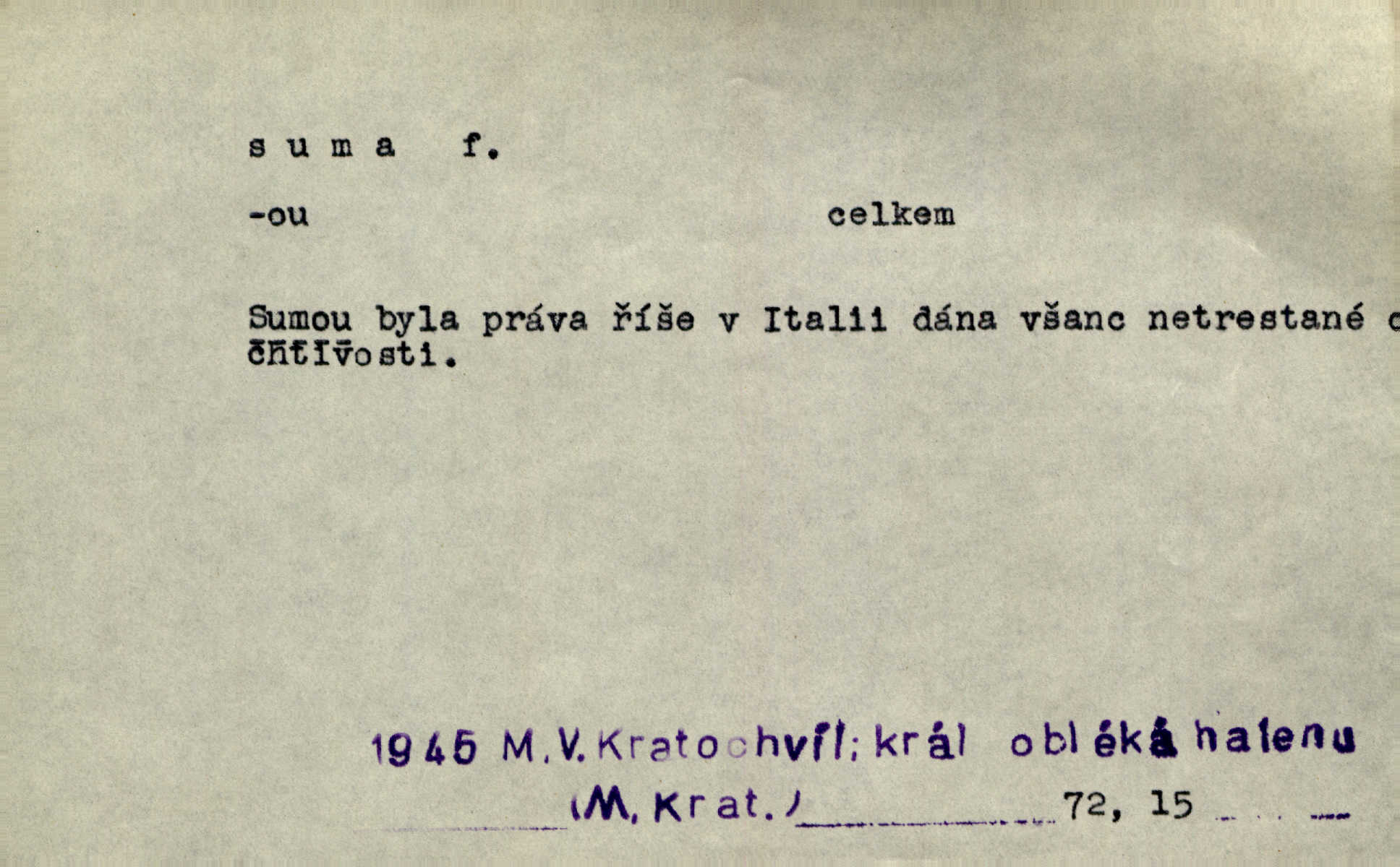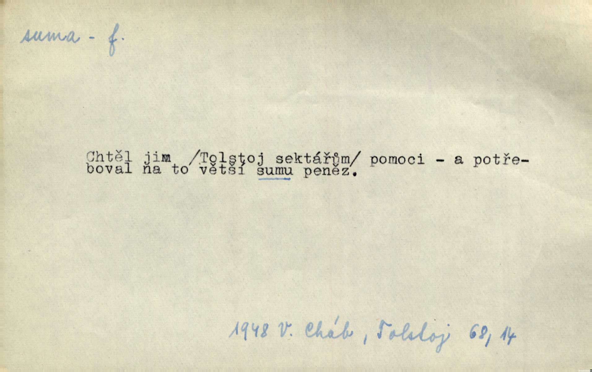 - suma, -y f. (větší) množství peněz, částka. Policie pátrala po členech tajného spolku, vypisovala ohromné sumy na jejich hlavy. Zey. Obec Náchodská měla dluhů 24 000 zl., na ten čas sumu to velikou. Jir. Vyléval v nich [básních] mnoho bolu a shrábnul za ně značnou sumu. Sob. Jaké úžasné sumy peněz vyhazují se za věci, které jen zdánlivě sloužiti mají k ozdobě. V. Mrš. Osmdesát tisíc zde leží po tři měsíce bez úroků. Taková suma! Bozd. D Řidč. (větší) množství něčeho vůbec. Již pouhý výčet vám naznačí tu sumu materiálu, již kniha zpracovává. Čteme. Mdloba a rozčarování splývalo v jedinou ohromnou sumu lásky. Sez. Summa vědomostí nepovznáší lid, aniž ho vzdělává; lid jako národ vzdělává se pouze summou své historie. Staš. D Poněk. zast. celkový počet, souhrn, úhrn. Summa všech domácích obyvatelů království [je]: 3,686.363. Pal. Cesta do Prahy byla nepochybně summou vší vévodovy ochoty. Pek. Suma vášně deseti nejohnivějších Evropanek nevyrovná se její lásce. Lier. D Zast. jádro, souhrn nejpodstatnějších částí nějakého celku. Náboženství podle Bonusa, abych podal nejstručnější summu z něho, jest pro člověka, ne člověk pro náboženství. Šal. Ukojení [vášní] považuji za cíl a summu svého života. Hol. Pryč od lidí, to suma moudrosti. Jir. Suma návrhu Hlasivcova byla, aby obtížná robota [byla] zrušena. Jir. D suma sumárum zast. hovor. celkem, úhrnem. A suma sumárum — starý macek si mě oblíbil. Herrm. — V. t. sumou.