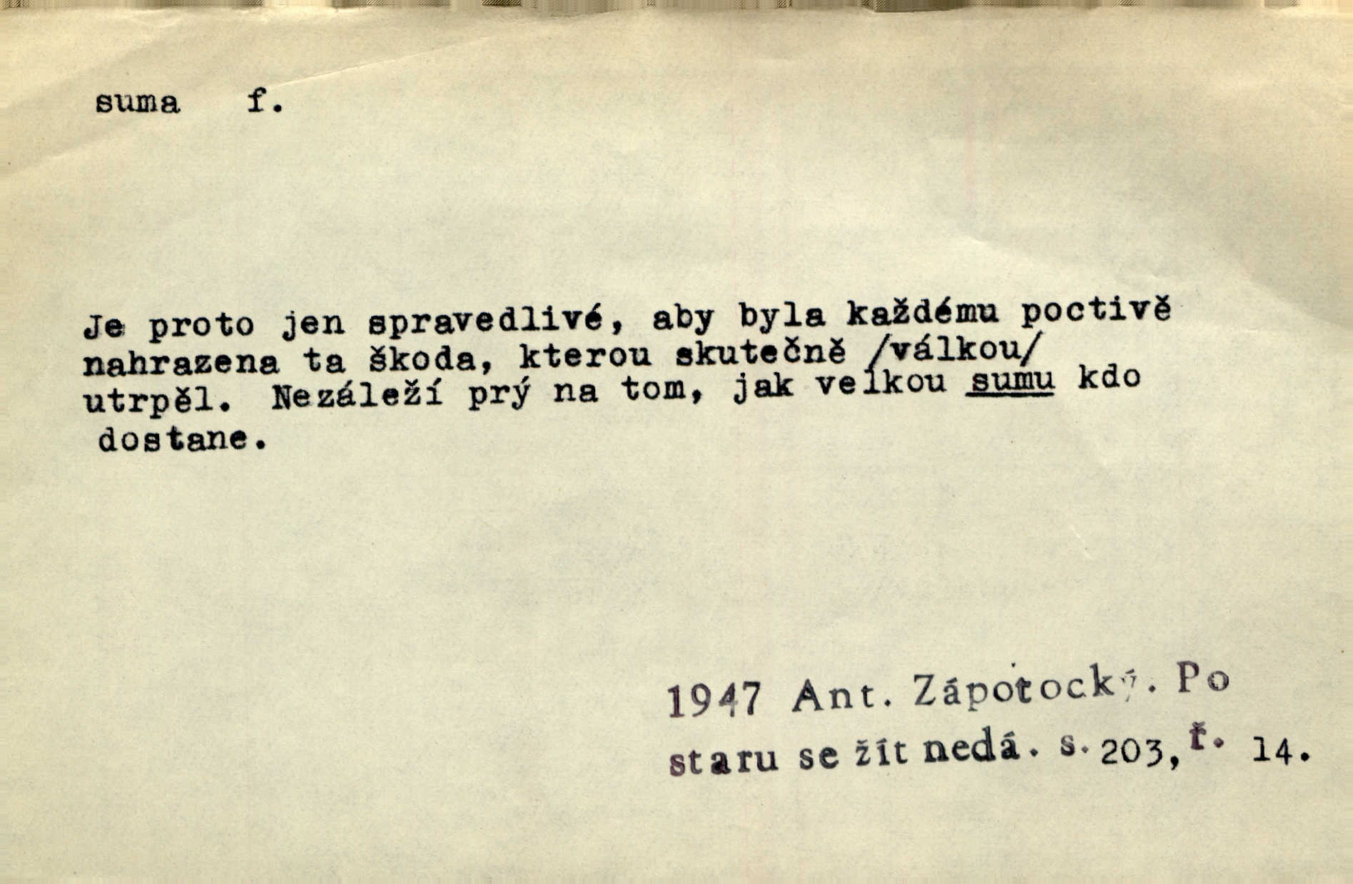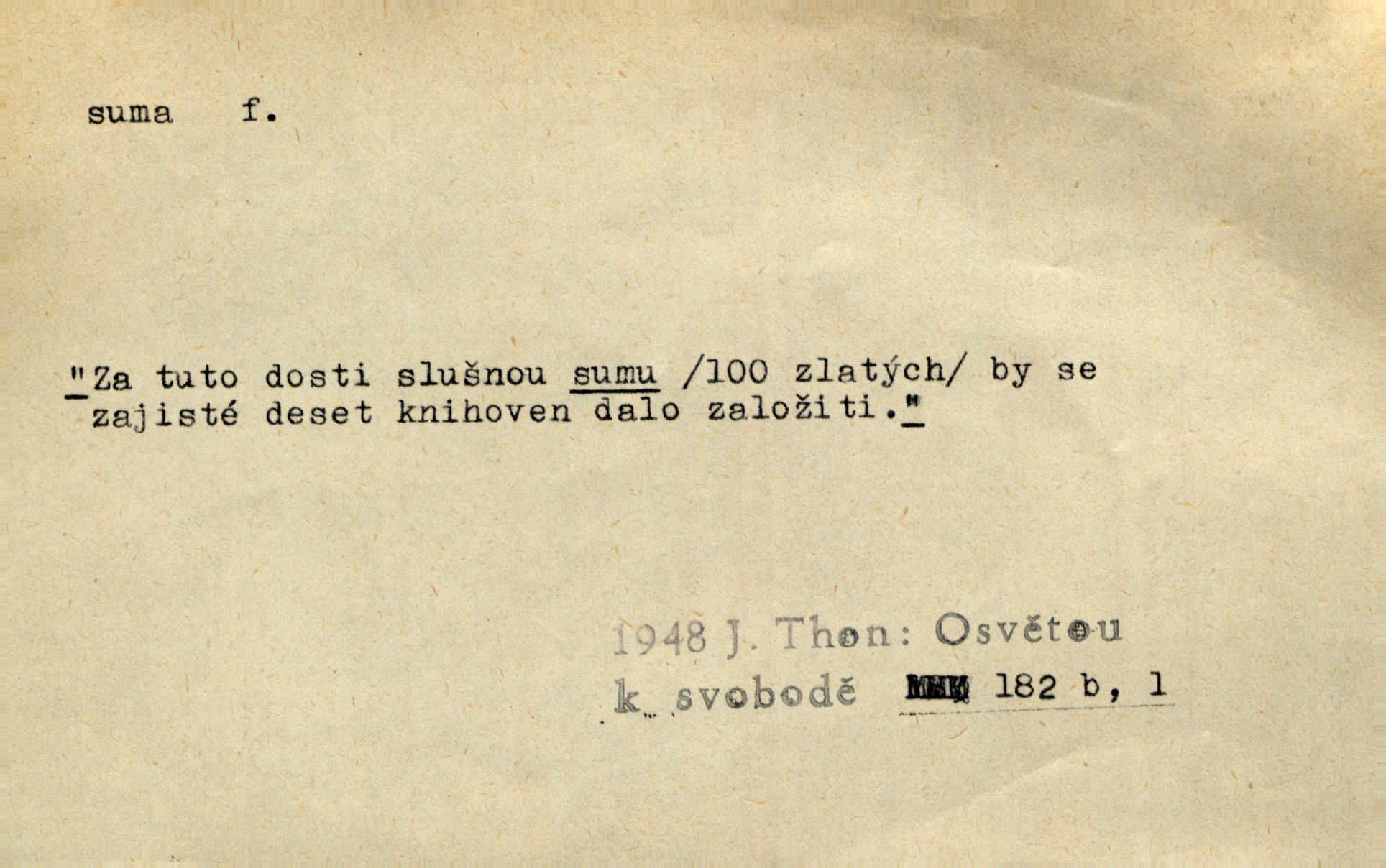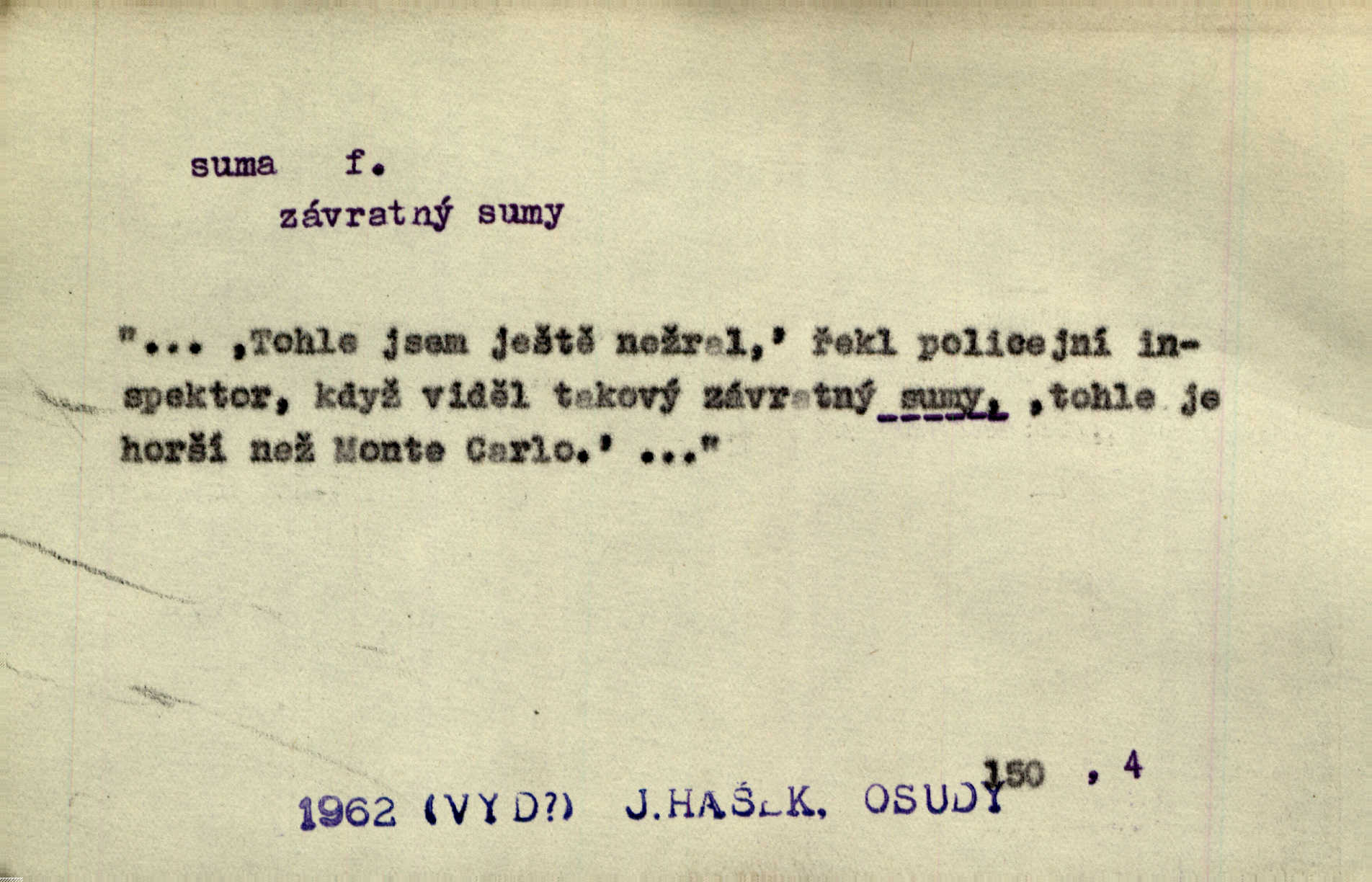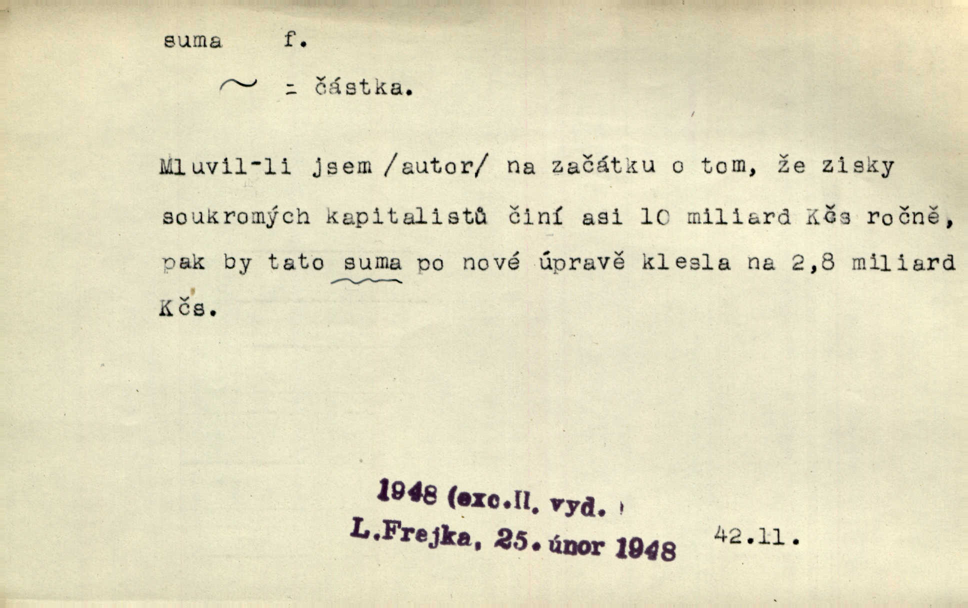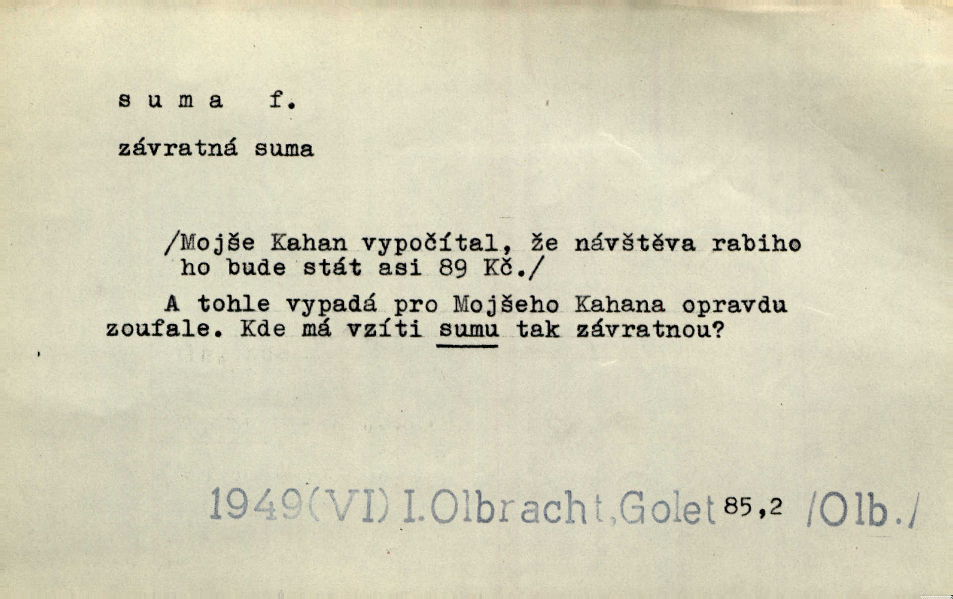 - suma, -y f. (větší) množství peněz, částka. Policie pátrala po členech tajného spolku, vypisovala ohromné sumy na jejich hlavy. Zey. Obec Náchodská měla dluhů 24 000 zl., na ten čas sumu to velikou. Jir. Vyléval v nich [básních] mnoho bolu a shrábnul za ně značnou sumu. Sob. Jaké úžasné sumy peněz vyhazují se za věci, které jen zdánlivě sloužiti mají k ozdobě. V. Mrš. Osmdesát tisíc zde leží po tři měsíce bez úroků. Taková suma! Bozd. D Řidč. (větší) množství něčeho vůbec. Již pouhý výčet vám naznačí tu sumu materiálu, již kniha zpracovává. Čteme. Mdloba a rozčarování splývalo v jedinou ohromnou sumu lásky. Sez. Summa vědomostí nepovznáší lid, aniž ho vzdělává; lid jako národ vzdělává se pouze summou své historie. Staš. D Poněk. zast. celkový počet, souhrn, úhrn. Summa všech domácích obyvatelů království [je]: 3,686.363. Pal. Cesta do Prahy byla nepochybně summou vší vévodovy ochoty. Pek. Suma vášně deseti nejohnivějších Evropanek nevyrovná se její lásce. Lier. D Zast. jádro, souhrn nejpodstatnějších částí nějakého celku. Náboženství podle Bonusa, abych podal nejstručnější summu z něho, jest pro člověka, ne člověk pro náboženství. Šal. Ukojení [vášní] považuji za cíl a summu svého života. Hol. Pryč od lidí, to suma moudrosti. Jir. Suma návrhu Hlasivcova byla, aby obtížná robota [byla] zrušena. Jir. D suma sumárum zast. hovor. celkem, úhrnem. A suma sumárum — starý macek si mě oblíbil. Herrm. — V. t. sumou.