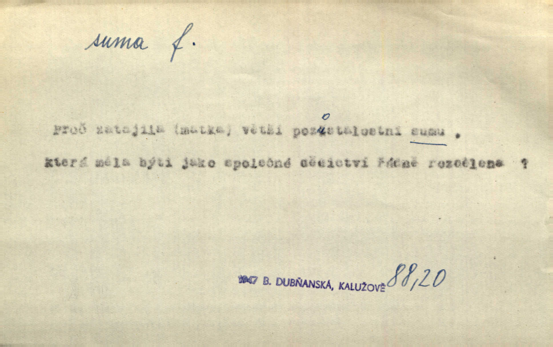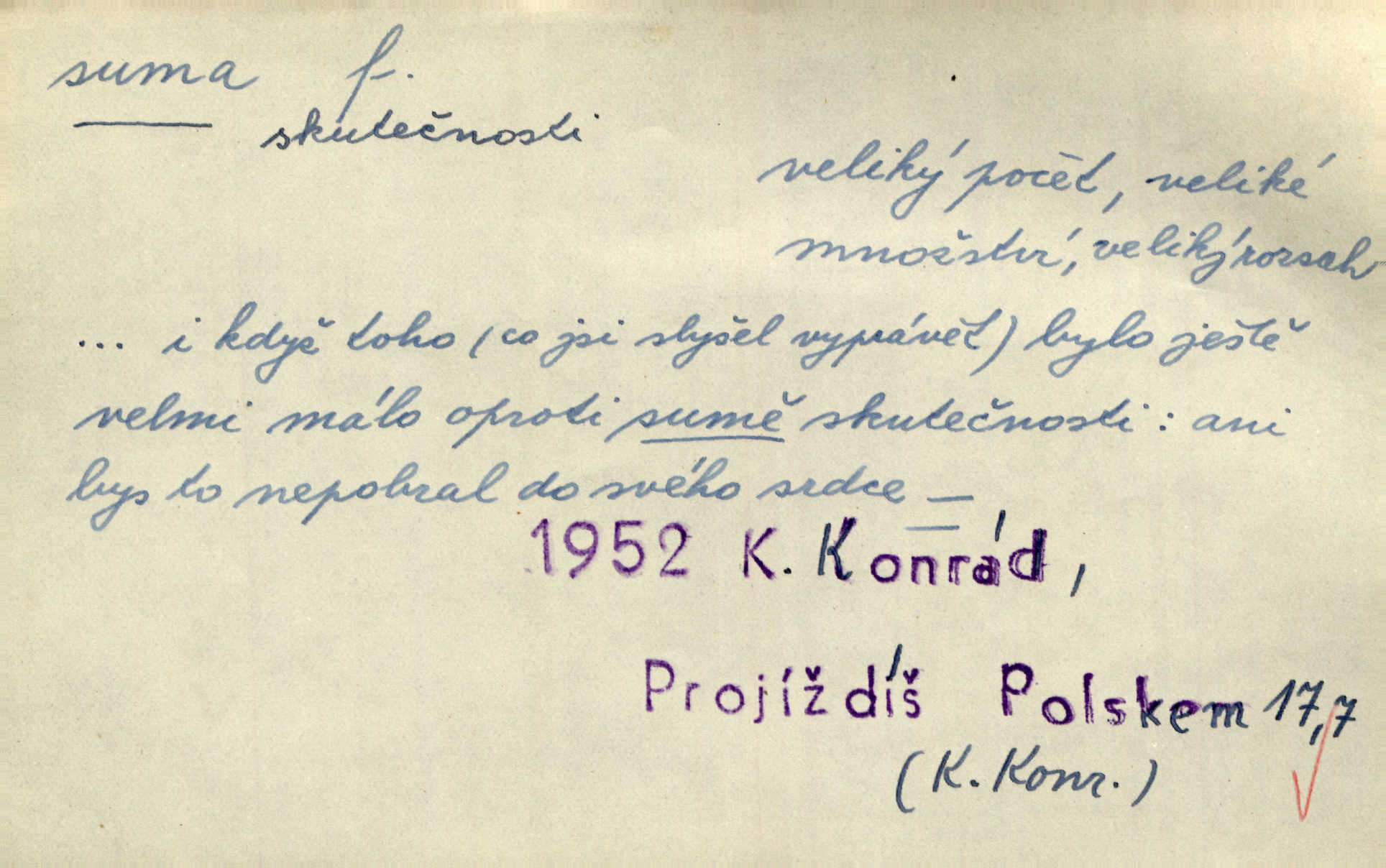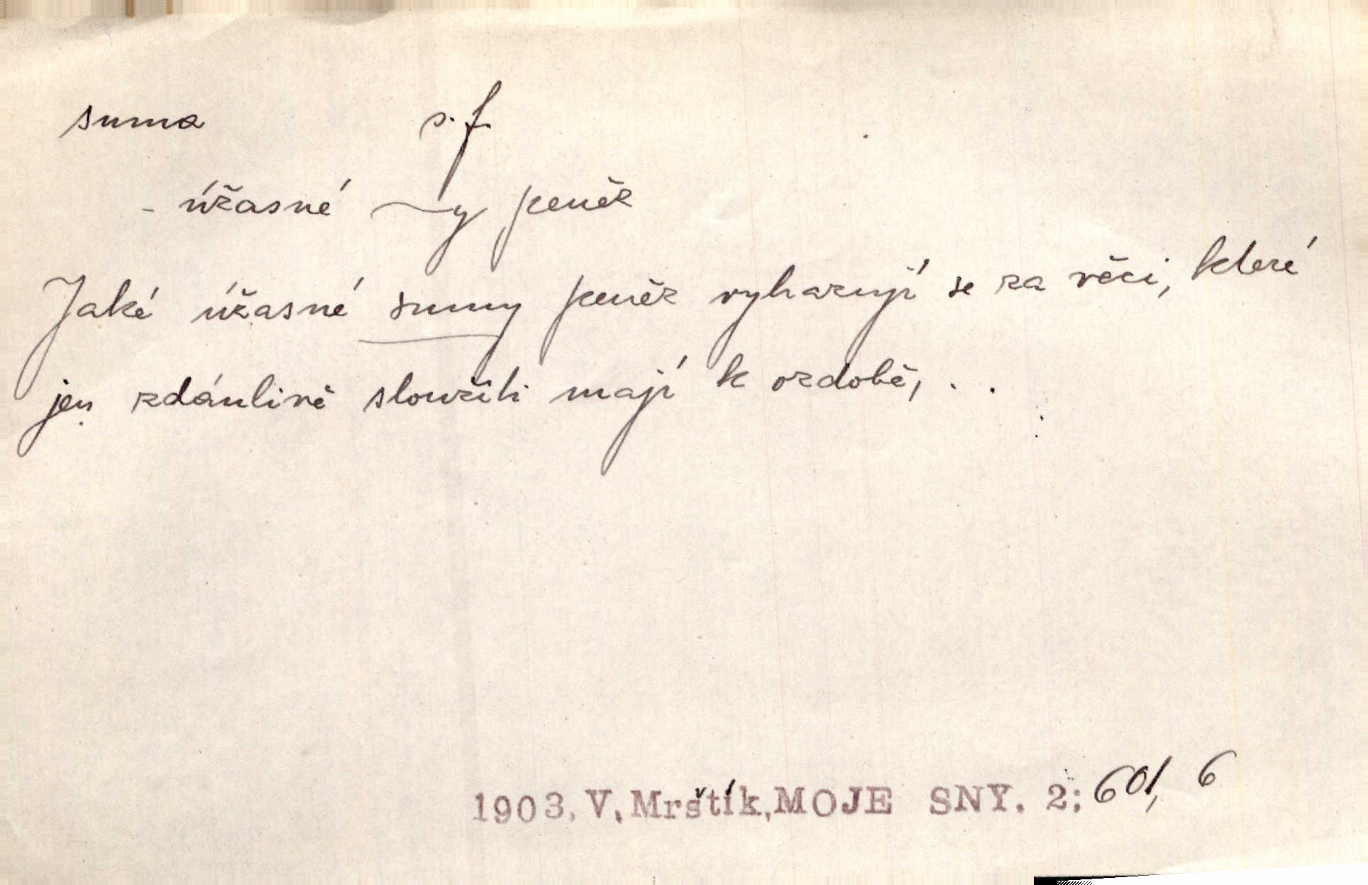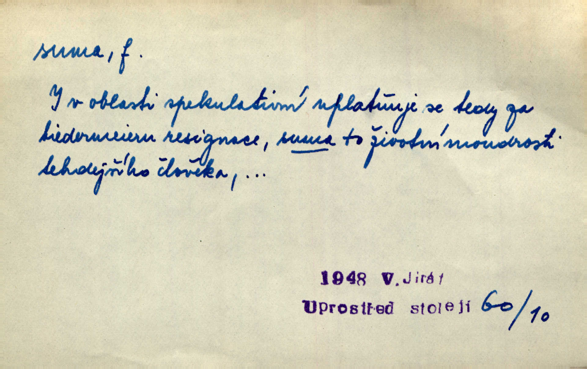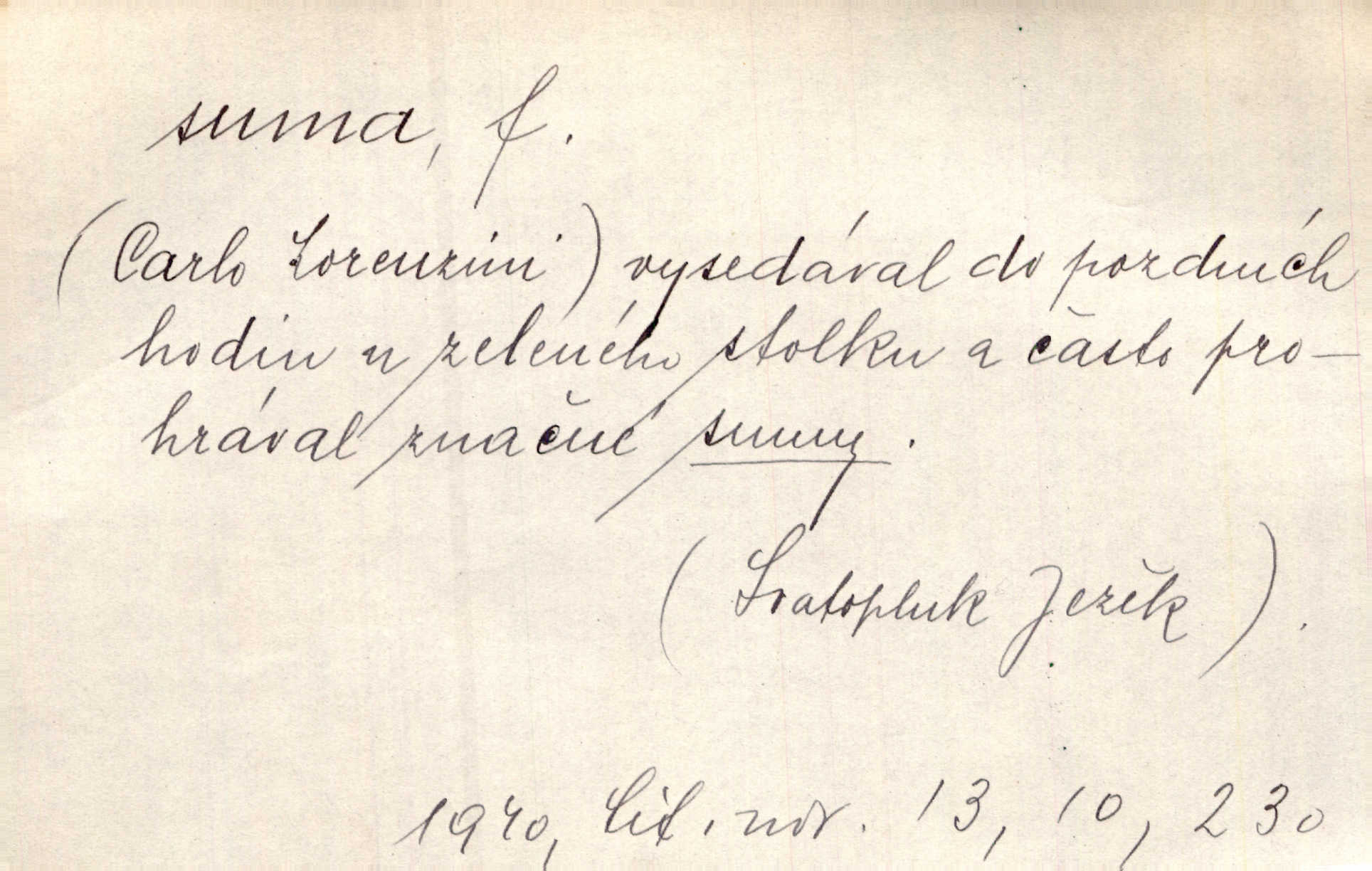- suma, -y f. (větší) množství peněz, částka. Policie pátrala po členech tajného spolku, vypisovala ohromné sumy na jejich hlavy. Zey. Obec Náchodská měla dluhů 24 000 zl., na ten čas sumu to velikou. Jir. Vyléval v nich [básních] mnoho bolu a shrábnul za ně značnou sumu. Sob. Jaké úžasné sumy peněz vyhazují se za věci, které jen zdánlivě sloužiti mají k ozdobě. V. Mrš. Osmdesát tisíc zde leží po tři měsíce bez úroků. Taková suma! Bozd. D Řidč. (větší) množství něčeho vůbec. Již pouhý výčet vám naznačí tu sumu materiálu, již kniha zpracovává. Čteme. Mdloba a rozčarování splývalo v jedinou ohromnou sumu lásky. Sez. Summa vědomostí nepovznáší lid, aniž ho vzdělává; lid jako národ vzdělává se pouze summou své historie. Staš. D Poněk. zast. celkový počet, souhrn, úhrn. Summa všech domácích obyvatelů království [je]: 3,686.363. Pal. Cesta do Prahy byla nepochybně summou vší vévodovy ochoty. Pek. Suma vášně deseti nejohnivějších Evropanek nevyrovná se její lásce. Lier. D Zast. jádro, souhrn nejpodstatnějších částí nějakého celku. Náboženství podle Bonusa, abych podal nejstručnější summu z něho, jest pro člověka, ne člověk pro náboženství. Šal. Ukojení [vášní] považuji za cíl a summu svého života. Hol. Pryč od lidí, to suma moudrosti. Jir. Suma návrhu Hlasivcova byla, aby obtížná robota [byla] zrušena. Jir. D suma sumárum zast. hovor. celkem, úhrnem. A suma sumárum — starý macek si mě oblíbil. Herrm. — V. t. sumou.