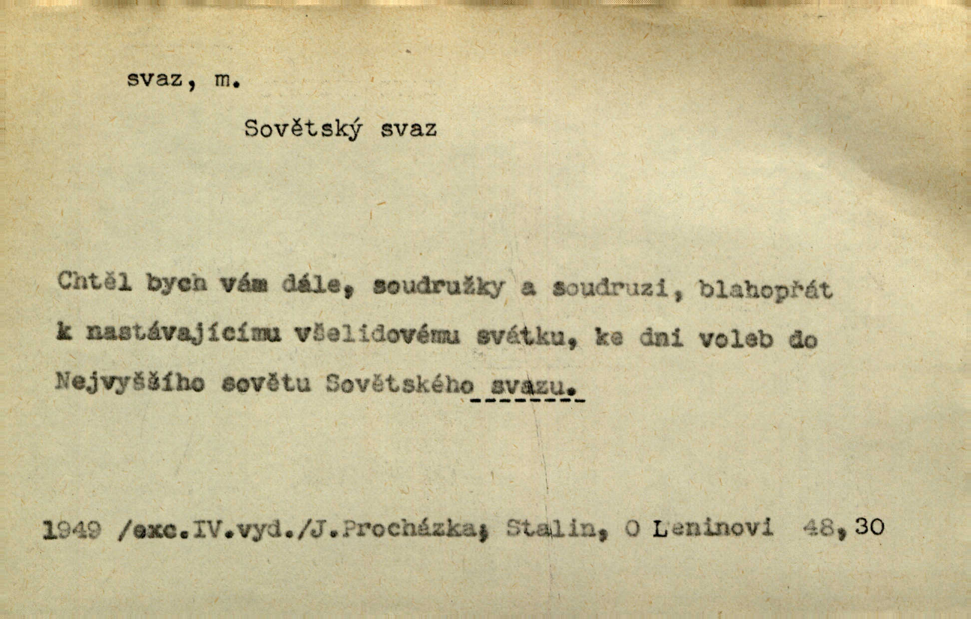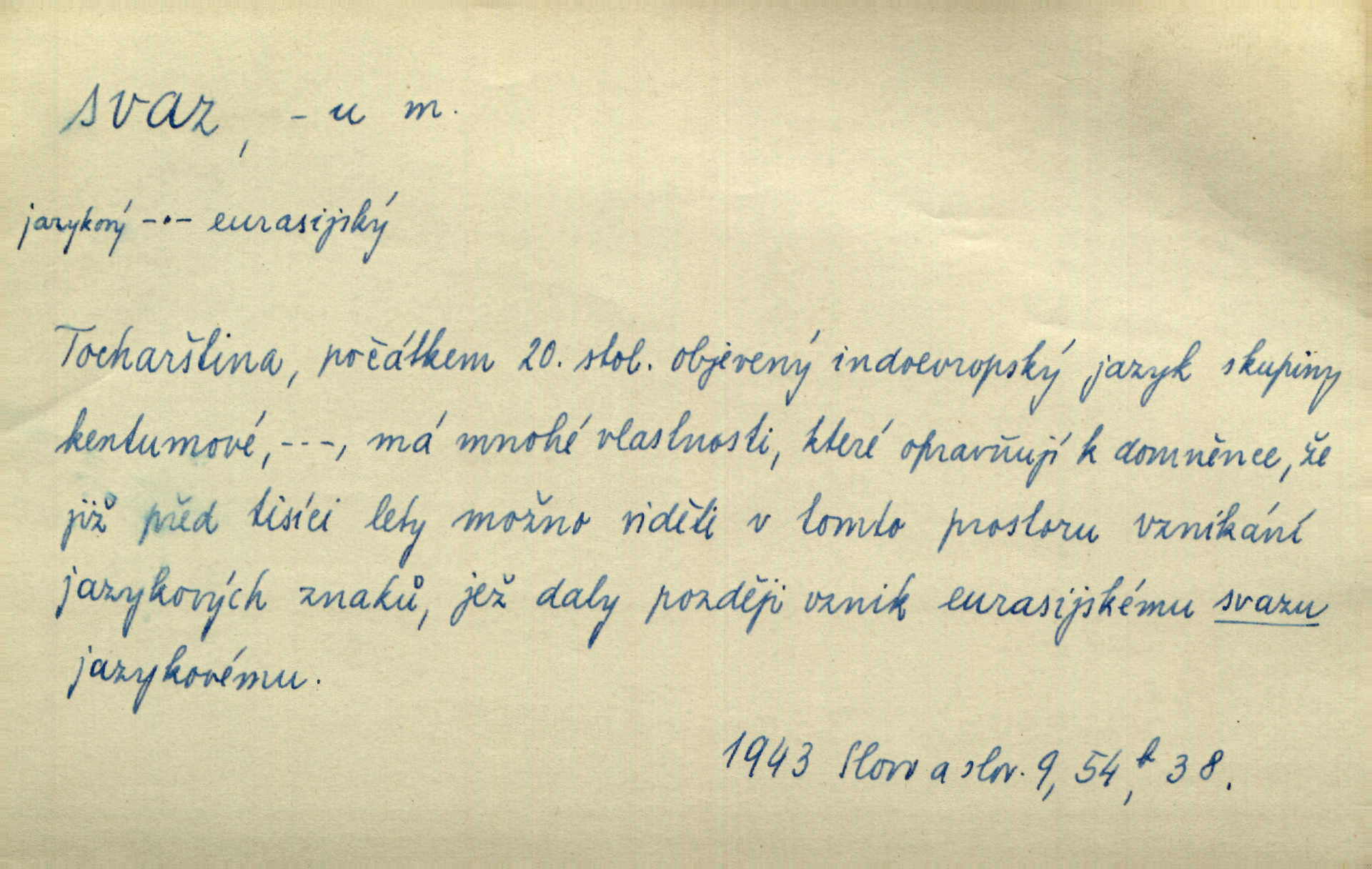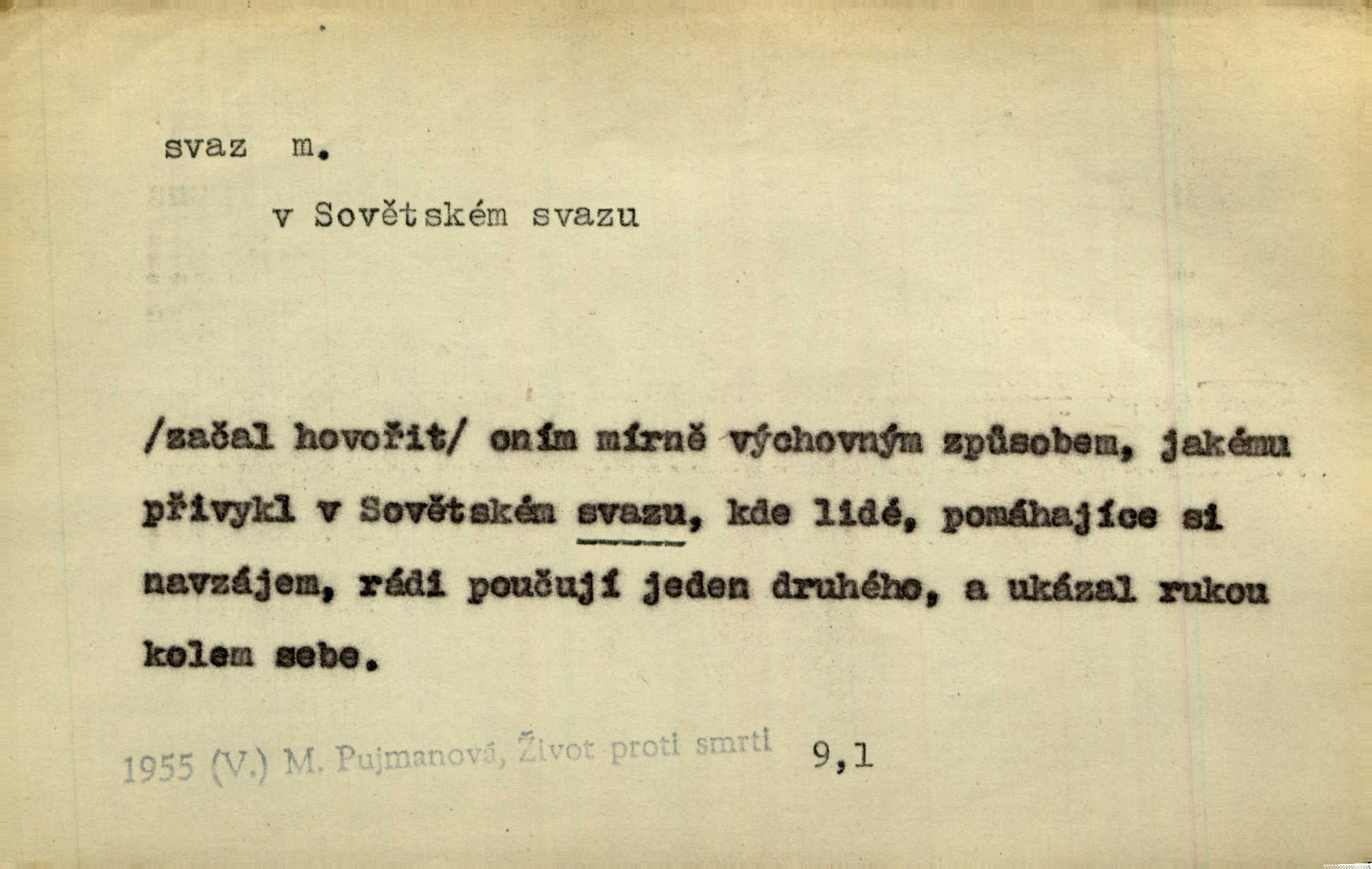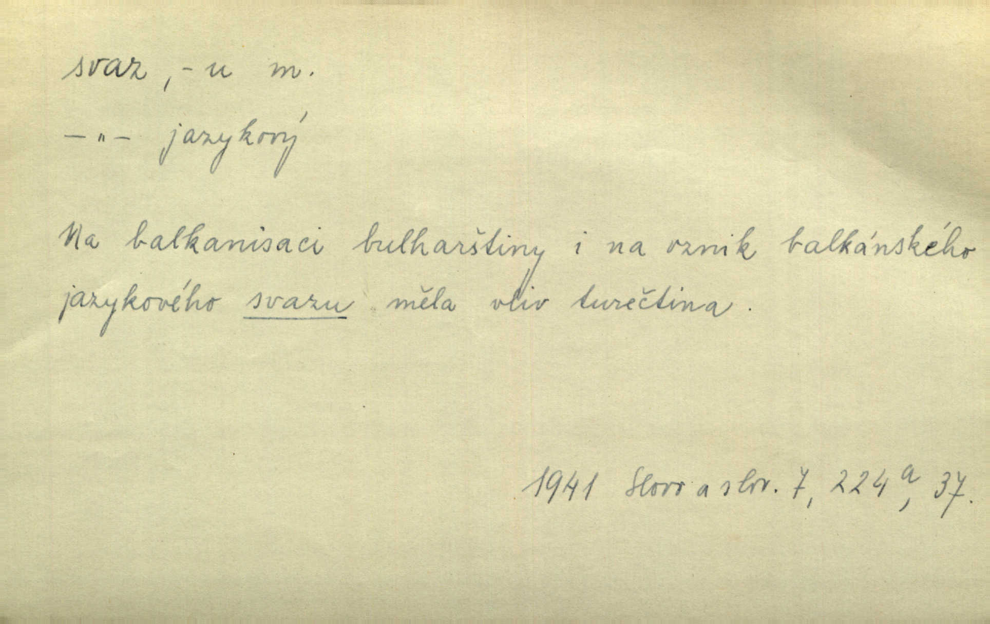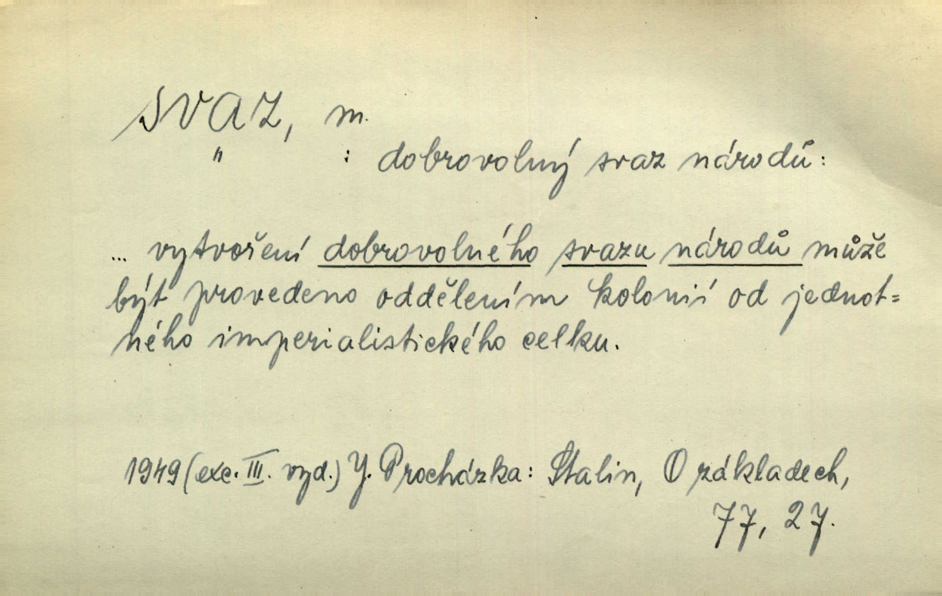 - svaz, -u m. zařízení sloužící k spojení součástí, svora, spoj. Kolotoč se otřásl jako ze spaní, zaskřípěl všemi svazy a plavně se roztočil. K. Čap. Ráz trámem děsný a zas rychle druhý na věže střechu obrněnou slít, že jimi povolil svaz každý tuhý. Vrch. D Tech. zámek u obruče na sudu. Řemínek u cepu. D Zř. šlacha; sval. Hnát bělal se, byl uschlá, holá kosť bez masa, svazů. Vrch. Selhaly jí kolenou svazy, zastřela jí mdloba smysly? Krás. Hnáty jeho souvisí v kloubech toliko pratenkým natrženým svazem. Čap. Ch. Jakoby mu vytahal všechny svazy a šlachy, tak se klinká v povětří a třepetá se, i když se o zemi opírá. Herrm. Sehnul zase vychrtlé svazy svého týla V. Mrš. Jali se do kmene bušiti tím směrem, kterým byl nařezán, a slyš! již zavzdychal, zastenal, již v něm poslední svazy praští. Jir. D Zř. nástroj sloužící k spoutání, svázání někoho, pouto. Stráž snímá s Jarošových rukou tvrdé svazy. Staš. A kdybyste mi dudy vzali a ruce na zad uvázali, já roztrhl bych každý svaz. Heyd. Přen. Snad při své skutečné lásce by sám povolil, uvolil ty svazy. Šim. Cítil den ode dne, jak se ty svazy, pojící tělo a duši uvolňují. Baar. Jinak jako by požárem všechny svazy se světem přehořely. Jir. Všechny živly v něm [českém životě] se rozzuřily tak, že popraskaly staré svazy a svazky. Herb. Všude schází svaz s časem, okolnostmi, konstelacemi. Naše d. D Zř. soubor, svazek věcí svázaných n. jinak spojených dohromady. Jen v dálce ještě zaznívá svaz klíčův. Durd. Jali se nařezávati ohromný svaz [kořenů] těmi dřeváckými pilami bez oblouků. Šlej. Voj. svaz letadel. D společenství, spolek, sdružení. Cimbura musil být veřejně a slavně přijat do svazu sousedů putímských. Baar. Útěk jejich [spiklenců] zradil všecko: svaz tajný, smělé plány jeho. Mach. K lepšímu hájení zájmů svých mohla společenstva týchž nebo i různých živností téhož okresu zřizovati volným přístupem svazy. Čes. pol. Polit. Svaz sovětských socialistických republik, Sovětský svaz SSSR. Svaz národů mezinárodní instituce po první světové válce. Voj. vyšší útvar. Svaz letecký, lodní, pancéřový. Veř. spr. organisační spojení více složek téhož odvětví za účelem hájení společných zájmů. Svaz českého díla umělecká organisace. Svaz brannosti provádějící branný výcvik občanstva od 18 let. Československý svaz mládeže. Trhové svazy veřejnoprávní korporace pro dohled na výrobu a distribuci zásobování a hospodaření s potravinami. Sport. footballový svaz. Bot. jednotka rostlinné sociologie zahrnující skupinu floristicky nejblíže příbuzných asociací a význačná větším počtem společných charakteristických druhů. Filol. svaz jazykový skupina jazyků, jejichž příbuznost je dána vývojovým sbližováním, nikoli společným původem. Balkánský jazykový svaz.