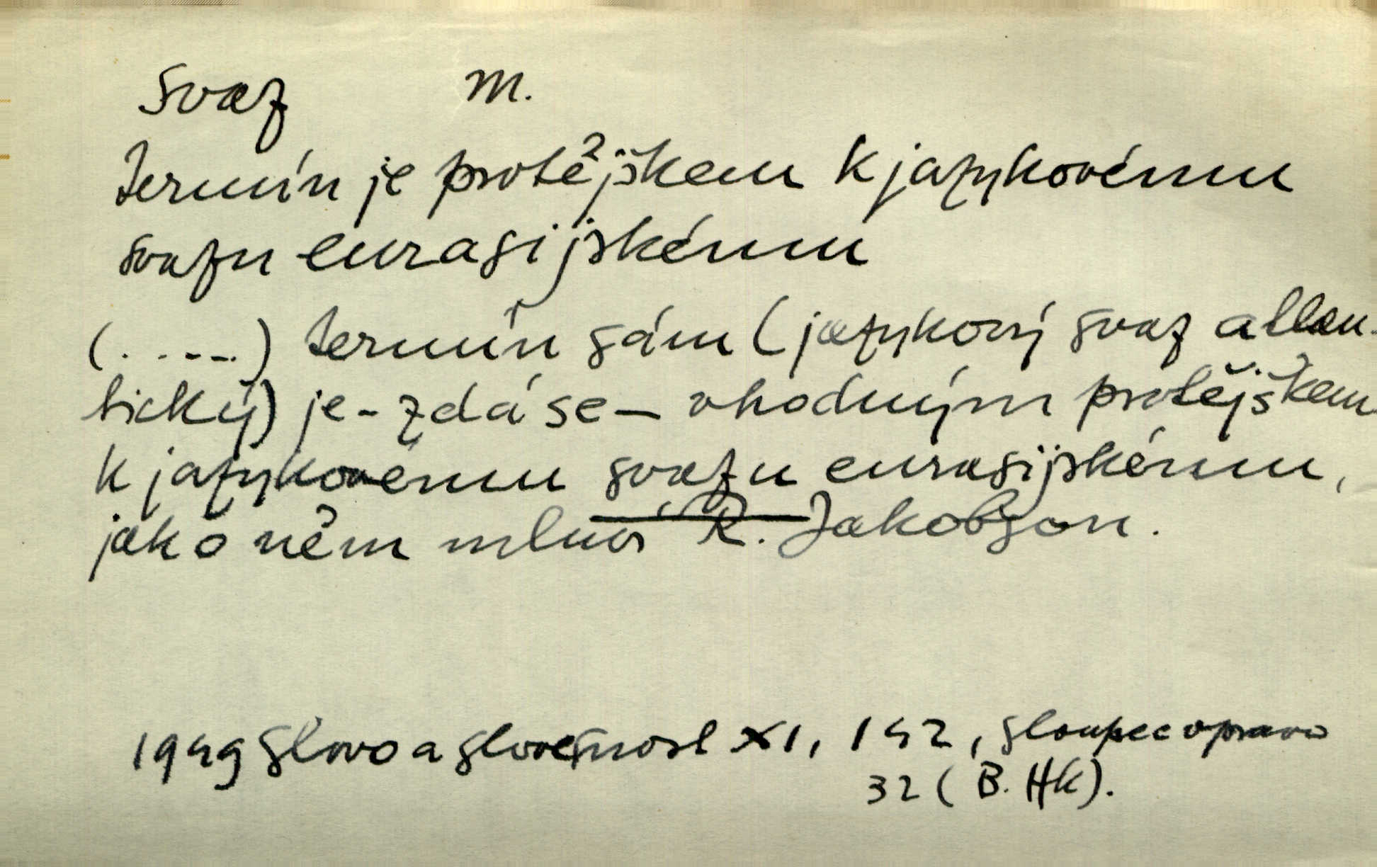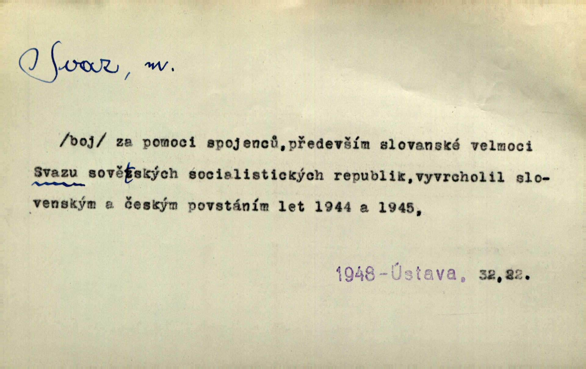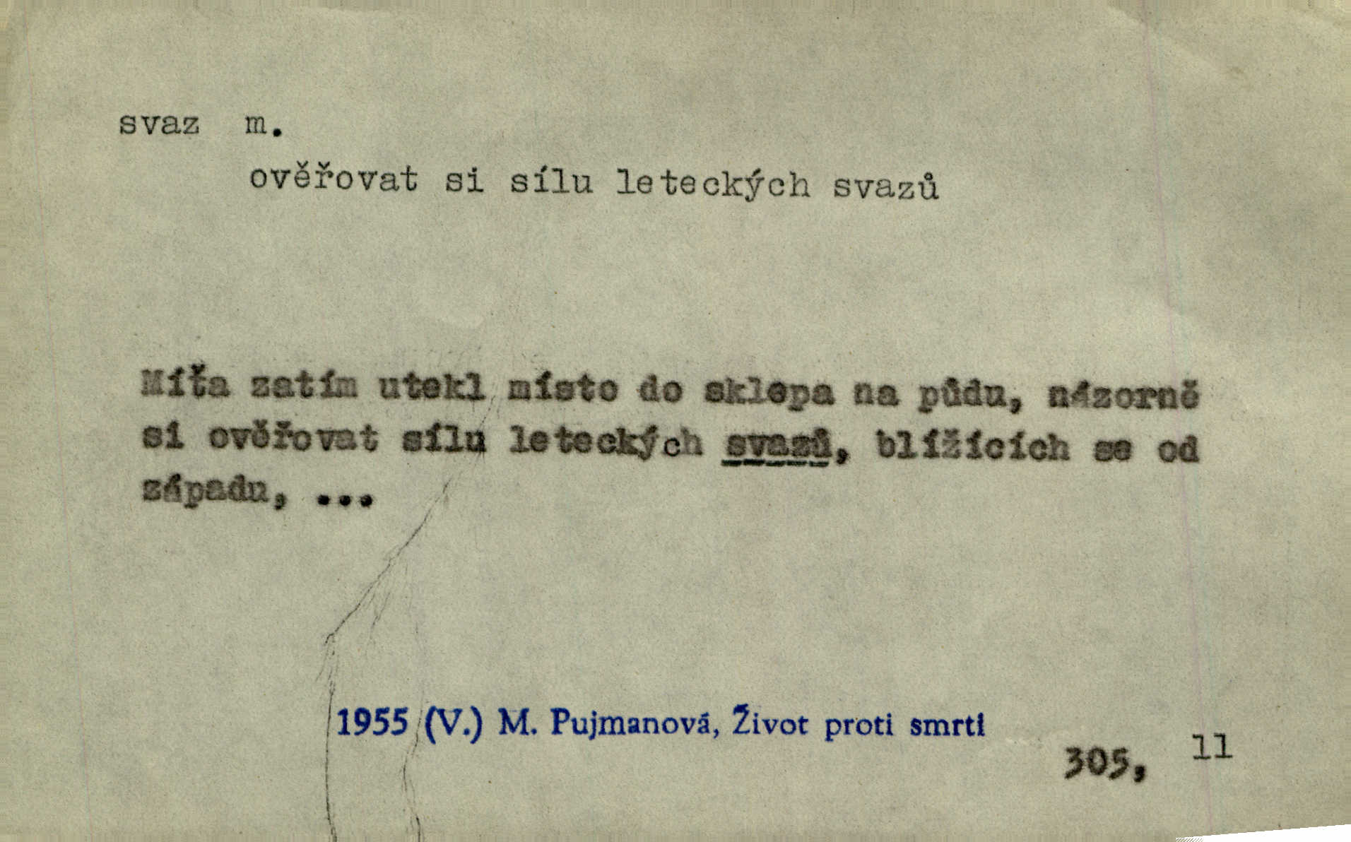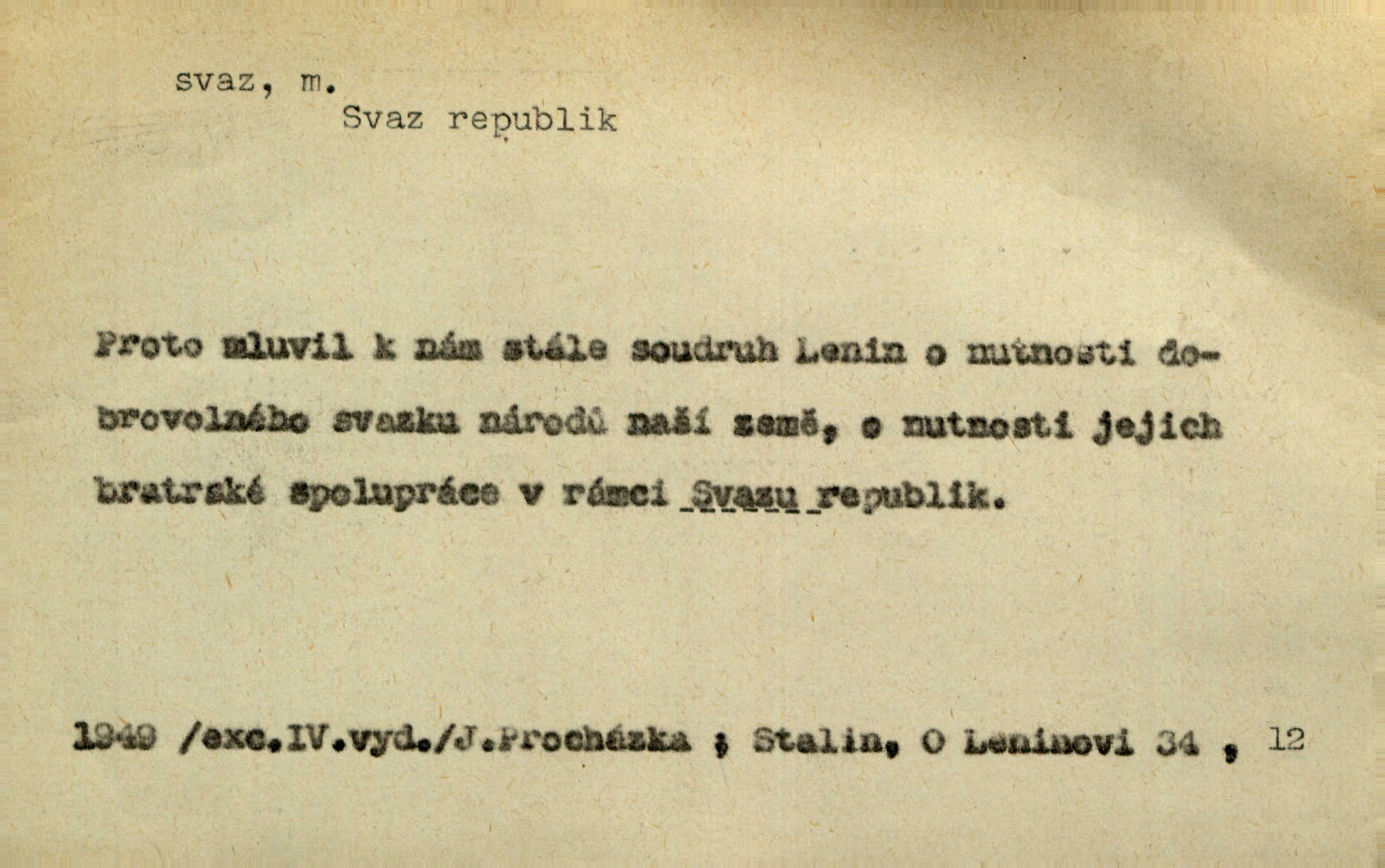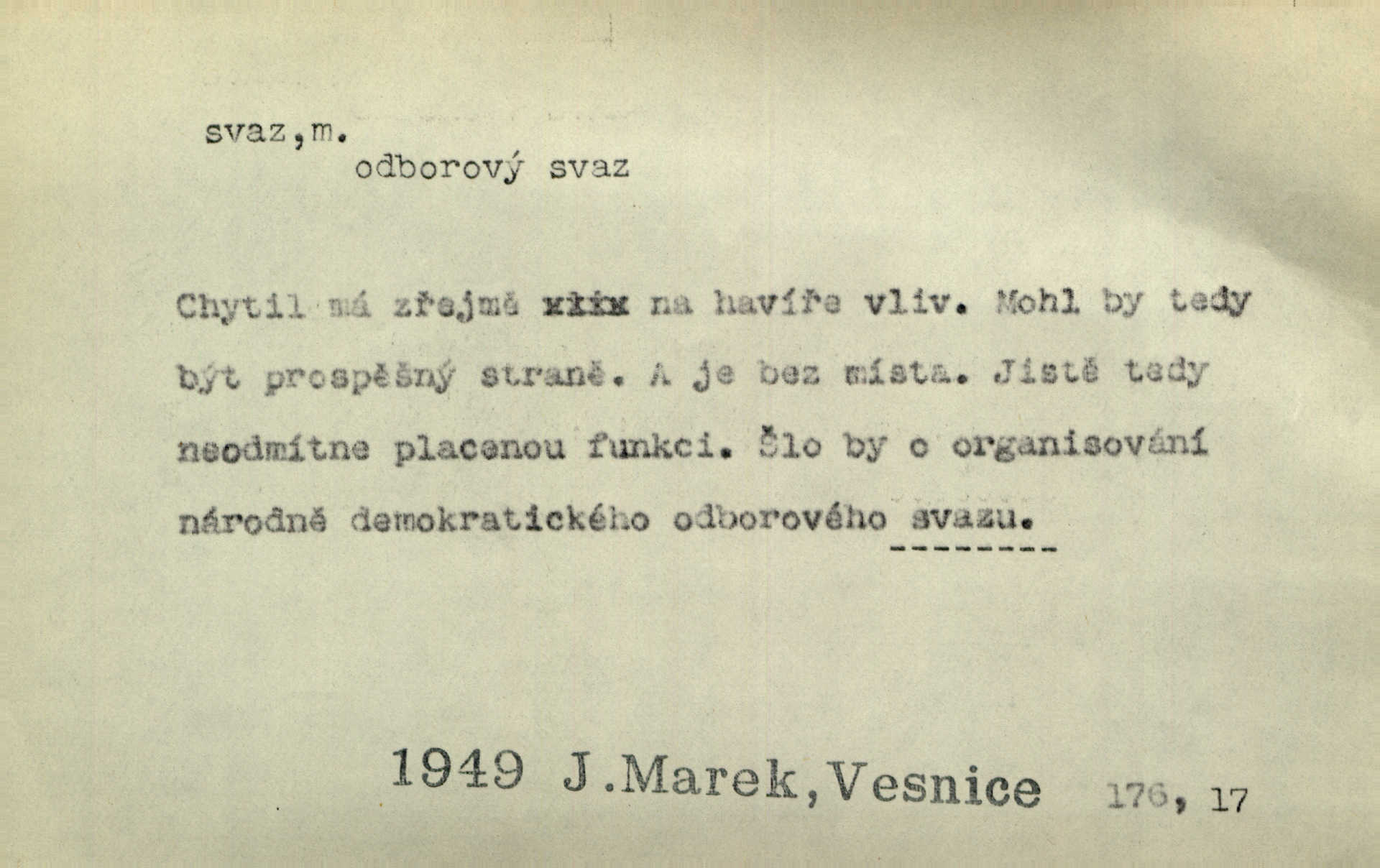 - svaz, -u m. zařízení sloužící k spojení součástí, svora, spoj. Kolotoč se otřásl jako ze spaní, zaskřípěl všemi svazy a plavně se roztočil. K. Čap. Ráz trámem děsný a zas rychle druhý na věže střechu obrněnou slít, že jimi povolil svaz každý tuhý. Vrch. D Tech. zámek u obruče na sudu. Řemínek u cepu. D Zř. šlacha; sval. Hnát bělal se, byl uschlá, holá kosť bez masa, svazů. Vrch. Selhaly jí kolenou svazy, zastřela jí mdloba smysly? Krás. Hnáty jeho souvisí v kloubech toliko pratenkým natrženým svazem. Čap. Ch. Jakoby mu vytahal všechny svazy a šlachy, tak se klinká v povětří a třepetá se, i když se o zemi opírá. Herrm. Sehnul zase vychrtlé svazy svého týla V. Mrš. Jali se do kmene bušiti tím směrem, kterým byl nařezán, a slyš! již zavzdychal, zastenal, již v něm poslední svazy praští. Jir. D Zř. nástroj sloužící k spoutání, svázání někoho, pouto. Stráž snímá s Jarošových rukou tvrdé svazy. Staš. A kdybyste mi dudy vzali a ruce na zad uvázali, já roztrhl bych každý svaz. Heyd. Přen. Snad při své skutečné lásce by sám povolil, uvolil ty svazy. Šim. Cítil den ode dne, jak se ty svazy, pojící tělo a duši uvolňují. Baar. Jinak jako by požárem všechny svazy se světem přehořely. Jir. Všechny živly v něm [českém životě] se rozzuřily tak, že popraskaly staré svazy a svazky. Herb. Všude schází svaz s časem, okolnostmi, konstelacemi. Naše d. D Zř. soubor, svazek věcí svázaných n. jinak spojených dohromady. Jen v dálce ještě zaznívá svaz klíčův. Durd. Jali se nařezávati ohromný svaz [kořenů] těmi dřeváckými pilami bez oblouků. Šlej. Voj. svaz letadel. D společenství, spolek, sdružení. Cimbura musil být veřejně a slavně přijat do svazu sousedů putímských. Baar. Útěk jejich [spiklenců] zradil všecko: svaz tajný, smělé plány jeho. Mach. K lepšímu hájení zájmů svých mohla společenstva týchž nebo i různých živností téhož okresu zřizovati volným přístupem svazy. Čes. pol. Polit. Svaz sovětských socialistických republik, Sovětský svaz SSSR. Svaz národů mezinárodní instituce po první světové válce. Voj. vyšší útvar. Svaz letecký, lodní, pancéřový. Veř. spr. organisační spojení více složek téhož odvětví za účelem hájení společných zájmů. Svaz českého díla umělecká organisace. Svaz brannosti provádějící branný výcvik občanstva od 18 let. Československý svaz mládeže. Trhové svazy veřejnoprávní korporace pro dohled na výrobu a distribuci zásobování a hospodaření s potravinami. Sport. footballový svaz. Bot. jednotka rostlinné sociologie zahrnující skupinu floristicky nejblíže příbuzných asociací a význačná větším počtem společných charakteristických druhů. Filol. svaz jazykový skupina jazyků, jejichž příbuznost je dána vývojovým sbližováním, nikoli společným původem. Balkánský jazykový svaz.