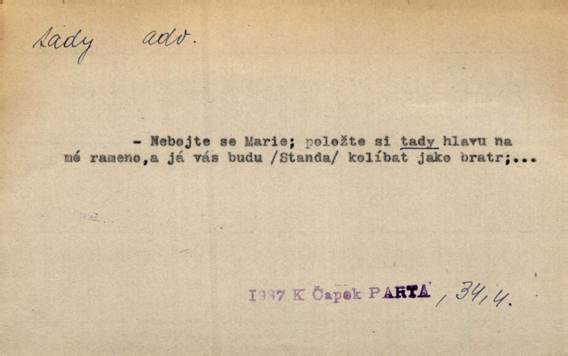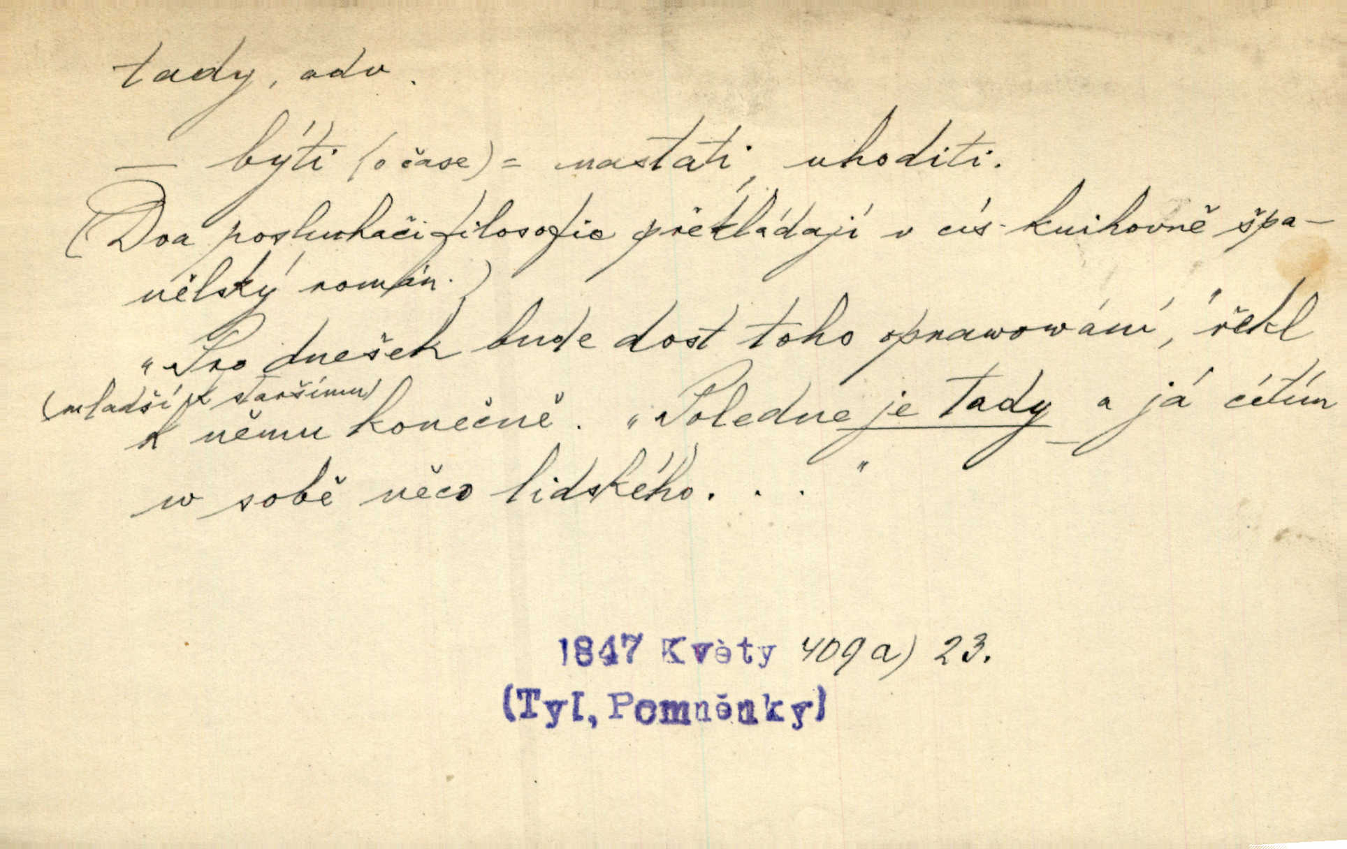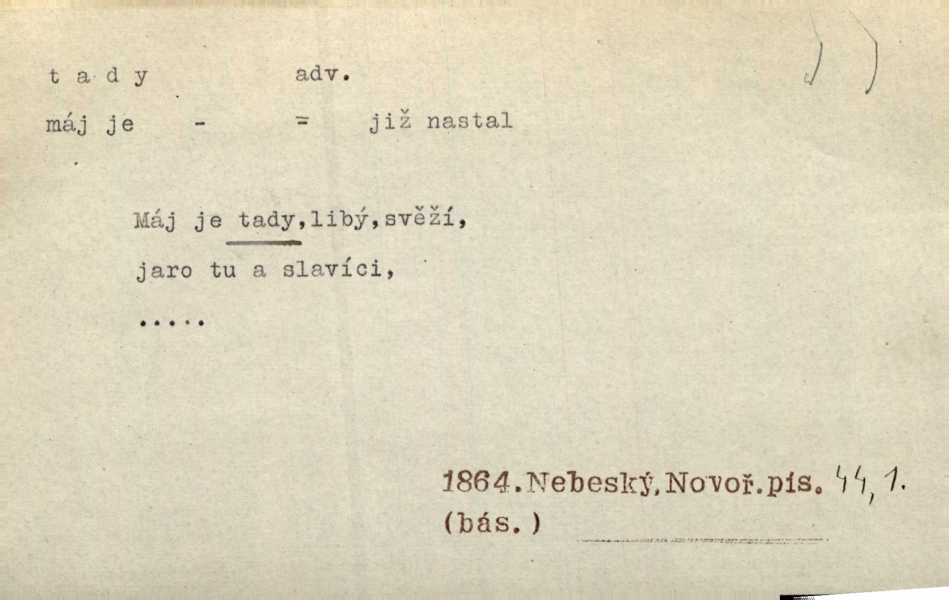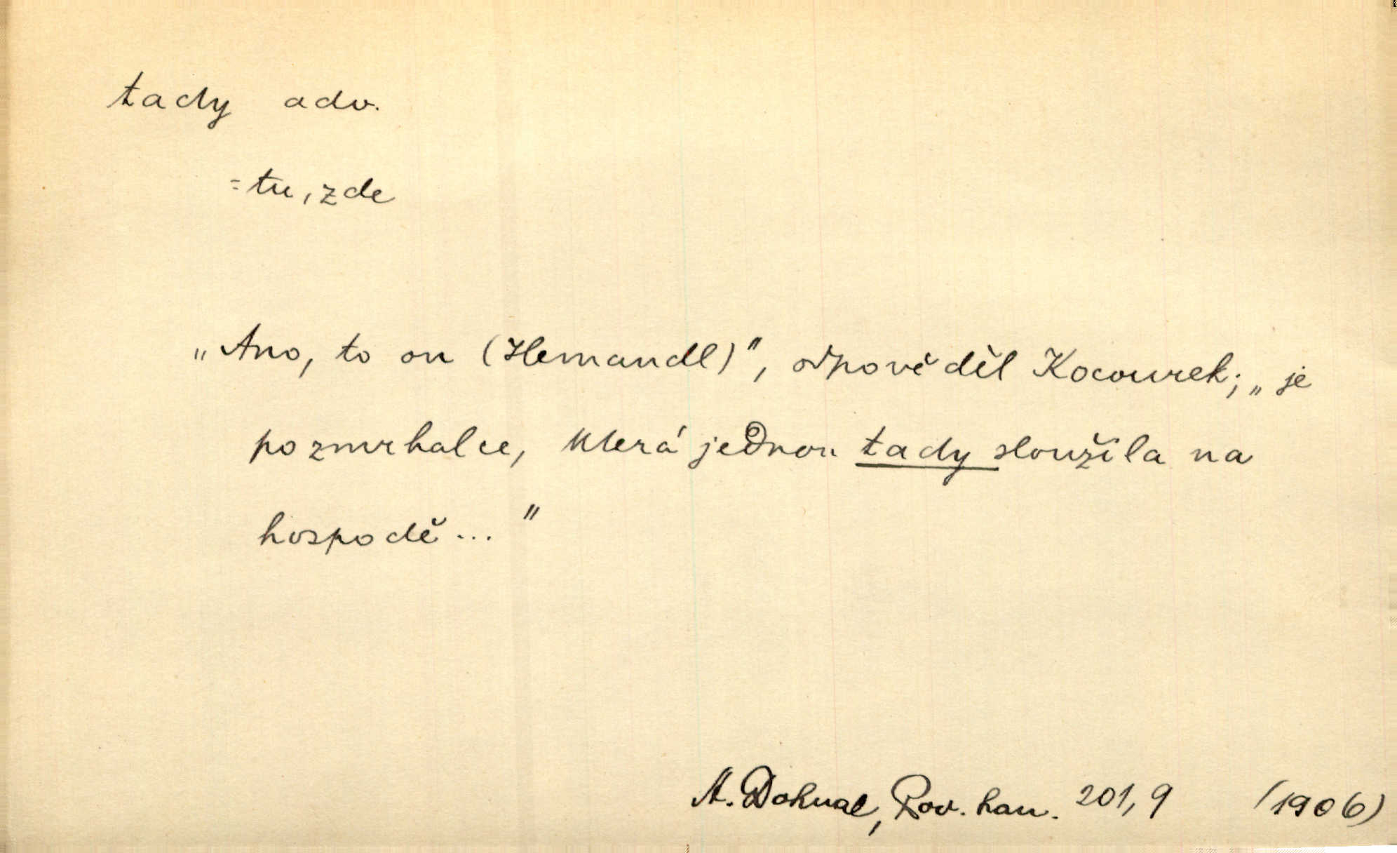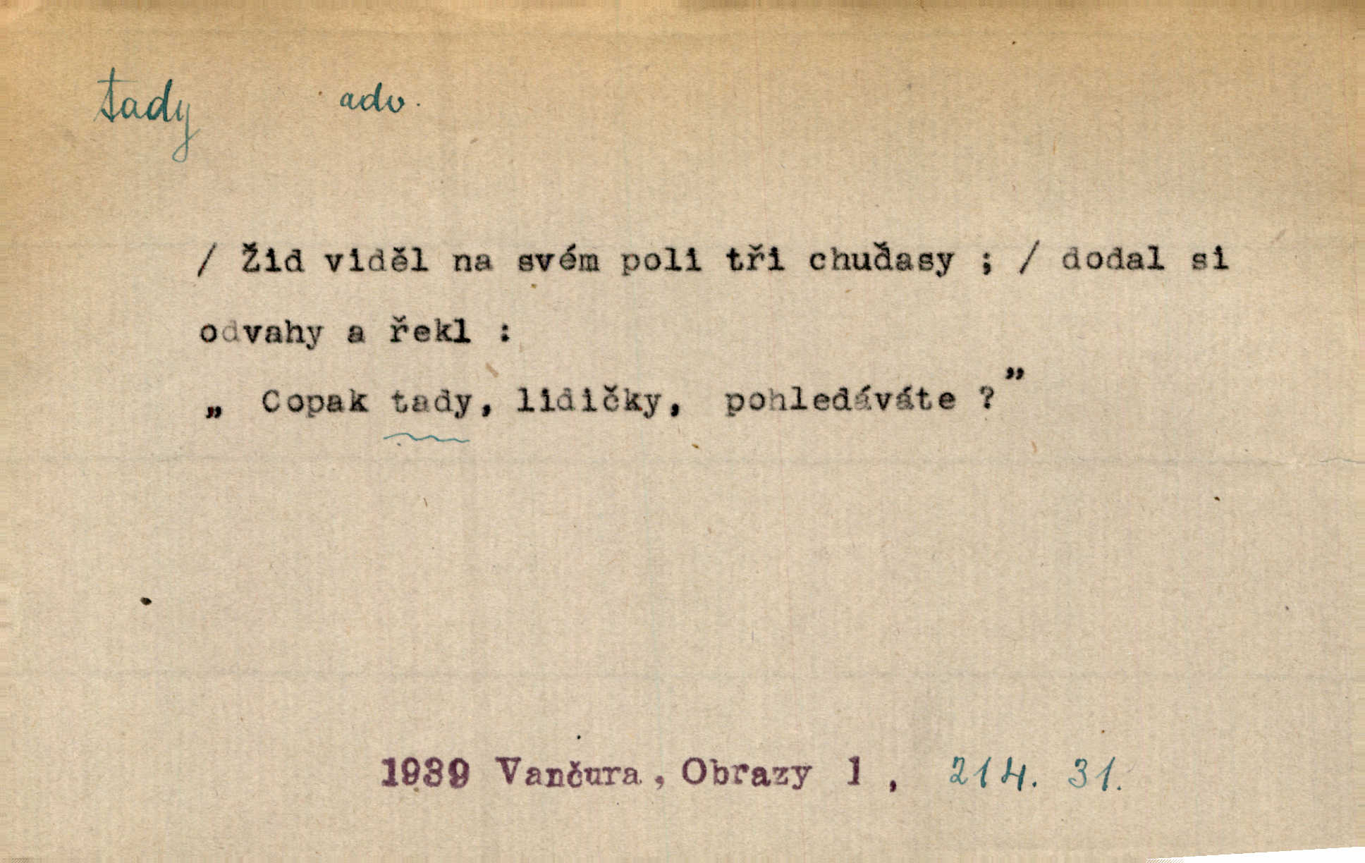 - tady (dial. tadyk) adv. ob. na tomto místě, zde, tu. Za čtvrt hodiny jsem zase tady. Tyl. Tady máš vrabců dost — dívej se! A. Mrš. Tady člověk nemá ani chvilku pokoje. Ner. Vytáhl dvě košťata a povídá: „Tady máš!“ Čap. Ch. [Čápi] širému kraji přinesli jistojistou zvěst, že jaro je tady nastalo. Rais. Tady jde o to, že ten hoch klesá v tomto případě. Svob. Jaké tady rozvažování. Poláč. I tadyk na horách jsem byl. Jir.