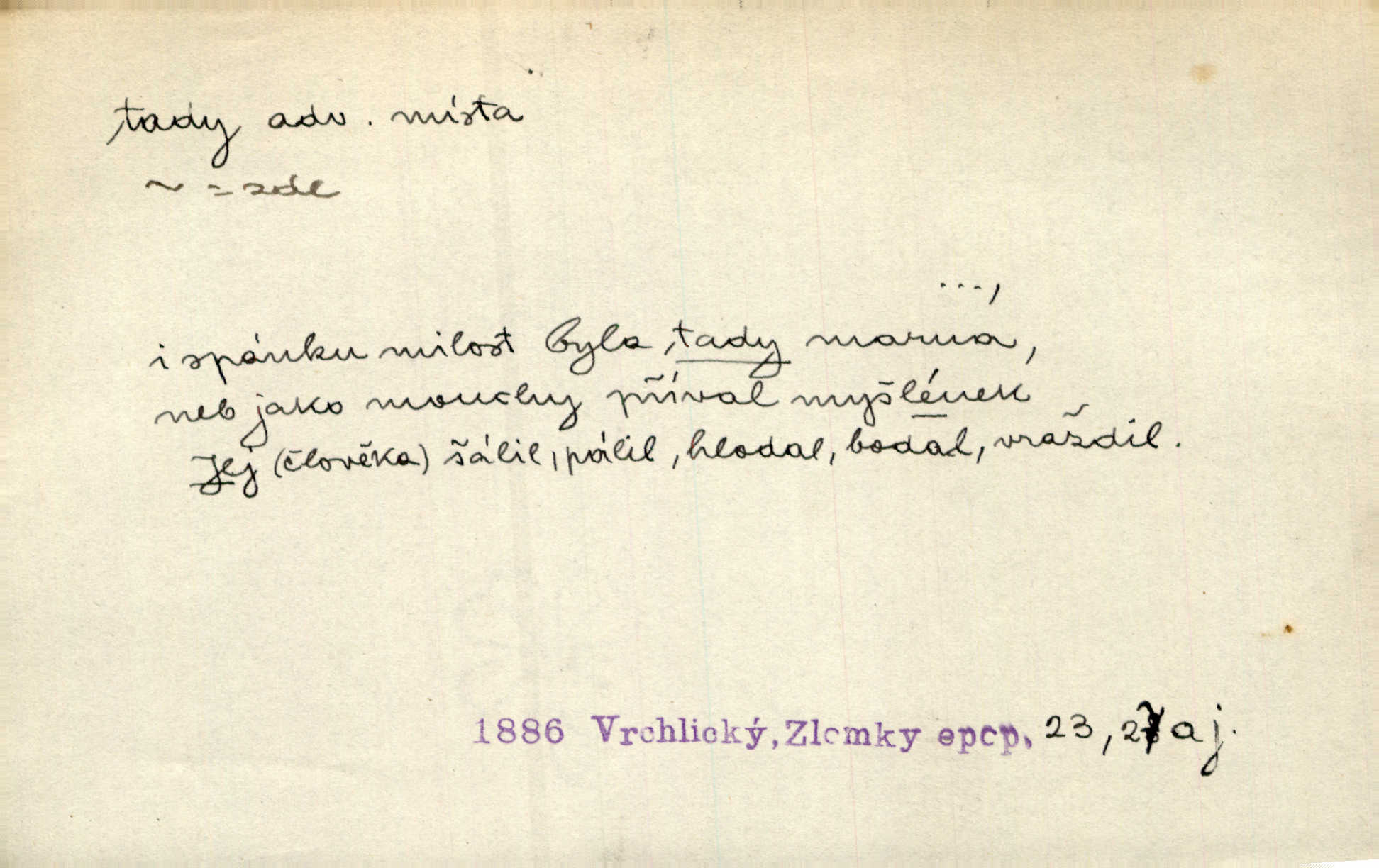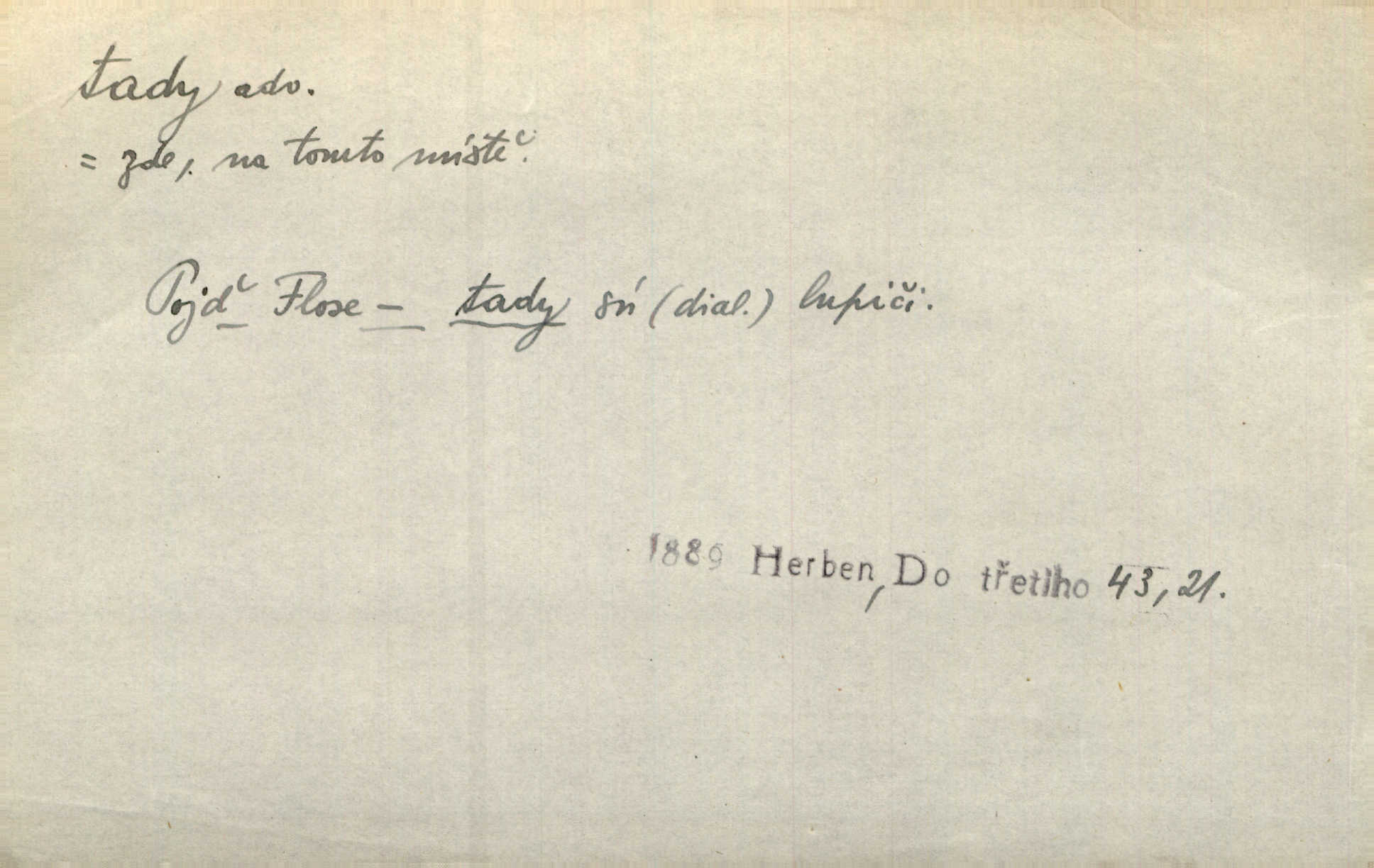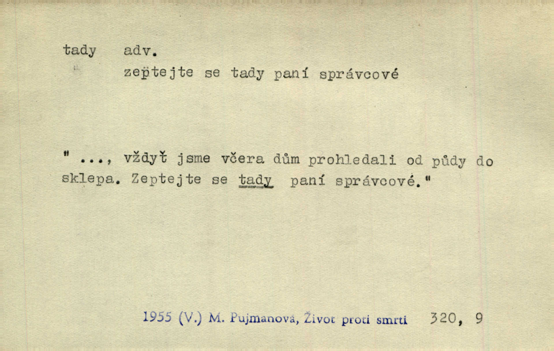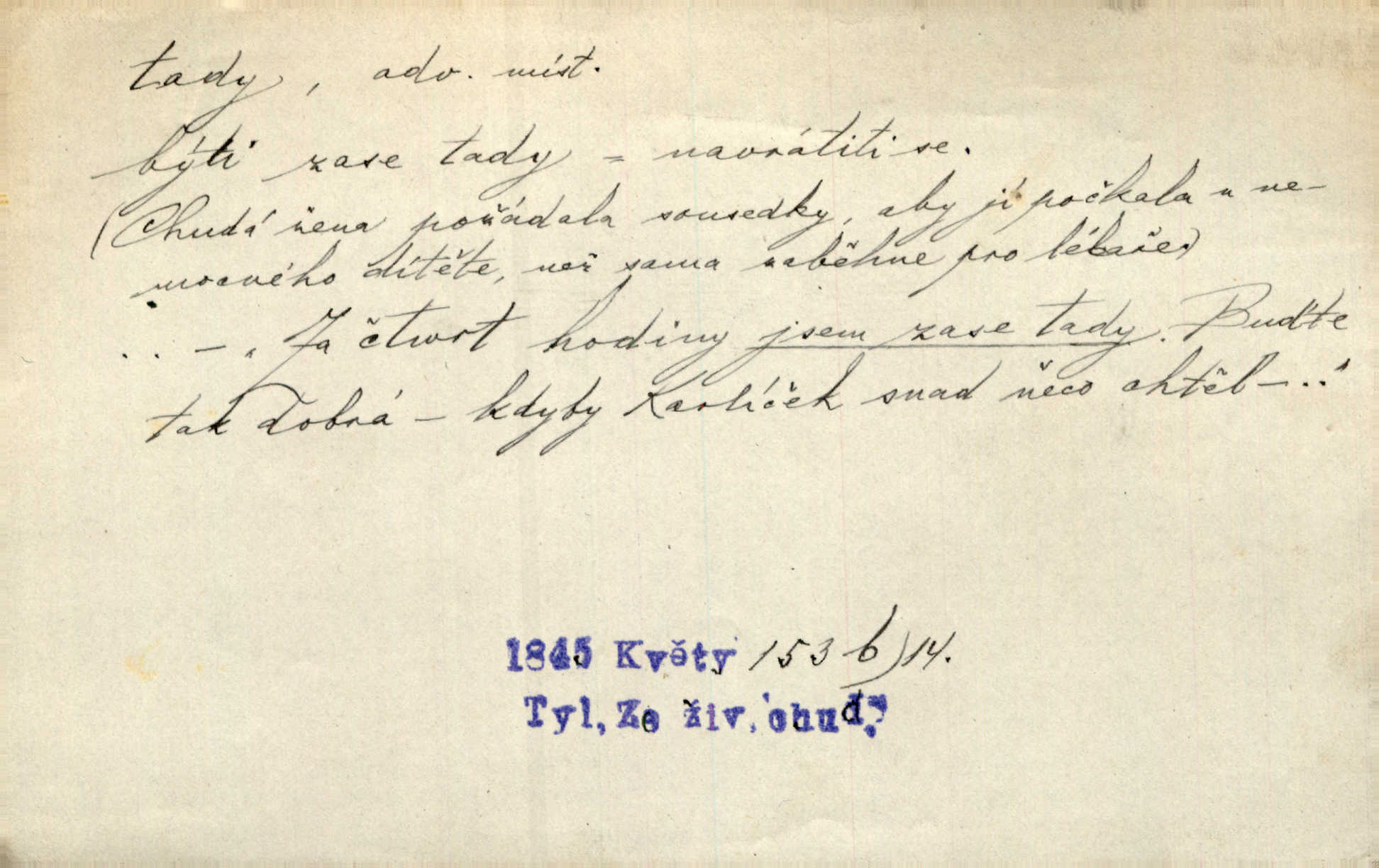 - tady (dial. tadyk) adv. ob. na tomto místě, zde, tu. Za čtvrt hodiny jsem zase tady. Tyl. Tady máš vrabců dost — dívej se! A. Mrš. Tady člověk nemá ani chvilku pokoje. Ner. Vytáhl dvě košťata a povídá: „Tady máš!“ Čap. Ch. [Čápi] širému kraji přinesli jistojistou zvěst, že jaro je tady nastalo. Rais. Tady jde o to, že ten hoch klesá v tomto případě. Svob. Jaké tady rozvažování. Poláč. I tadyk na horách jsem byl. Jir.