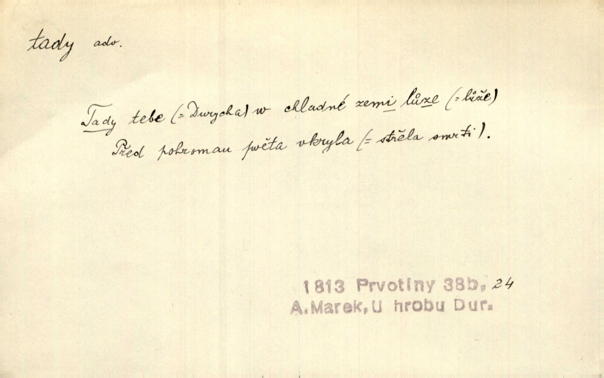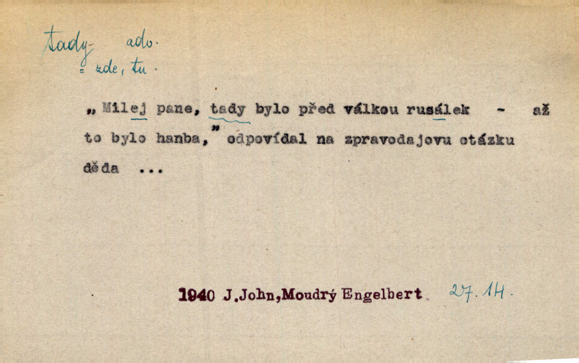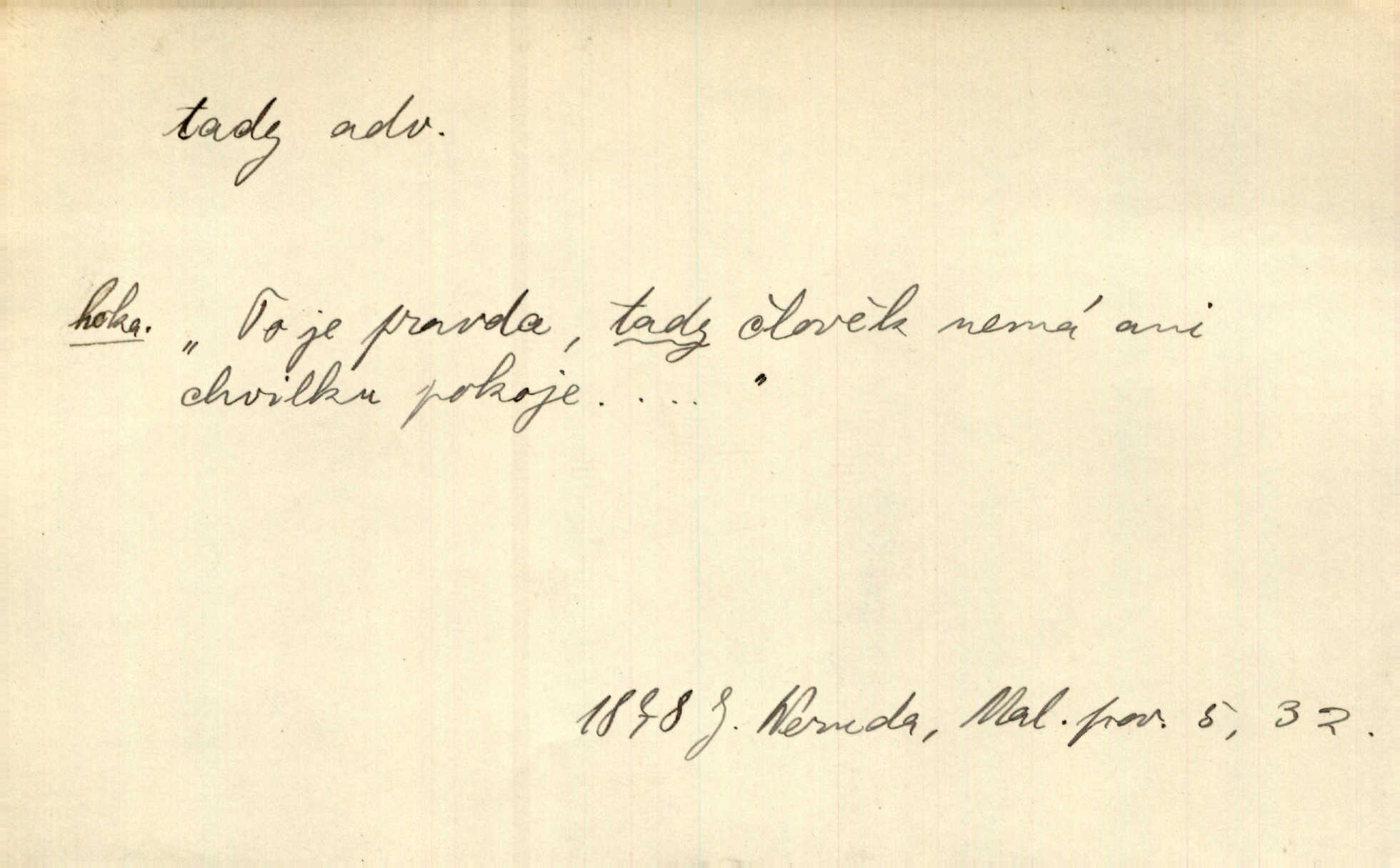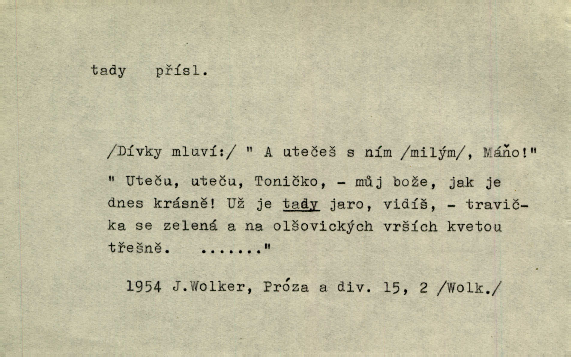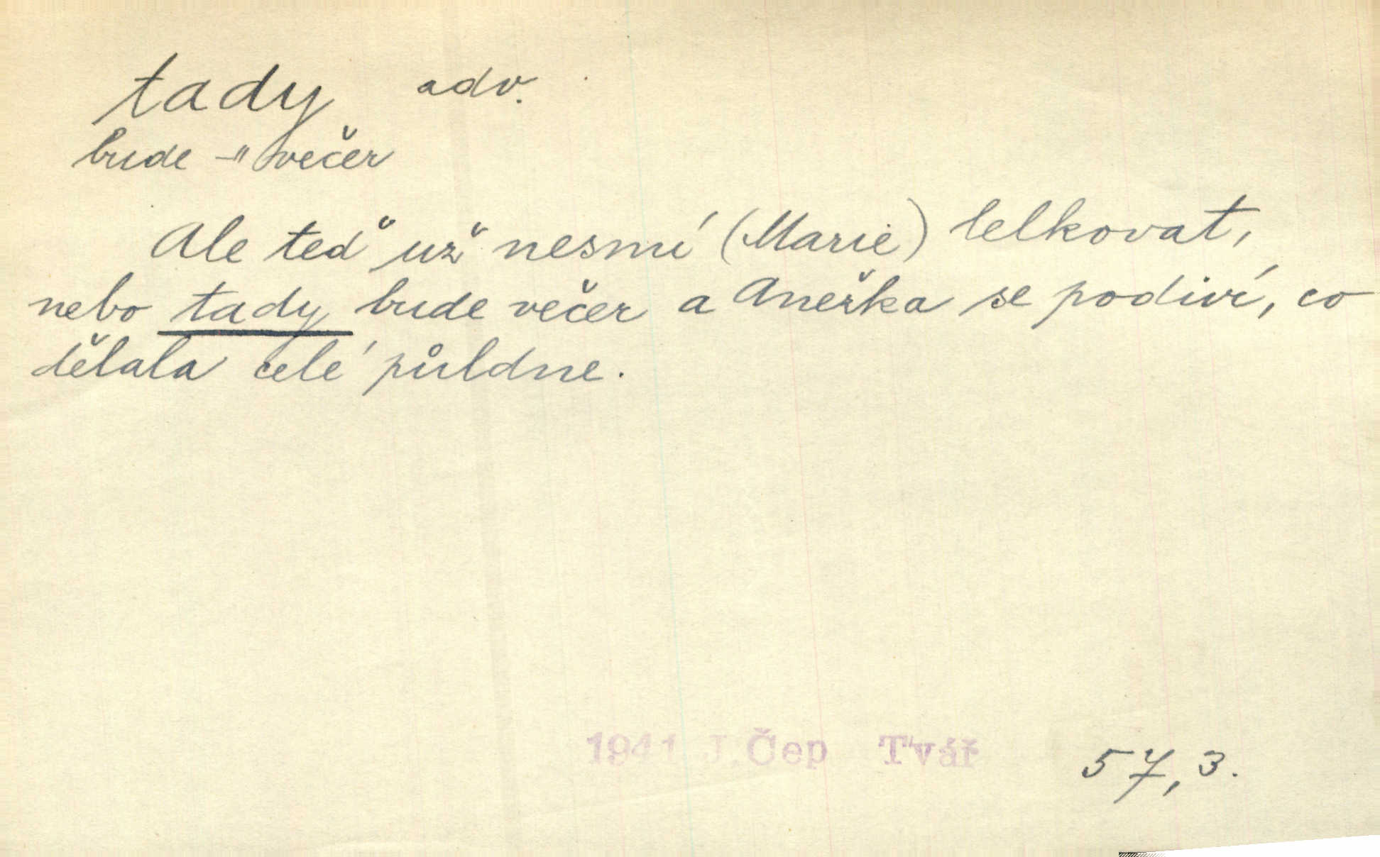 - tady (dial. tadyk) adv. ob. na tomto místě, zde, tu. Za čtvrt hodiny jsem zase tady. Tyl. Tady máš vrabců dost — dívej se! A. Mrš. Tady člověk nemá ani chvilku pokoje. Ner. Vytáhl dvě košťata a povídá: „Tady máš!“ Čap. Ch. [Čápi] širému kraji přinesli jistojistou zvěst, že jaro je tady nastalo. Rais. Tady jde o to, že ten hoch klesá v tomto případě. Svob. Jaké tady rozvažování. Poláč. I tadyk na horách jsem byl. Jir.