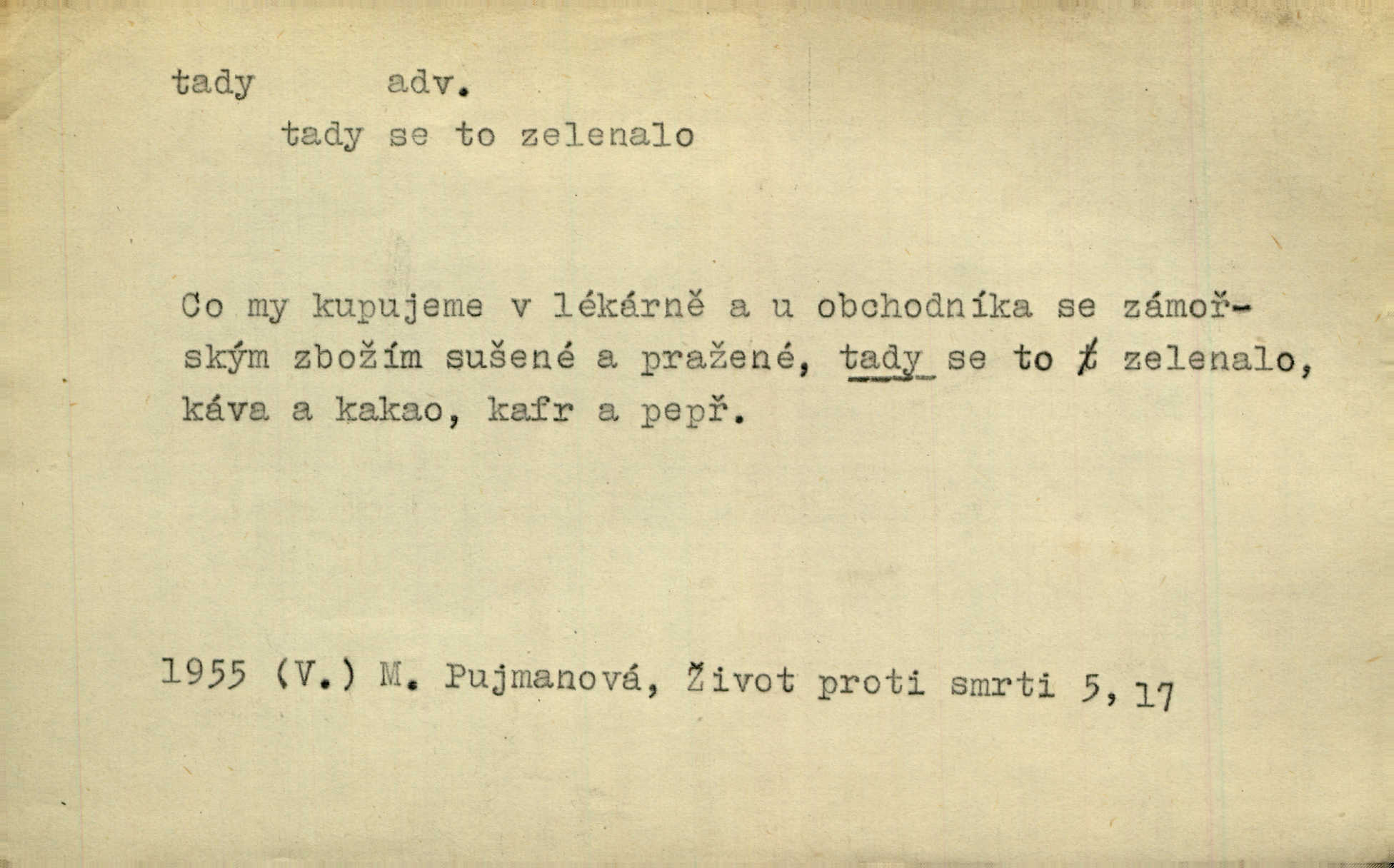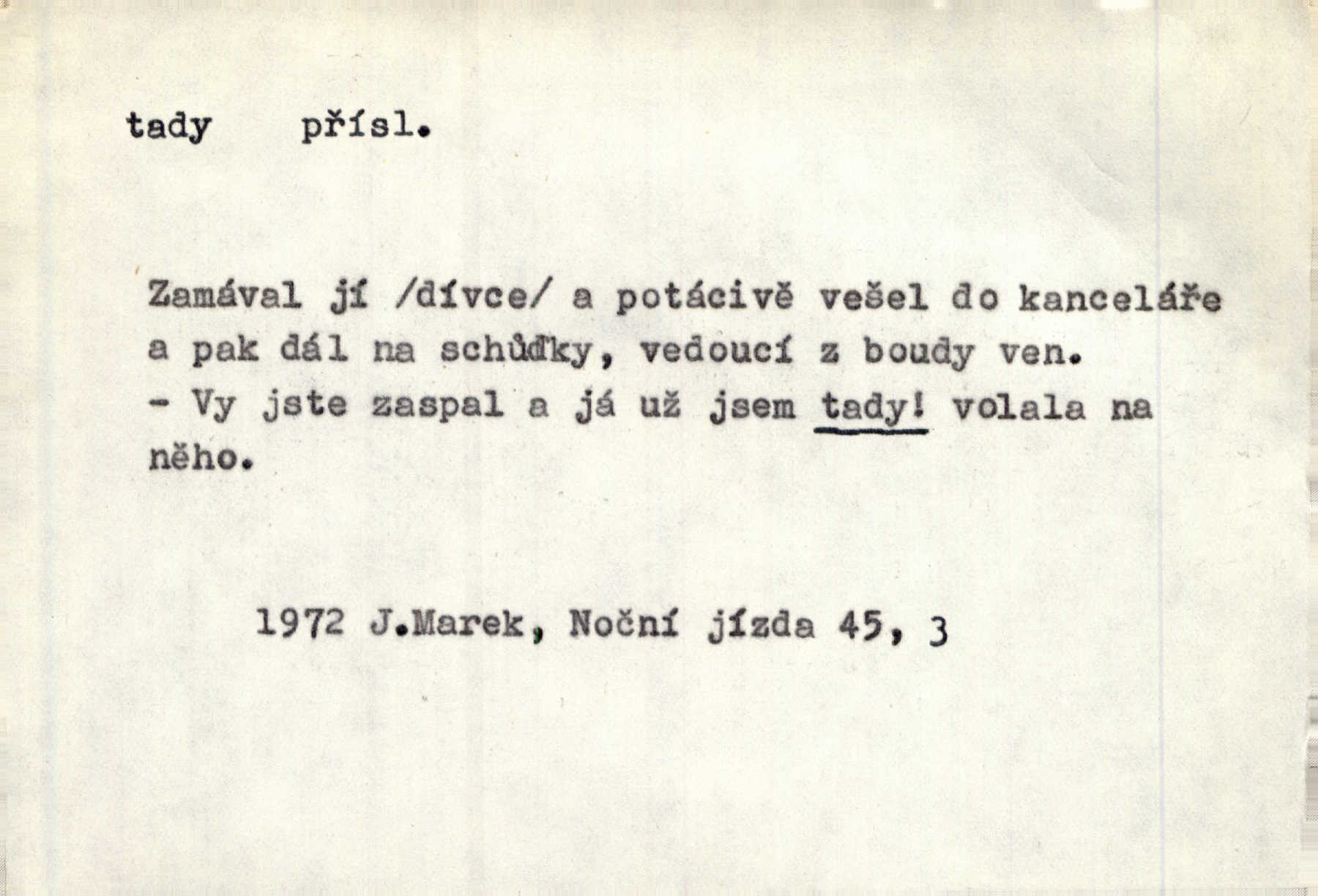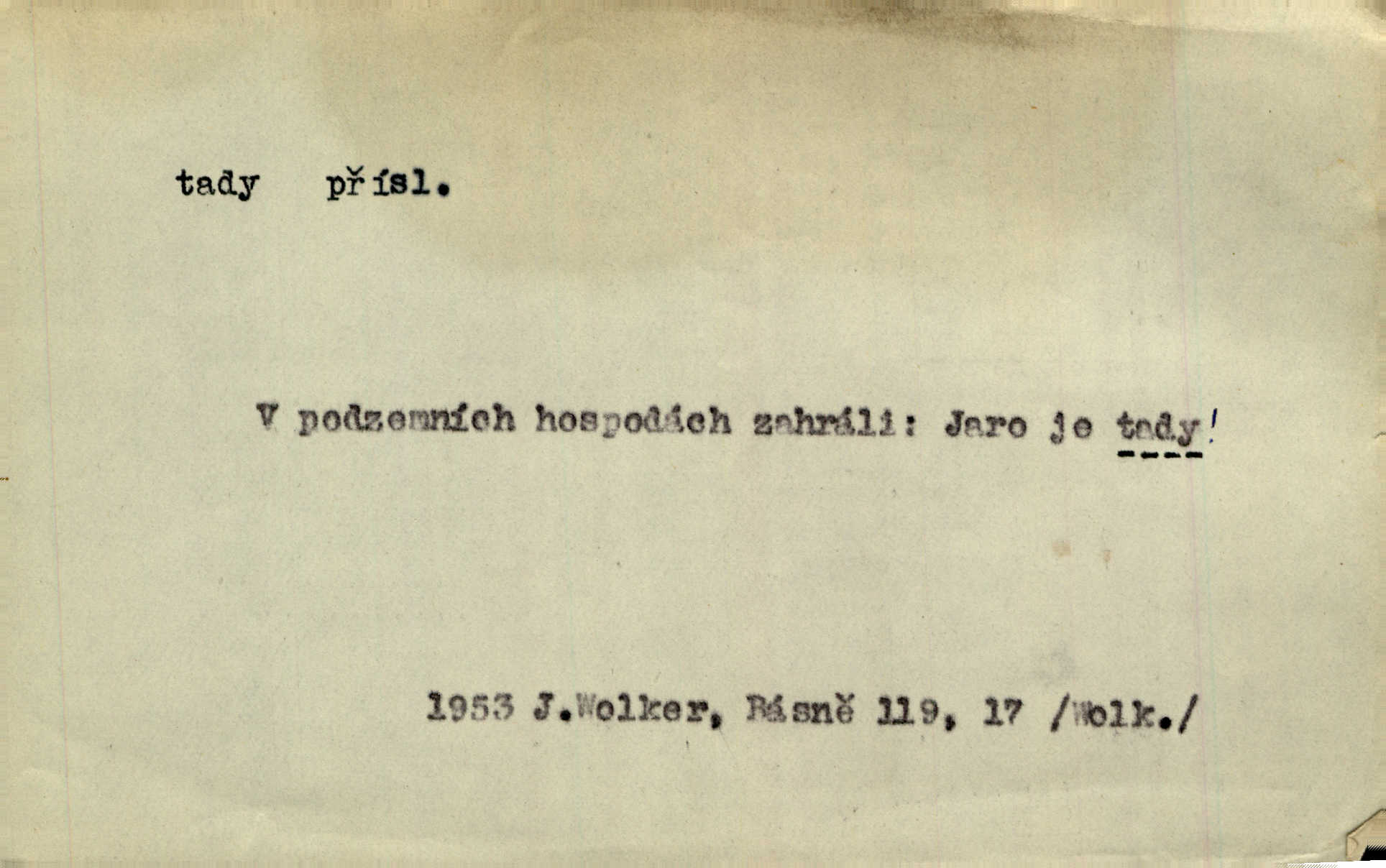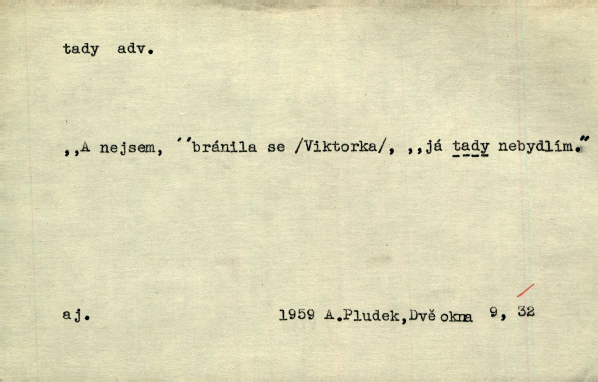 - tady (dial. tadyk) adv. ob. na tomto místě, zde, tu. Za čtvrt hodiny jsem zase tady. Tyl. Tady máš vrabců dost — dívej se! A. Mrš. Tady člověk nemá ani chvilku pokoje. Ner. Vytáhl dvě košťata a povídá: „Tady máš!“ Čap. Ch. [Čápi] širému kraji přinesli jistojistou zvěst, že jaro je tady nastalo. Rais. Tady jde o to, že ten hoch klesá v tomto případě. Svob. Jaké tady rozvažování. Poláč. I tadyk na horách jsem byl. Jir.