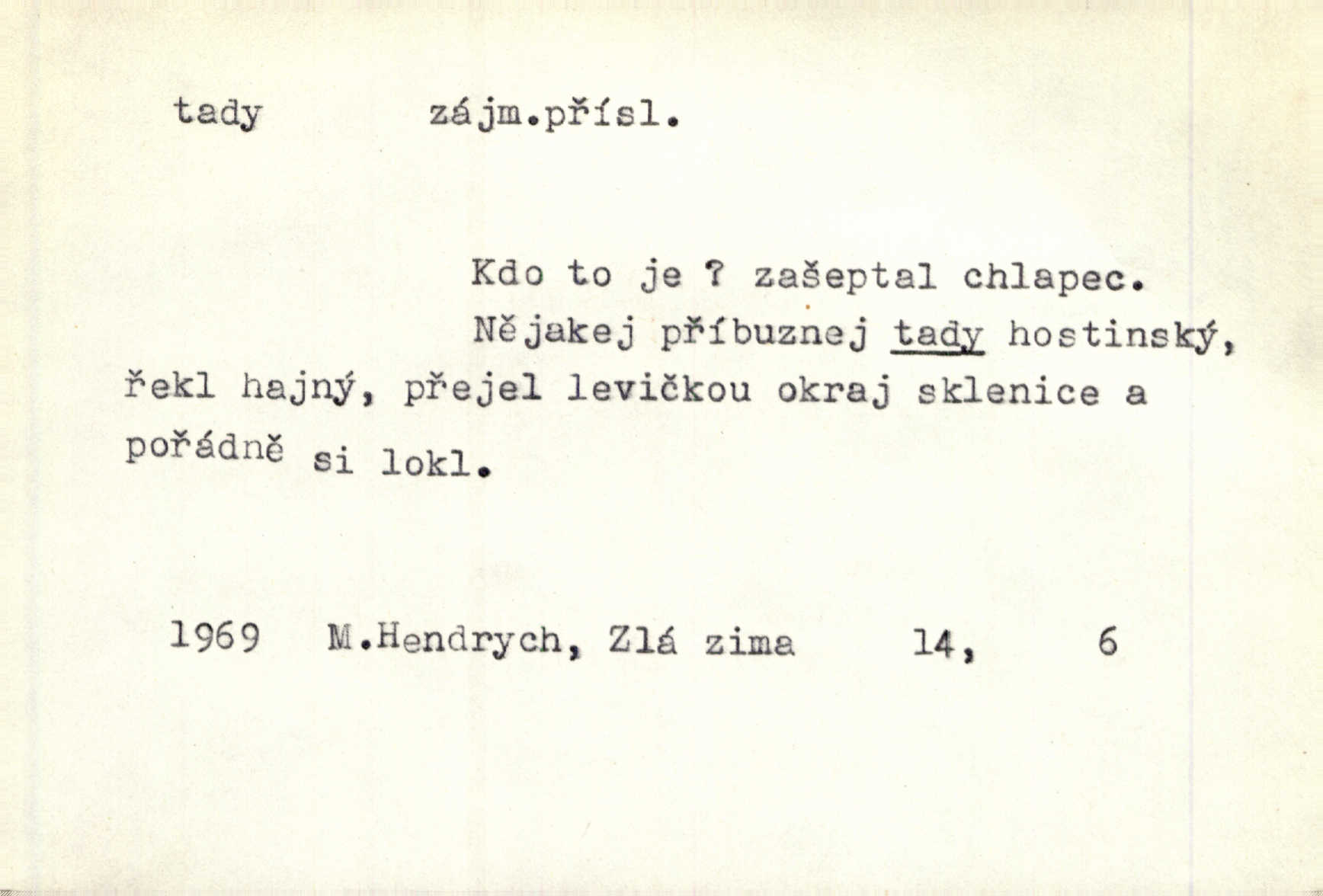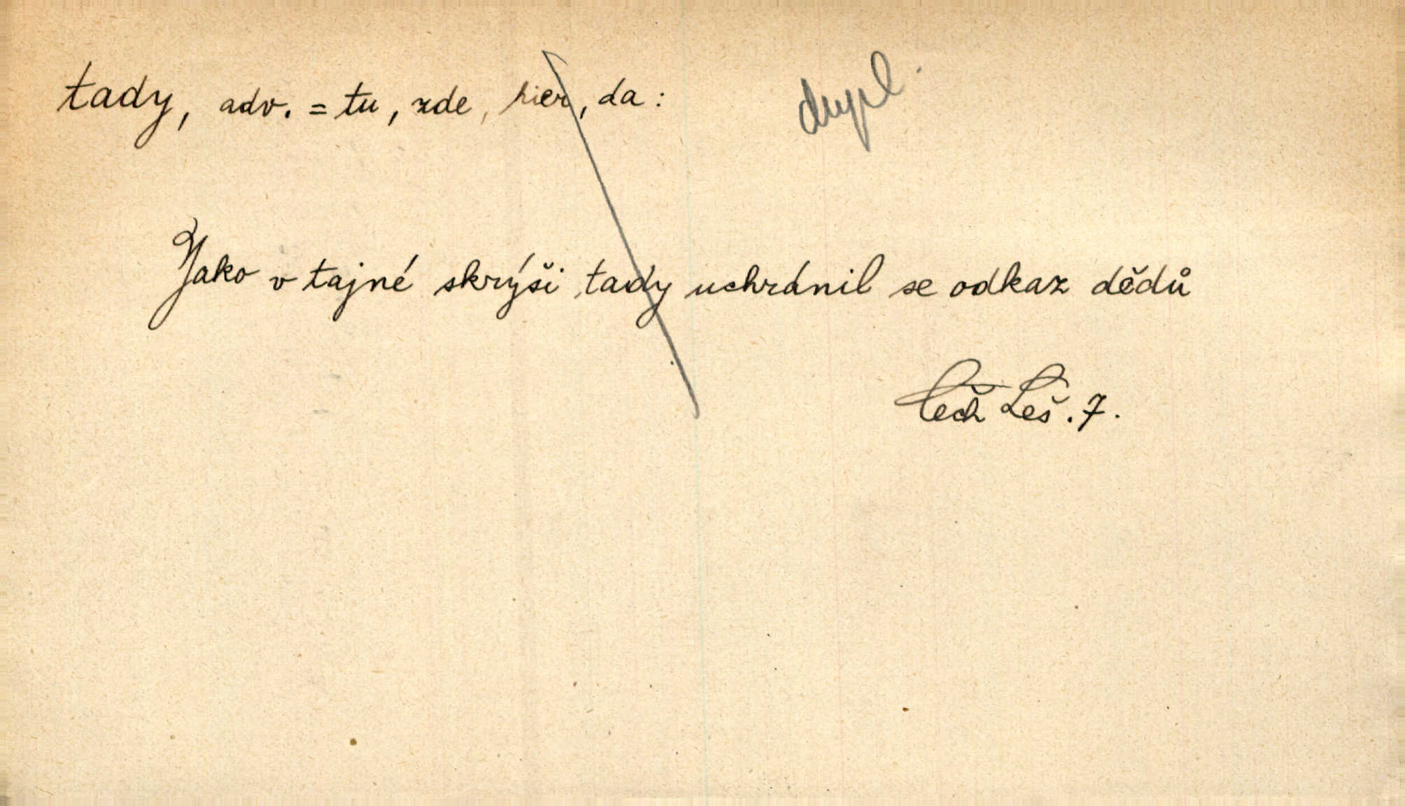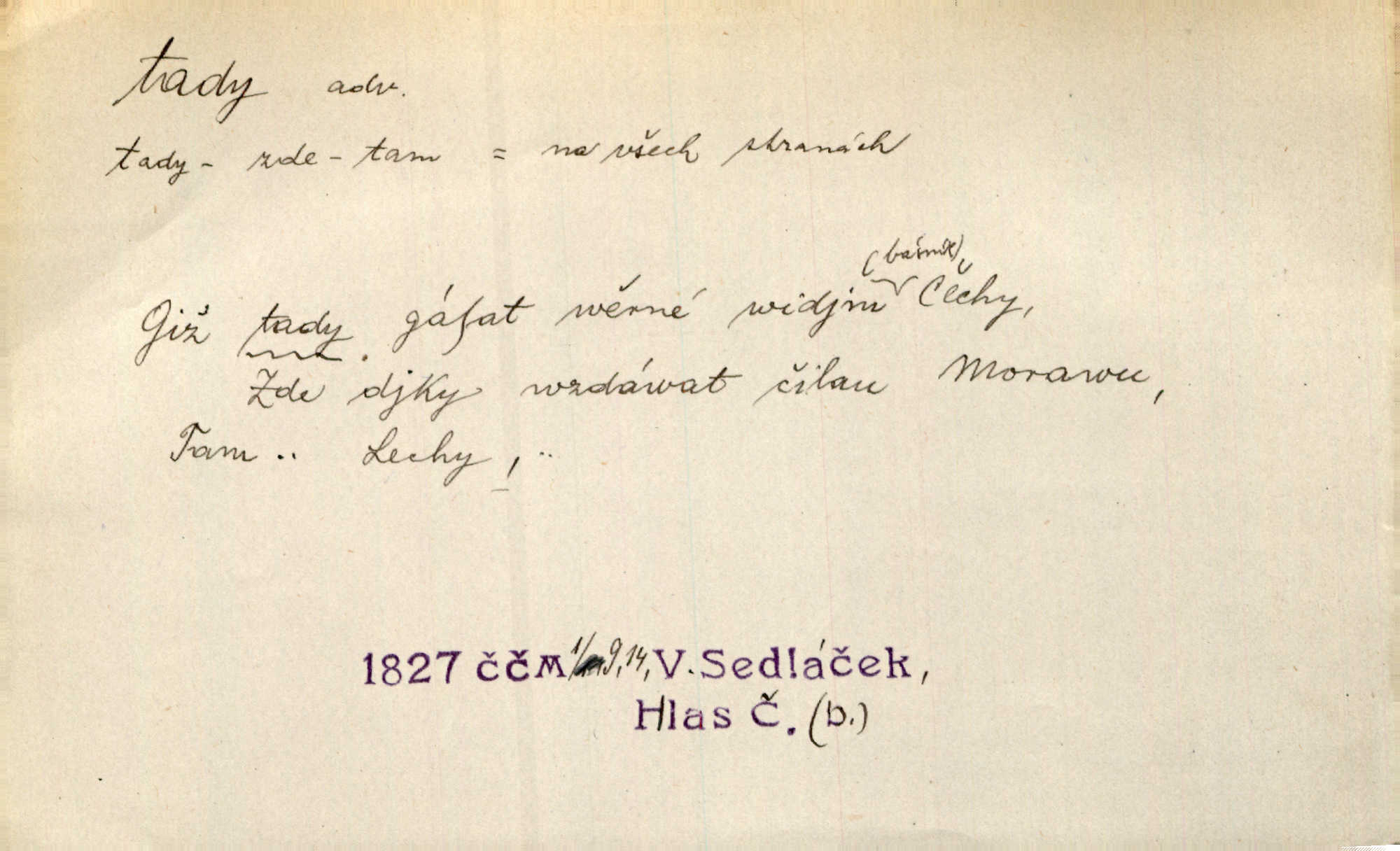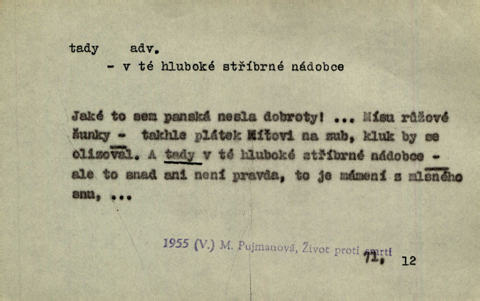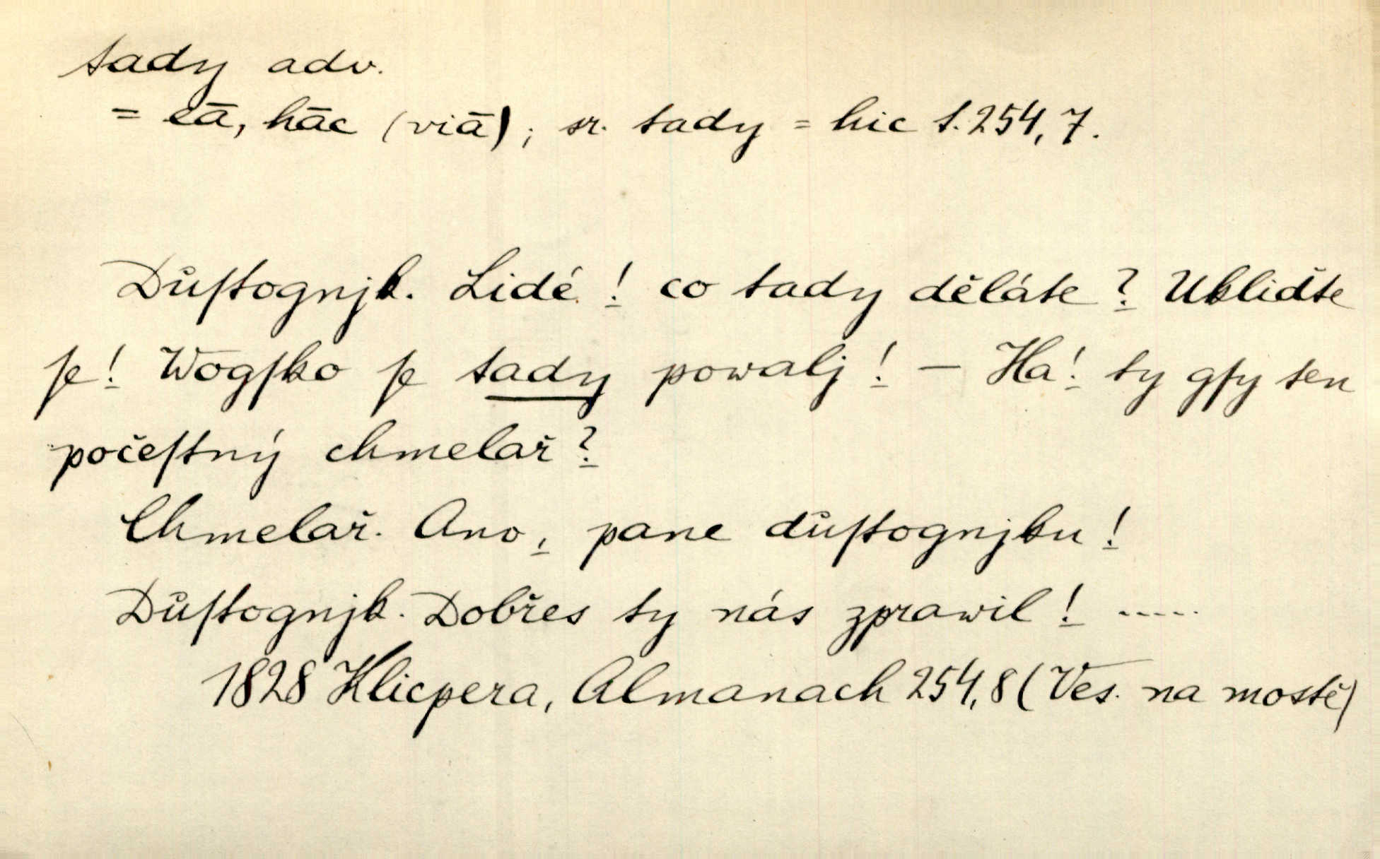 - tady (dial. tadyk) adv. ob. na tomto místě, zde, tu. Za čtvrt hodiny jsem zase tady. Tyl. Tady máš vrabců dost — dívej se! A. Mrš. Tady člověk nemá ani chvilku pokoje. Ner. Vytáhl dvě košťata a povídá: „Tady máš!“ Čap. Ch. [Čápi] širému kraji přinesli jistojistou zvěst, že jaro je tady nastalo. Rais. Tady jde o to, že ten hoch klesá v tomto případě. Svob. Jaké tady rozvažování. Poláč. I tadyk na horách jsem byl. Jir.