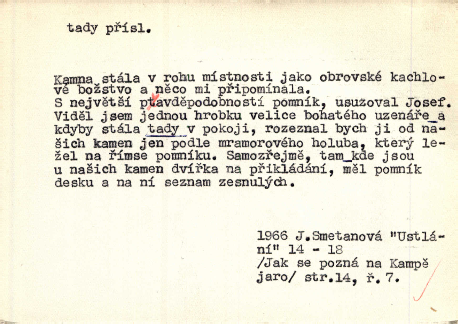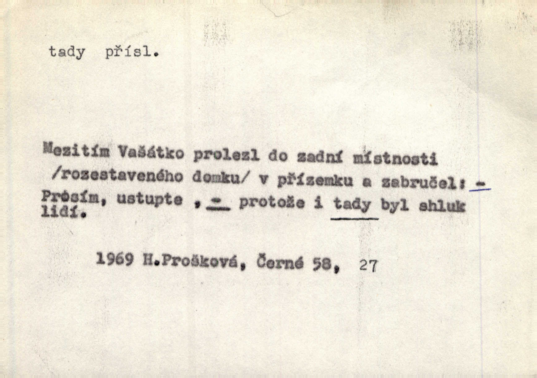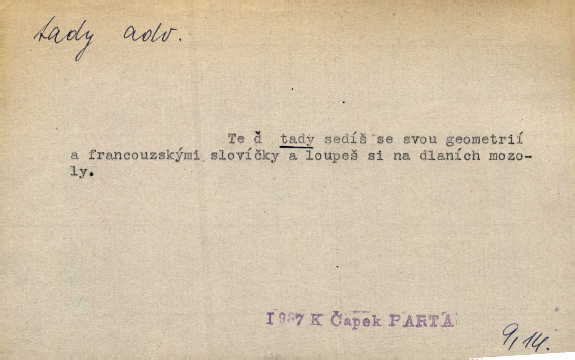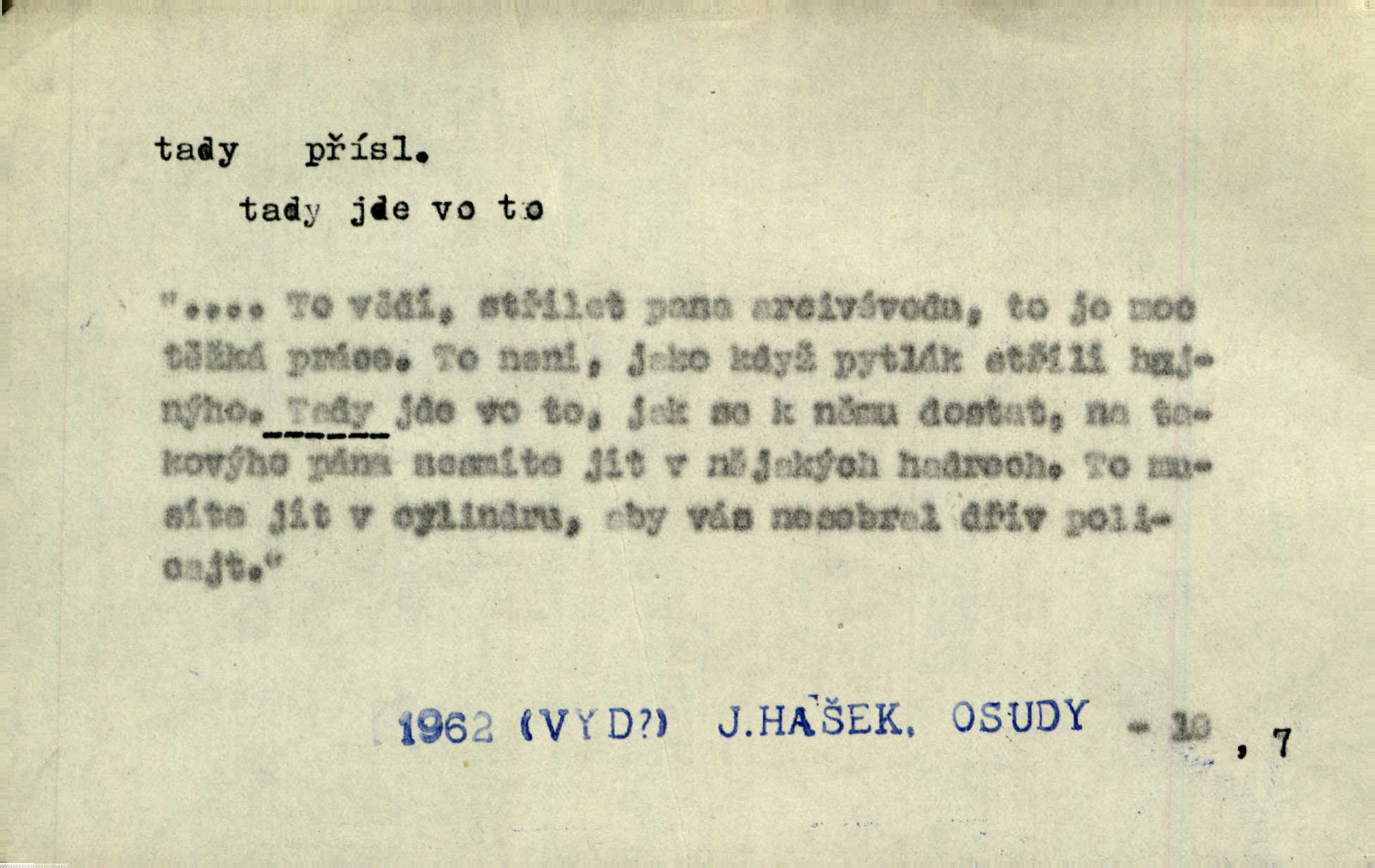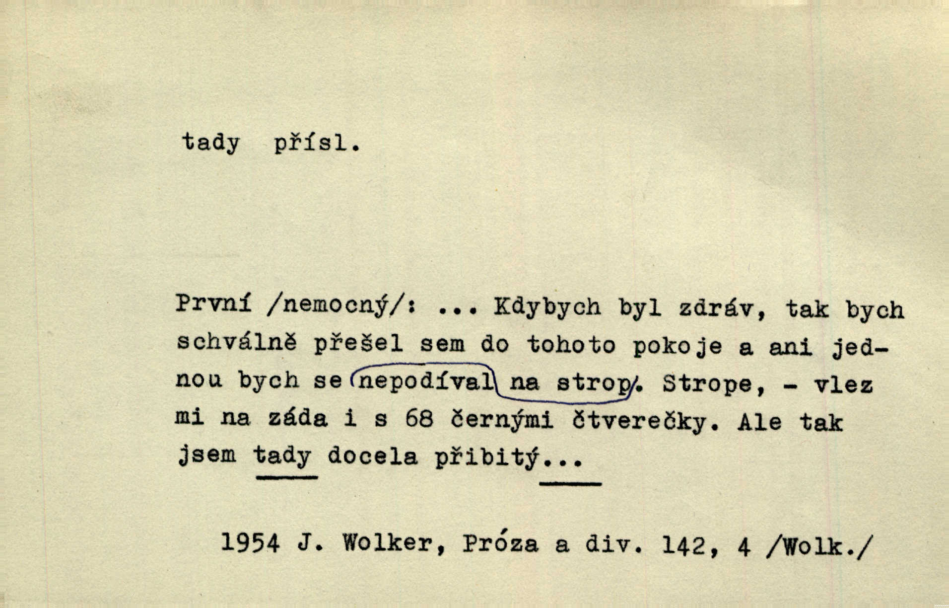 - tady (dial. tadyk) adv. ob. na tomto místě, zde, tu. Za čtvrt hodiny jsem zase tady. Tyl. Tady máš vrabců dost — dívej se! A. Mrš. Tady člověk nemá ani chvilku pokoje. Ner. Vytáhl dvě košťata a povídá: „Tady máš!“ Čap. Ch. [Čápi] širému kraji přinesli jistojistou zvěst, že jaro je tady nastalo. Rais. Tady jde o to, že ten hoch klesá v tomto případě. Svob. Jaké tady rozvažování. Poláč. I tadyk na horách jsem byl. Jir.