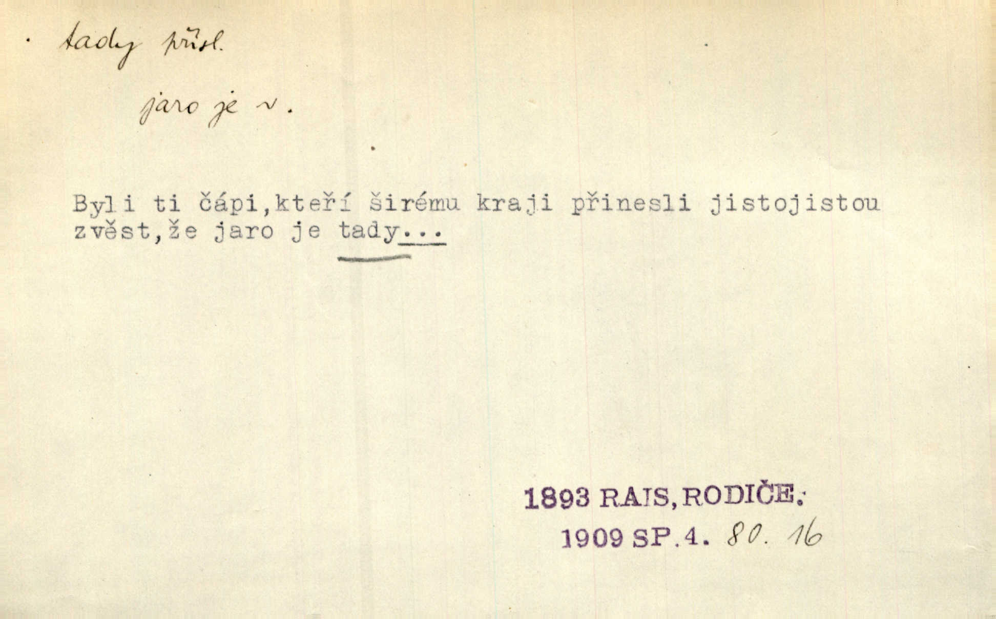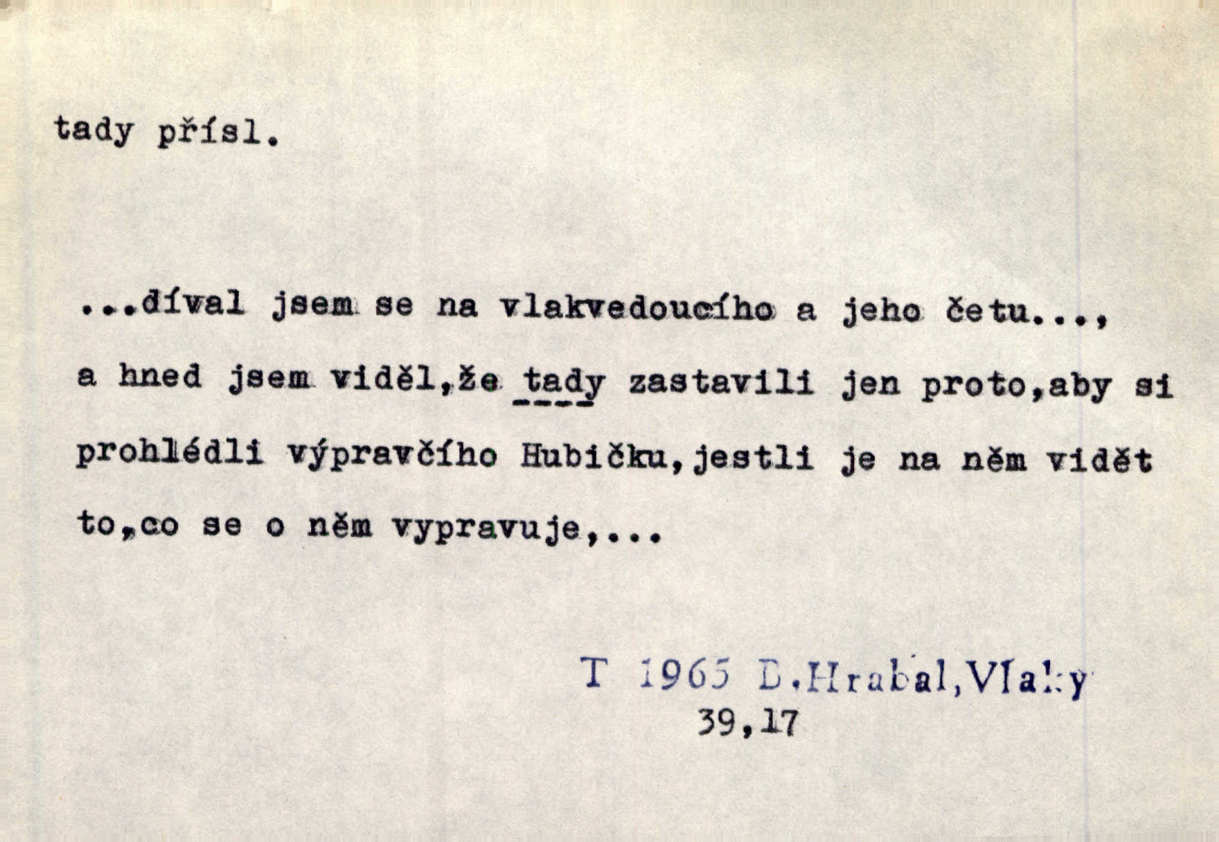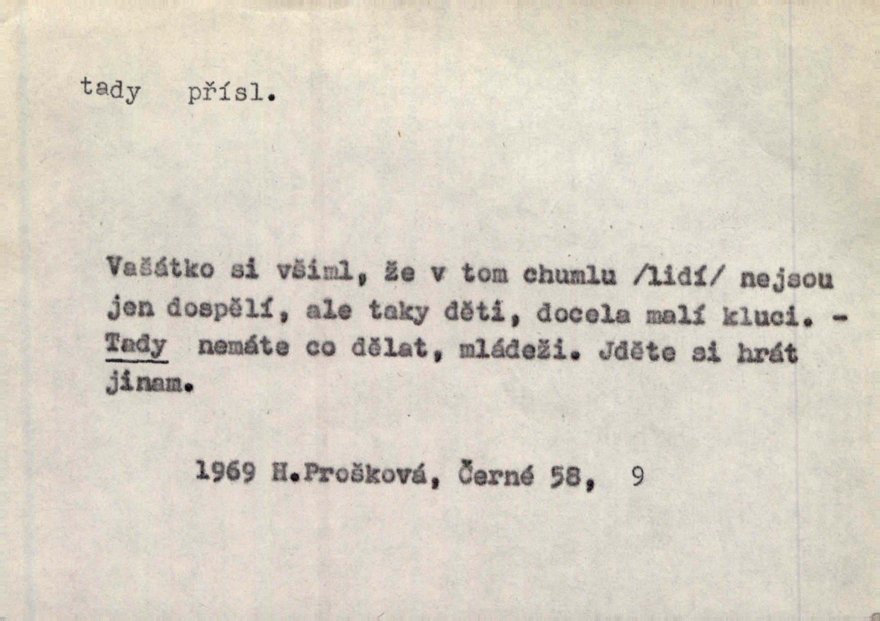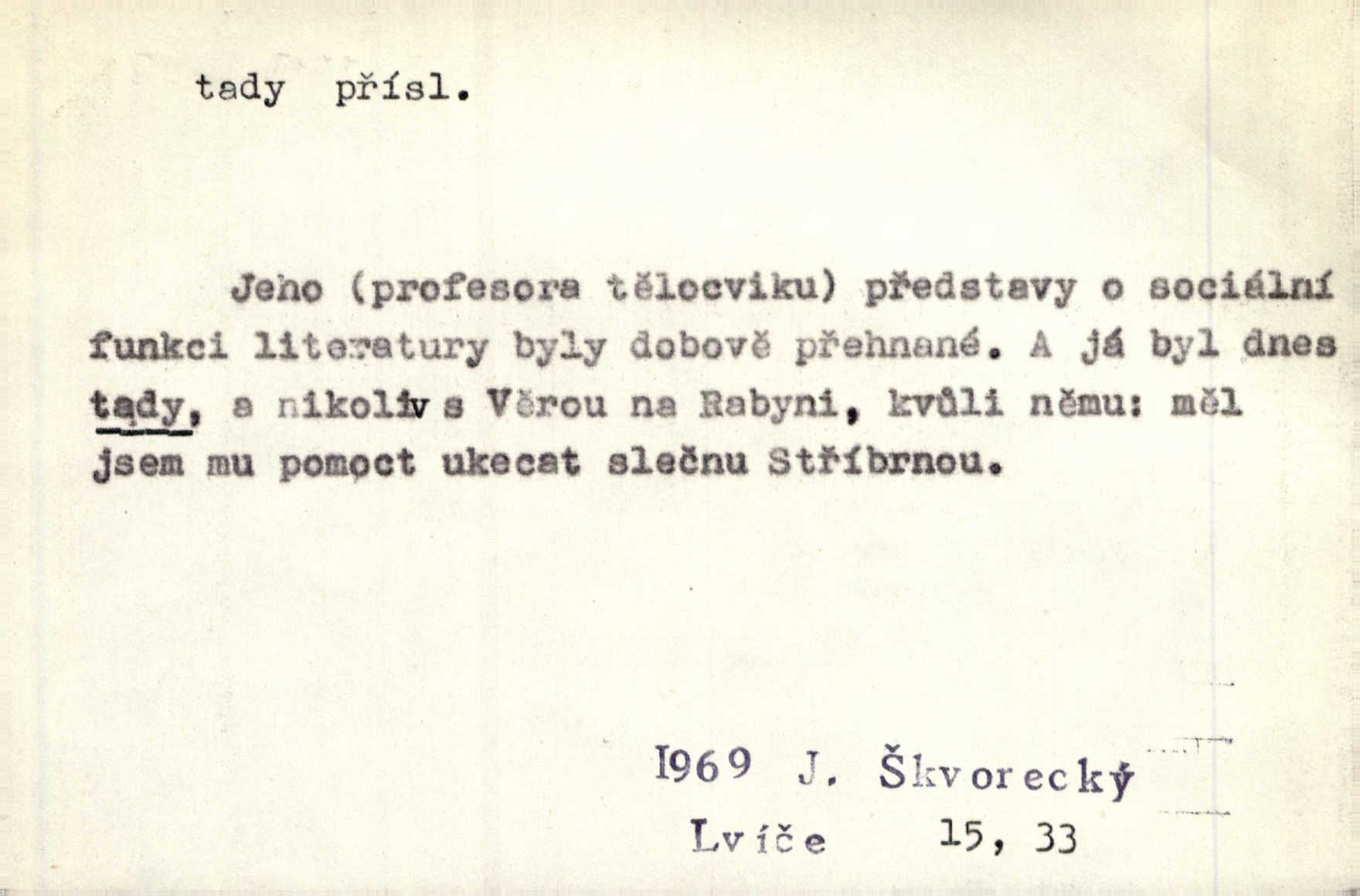 - tady (dial. tadyk) adv. ob. na tomto místě, zde, tu. Za čtvrt hodiny jsem zase tady. Tyl. Tady máš vrabců dost — dívej se! A. Mrš. Tady člověk nemá ani chvilku pokoje. Ner. Vytáhl dvě košťata a povídá: „Tady máš!“ Čap. Ch. [Čápi] širému kraji přinesli jistojistou zvěst, že jaro je tady nastalo. Rais. Tady jde o to, že ten hoch klesá v tomto případě. Svob. Jaké tady rozvažování. Poláč. I tadyk na horách jsem byl. Jir.