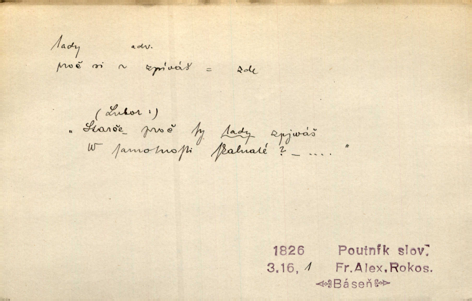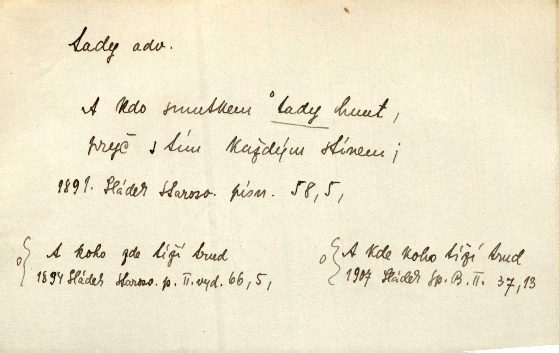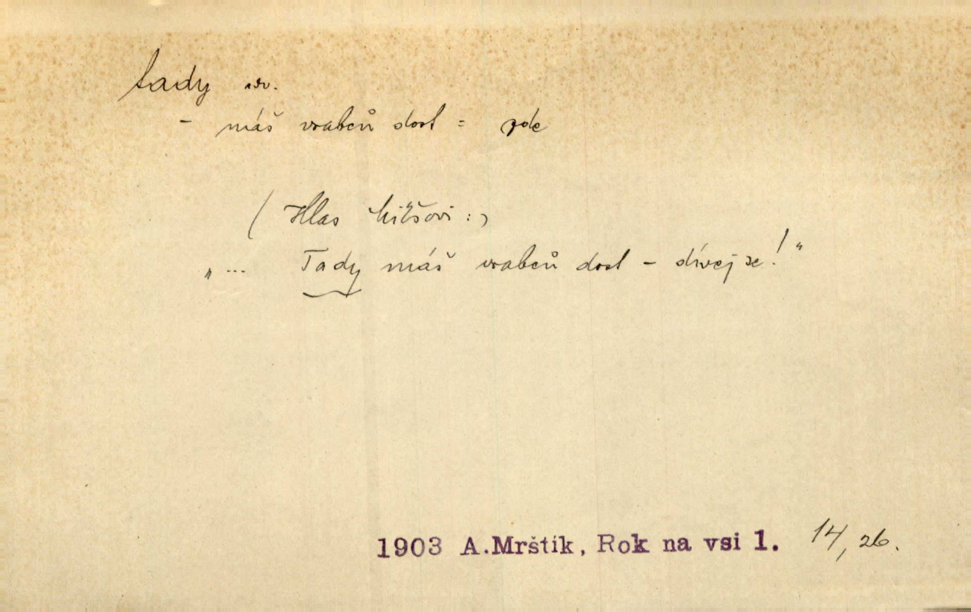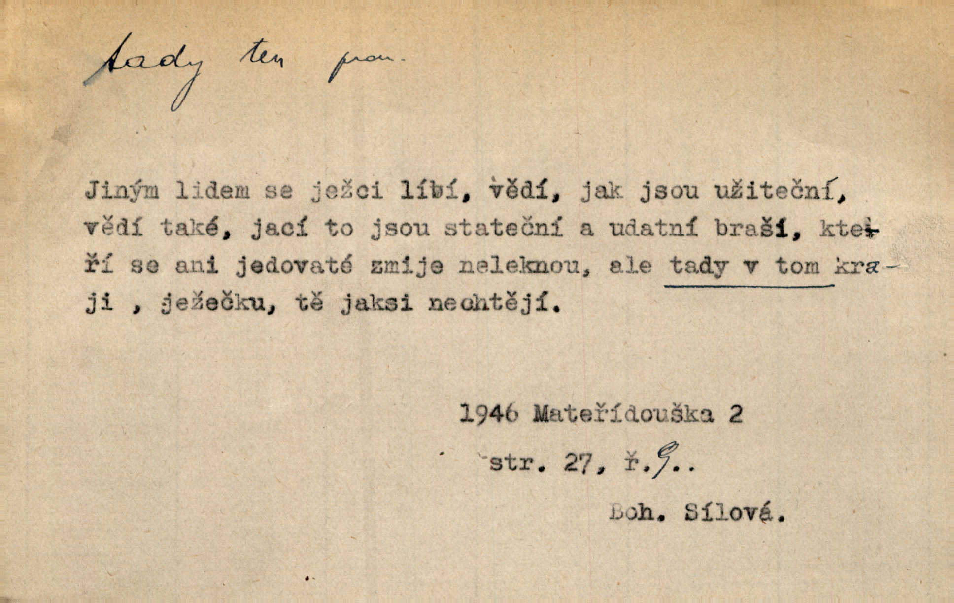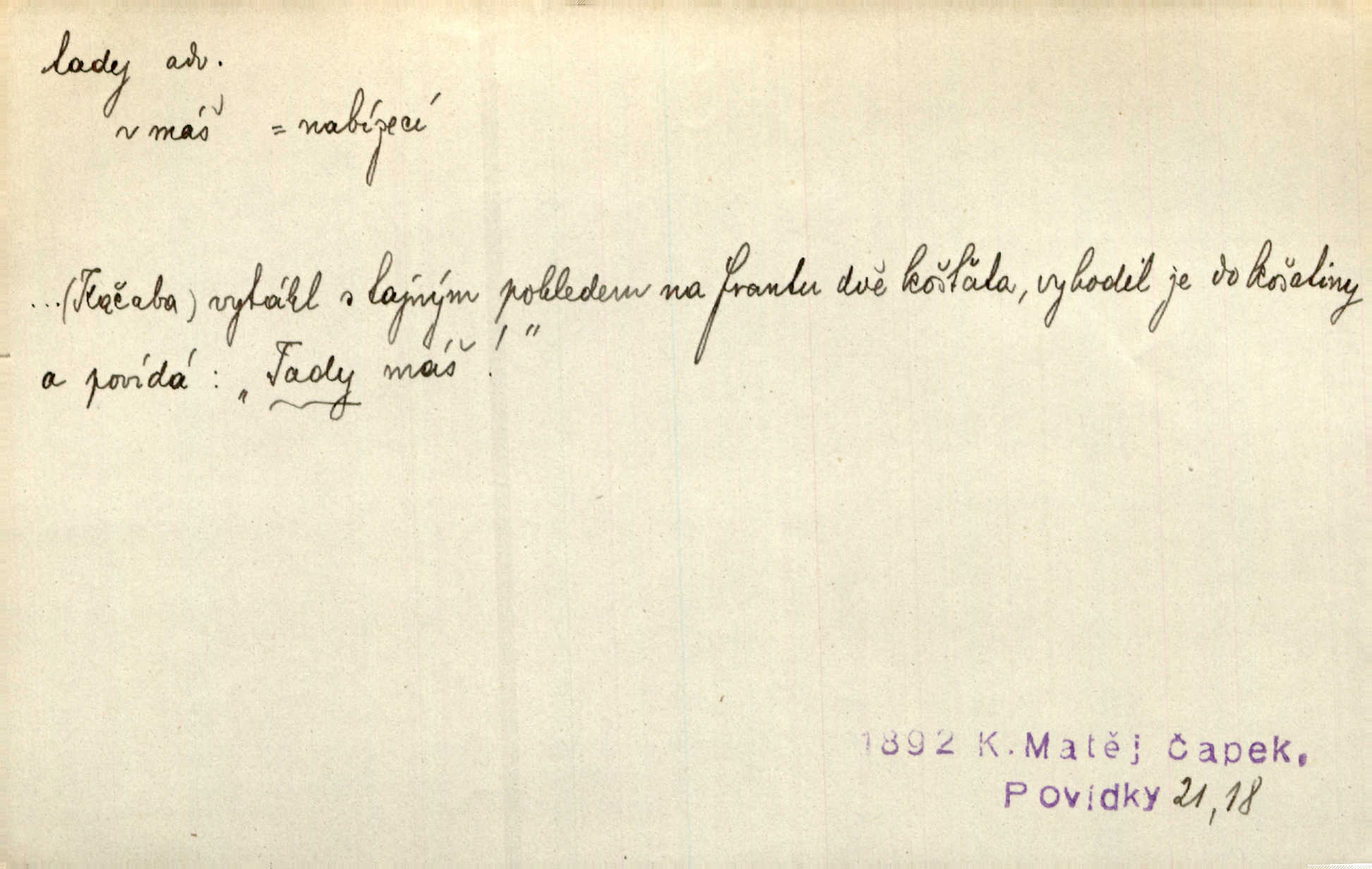 - tady (dial. tadyk) adv. ob. na tomto místě, zde, tu. Za čtvrt hodiny jsem zase tady. Tyl. Tady máš vrabců dost — dívej se! A. Mrš. Tady člověk nemá ani chvilku pokoje. Ner. Vytáhl dvě košťata a povídá: „Tady máš!“ Čap. Ch. [Čápi] širému kraji přinesli jistojistou zvěst, že jaro je tady nastalo. Rais. Tady jde o to, že ten hoch klesá v tomto případě. Svob. Jaké tady rozvažování. Poláč. I tadyk na horách jsem byl. Jir.
