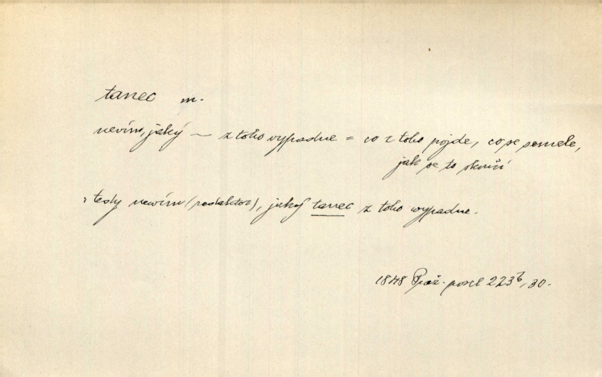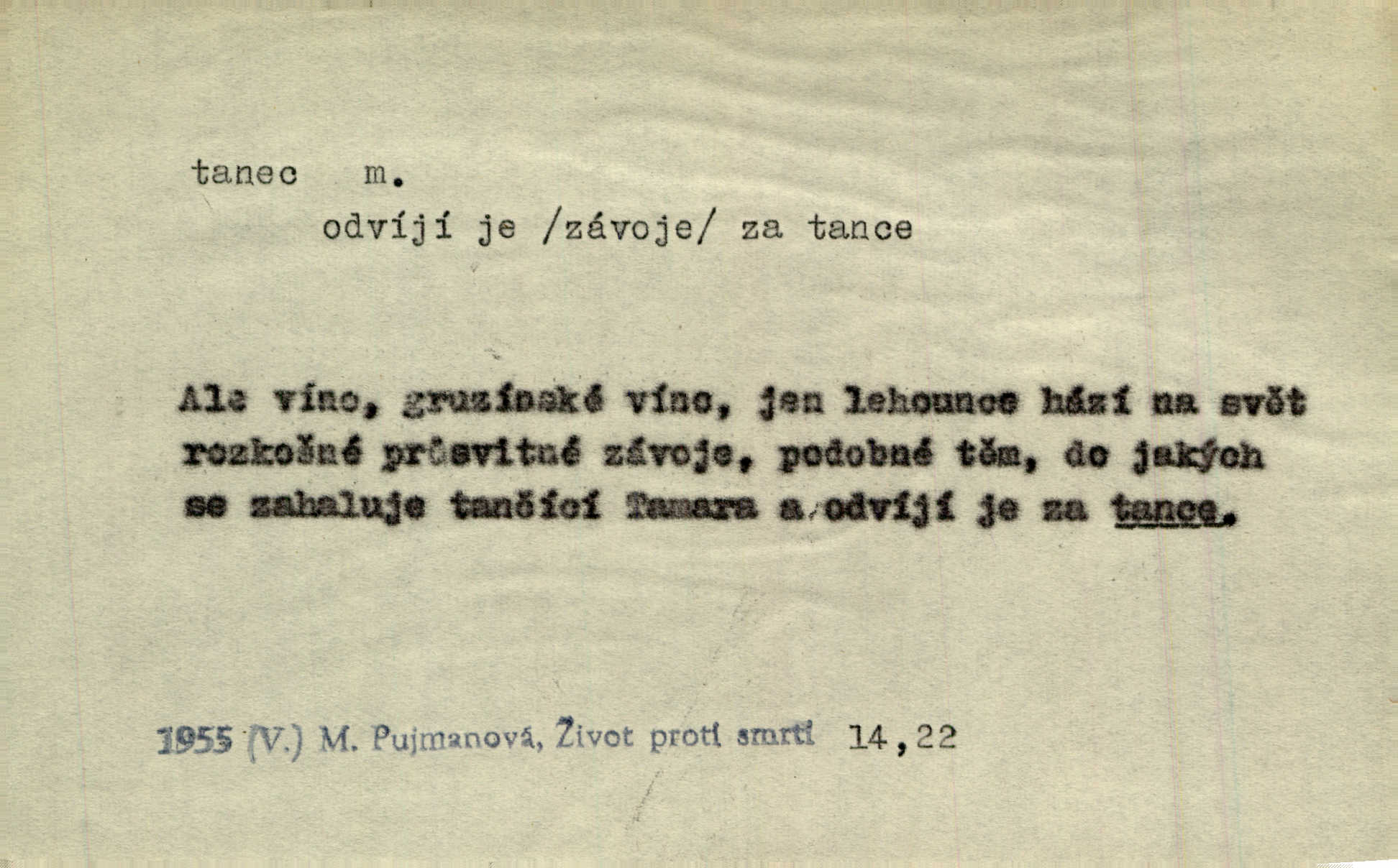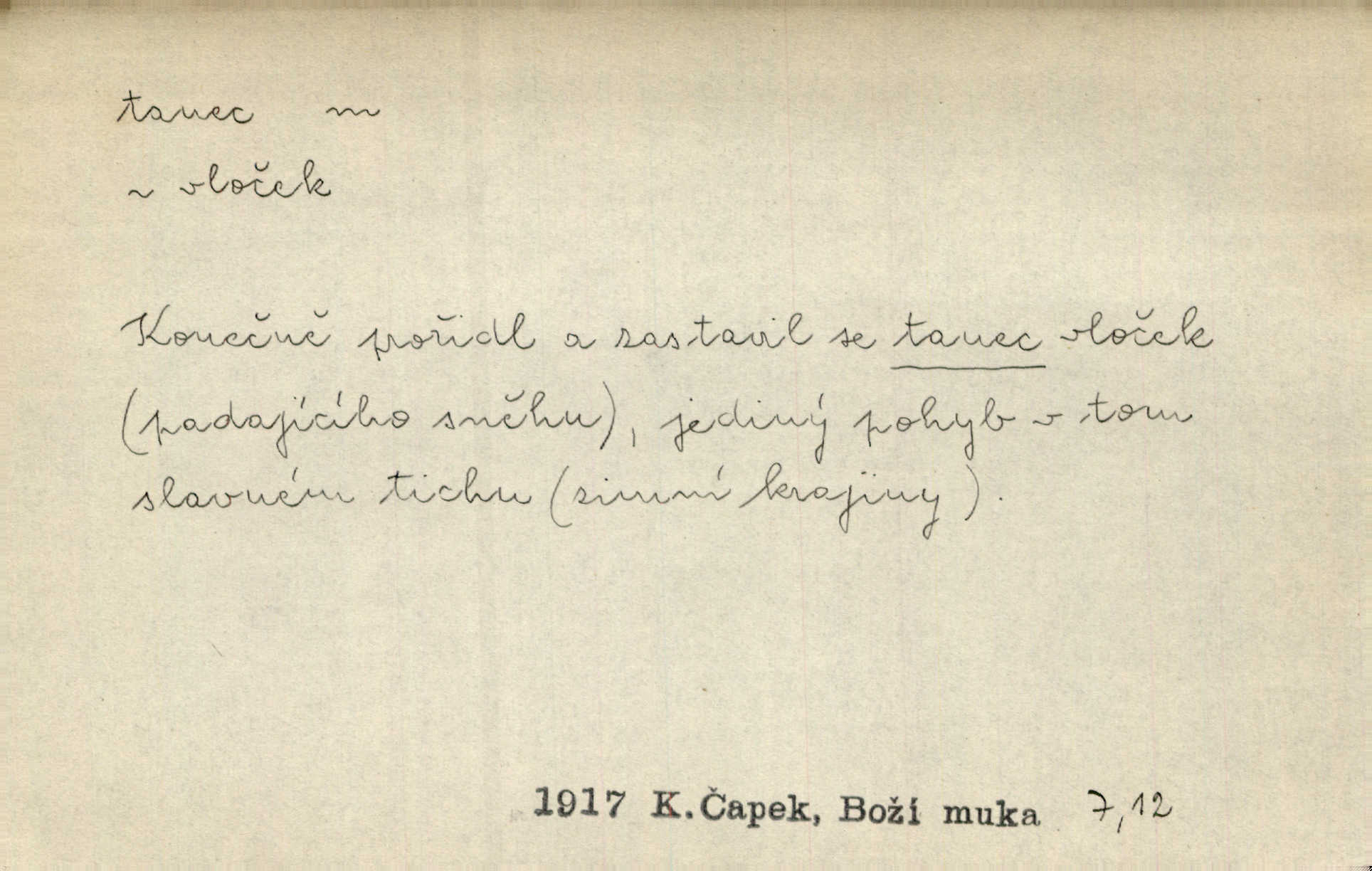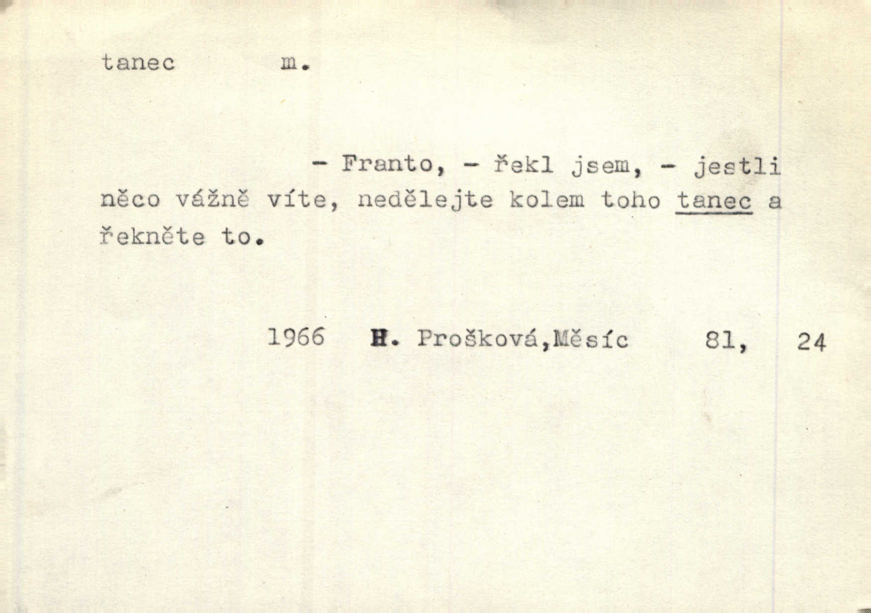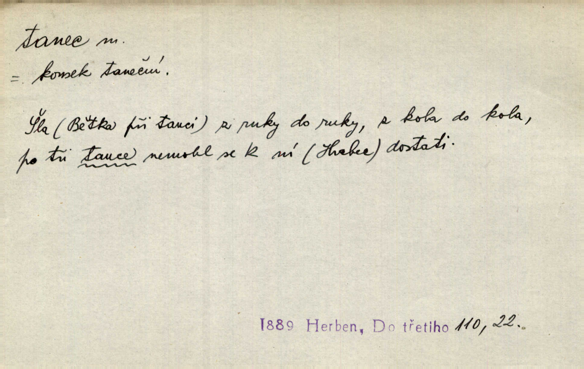 - tanec, -nce m. opakované rytmické pohyby, prováděné jednou n. více osobami, zpr. za doprovodu hudby n. zpěvu. V největším zalíbení byl zpěv, hudba i tanec. Pal. Seznámil jsem se při tanci s jistou Pražankou. Ner. V divokém tanci zavířil s ní sálem. Čech. Ji chtěl bráti k tanci, ale nešla. Prav. Za tanec bych byla duši dala. Šim. Chtěl životem jíti jako v tanci, lehce, pružně. Kar. Skotačily [mořské vlny] jedna přes druhou, hrály si v tanci. Ner. Nám se čtyrmi dětmi do tance nebude nebudeme mít snadné živobytí. Rais. Za schopna provésti tento státnický čin, provésti tanec mezi vejci, pokládán byl Plener nesnadný skutek. Čes. sl. Vyhodili si kopýtkem, vyšli si na led k tanci vydali se na nebezpečnou cestu. Svět. D jistý druh těchto rytmických pohybů, prováděných podle ustálených pravidel; hudební doprovod k těmto pohybům. Tu ještě viděti staré tance. Jir. Quadrilla trvá déle, než tanec do kola. Prok. Po přivítání dali nám zahrát národní tance. Něm. Koupím 3 páry střevíčků pro špičkový tanec. Čes. sl. „Italský tanec“ či „pantomima“ předváděla celá dramata. Ner. Hvízdal si úryvky včerejších tanců. R. Svob. První tvůj obraz světa byl tanec smrti. Čap. Tan. tanec kolový, řadový, společenský; lidový, bohoslužebný, obřadný, divošský, idealisovaný, sólový, umělecký a j. D taneční kousek. Po tři tance nemohl se k ní dostati. Herb. Lituji, ale tanec vám dáti nemohu. Bozd. Hud. skladba hraná k tanci. D Expr. poskakování, pobíhání, hbitý, rychlý pohyb, mihotání. Plotna syčí a to je tanec okolo ohně. Sula. Konečně prořidl a zastavil se tanec vloček. K. Čap. Nucen byl jsem popřáti očím odpočinku od tance liter na sítnici. Čap. Ch. Pozoroval tanec malého plamene. Týd. rozhl. Všechny [myšlenky] ve volném tanci otáčely se ve vlnivé linii kolem čekaného štěstí. R. Svob. D Expr. spěch, shon, zmatek, mela, rvačka. A to je pak tanec, když na to lidé přijdou! Herrm. My taky měli tanec jako vy, s ovsem. M. Jahn. Tedy nevím, jaký tanec z toho vypadne co z toho pojde. Praž. pos. „Což? Zase štěkal starej?“ „A jak! Ten zas dělal tanec“ láteřil, vyváděl! Her. Já jsem kyrysar od druhé škadrony. Nemyslíš, že nám zítra nastane tanec krutá seč, boj? Baar. D tanec sv. Víta ob. posunčina. Natřásal se nejinak, než jako by se o něho pokoušel tanec svatého Víta. Vrba. Poskakoval, jako když jej chytne Vítův tanec. Sova. D kočičí tanec lid. pokrm z hrachu n. čočky a krup. Ví on třeba, co je to, ‚hoď bidlo přes bidlo‘ nebo ‚kočičí tanec‘? Taková pochoutka! John.