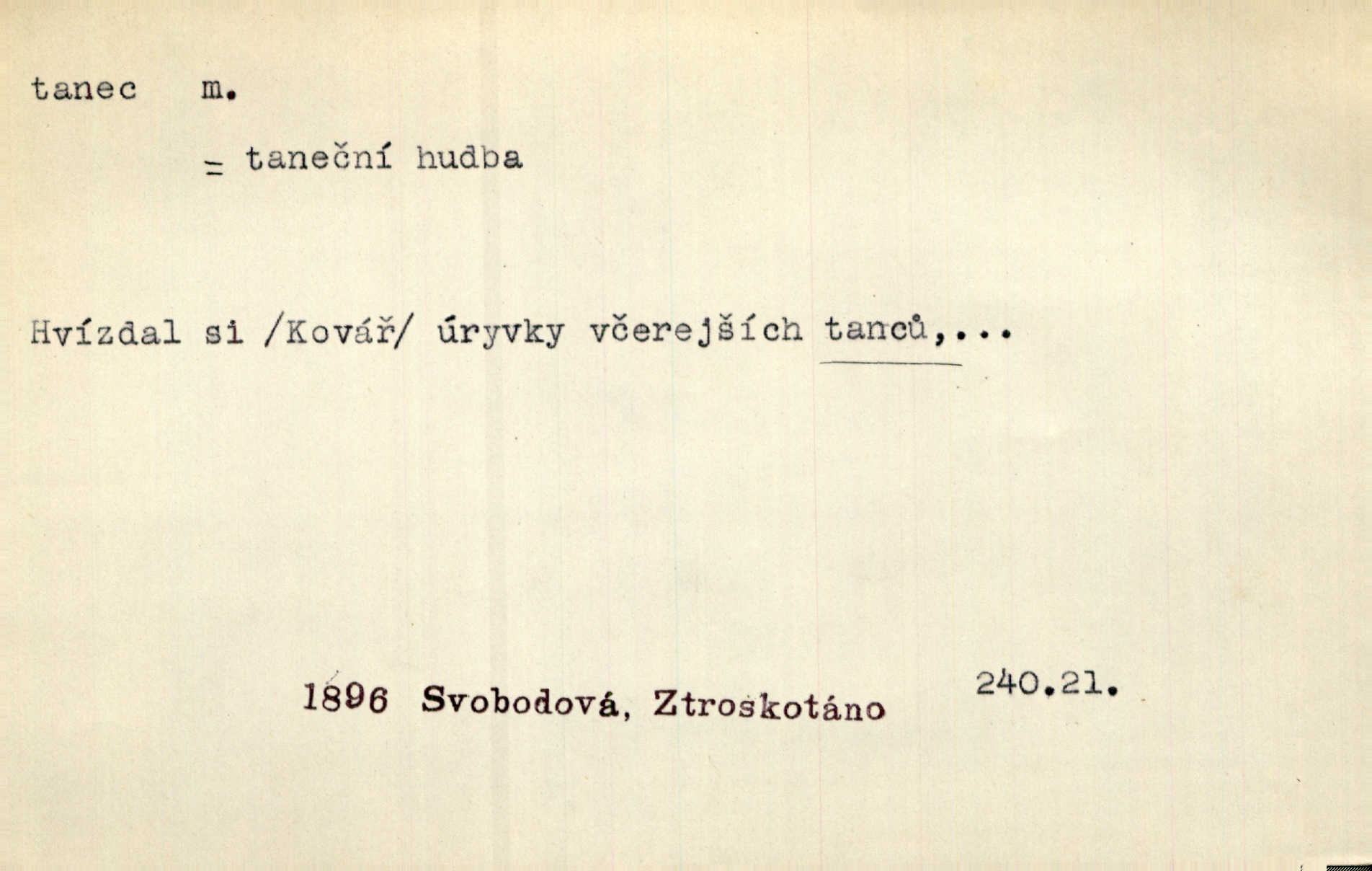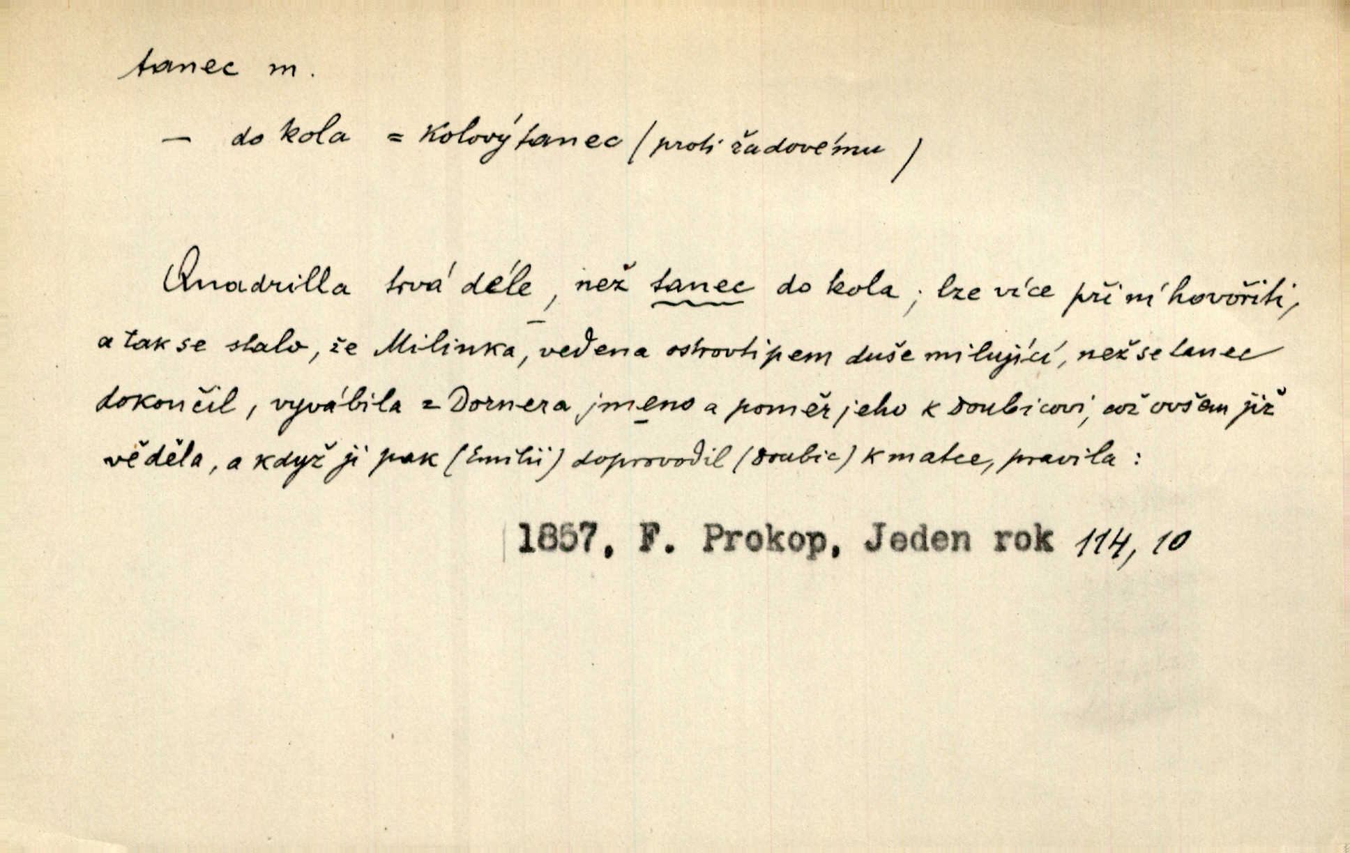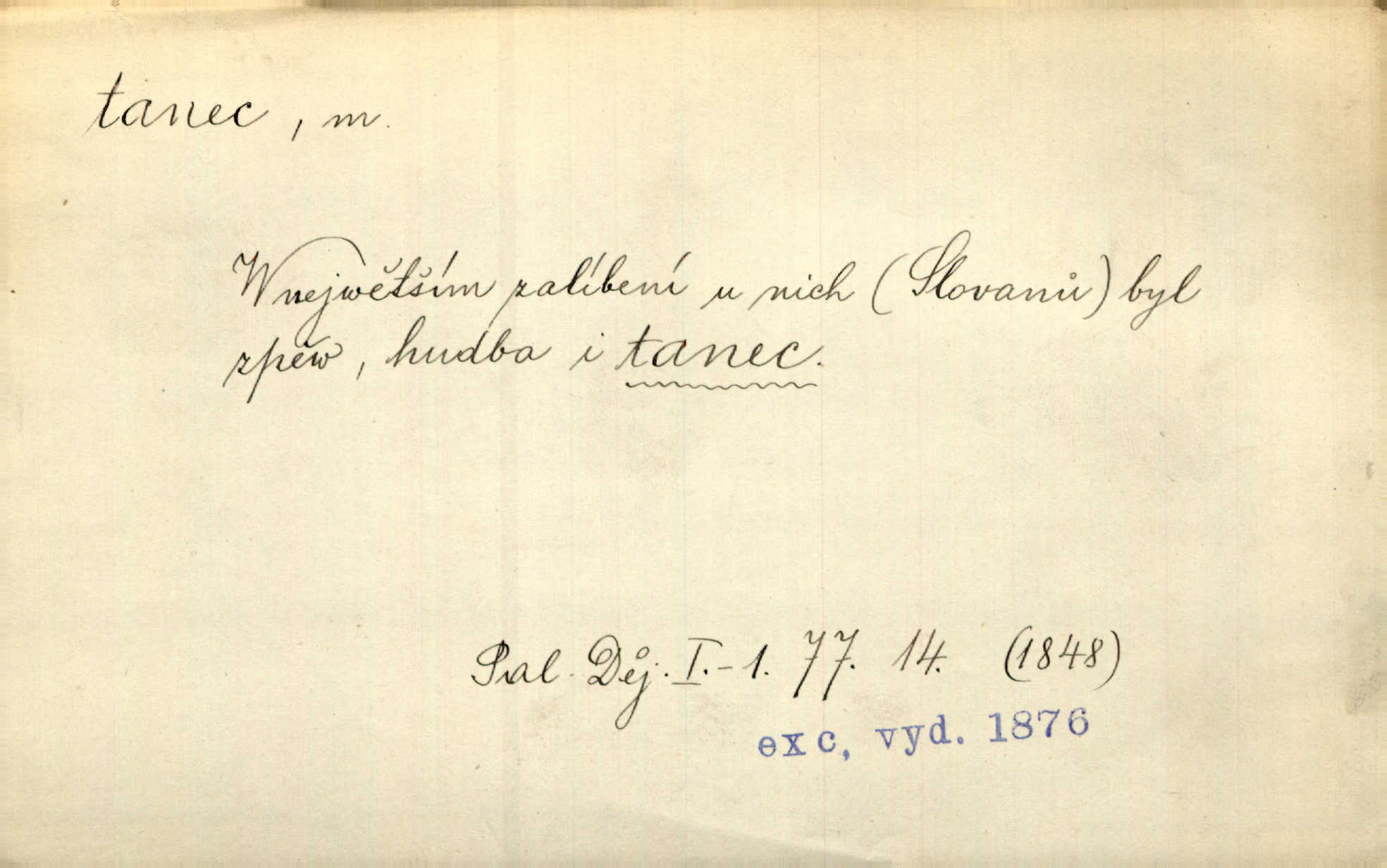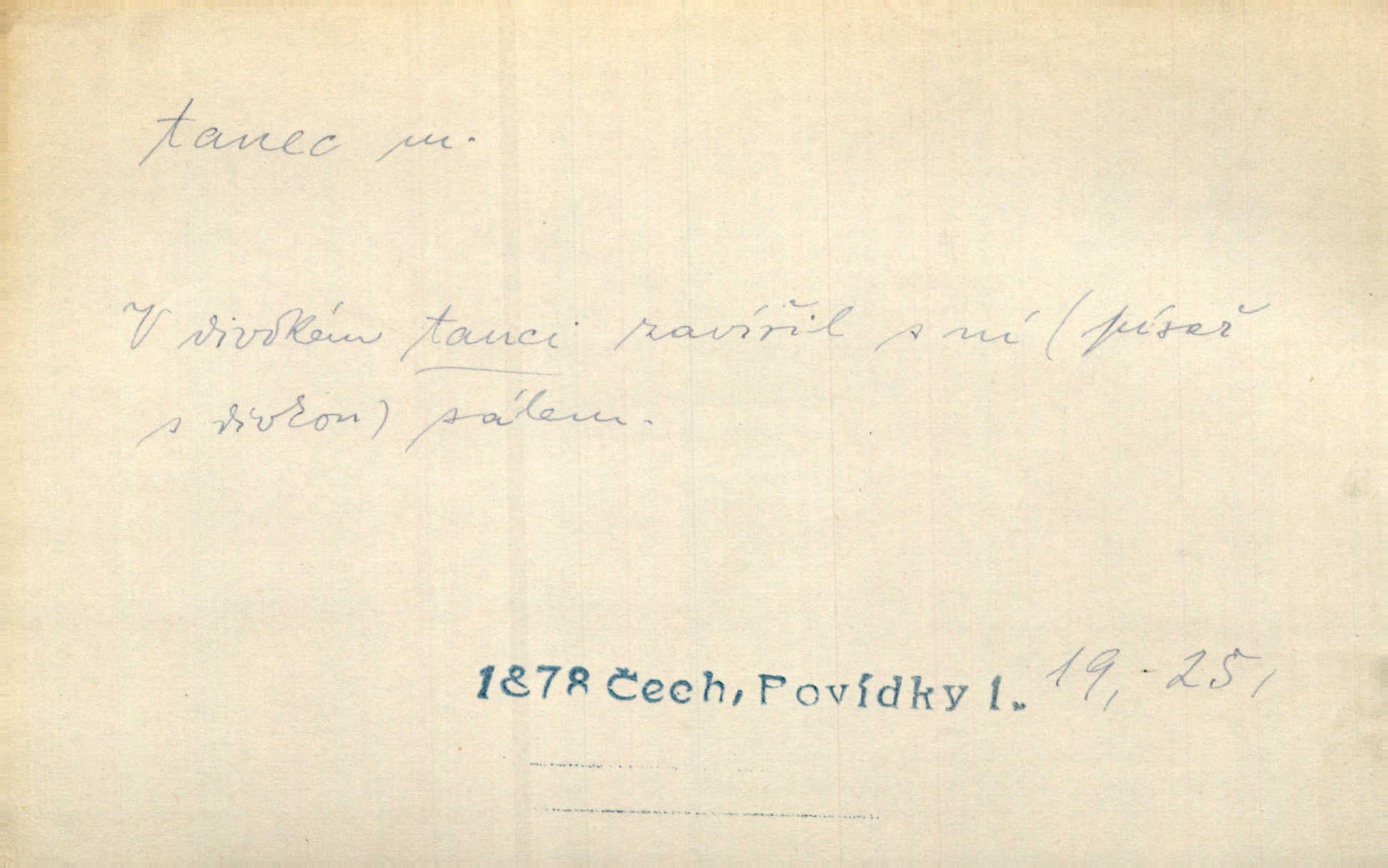 - tanec, -nce m. opakované rytmické pohyby, prováděné jednou n. více osobami, zpr. za doprovodu hudby n. zpěvu. V největším zalíbení byl zpěv, hudba i tanec. Pal. Seznámil jsem se při tanci s jistou Pražankou. Ner. V divokém tanci zavířil s ní sálem. Čech. Ji chtěl bráti k tanci, ale nešla. Prav. Za tanec bych byla duši dala. Šim. Chtěl životem jíti jako v tanci, lehce, pružně. Kar. Skotačily [mořské vlny] jedna přes druhou, hrály si v tanci. Ner. Nám se čtyrmi dětmi do tance nebude nebudeme mít snadné živobytí. Rais. Za schopna provésti tento státnický čin, provésti tanec mezi vejci, pokládán byl Plener nesnadný skutek. Čes. sl. Vyhodili si kopýtkem, vyšli si na led k tanci vydali se na nebezpečnou cestu. Svět. D jistý druh těchto rytmických pohybů, prováděných podle ustálených pravidel; hudební doprovod k těmto pohybům. Tu ještě viděti staré tance. Jir. Quadrilla trvá déle, než tanec do kola. Prok. Po přivítání dali nám zahrát národní tance. Něm. Koupím 3 páry střevíčků pro špičkový tanec. Čes. sl. „Italský tanec“ či „pantomima“ předváděla celá dramata. Ner. Hvízdal si úryvky včerejších tanců. R. Svob. První tvůj obraz světa byl tanec smrti. Čap. Tan. tanec kolový, řadový, společenský; lidový, bohoslužebný, obřadný, divošský, idealisovaný, sólový, umělecký a j. D taneční kousek. Po tři tance nemohl se k ní dostati. Herb. Lituji, ale tanec vám dáti nemohu. Bozd. Hud. skladba hraná k tanci. D Expr. poskakování, pobíhání, hbitý, rychlý pohyb, mihotání. Plotna syčí a to je tanec okolo ohně. Sula. Konečně prořidl a zastavil se tanec vloček. K. Čap. Nucen byl jsem popřáti očím odpočinku od tance liter na sítnici. Čap. Ch. Pozoroval tanec malého plamene. Týd. rozhl. Všechny [myšlenky] ve volném tanci otáčely se ve vlnivé linii kolem čekaného štěstí. R. Svob. D Expr. spěch, shon, zmatek, mela, rvačka. A to je pak tanec, když na to lidé přijdou! Herrm. My taky měli tanec jako vy, s ovsem. M. Jahn. Tedy nevím, jaký tanec z toho vypadne co z toho pojde. Praž. pos. „Což? Zase štěkal starej?“ „A jak! Ten zas dělal tanec“ láteřil, vyváděl! Her. Já jsem kyrysar od druhé škadrony. Nemyslíš, že nám zítra nastane tanec krutá seč, boj? Baar. D tanec sv. Víta ob. posunčina. Natřásal se nejinak, než jako by se o něho pokoušel tanec svatého Víta. Vrba. Poskakoval, jako když jej chytne Vítův tanec. Sova. D kočičí tanec lid. pokrm z hrachu n. čočky a krup. Ví on třeba, co je to, ‚hoď bidlo přes bidlo‘ nebo ‚kočičí tanec‘? Taková pochoutka! John.