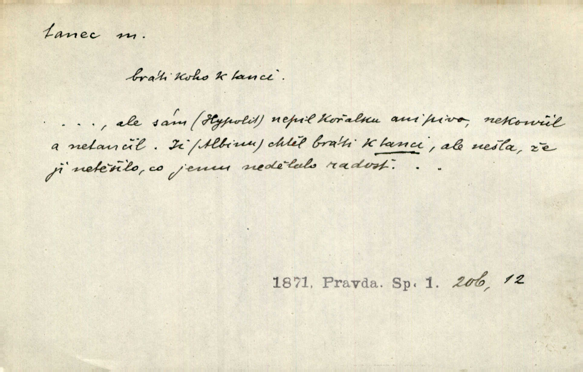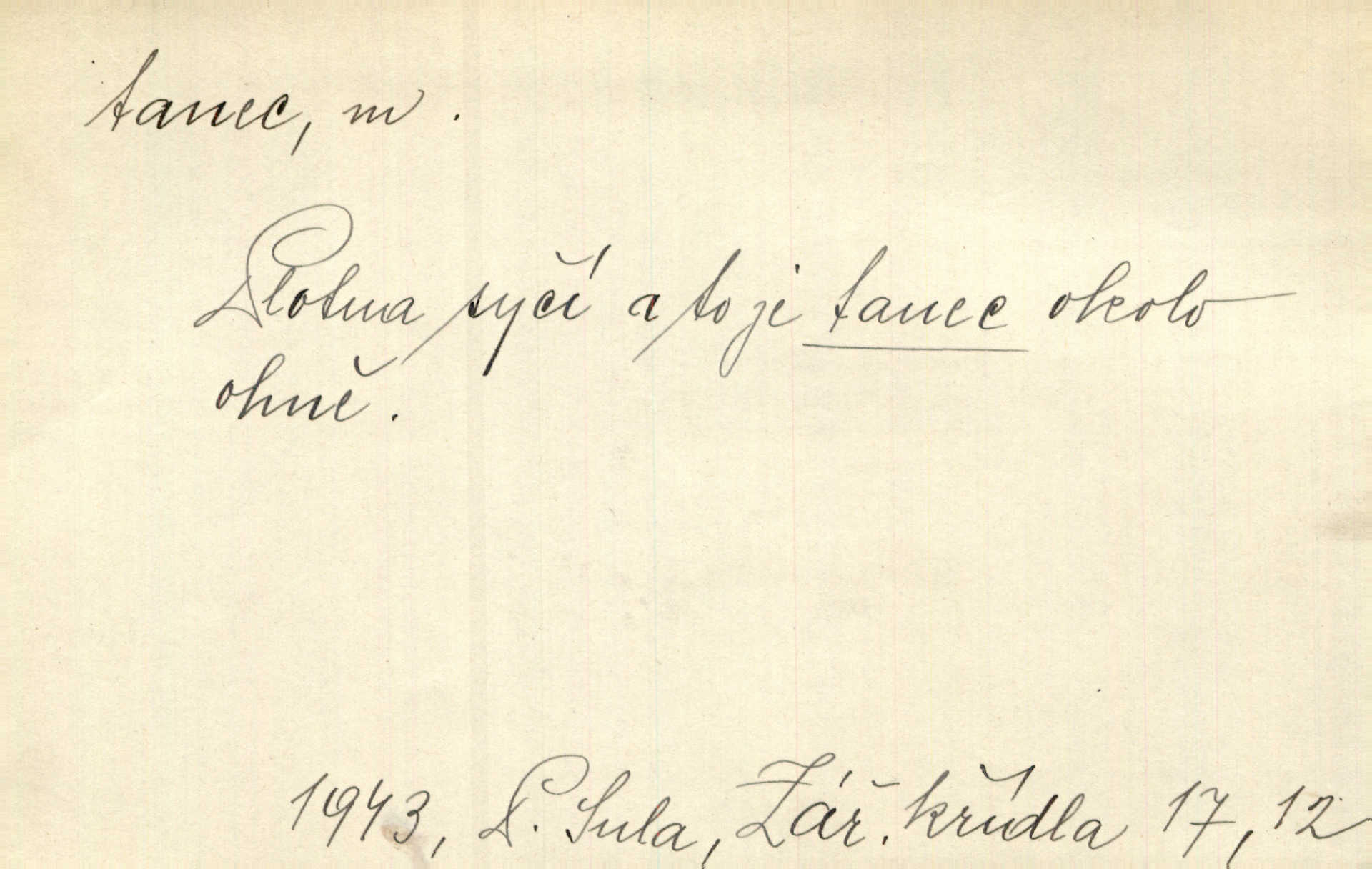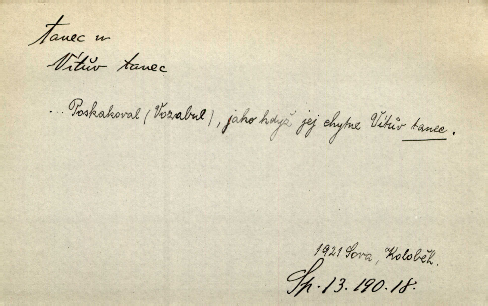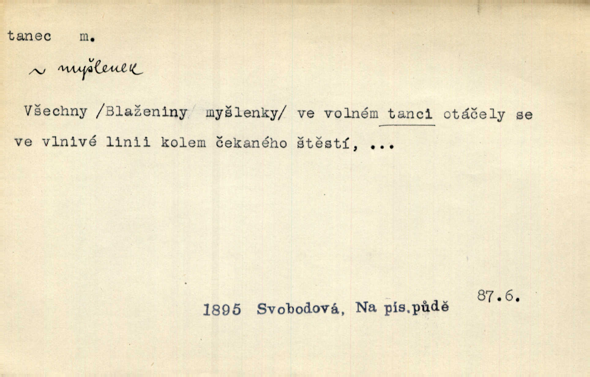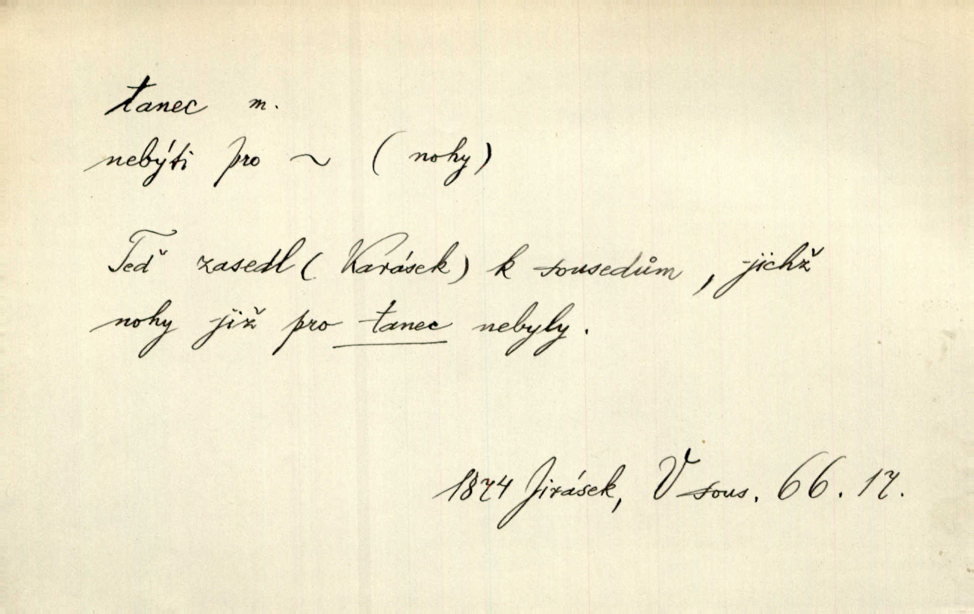 - tanec, -nce m. opakované rytmické pohyby, prováděné jednou n. více osobami, zpr. za doprovodu hudby n. zpěvu. V největším zalíbení byl zpěv, hudba i tanec. Pal. Seznámil jsem se při tanci s jistou Pražankou. Ner. V divokém tanci zavířil s ní sálem. Čech. Ji chtěl bráti k tanci, ale nešla. Prav. Za tanec bych byla duši dala. Šim. Chtěl životem jíti jako v tanci, lehce, pružně. Kar. Skotačily [mořské vlny] jedna přes druhou, hrály si v tanci. Ner. Nám se čtyrmi dětmi do tance nebude nebudeme mít snadné živobytí. Rais. Za schopna provésti tento státnický čin, provésti tanec mezi vejci, pokládán byl Plener nesnadný skutek. Čes. sl. Vyhodili si kopýtkem, vyšli si na led k tanci vydali se na nebezpečnou cestu. Svět. D jistý druh těchto rytmických pohybů, prováděných podle ustálených pravidel; hudební doprovod k těmto pohybům. Tu ještě viděti staré tance. Jir. Quadrilla trvá déle, než tanec do kola. Prok. Po přivítání dali nám zahrát národní tance. Něm. Koupím 3 páry střevíčků pro špičkový tanec. Čes. sl. „Italský tanec“ či „pantomima“ předváděla celá dramata. Ner. Hvízdal si úryvky včerejších tanců. R. Svob. První tvůj obraz světa byl tanec smrti. Čap. Tan. tanec kolový, řadový, společenský; lidový, bohoslužebný, obřadný, divošský, idealisovaný, sólový, umělecký a j. D taneční kousek. Po tři tance nemohl se k ní dostati. Herb. Lituji, ale tanec vám dáti nemohu. Bozd. Hud. skladba hraná k tanci. D Expr. poskakování, pobíhání, hbitý, rychlý pohyb, mihotání. Plotna syčí a to je tanec okolo ohně. Sula. Konečně prořidl a zastavil se tanec vloček. K. Čap. Nucen byl jsem popřáti očím odpočinku od tance liter na sítnici. Čap. Ch. Pozoroval tanec malého plamene. Týd. rozhl. Všechny [myšlenky] ve volném tanci otáčely se ve vlnivé linii kolem čekaného štěstí. R. Svob. D Expr. spěch, shon, zmatek, mela, rvačka. A to je pak tanec, když na to lidé přijdou! Herrm. My taky měli tanec jako vy, s ovsem. M. Jahn. Tedy nevím, jaký tanec z toho vypadne co z toho pojde. Praž. pos. „Což? Zase štěkal starej?“ „A jak! Ten zas dělal tanec“ láteřil, vyváděl! Her. Já jsem kyrysar od druhé škadrony. Nemyslíš, že nám zítra nastane tanec krutá seč, boj? Baar. D tanec sv. Víta ob. posunčina. Natřásal se nejinak, než jako by se o něho pokoušel tanec svatého Víta. Vrba. Poskakoval, jako když jej chytne Vítův tanec. Sova. D kočičí tanec lid. pokrm z hrachu n. čočky a krup. Ví on třeba, co je to, ‚hoď bidlo přes bidlo‘ nebo ‚kočičí tanec‘? Taková pochoutka! John.