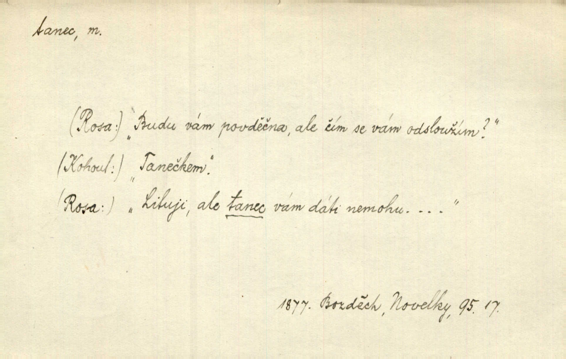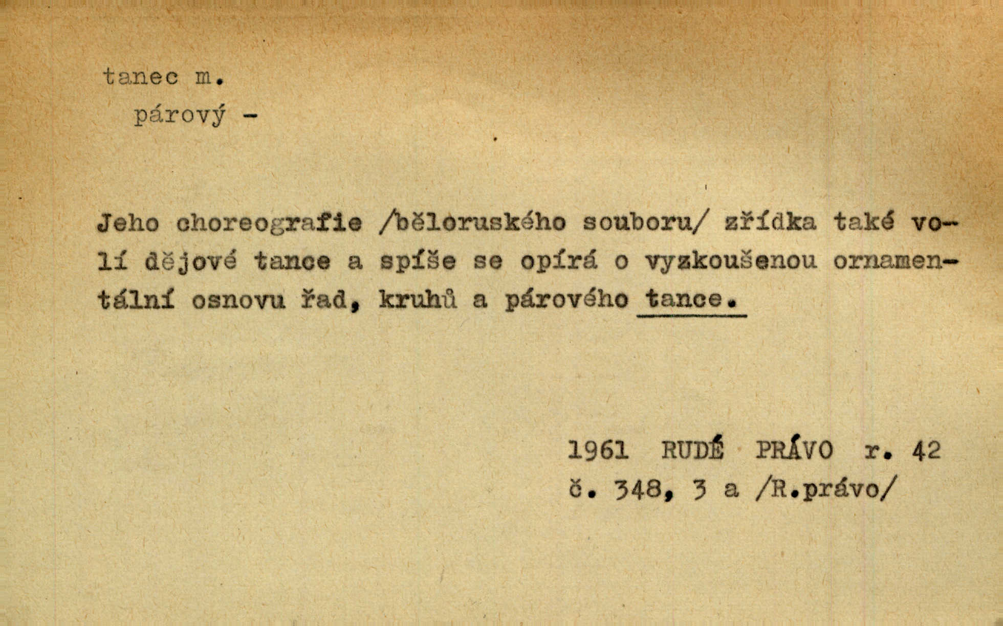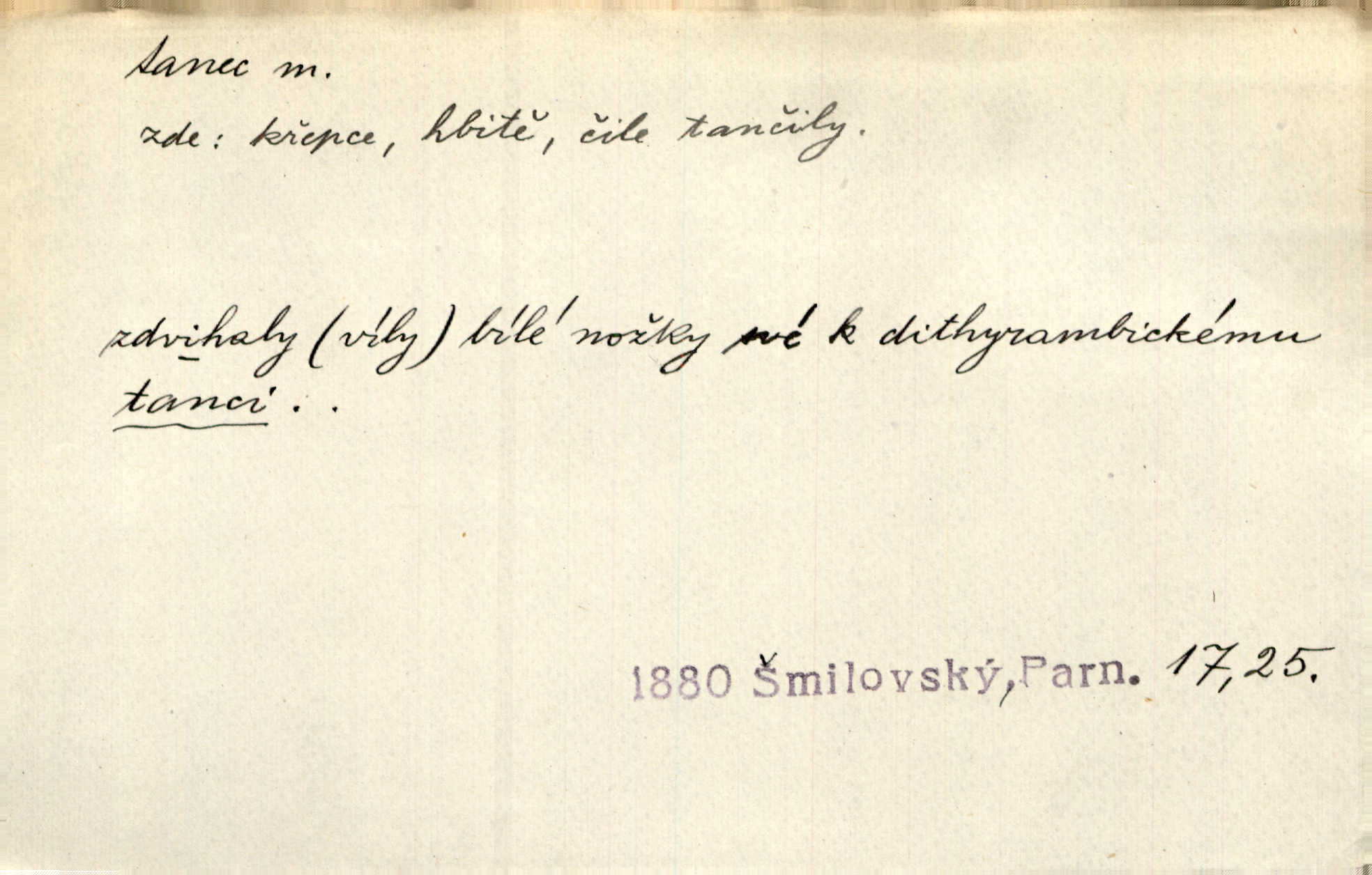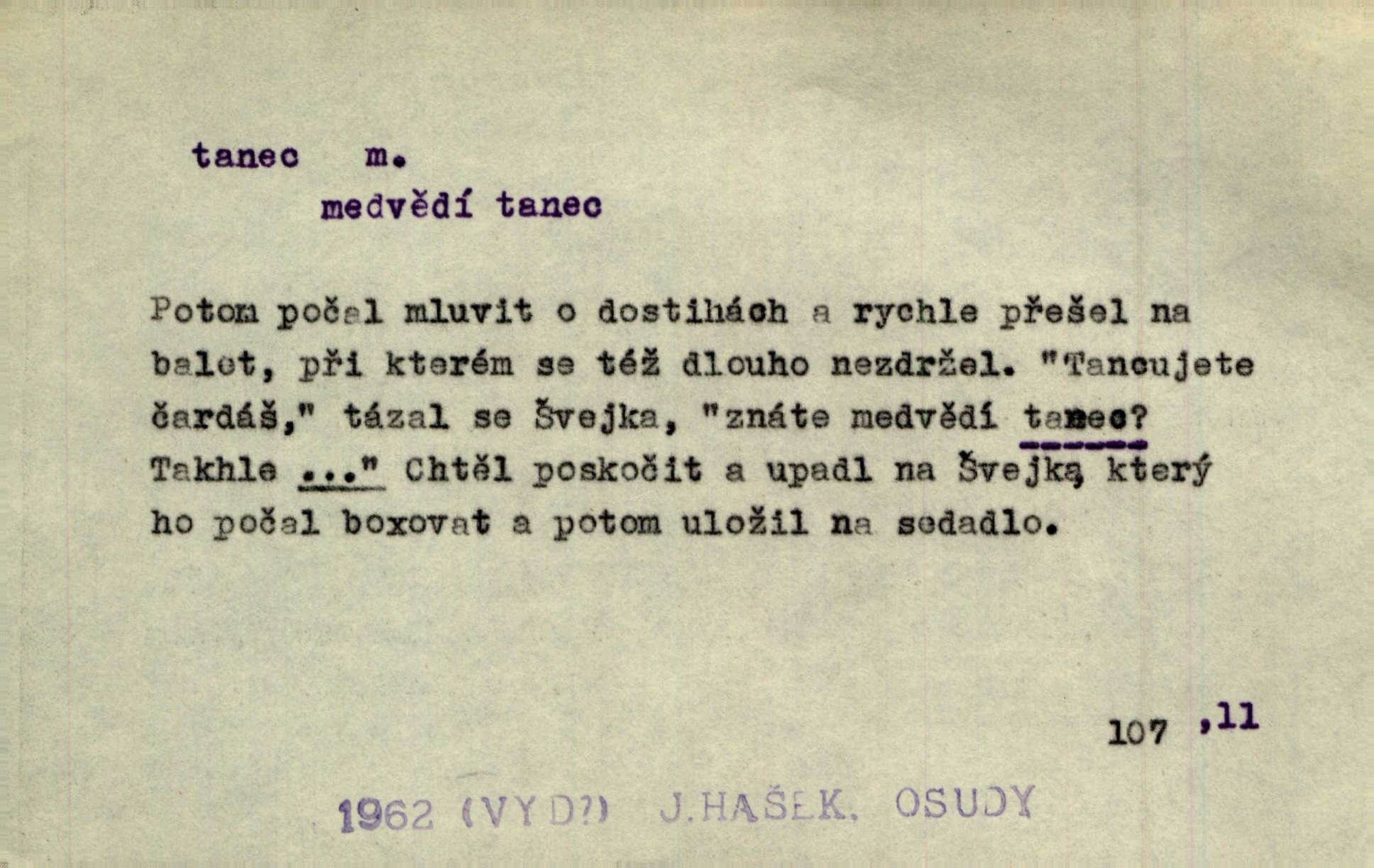 - tanec, -nce m. opakované rytmické pohyby, prováděné jednou n. více osobami, zpr. za doprovodu hudby n. zpěvu. V největším zalíbení byl zpěv, hudba i tanec. Pal. Seznámil jsem se při tanci s jistou Pražankou. Ner. V divokém tanci zavířil s ní sálem. Čech. Ji chtěl bráti k tanci, ale nešla. Prav. Za tanec bych byla duši dala. Šim. Chtěl životem jíti jako v tanci, lehce, pružně. Kar. Skotačily [mořské vlny] jedna přes druhou, hrály si v tanci. Ner. Nám se čtyrmi dětmi do tance nebude nebudeme mít snadné živobytí. Rais. Za schopna provésti tento státnický čin, provésti tanec mezi vejci, pokládán byl Plener nesnadný skutek. Čes. sl. Vyhodili si kopýtkem, vyšli si na led k tanci vydali se na nebezpečnou cestu. Svět. D jistý druh těchto rytmických pohybů, prováděných podle ustálených pravidel; hudební doprovod k těmto pohybům. Tu ještě viděti staré tance. Jir. Quadrilla trvá déle, než tanec do kola. Prok. Po přivítání dali nám zahrát národní tance. Něm. Koupím 3 páry střevíčků pro špičkový tanec. Čes. sl. „Italský tanec“ či „pantomima“ předváděla celá dramata. Ner. Hvízdal si úryvky včerejších tanců. R. Svob. První tvůj obraz světa byl tanec smrti. Čap. Tan. tanec kolový, řadový, společenský; lidový, bohoslužebný, obřadný, divošský, idealisovaný, sólový, umělecký a j. D taneční kousek. Po tři tance nemohl se k ní dostati. Herb. Lituji, ale tanec vám dáti nemohu. Bozd. Hud. skladba hraná k tanci. D Expr. poskakování, pobíhání, hbitý, rychlý pohyb, mihotání. Plotna syčí a to je tanec okolo ohně. Sula. Konečně prořidl a zastavil se tanec vloček. K. Čap. Nucen byl jsem popřáti očím odpočinku od tance liter na sítnici. Čap. Ch. Pozoroval tanec malého plamene. Týd. rozhl. Všechny [myšlenky] ve volném tanci otáčely se ve vlnivé linii kolem čekaného štěstí. R. Svob. D Expr. spěch, shon, zmatek, mela, rvačka. A to je pak tanec, když na to lidé přijdou! Herrm. My taky měli tanec jako vy, s ovsem. M. Jahn. Tedy nevím, jaký tanec z toho vypadne co z toho pojde. Praž. pos. „Což? Zase štěkal starej?“ „A jak! Ten zas dělal tanec“ láteřil, vyváděl! Her. Já jsem kyrysar od druhé škadrony. Nemyslíš, že nám zítra nastane tanec krutá seč, boj? Baar. D tanec sv. Víta ob. posunčina. Natřásal se nejinak, než jako by se o něho pokoušel tanec svatého Víta. Vrba. Poskakoval, jako když jej chytne Vítův tanec. Sova. D kočičí tanec lid. pokrm z hrachu n. čočky a krup. Ví on třeba, co je to, ‚hoď bidlo přes bidlo‘ nebo ‚kočičí tanec‘? Taková pochoutka! John.