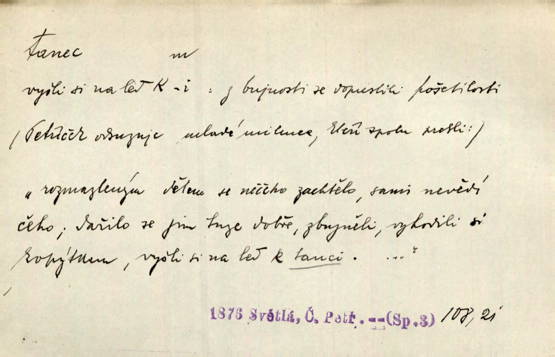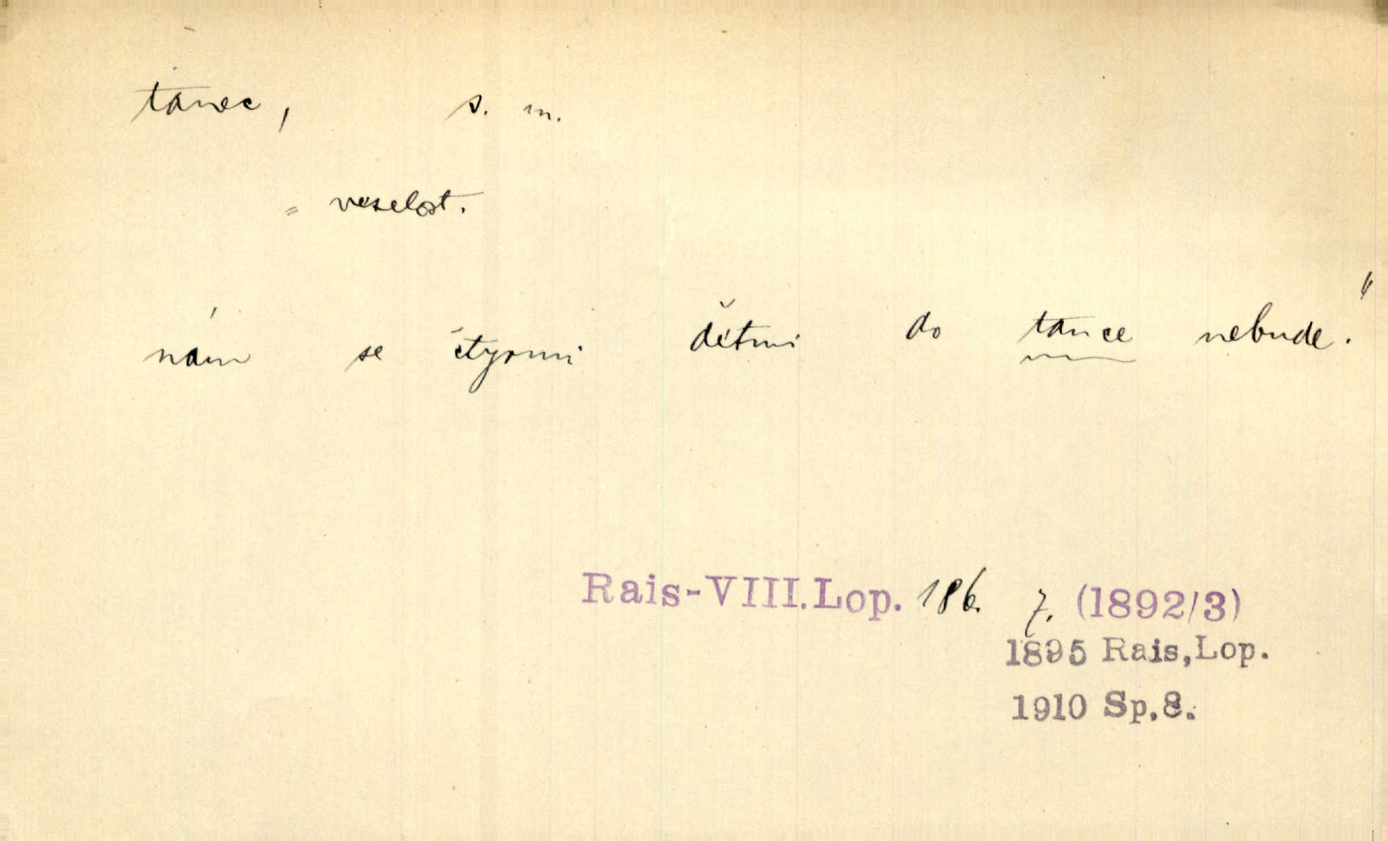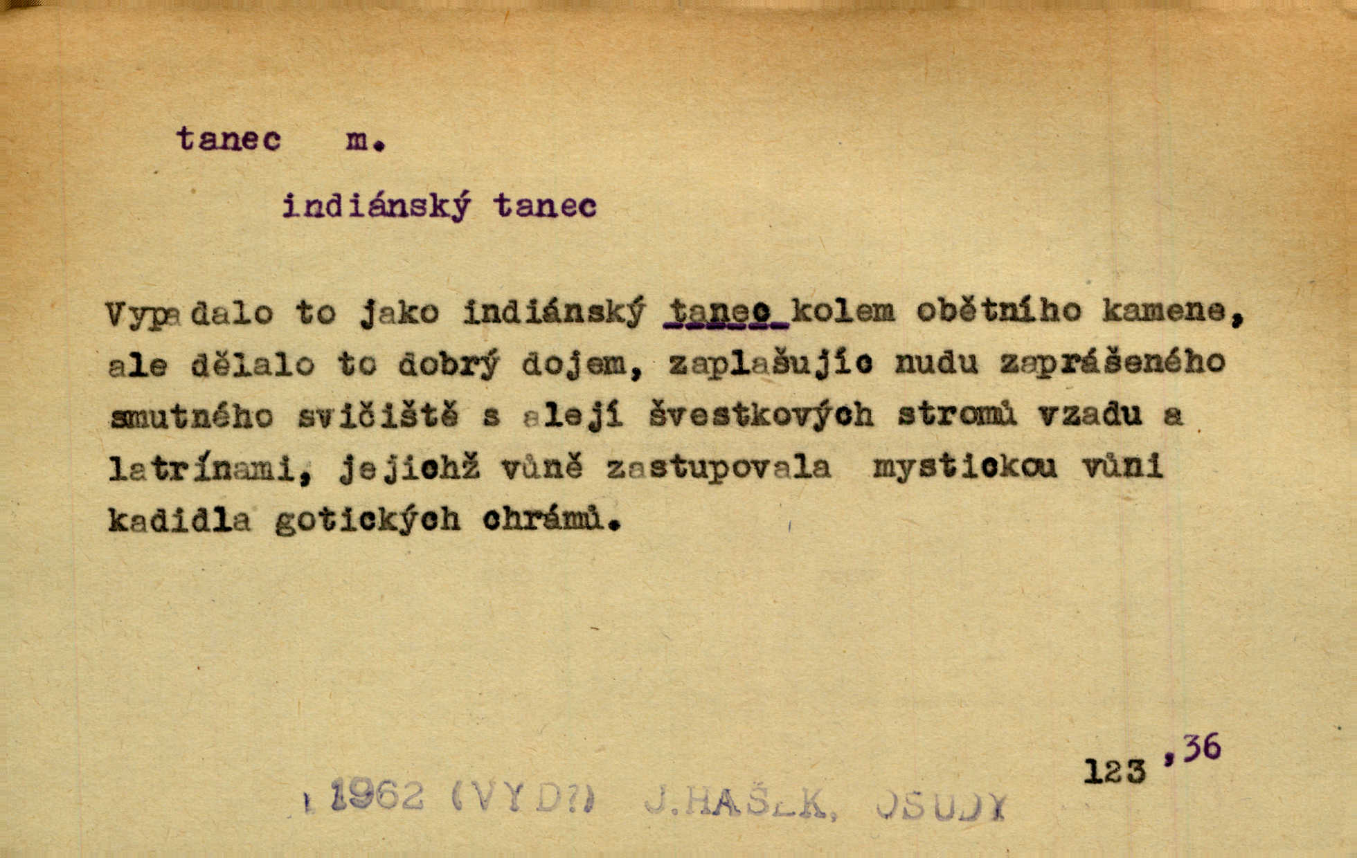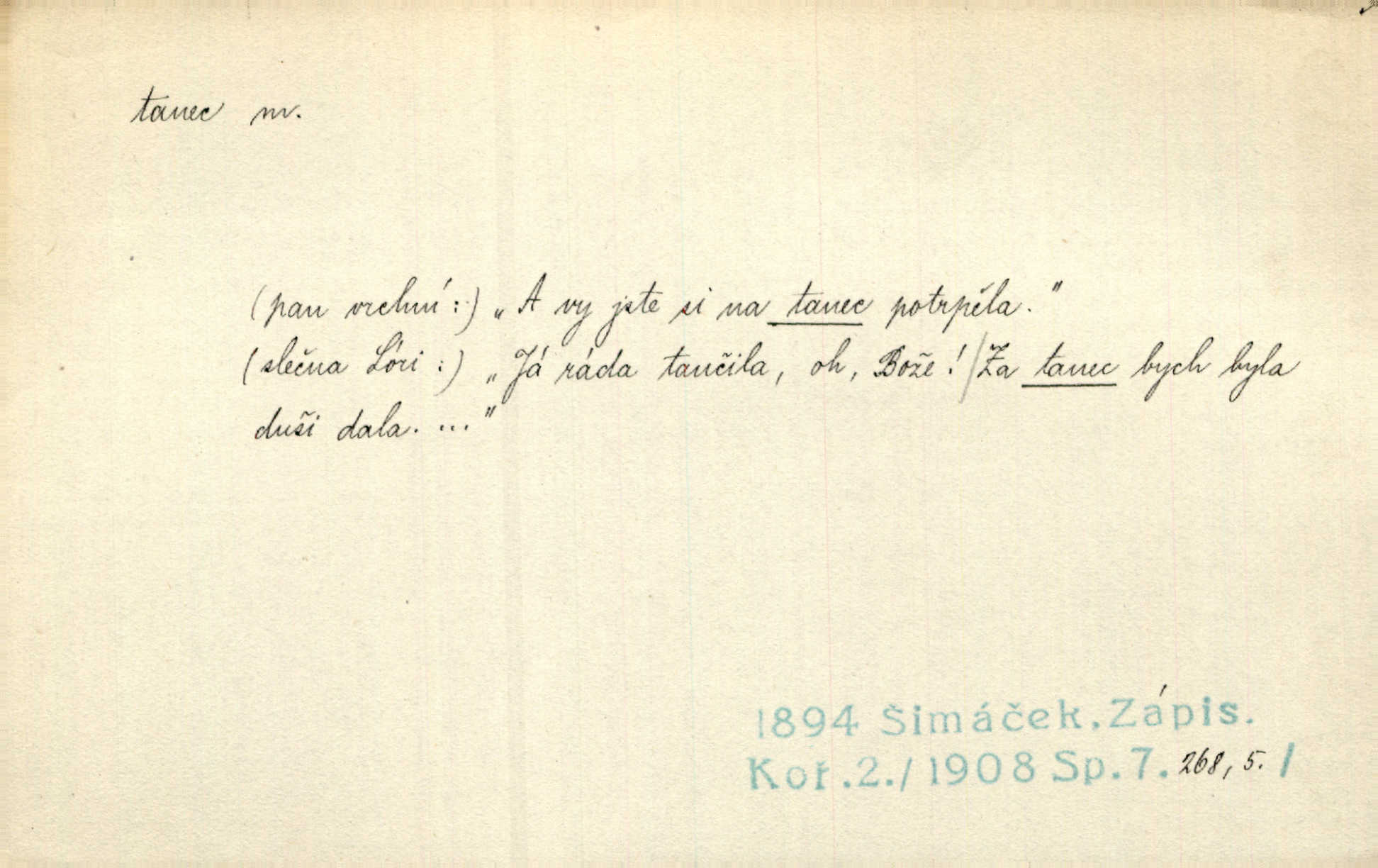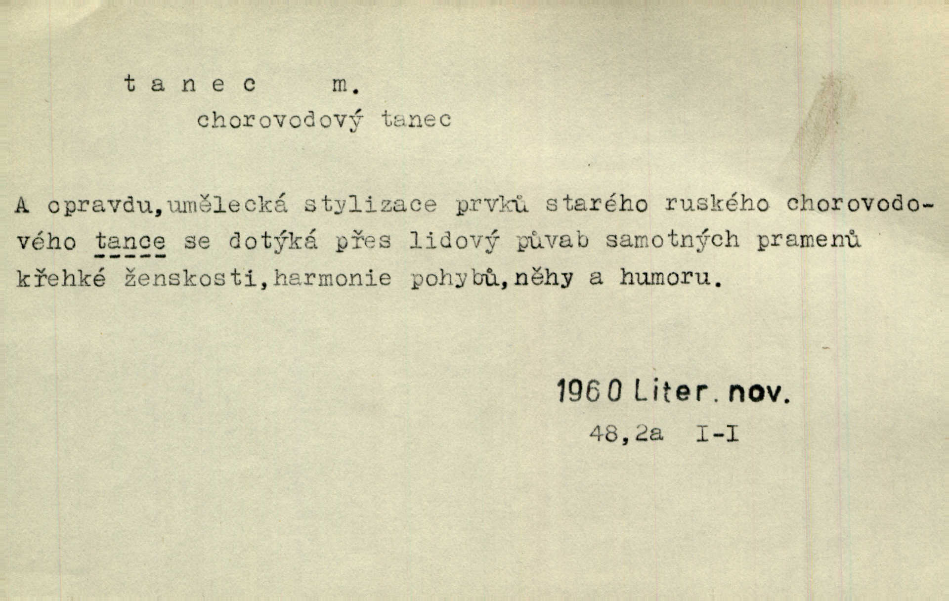 - tanec, -nce m. opakované rytmické pohyby, prováděné jednou n. více osobami, zpr. za doprovodu hudby n. zpěvu. V největším zalíbení byl zpěv, hudba i tanec. Pal. Seznámil jsem se při tanci s jistou Pražankou. Ner. V divokém tanci zavířil s ní sálem. Čech. Ji chtěl bráti k tanci, ale nešla. Prav. Za tanec bych byla duši dala. Šim. Chtěl životem jíti jako v tanci, lehce, pružně. Kar. Skotačily [mořské vlny] jedna přes druhou, hrály si v tanci. Ner. Nám se čtyrmi dětmi do tance nebude nebudeme mít snadné živobytí. Rais. Za schopna provésti tento státnický čin, provésti tanec mezi vejci, pokládán byl Plener nesnadný skutek. Čes. sl. Vyhodili si kopýtkem, vyšli si na led k tanci vydali se na nebezpečnou cestu. Svět. D jistý druh těchto rytmických pohybů, prováděných podle ustálených pravidel; hudební doprovod k těmto pohybům. Tu ještě viděti staré tance. Jir. Quadrilla trvá déle, než tanec do kola. Prok. Po přivítání dali nám zahrát národní tance. Něm. Koupím 3 páry střevíčků pro špičkový tanec. Čes. sl. „Italský tanec“ či „pantomima“ předváděla celá dramata. Ner. Hvízdal si úryvky včerejších tanců. R. Svob. První tvůj obraz světa byl tanec smrti. Čap. Tan. tanec kolový, řadový, společenský; lidový, bohoslužebný, obřadný, divošský, idealisovaný, sólový, umělecký a j. D taneční kousek. Po tři tance nemohl se k ní dostati. Herb. Lituji, ale tanec vám dáti nemohu. Bozd. Hud. skladba hraná k tanci. D Expr. poskakování, pobíhání, hbitý, rychlý pohyb, mihotání. Plotna syčí a to je tanec okolo ohně. Sula. Konečně prořidl a zastavil se tanec vloček. K. Čap. Nucen byl jsem popřáti očím odpočinku od tance liter na sítnici. Čap. Ch. Pozoroval tanec malého plamene. Týd. rozhl. Všechny [myšlenky] ve volném tanci otáčely se ve vlnivé linii kolem čekaného štěstí. R. Svob. D Expr. spěch, shon, zmatek, mela, rvačka. A to je pak tanec, když na to lidé přijdou! Herrm. My taky měli tanec jako vy, s ovsem. M. Jahn. Tedy nevím, jaký tanec z toho vypadne co z toho pojde. Praž. pos. „Což? Zase štěkal starej?“ „A jak! Ten zas dělal tanec“ láteřil, vyváděl! Her. Já jsem kyrysar od druhé škadrony. Nemyslíš, že nám zítra nastane tanec krutá seč, boj? Baar. D tanec sv. Víta ob. posunčina. Natřásal se nejinak, než jako by se o něho pokoušel tanec svatého Víta. Vrba. Poskakoval, jako když jej chytne Vítův tanec. Sova. D kočičí tanec lid. pokrm z hrachu n. čočky a krup. Ví on třeba, co je to, ‚hoď bidlo přes bidlo‘ nebo ‚kočičí tanec‘? Taková pochoutka! John.