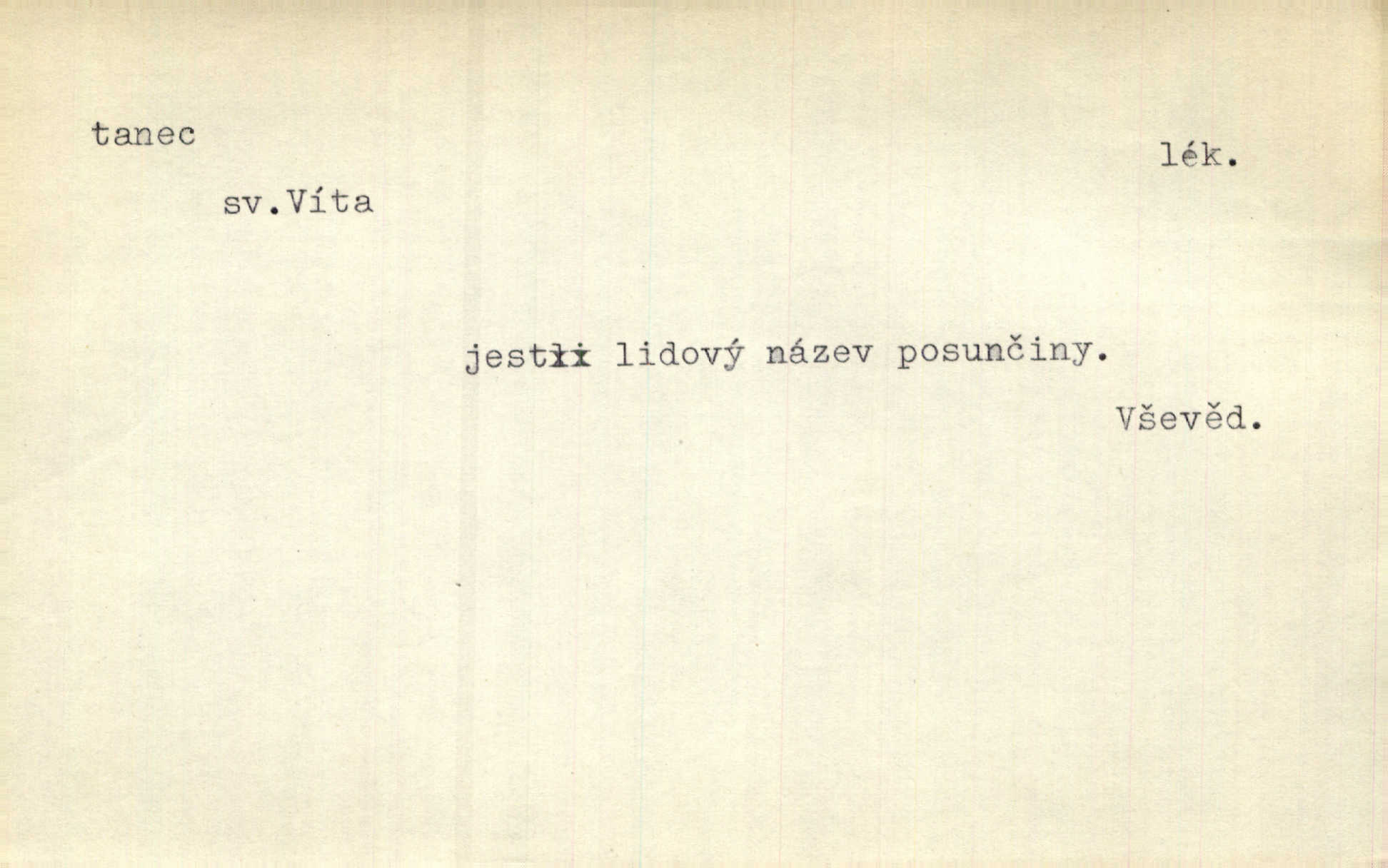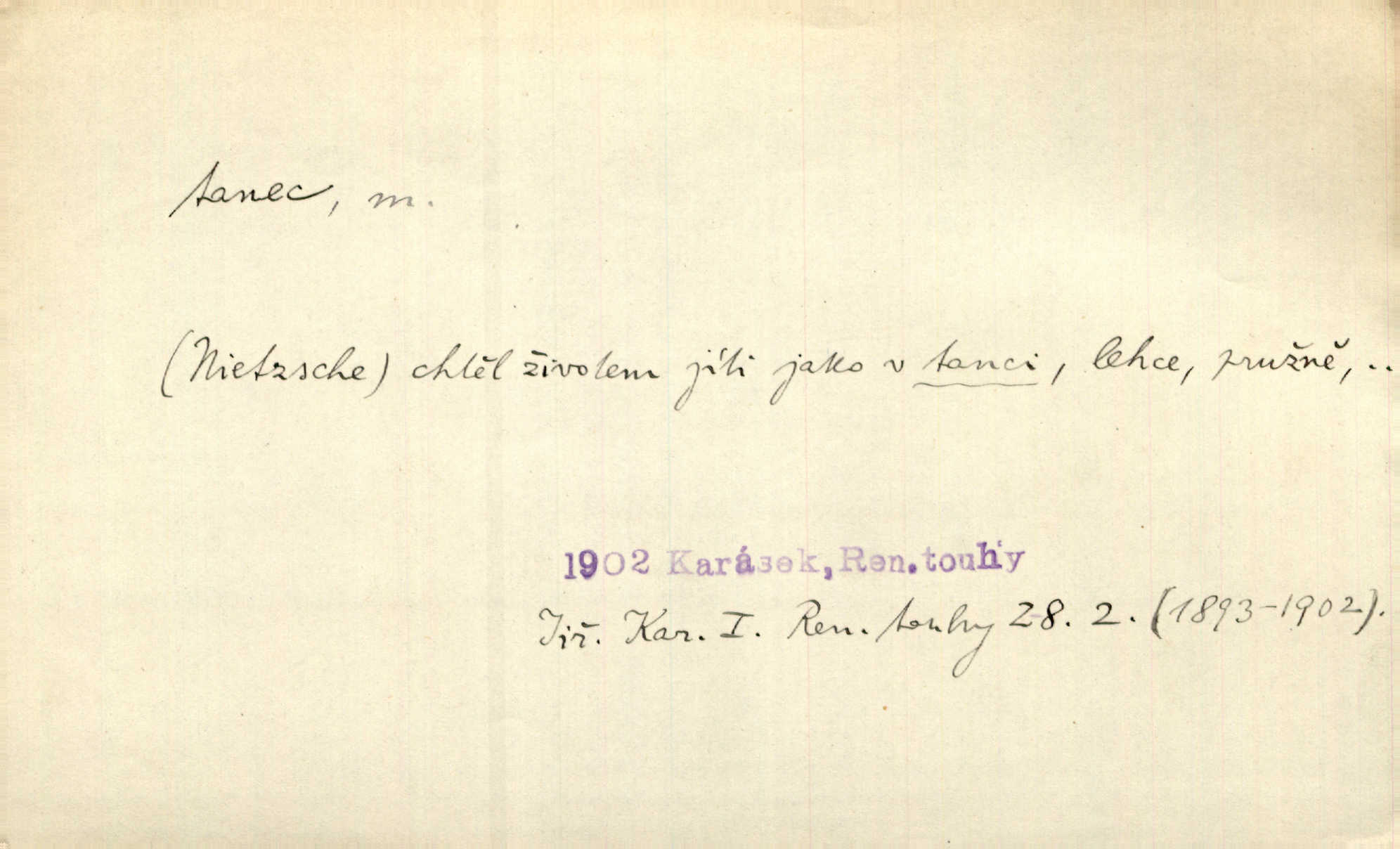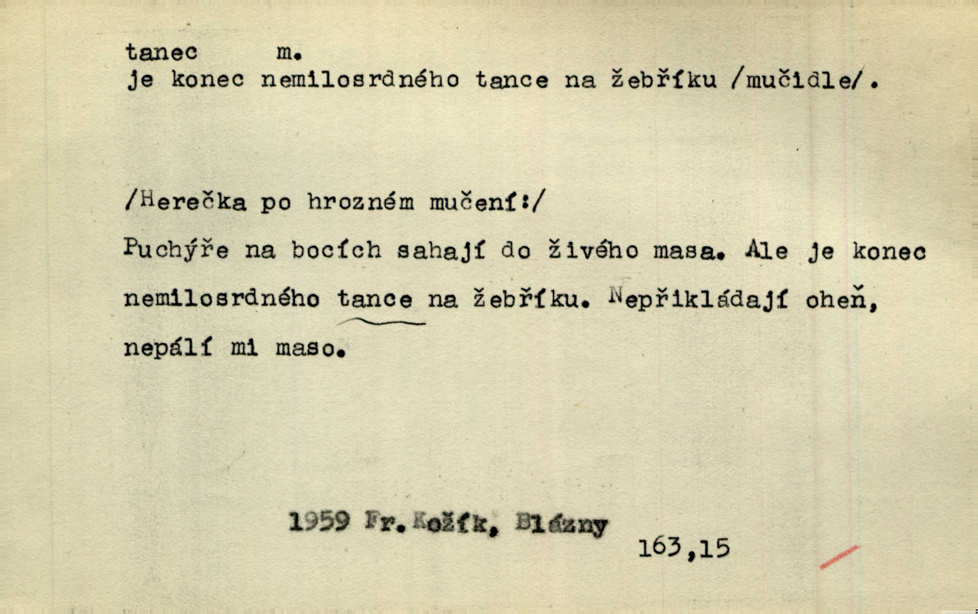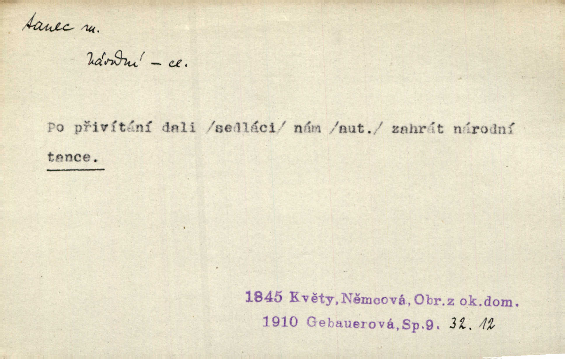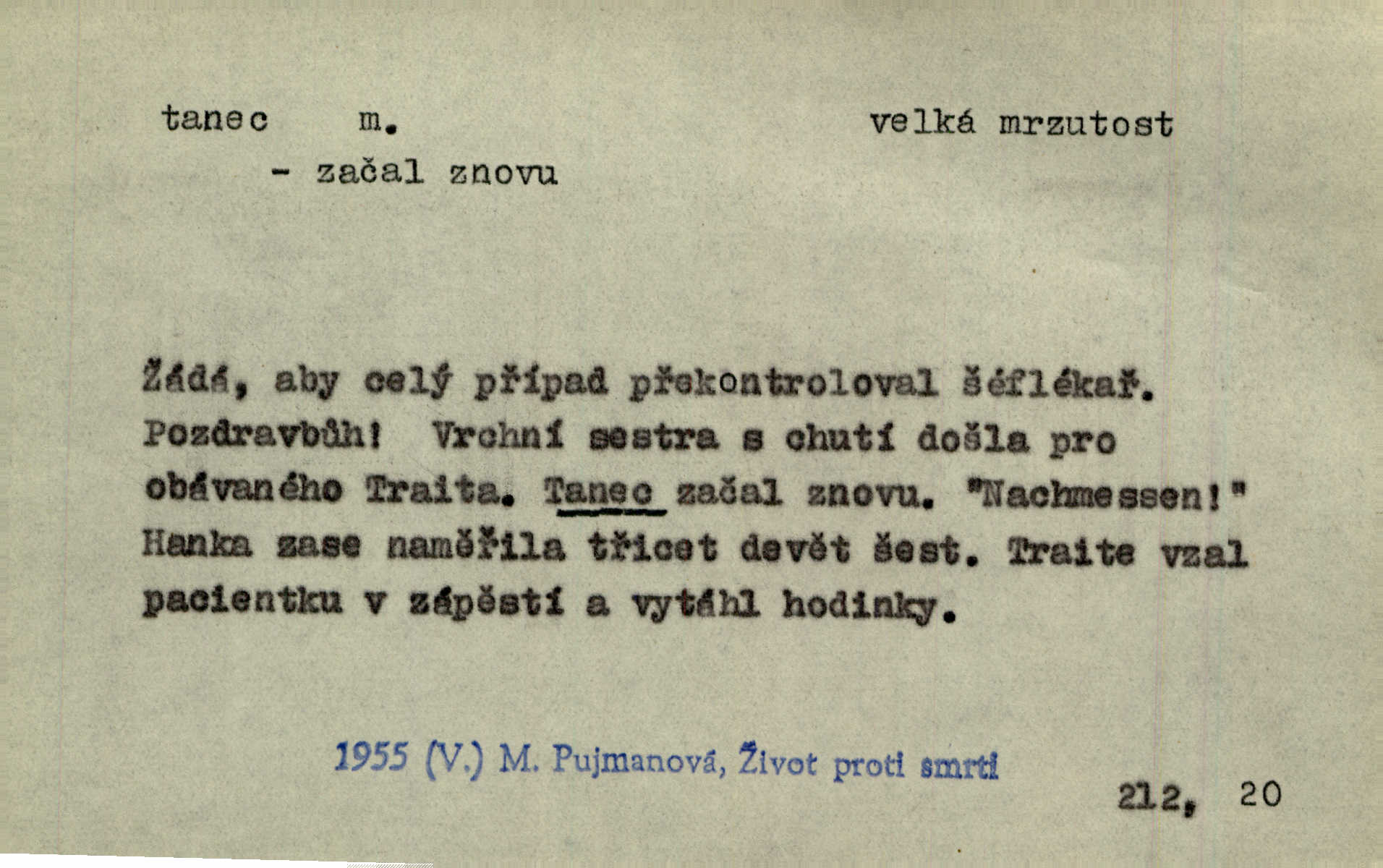 - tanec, -nce m. opakované rytmické pohyby, prováděné jednou n. více osobami, zpr. za doprovodu hudby n. zpěvu. V největším zalíbení byl zpěv, hudba i tanec. Pal. Seznámil jsem se při tanci s jistou Pražankou. Ner. V divokém tanci zavířil s ní sálem. Čech. Ji chtěl bráti k tanci, ale nešla. Prav. Za tanec bych byla duši dala. Šim. Chtěl životem jíti jako v tanci, lehce, pružně. Kar. Skotačily [mořské vlny] jedna přes druhou, hrály si v tanci. Ner. Nám se čtyrmi dětmi do tance nebude nebudeme mít snadné živobytí. Rais. Za schopna provésti tento státnický čin, provésti tanec mezi vejci, pokládán byl Plener nesnadný skutek. Čes. sl. Vyhodili si kopýtkem, vyšli si na led k tanci vydali se na nebezpečnou cestu. Svět. D jistý druh těchto rytmických pohybů, prováděných podle ustálených pravidel; hudební doprovod k těmto pohybům. Tu ještě viděti staré tance. Jir. Quadrilla trvá déle, než tanec do kola. Prok. Po přivítání dali nám zahrát národní tance. Něm. Koupím 3 páry střevíčků pro špičkový tanec. Čes. sl. „Italský tanec“ či „pantomima“ předváděla celá dramata. Ner. Hvízdal si úryvky včerejších tanců. R. Svob. První tvůj obraz světa byl tanec smrti. Čap. Tan. tanec kolový, řadový, společenský; lidový, bohoslužebný, obřadný, divošský, idealisovaný, sólový, umělecký a j. D taneční kousek. Po tři tance nemohl se k ní dostati. Herb. Lituji, ale tanec vám dáti nemohu. Bozd. Hud. skladba hraná k tanci. D Expr. poskakování, pobíhání, hbitý, rychlý pohyb, mihotání. Plotna syčí a to je tanec okolo ohně. Sula. Konečně prořidl a zastavil se tanec vloček. K. Čap. Nucen byl jsem popřáti očím odpočinku od tance liter na sítnici. Čap. Ch. Pozoroval tanec malého plamene. Týd. rozhl. Všechny [myšlenky] ve volném tanci otáčely se ve vlnivé linii kolem čekaného štěstí. R. Svob. D Expr. spěch, shon, zmatek, mela, rvačka. A to je pak tanec, když na to lidé přijdou! Herrm. My taky měli tanec jako vy, s ovsem. M. Jahn. Tedy nevím, jaký tanec z toho vypadne co z toho pojde. Praž. pos. „Což? Zase štěkal starej?“ „A jak! Ten zas dělal tanec“ láteřil, vyváděl! Her. Já jsem kyrysar od druhé škadrony. Nemyslíš, že nám zítra nastane tanec krutá seč, boj? Baar. D tanec sv. Víta ob. posunčina. Natřásal se nejinak, než jako by se o něho pokoušel tanec svatého Víta. Vrba. Poskakoval, jako když jej chytne Vítův tanec. Sova. D kočičí tanec lid. pokrm z hrachu n. čočky a krup. Ví on třeba, co je to, ‚hoď bidlo přes bidlo‘ nebo ‚kočičí tanec‘? Taková pochoutka! John.
