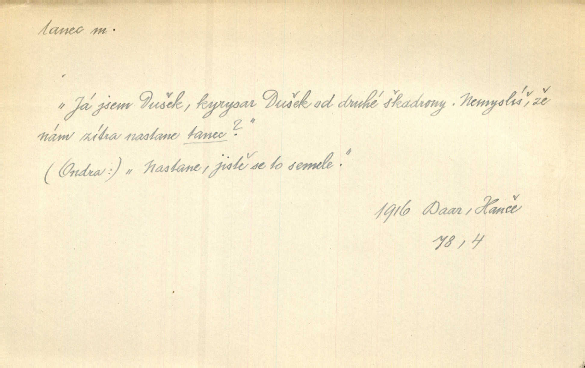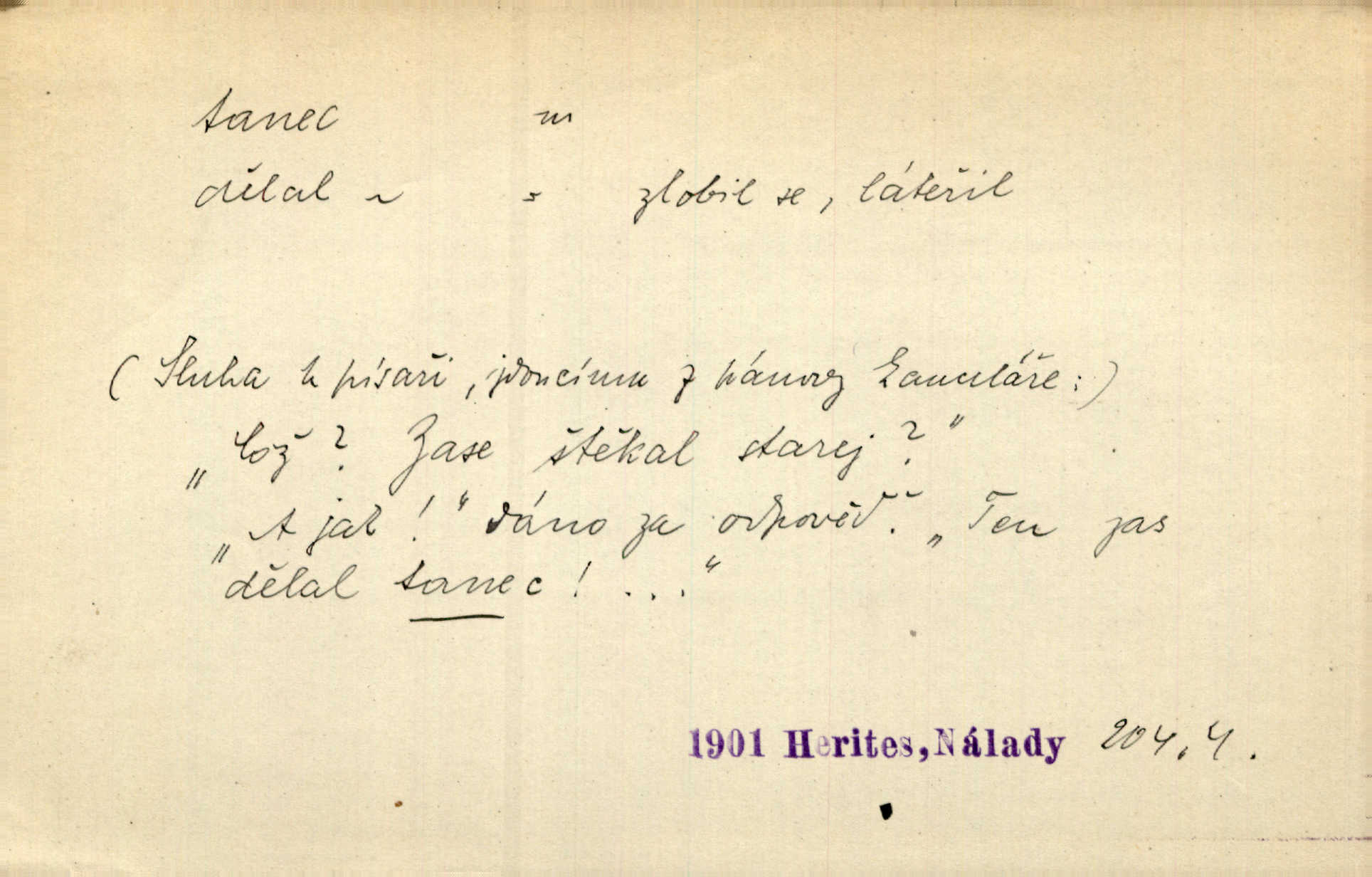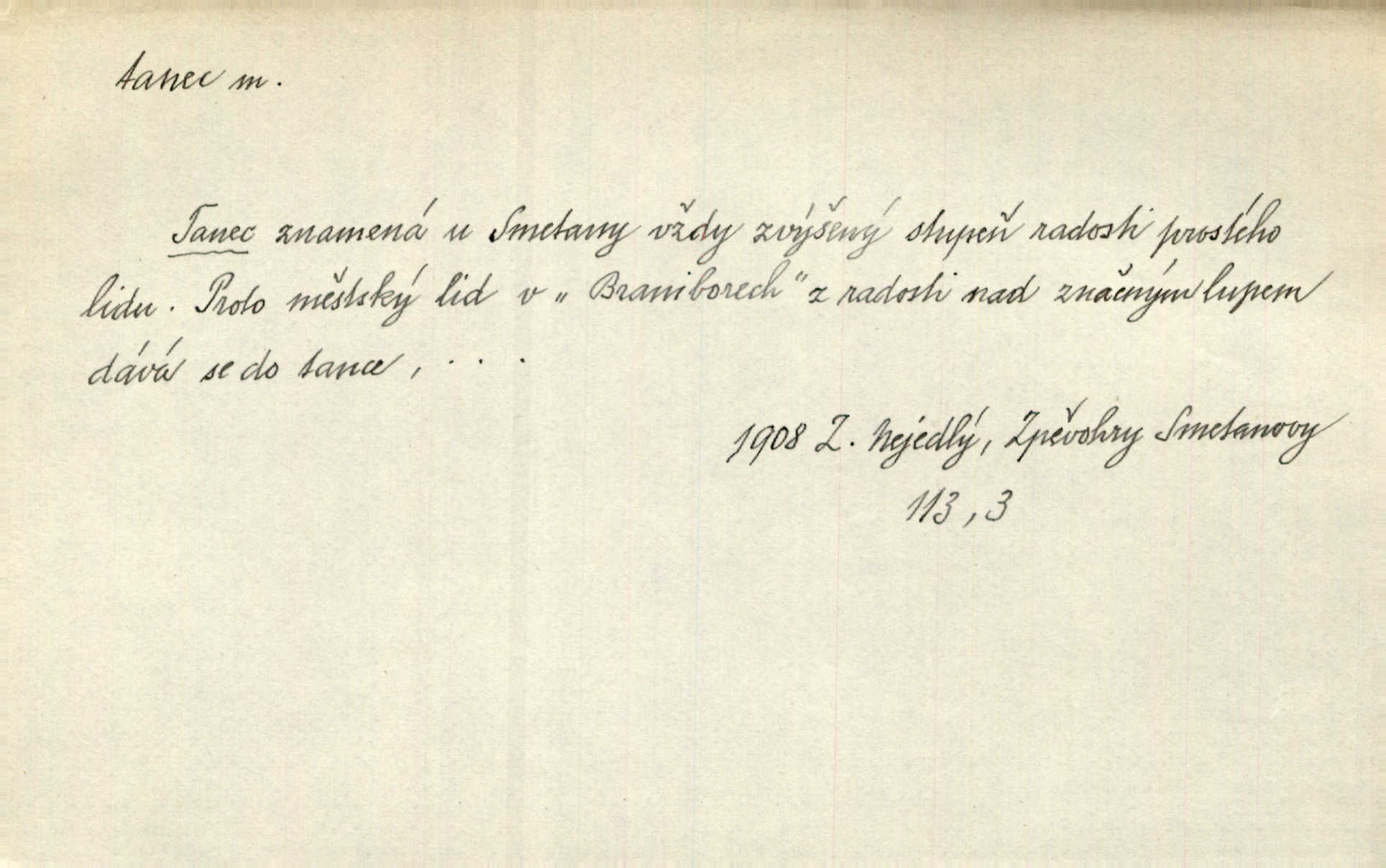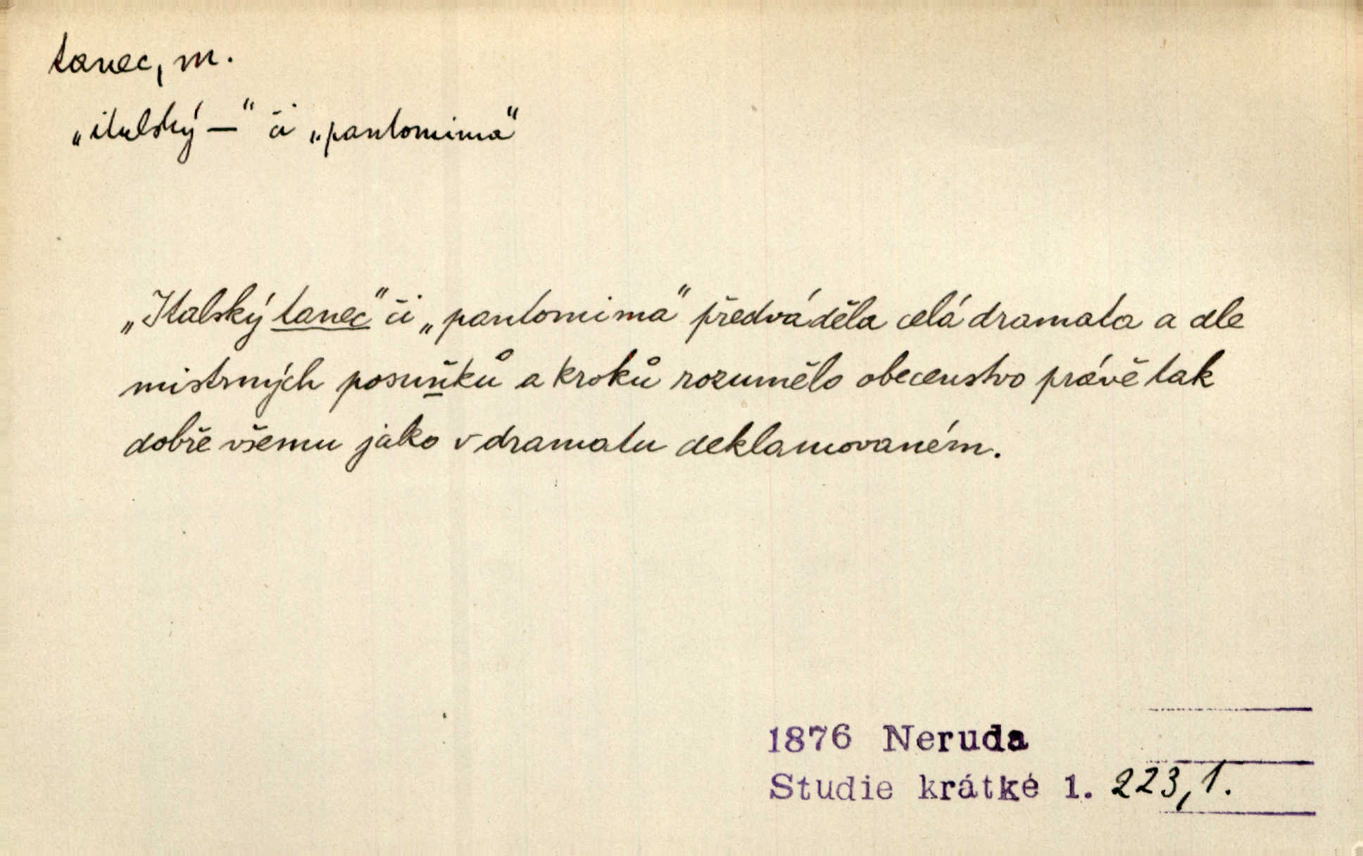 - tanec, -nce m. opakované rytmické pohyby, prováděné jednou n. více osobami, zpr. za doprovodu hudby n. zpěvu. V největším zalíbení byl zpěv, hudba i tanec. Pal. Seznámil jsem se při tanci s jistou Pražankou. Ner. V divokém tanci zavířil s ní sálem. Čech. Ji chtěl bráti k tanci, ale nešla. Prav. Za tanec bych byla duši dala. Šim. Chtěl životem jíti jako v tanci, lehce, pružně. Kar. Skotačily [mořské vlny] jedna přes druhou, hrály si v tanci. Ner. Nám se čtyrmi dětmi do tance nebude nebudeme mít snadné živobytí. Rais. Za schopna provésti tento státnický čin, provésti tanec mezi vejci, pokládán byl Plener nesnadný skutek. Čes. sl. Vyhodili si kopýtkem, vyšli si na led k tanci vydali se na nebezpečnou cestu. Svět. D jistý druh těchto rytmických pohybů, prováděných podle ustálených pravidel; hudební doprovod k těmto pohybům. Tu ještě viděti staré tance. Jir. Quadrilla trvá déle, než tanec do kola. Prok. Po přivítání dali nám zahrát národní tance. Něm. Koupím 3 páry střevíčků pro špičkový tanec. Čes. sl. „Italský tanec“ či „pantomima“ předváděla celá dramata. Ner. Hvízdal si úryvky včerejších tanců. R. Svob. První tvůj obraz světa byl tanec smrti. Čap. Tan. tanec kolový, řadový, společenský; lidový, bohoslužebný, obřadný, divošský, idealisovaný, sólový, umělecký a j. D taneční kousek. Po tři tance nemohl se k ní dostati. Herb. Lituji, ale tanec vám dáti nemohu. Bozd. Hud. skladba hraná k tanci. D Expr. poskakování, pobíhání, hbitý, rychlý pohyb, mihotání. Plotna syčí a to je tanec okolo ohně. Sula. Konečně prořidl a zastavil se tanec vloček. K. Čap. Nucen byl jsem popřáti očím odpočinku od tance liter na sítnici. Čap. Ch. Pozoroval tanec malého plamene. Týd. rozhl. Všechny [myšlenky] ve volném tanci otáčely se ve vlnivé linii kolem čekaného štěstí. R. Svob. D Expr. spěch, shon, zmatek, mela, rvačka. A to je pak tanec, když na to lidé přijdou! Herrm. My taky měli tanec jako vy, s ovsem. M. Jahn. Tedy nevím, jaký tanec z toho vypadne co z toho pojde. Praž. pos. „Což? Zase štěkal starej?“ „A jak! Ten zas dělal tanec“ láteřil, vyváděl! Her. Já jsem kyrysar od druhé škadrony. Nemyslíš, že nám zítra nastane tanec krutá seč, boj? Baar. D tanec sv. Víta ob. posunčina. Natřásal se nejinak, než jako by se o něho pokoušel tanec svatého Víta. Vrba. Poskakoval, jako když jej chytne Vítův tanec. Sova. D kočičí tanec lid. pokrm z hrachu n. čočky a krup. Ví on třeba, co je to, ‚hoď bidlo přes bidlo‘ nebo ‚kočičí tanec‘? Taková pochoutka! John.