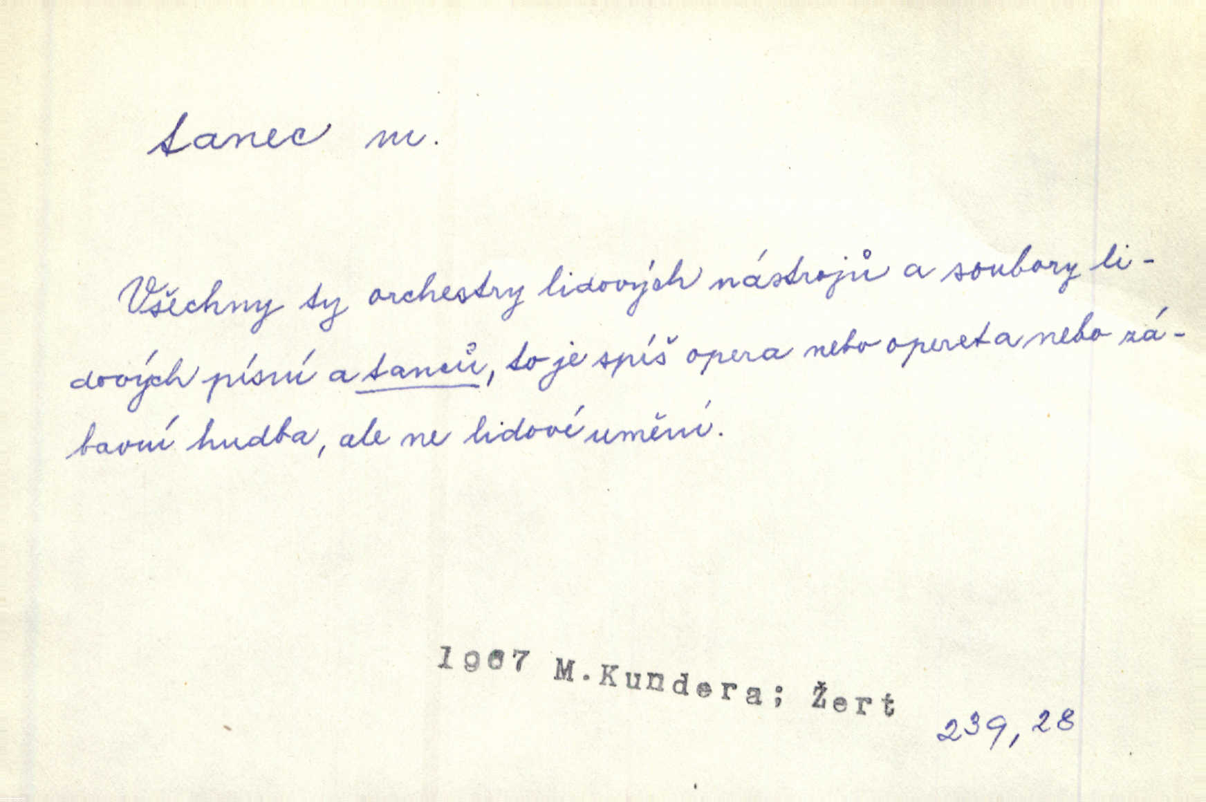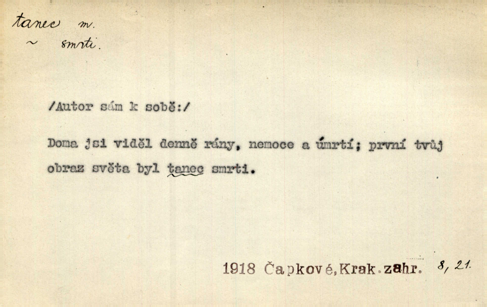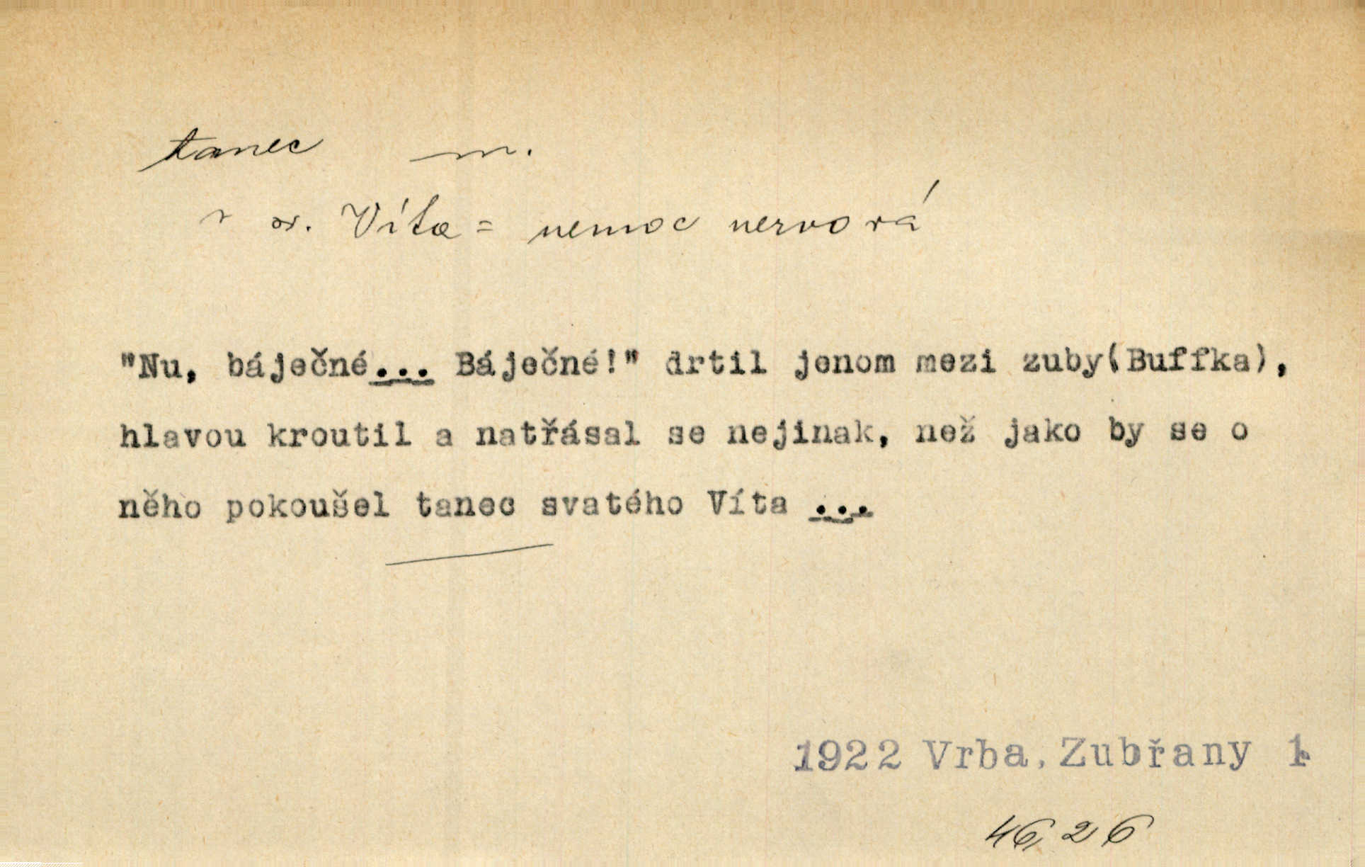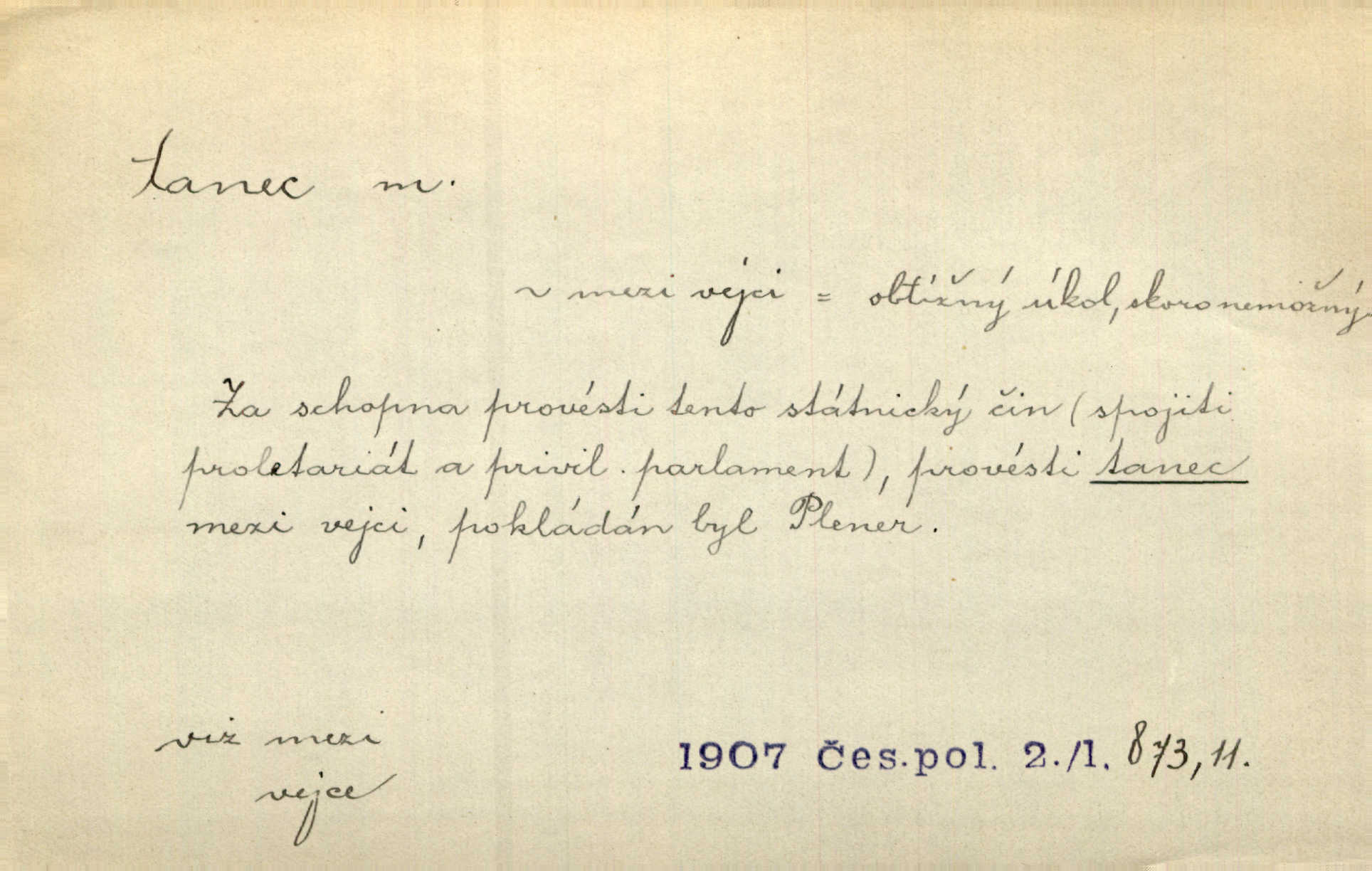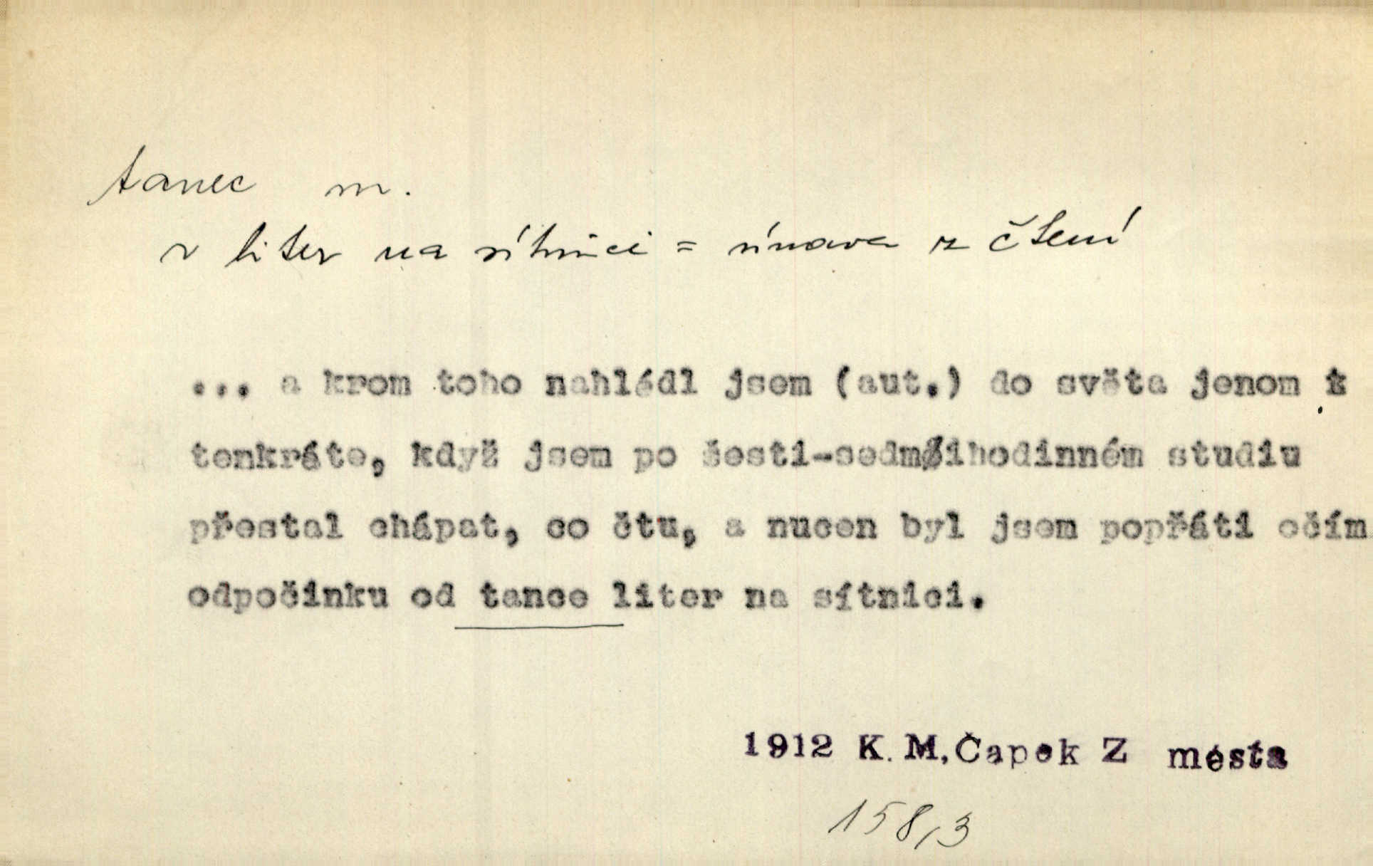 - tanec, -nce m. opakované rytmické pohyby, prováděné jednou n. více osobami, zpr. za doprovodu hudby n. zpěvu. V největším zalíbení byl zpěv, hudba i tanec. Pal. Seznámil jsem se při tanci s jistou Pražankou. Ner. V divokém tanci zavířil s ní sálem. Čech. Ji chtěl bráti k tanci, ale nešla. Prav. Za tanec bych byla duši dala. Šim. Chtěl životem jíti jako v tanci, lehce, pružně. Kar. Skotačily [mořské vlny] jedna přes druhou, hrály si v tanci. Ner. Nám se čtyrmi dětmi do tance nebude nebudeme mít snadné živobytí. Rais. Za schopna provésti tento státnický čin, provésti tanec mezi vejci, pokládán byl Plener nesnadný skutek. Čes. sl. Vyhodili si kopýtkem, vyšli si na led k tanci vydali se na nebezpečnou cestu. Svět. D jistý druh těchto rytmických pohybů, prováděných podle ustálených pravidel; hudební doprovod k těmto pohybům. Tu ještě viděti staré tance. Jir. Quadrilla trvá déle, než tanec do kola. Prok. Po přivítání dali nám zahrát národní tance. Něm. Koupím 3 páry střevíčků pro špičkový tanec. Čes. sl. „Italský tanec“ či „pantomima“ předváděla celá dramata. Ner. Hvízdal si úryvky včerejších tanců. R. Svob. První tvůj obraz světa byl tanec smrti. Čap. Tan. tanec kolový, řadový, společenský; lidový, bohoslužebný, obřadný, divošský, idealisovaný, sólový, umělecký a j. D taneční kousek. Po tři tance nemohl se k ní dostati. Herb. Lituji, ale tanec vám dáti nemohu. Bozd. Hud. skladba hraná k tanci. D Expr. poskakování, pobíhání, hbitý, rychlý pohyb, mihotání. Plotna syčí a to je tanec okolo ohně. Sula. Konečně prořidl a zastavil se tanec vloček. K. Čap. Nucen byl jsem popřáti očím odpočinku od tance liter na sítnici. Čap. Ch. Pozoroval tanec malého plamene. Týd. rozhl. Všechny [myšlenky] ve volném tanci otáčely se ve vlnivé linii kolem čekaného štěstí. R. Svob. D Expr. spěch, shon, zmatek, mela, rvačka. A to je pak tanec, když na to lidé přijdou! Herrm. My taky měli tanec jako vy, s ovsem. M. Jahn. Tedy nevím, jaký tanec z toho vypadne co z toho pojde. Praž. pos. „Což? Zase štěkal starej?“ „A jak! Ten zas dělal tanec“ láteřil, vyváděl! Her. Já jsem kyrysar od druhé škadrony. Nemyslíš, že nám zítra nastane tanec krutá seč, boj? Baar. D tanec sv. Víta ob. posunčina. Natřásal se nejinak, než jako by se o něho pokoušel tanec svatého Víta. Vrba. Poskakoval, jako když jej chytne Vítův tanec. Sova. D kočičí tanec lid. pokrm z hrachu n. čočky a krup. Ví on třeba, co je to, ‚hoď bidlo přes bidlo‘ nebo ‚kočičí tanec‘? Taková pochoutka! John.