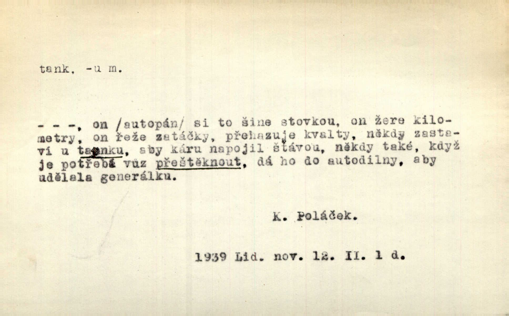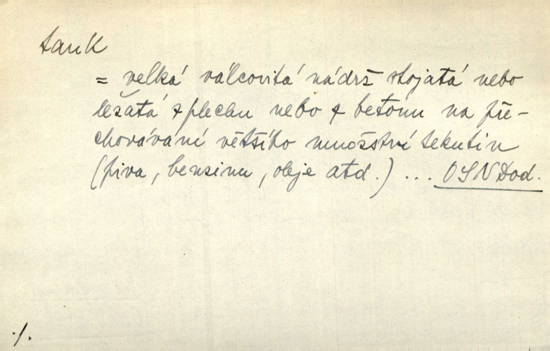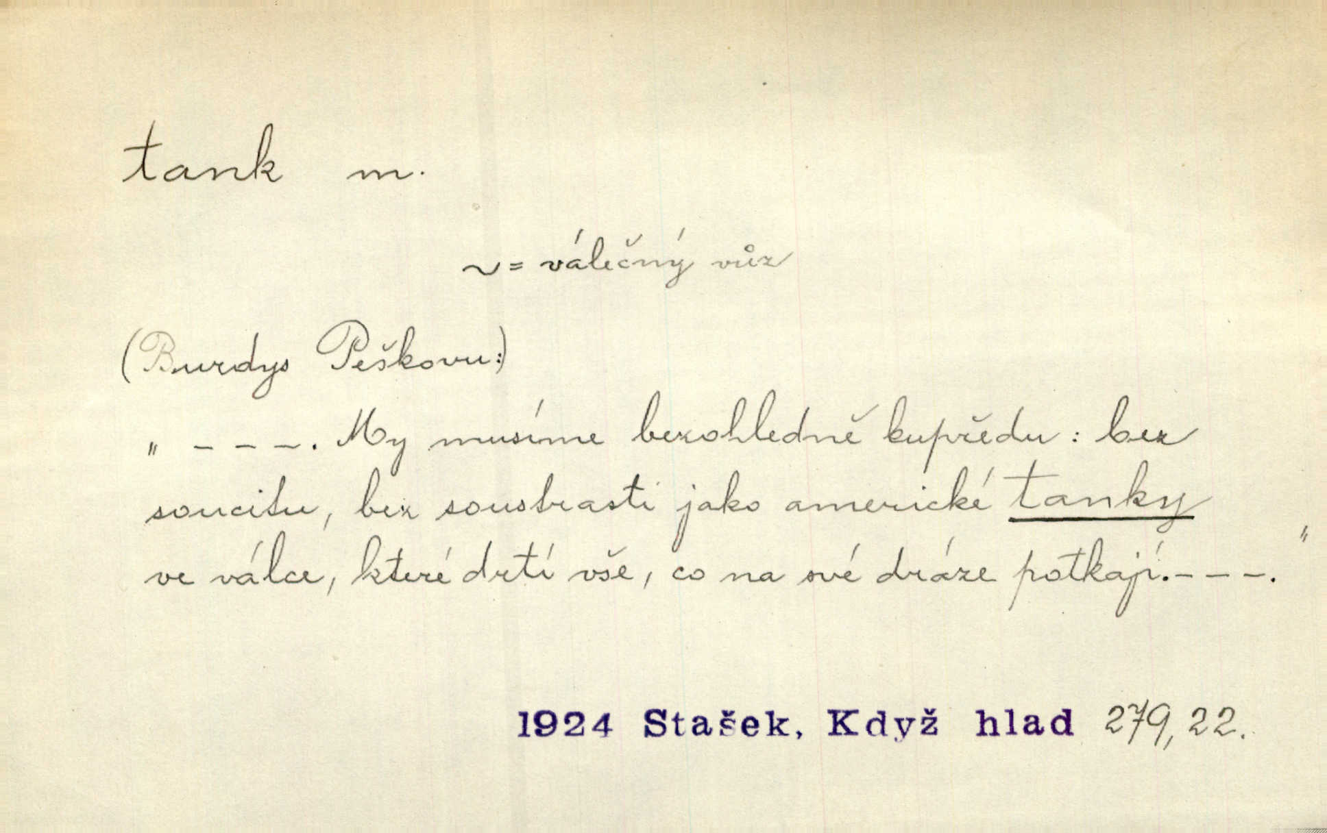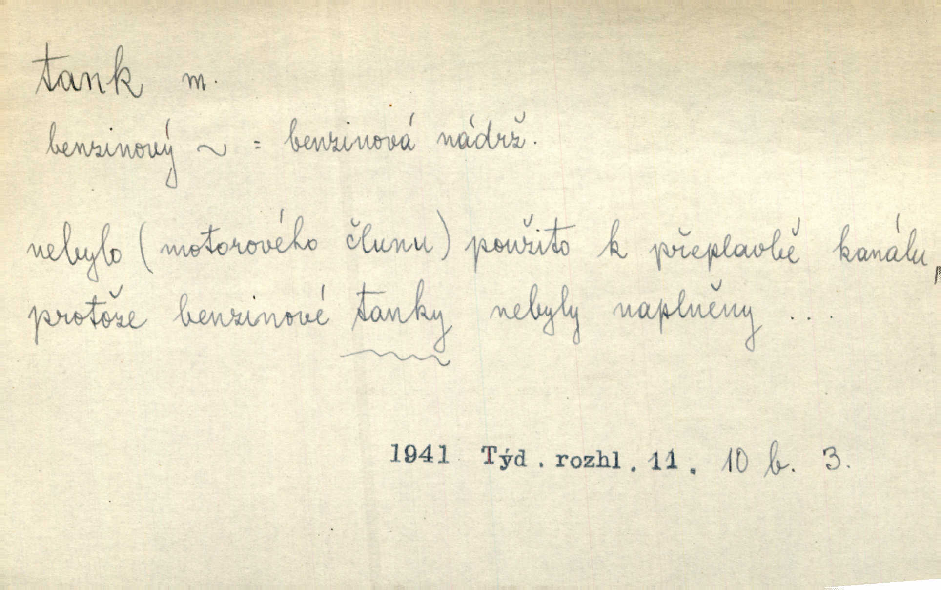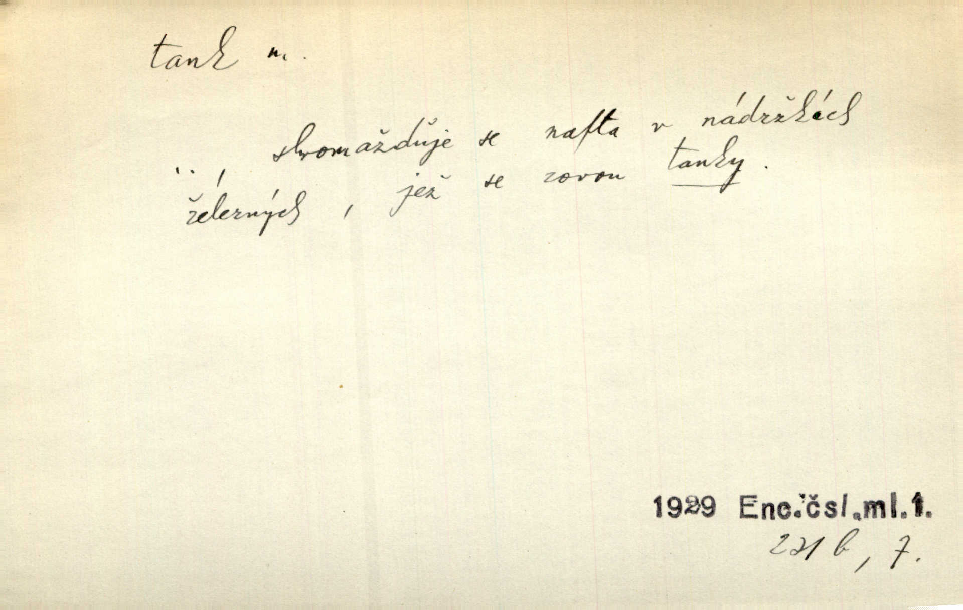 - tank, -u m. obrněné motorové vozidlo na pásech s mohutnou výzbrojí k přímému boji. V září objevily se na západním bojišti anglické tanky. Schein. Dělnické milice v závodech Sovětského svazu měly nejen pušky, ale měly i kulomety, tanky, aeroplány. Zápot. Musíme bezohledně kupředu: bez soucitu, bez soustrasti jako americké tanky. Staš. Přen. Hlavní důvod naší porážky [v kopané] vidí v tom, ze nám v útoku chyběl „tank“ tvrdý hráč, hrající s vervou a přes všechny překážky. Nár. p. D velká nádoba n. nádrž na přechovávaní většího množství tekutin (piva, benzinu a j.). Dalším zlem jest nahrazování dřevěných ležáckých sudů pivními tanky. Právo l. Na křižovatkách ulic se pestřily oranžové a červené tanky, kde automobilisté napájeli vozy. Poláč. Mléko v tancích do Prahy bude dopravováno z Tábora. Ranní nov. D Fot. vyvolávací nádoba; uzavřena nádoba, v níž se vyvolávají desky n. filmy.
