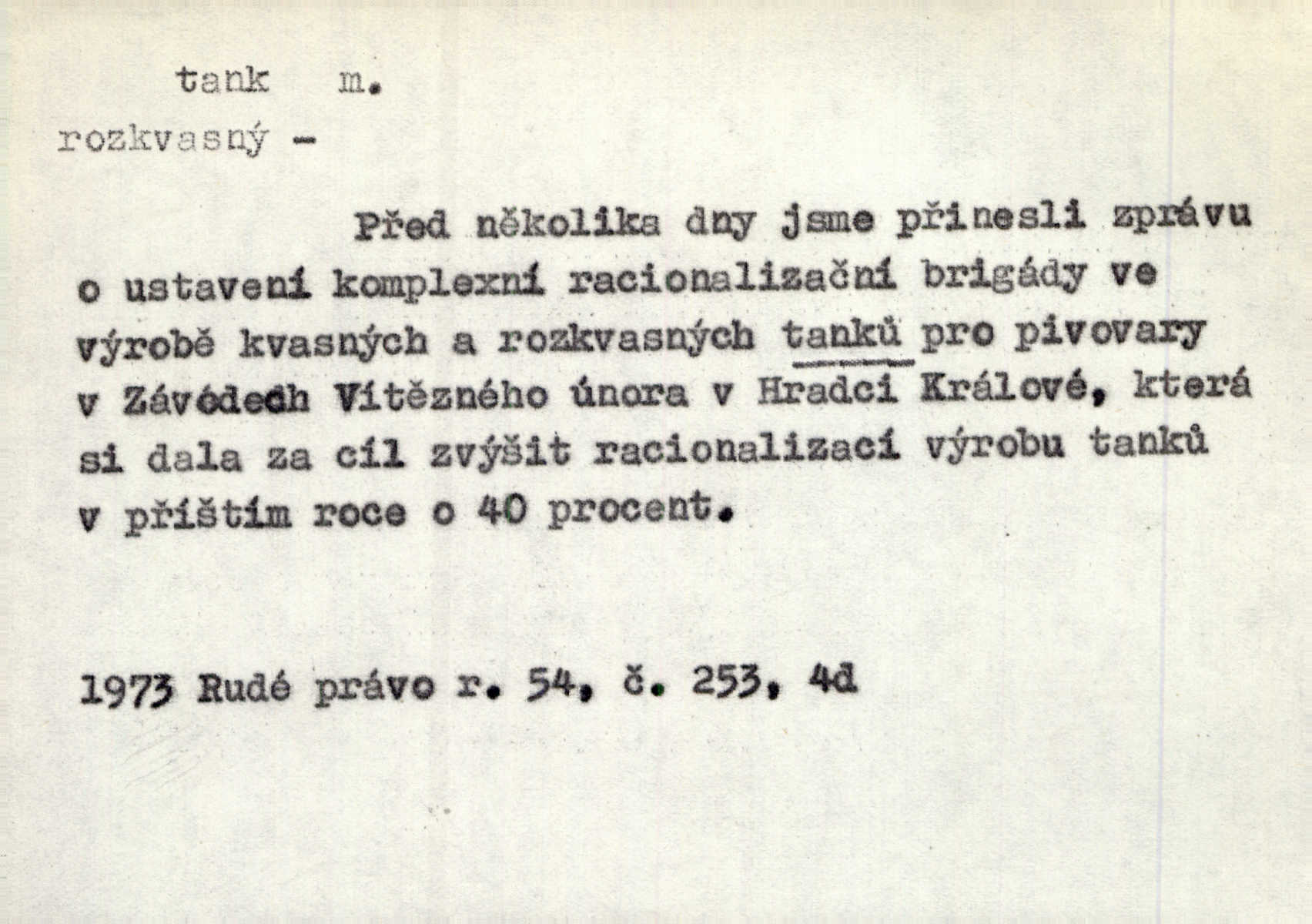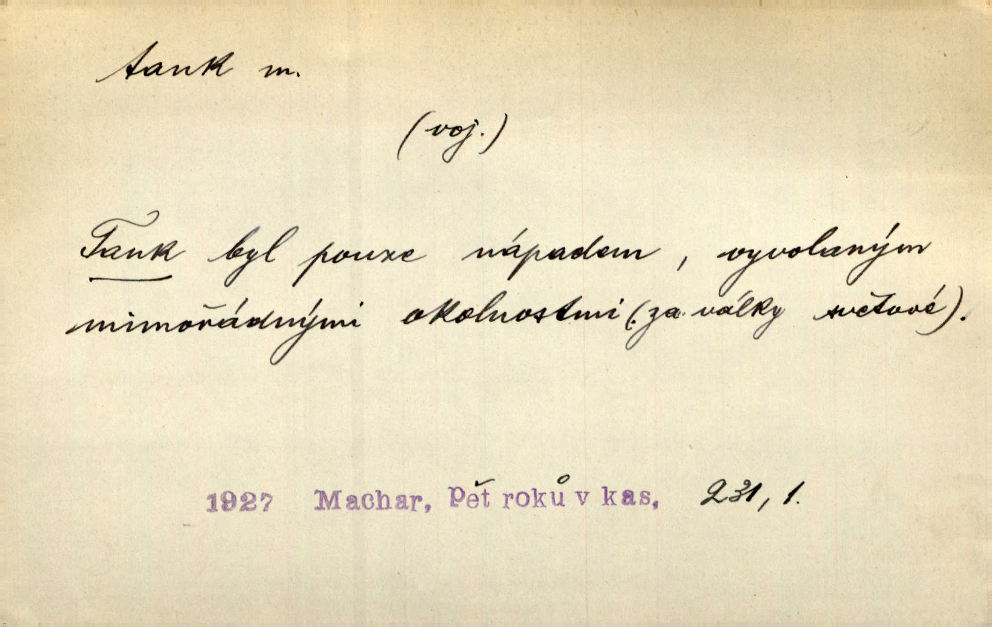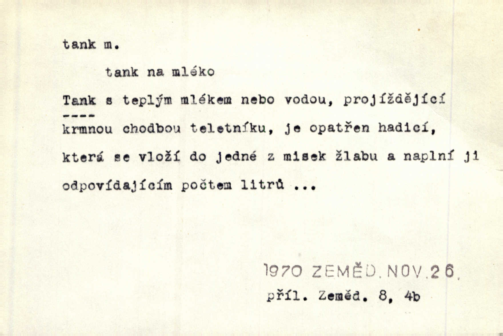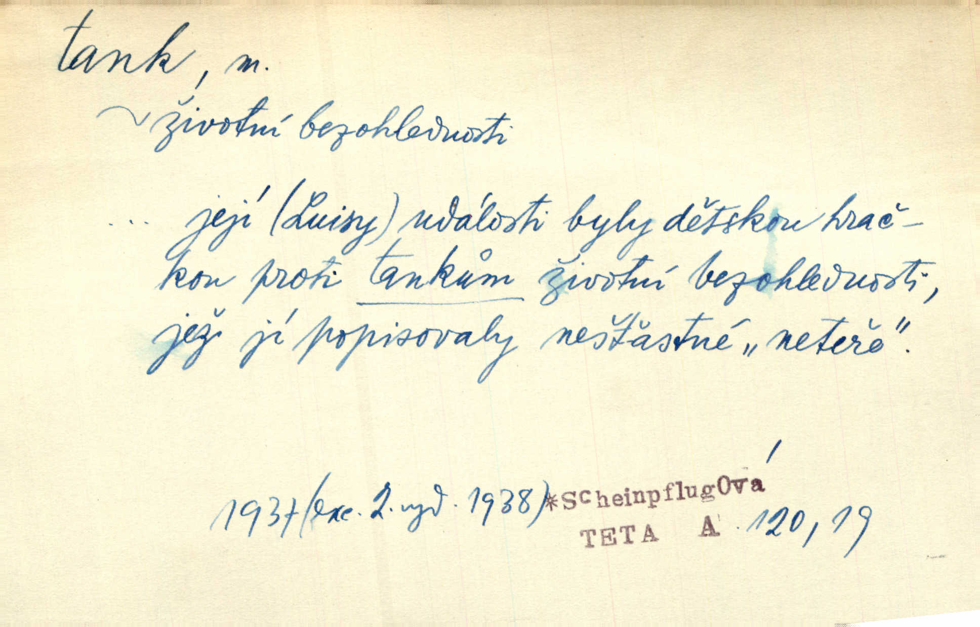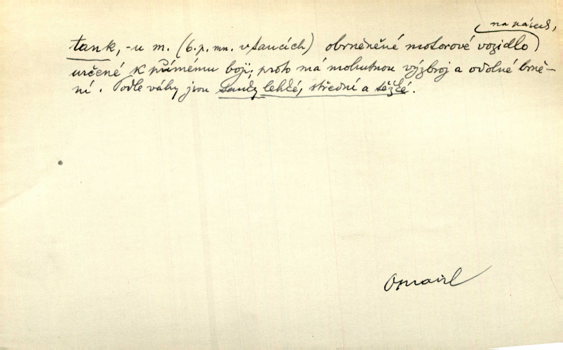 - tank, -u m. obrněné motorové vozidlo na pásech s mohutnou výzbrojí k přímému boji. V září objevily se na západním bojišti anglické tanky. Schein. Dělnické milice v závodech Sovětského svazu měly nejen pušky, ale měly i kulomety, tanky, aeroplány. Zápot. Musíme bezohledně kupředu: bez soucitu, bez soustrasti jako americké tanky. Staš. Přen. Hlavní důvod naší porážky [v kopané] vidí v tom, ze nám v útoku chyběl „tank“ tvrdý hráč, hrající s vervou a přes všechny překážky. Nár. p. D velká nádoba n. nádrž na přechovávaní většího množství tekutin (piva, benzinu a j.). Dalším zlem jest nahrazování dřevěných ležáckých sudů pivními tanky. Právo l. Na křižovatkách ulic se pestřily oranžové a červené tanky, kde automobilisté napájeli vozy. Poláč. Mléko v tancích do Prahy bude dopravováno z Tábora. Ranní nov. D Fot. vyvolávací nádoba; uzavřena nádoba, v níž se vyvolávají desky n. filmy.