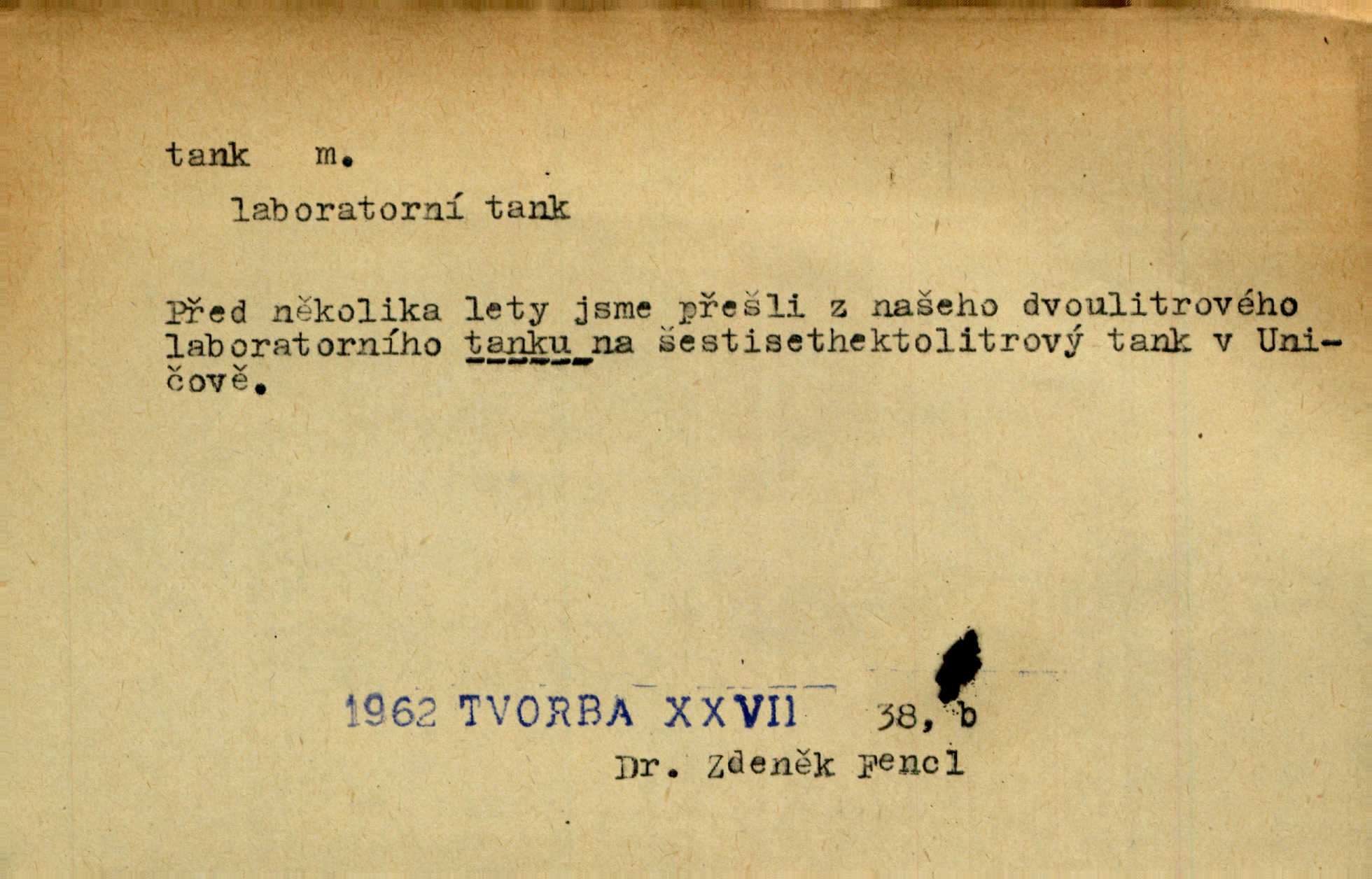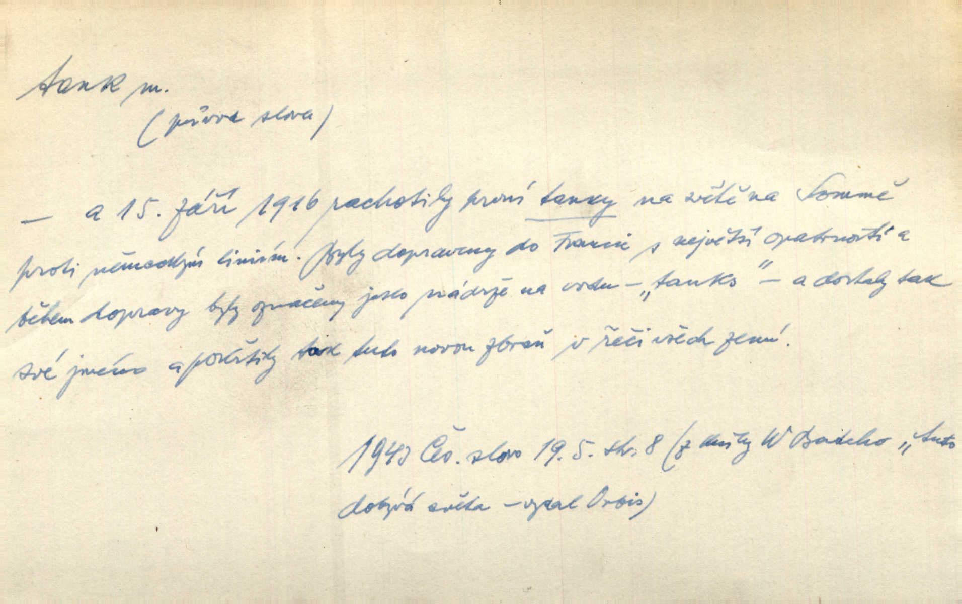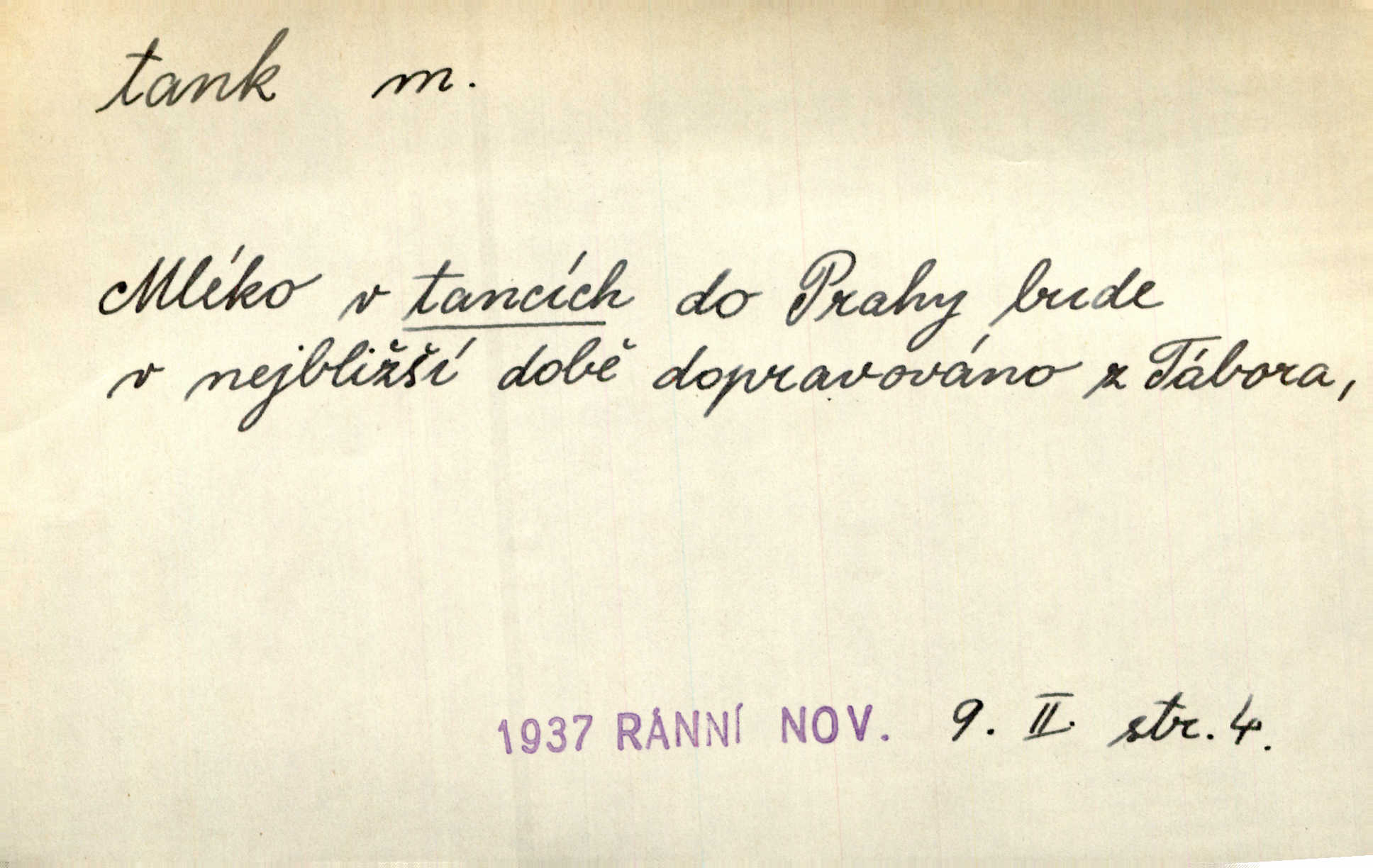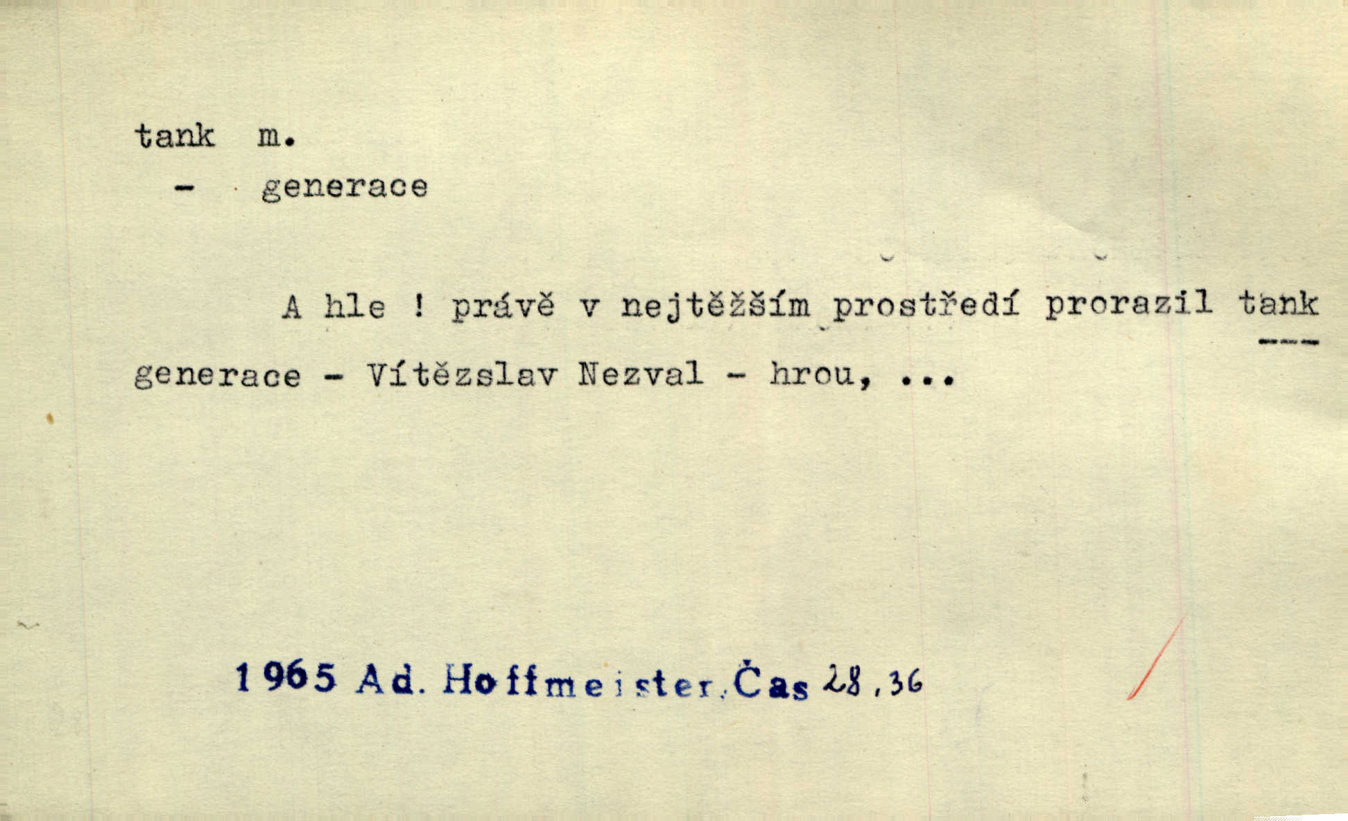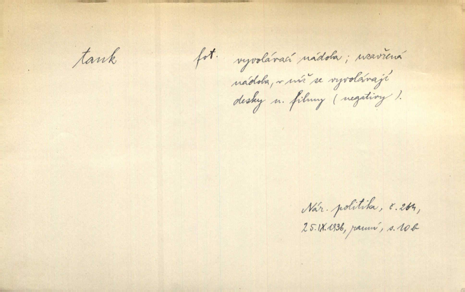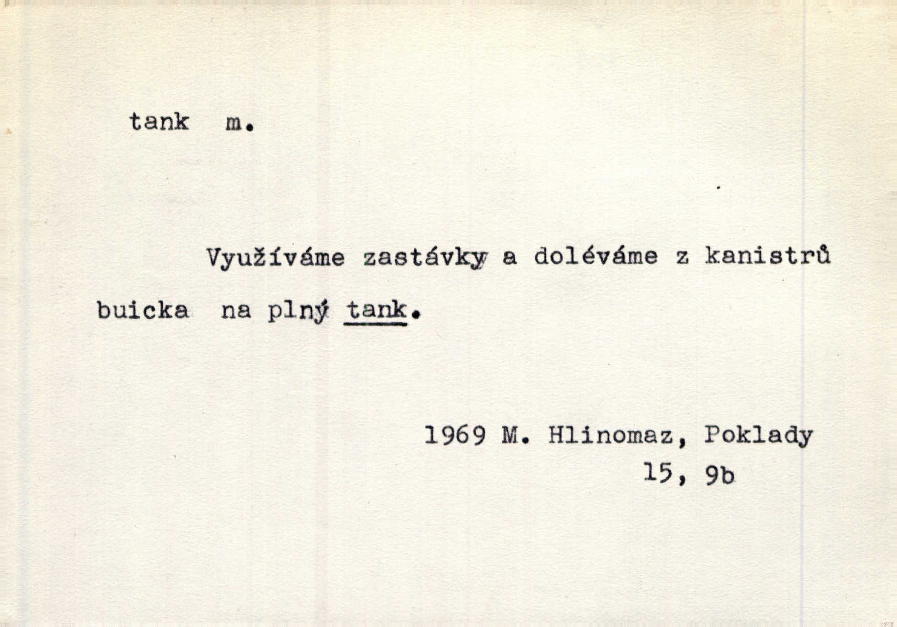 - tank, -u m. obrněné motorové vozidlo na pásech s mohutnou výzbrojí k přímému boji. V září objevily se na západním bojišti anglické tanky. Schein. Dělnické milice v závodech Sovětského svazu měly nejen pušky, ale měly i kulomety, tanky, aeroplány. Zápot. Musíme bezohledně kupředu: bez soucitu, bez soustrasti jako americké tanky. Staš. Přen. Hlavní důvod naší porážky [v kopané] vidí v tom, ze nám v útoku chyběl „tank“ tvrdý hráč, hrající s vervou a přes všechny překážky. Nár. p. D velká nádoba n. nádrž na přechovávaní většího množství tekutin (piva, benzinu a j.). Dalším zlem jest nahrazování dřevěných ležáckých sudů pivními tanky. Právo l. Na křižovatkách ulic se pestřily oranžové a červené tanky, kde automobilisté napájeli vozy. Poláč. Mléko v tancích do Prahy bude dopravováno z Tábora. Ranní nov. D Fot. vyvolávací nádoba; uzavřena nádoba, v níž se vyvolávají desky n. filmy.