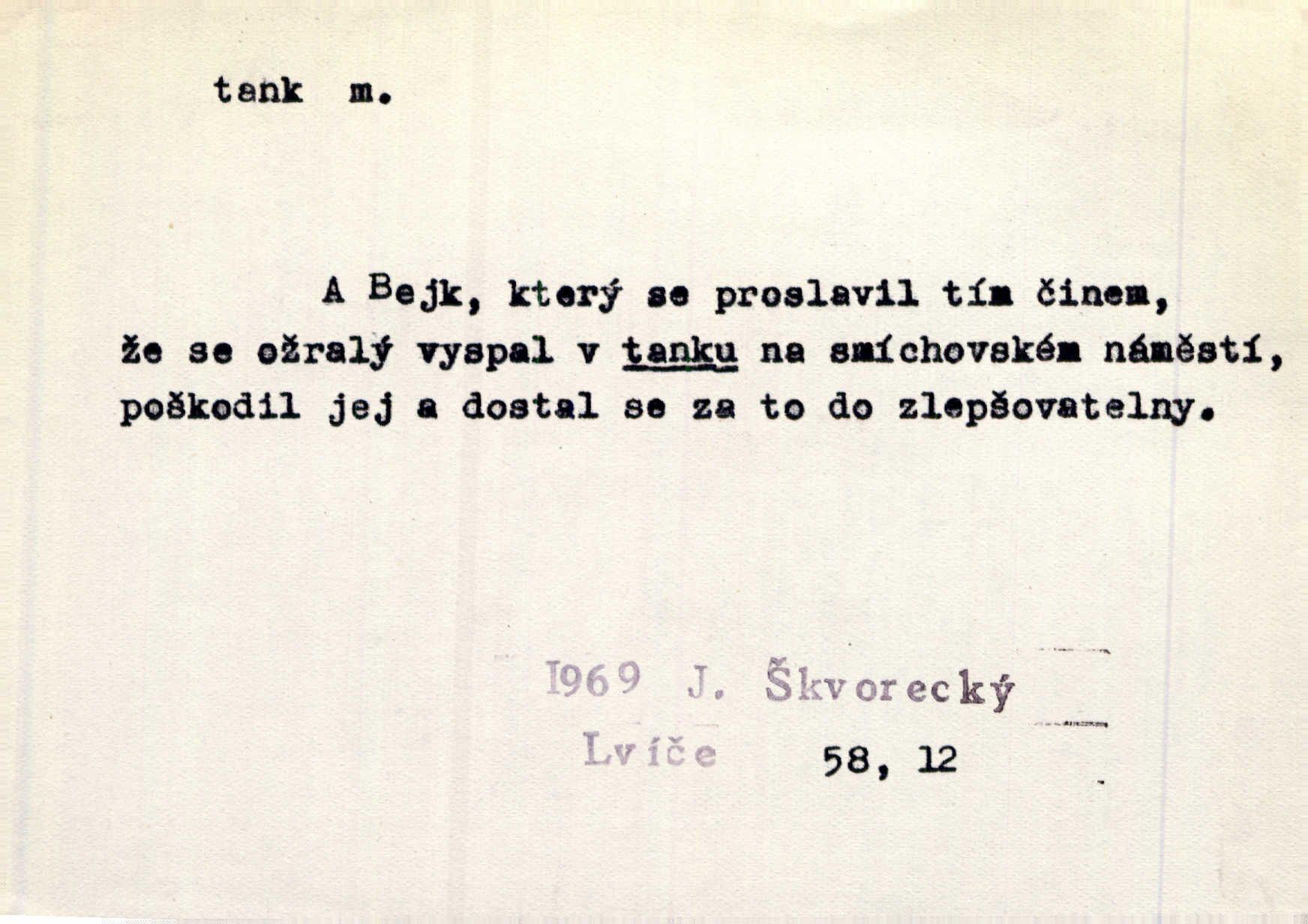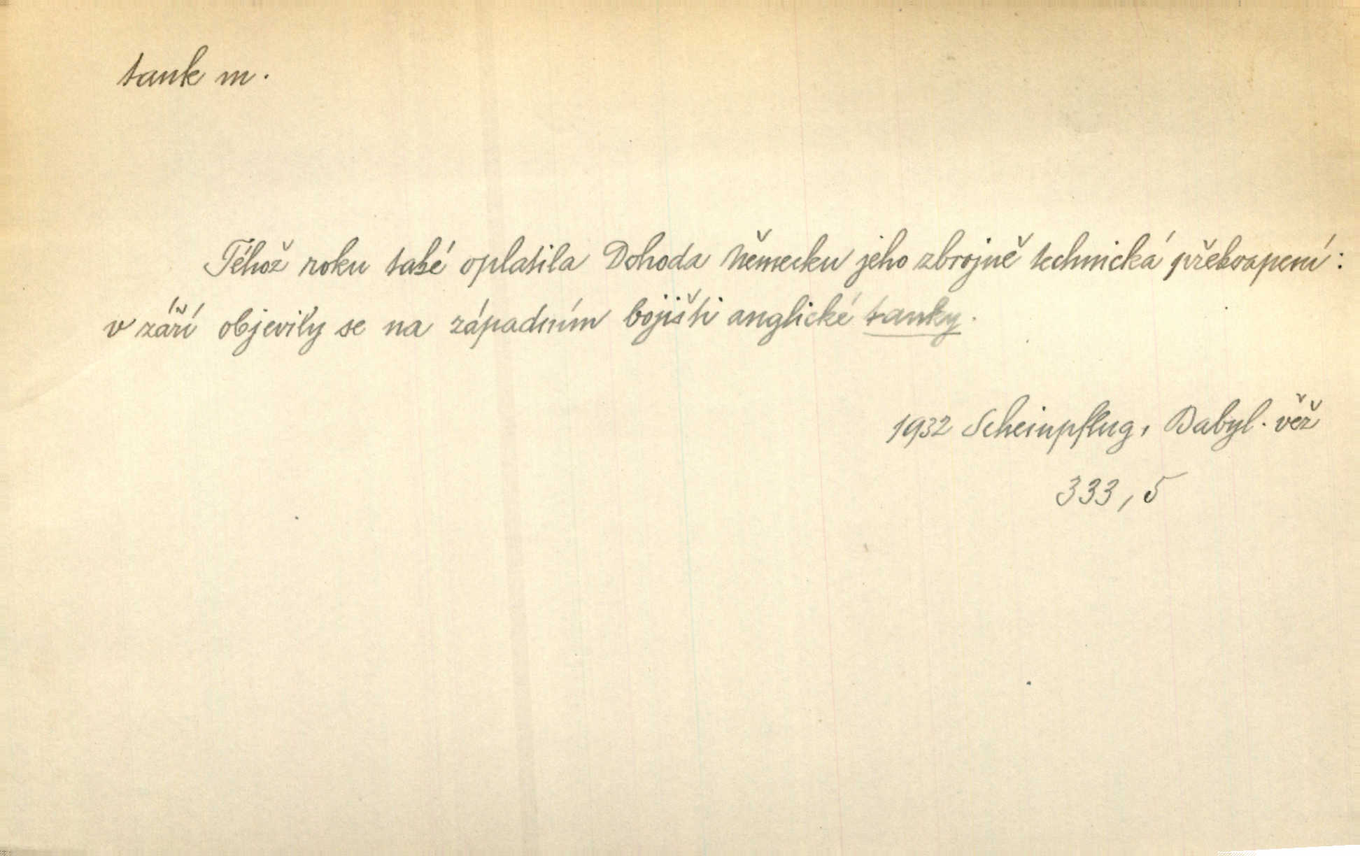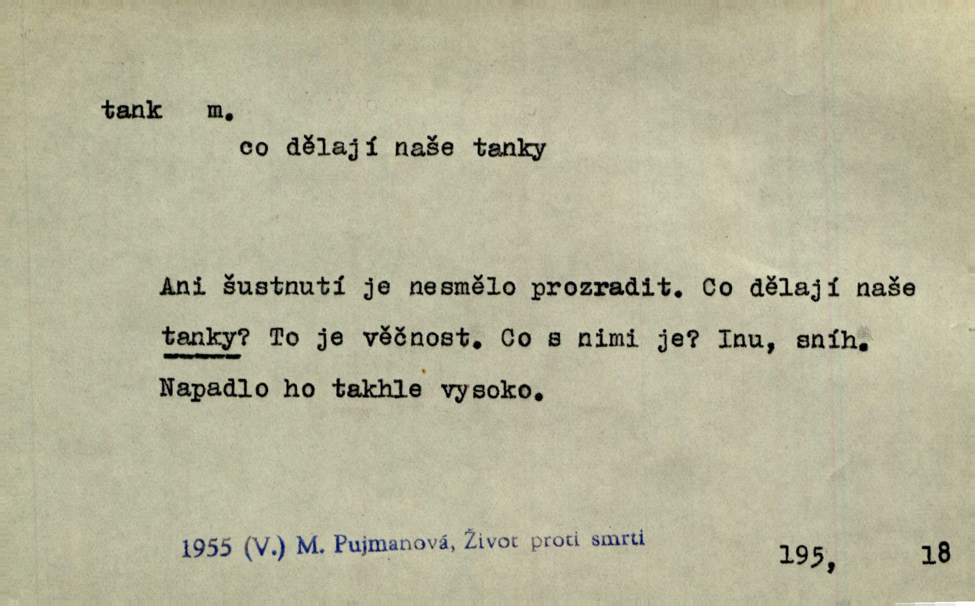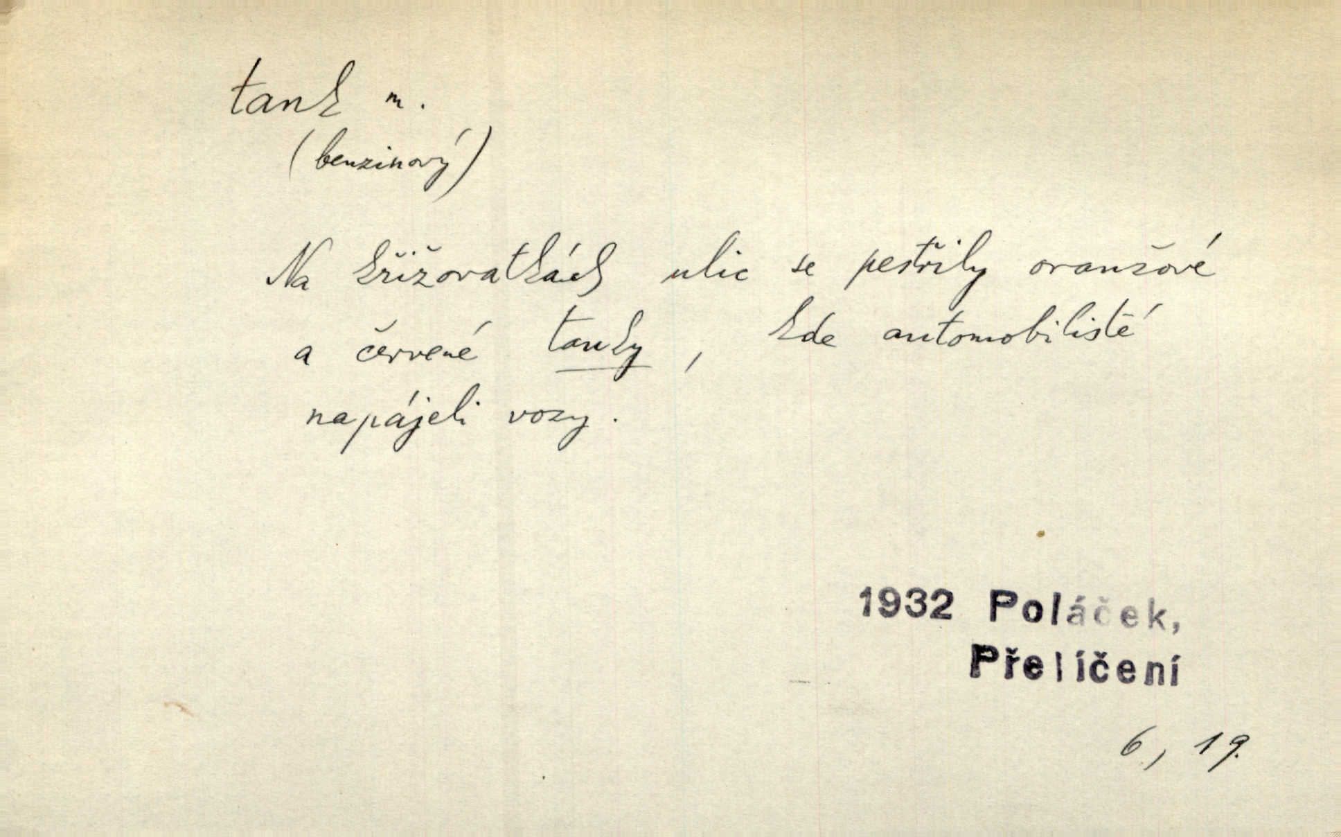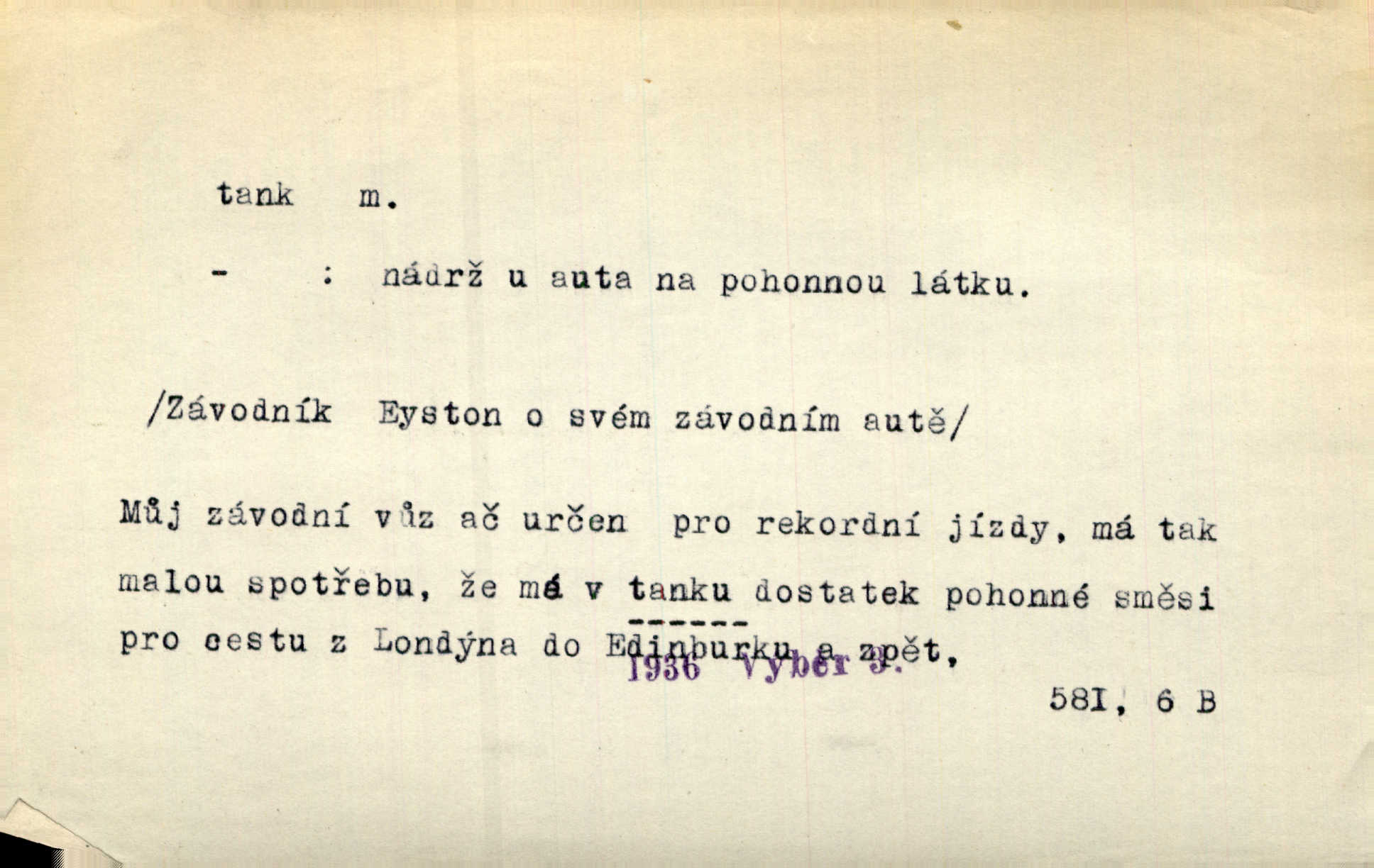 - tank, -u m. obrněné motorové vozidlo na pásech s mohutnou výzbrojí k přímému boji. V září objevily se na západním bojišti anglické tanky. Schein. Dělnické milice v závodech Sovětského svazu měly nejen pušky, ale měly i kulomety, tanky, aeroplány. Zápot. Musíme bezohledně kupředu: bez soucitu, bez soustrasti jako americké tanky. Staš. Přen. Hlavní důvod naší porážky [v kopané] vidí v tom, ze nám v útoku chyběl „tank“ tvrdý hráč, hrající s vervou a přes všechny překážky. Nár. p. D velká nádoba n. nádrž na přechovávaní většího množství tekutin (piva, benzinu a j.). Dalším zlem jest nahrazování dřevěných ležáckých sudů pivními tanky. Právo l. Na křižovatkách ulic se pestřily oranžové a červené tanky, kde automobilisté napájeli vozy. Poláč. Mléko v tancích do Prahy bude dopravováno z Tábora. Ranní nov. D Fot. vyvolávací nádoba; uzavřena nádoba, v níž se vyvolávají desky n. filmy.