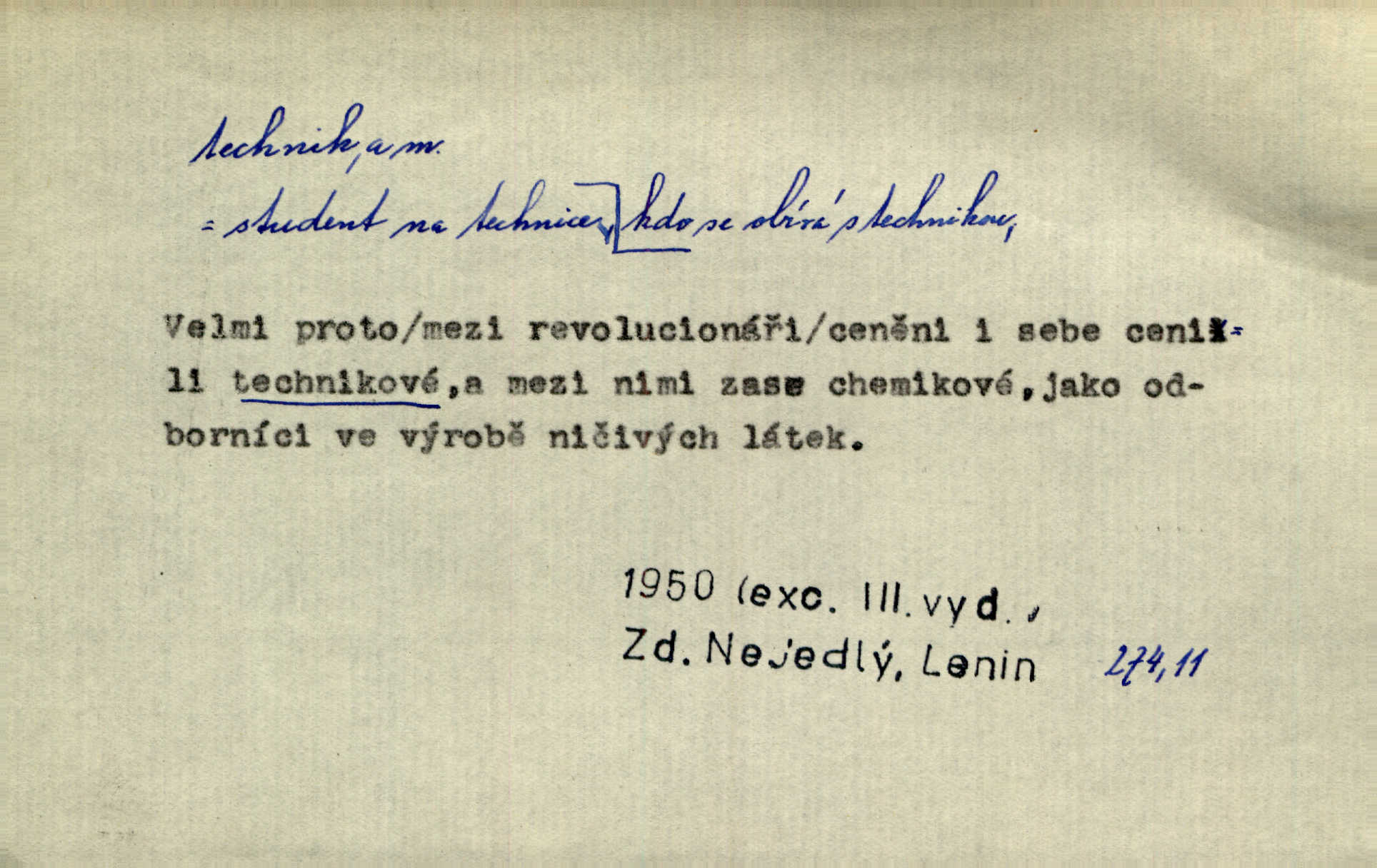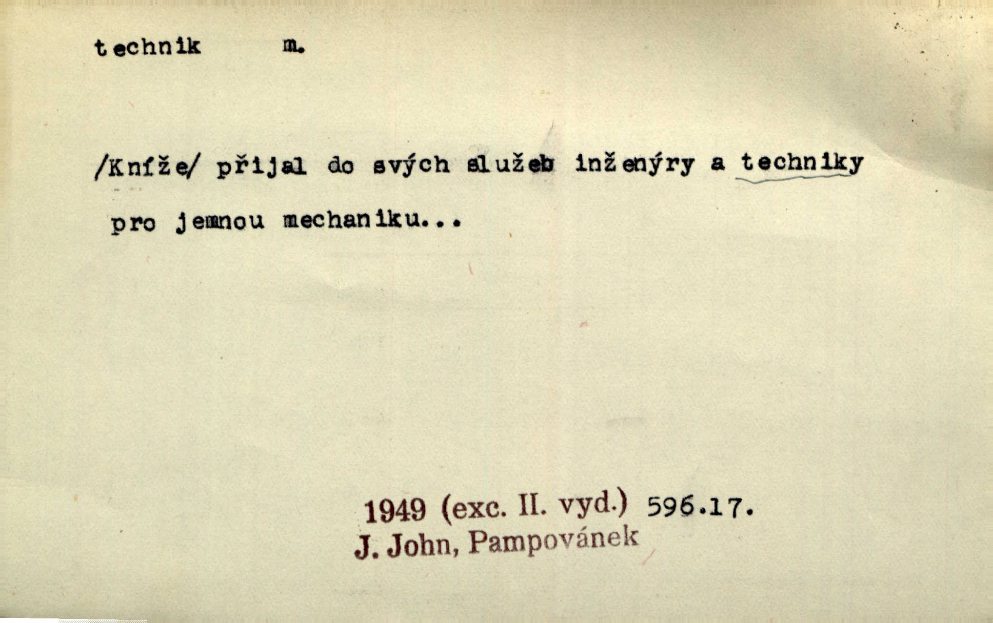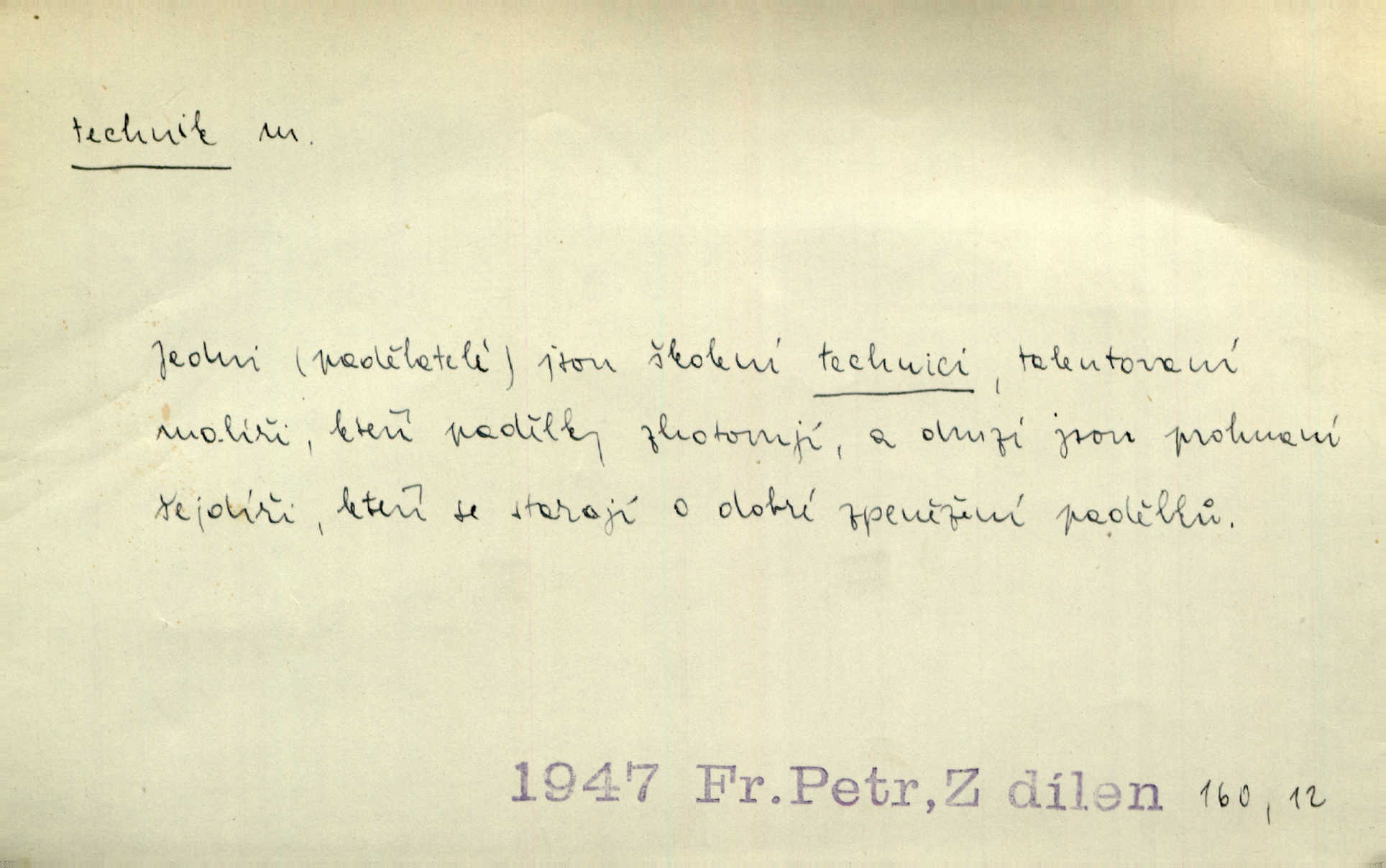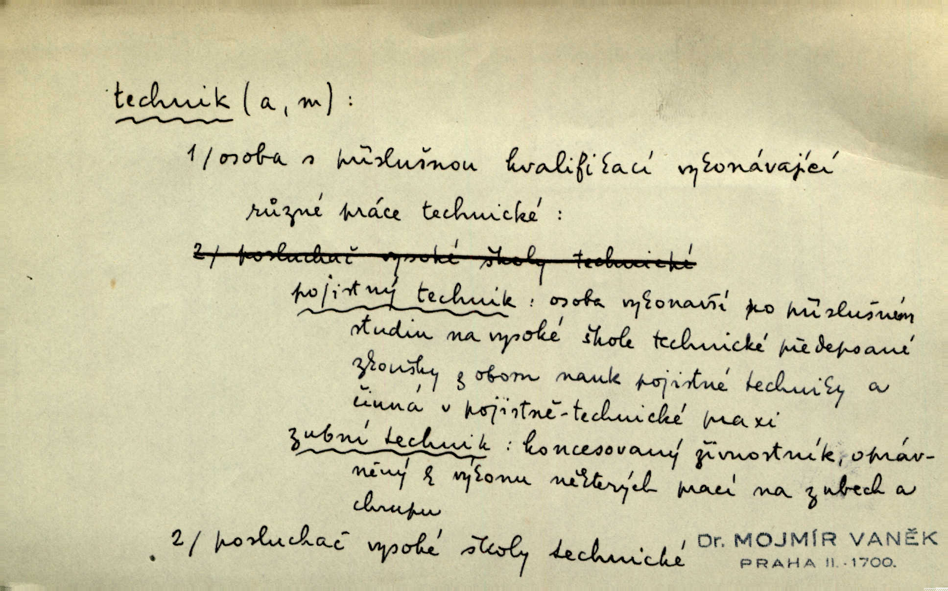 - technik, -a m. osoba s odbornou kvalifikací, vykonávající různé práce směřující k potřebám průmyslovým a pod. Místo králů a hrdinských bitev vystupují na scénu obyčejní lidé — technici. Streit. Morální povinností stavebních techniků [je] zdokonalování pracovních metod ve stavebnictví. Frid. Veř. spr. pojistný technik absolvent oboru pojistných nauk na vysoké škole technické. Živn. zubní technik kdo je oprávněn k výkonu některých prací na zubech a chrupu. D osoba ovládající dobře odbornou, mechanickou stránku nějaké činnosti. Tento autor není jen znamenitý divadelní technik, který zná všechny triky svého povolání. Lum. Oporou zálohy je levý záložník, dobrý technik. R. právo. D posluchač vysoké školy technické. Platil za dva studenty, techniky. Haš. Beneš rád se bavíval s technikem Wurmem. Herb.