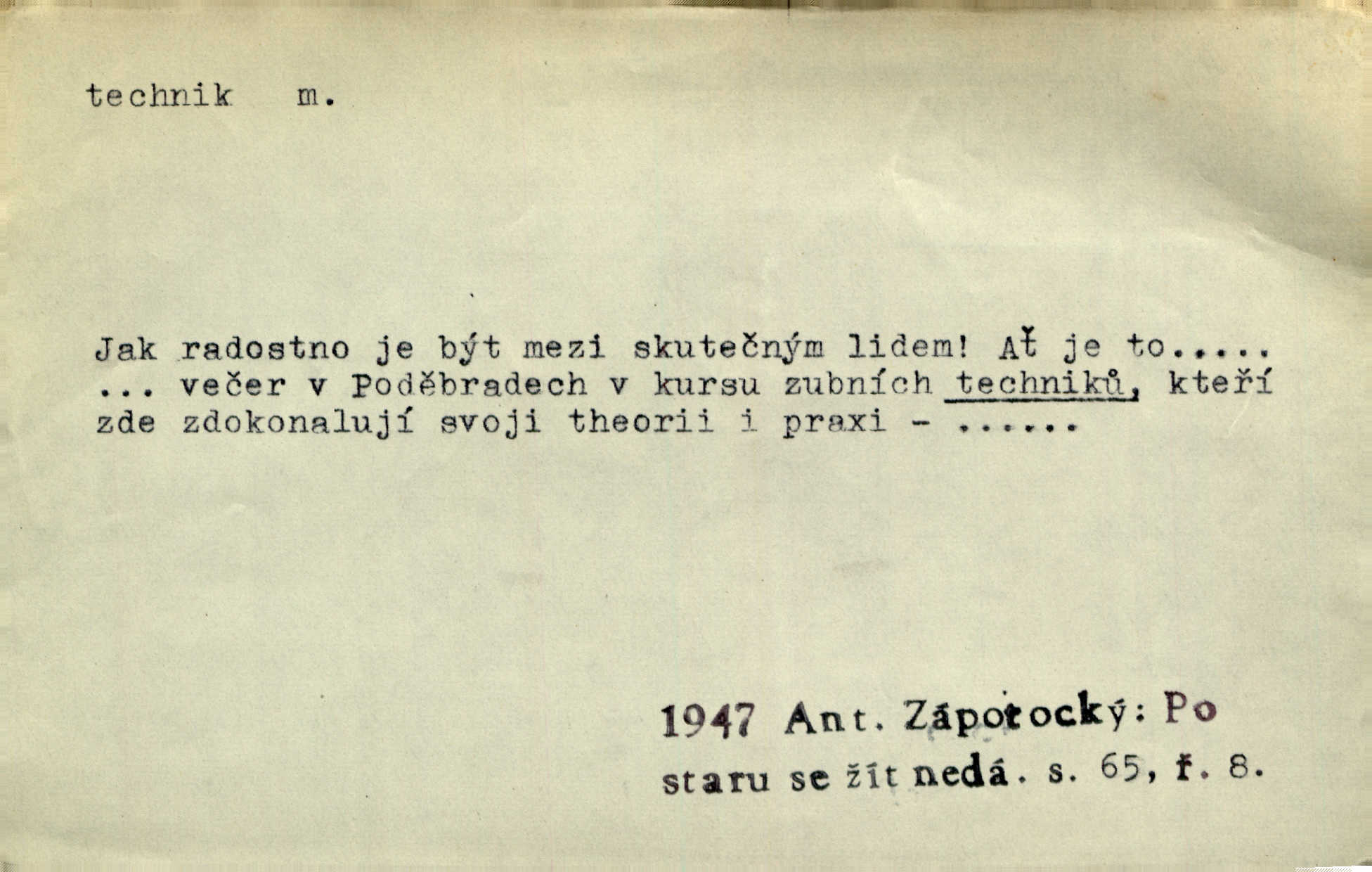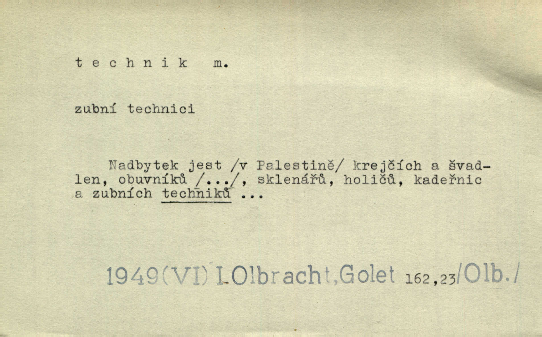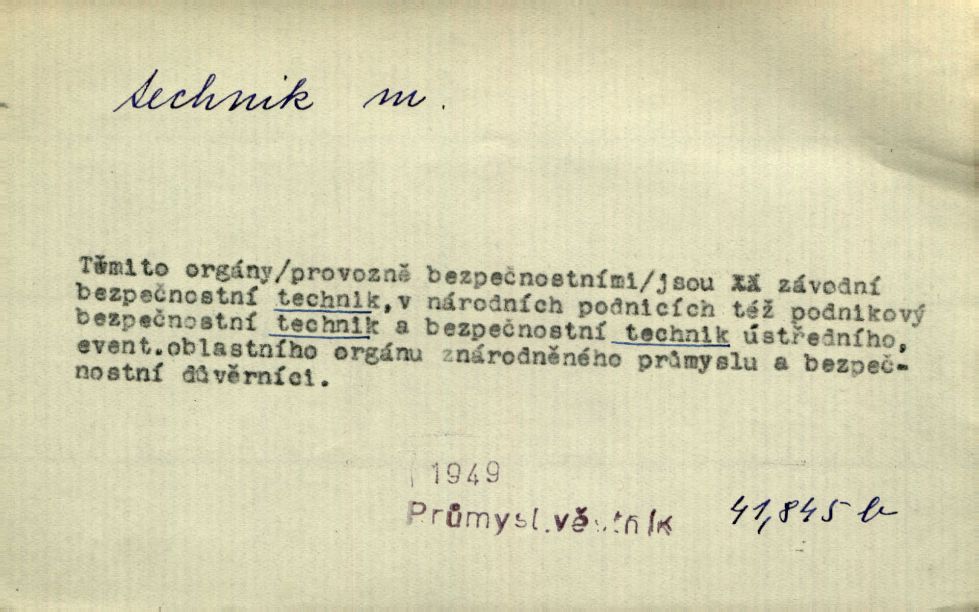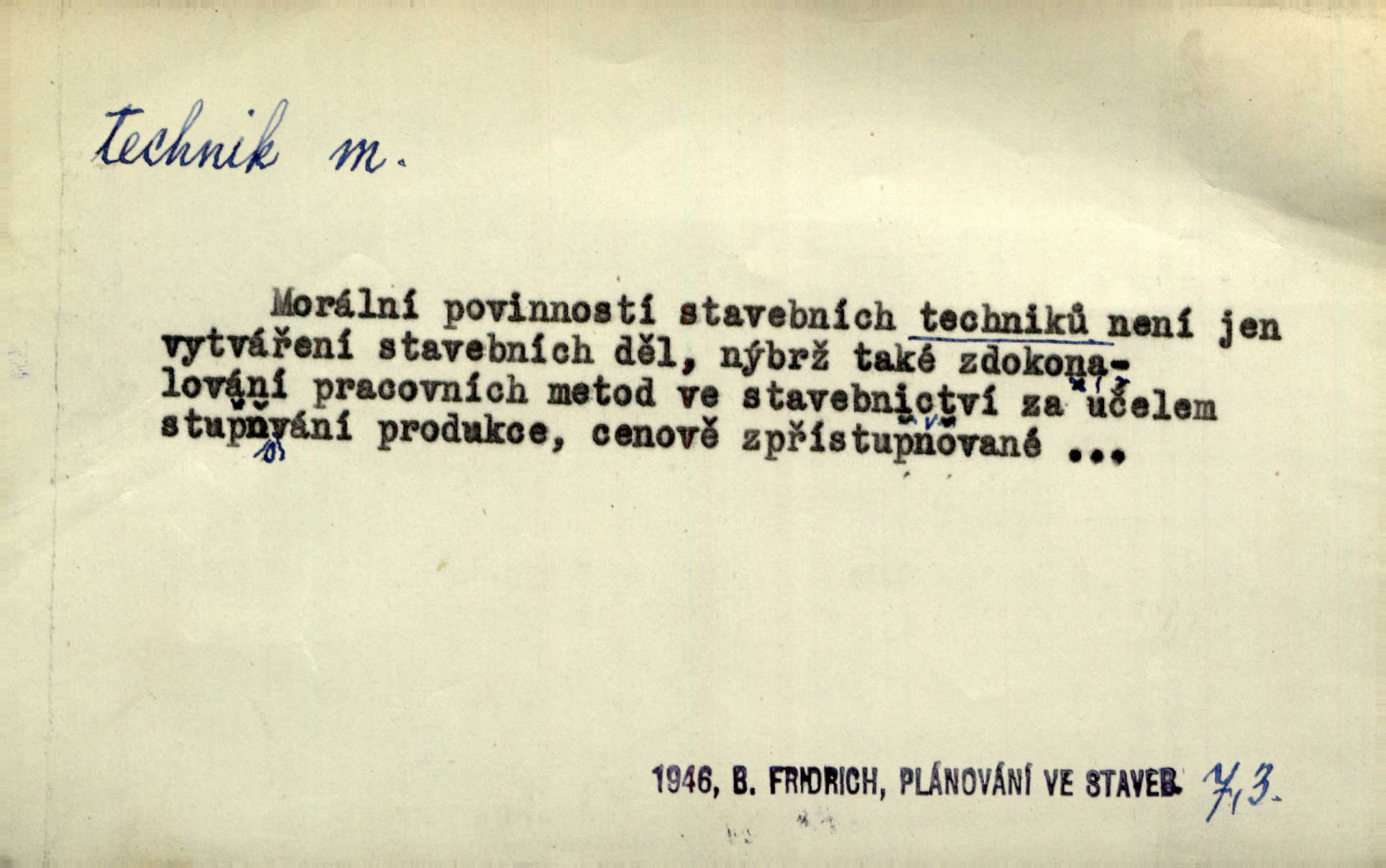- technik, -a m. osoba s odbornou kvalifikací, vykonávající různé práce směřující k potřebám průmyslovým a pod. Místo králů a hrdinských bitev vystupují na scénu obyčejní lidé — technici. Streit. Morální povinností stavebních techniků [je] zdokonalování pracovních metod ve stavebnictví. Frid. Veř. spr. pojistný technik absolvent oboru pojistných nauk na vysoké škole technické. Živn. zubní technik kdo je oprávněn k výkonu některých prací na zubech a chrupu. D osoba ovládající dobře odbornou, mechanickou stránku nějaké činnosti. Tento autor není jen znamenitý divadelní technik, který zná všechny triky svého povolání. Lum. Oporou zálohy je levý záložník, dobrý technik. R. právo. D posluchač vysoké školy technické. Platil za dva studenty, techniky. Haš. Beneš rád se bavíval s technikem Wurmem. Herb.