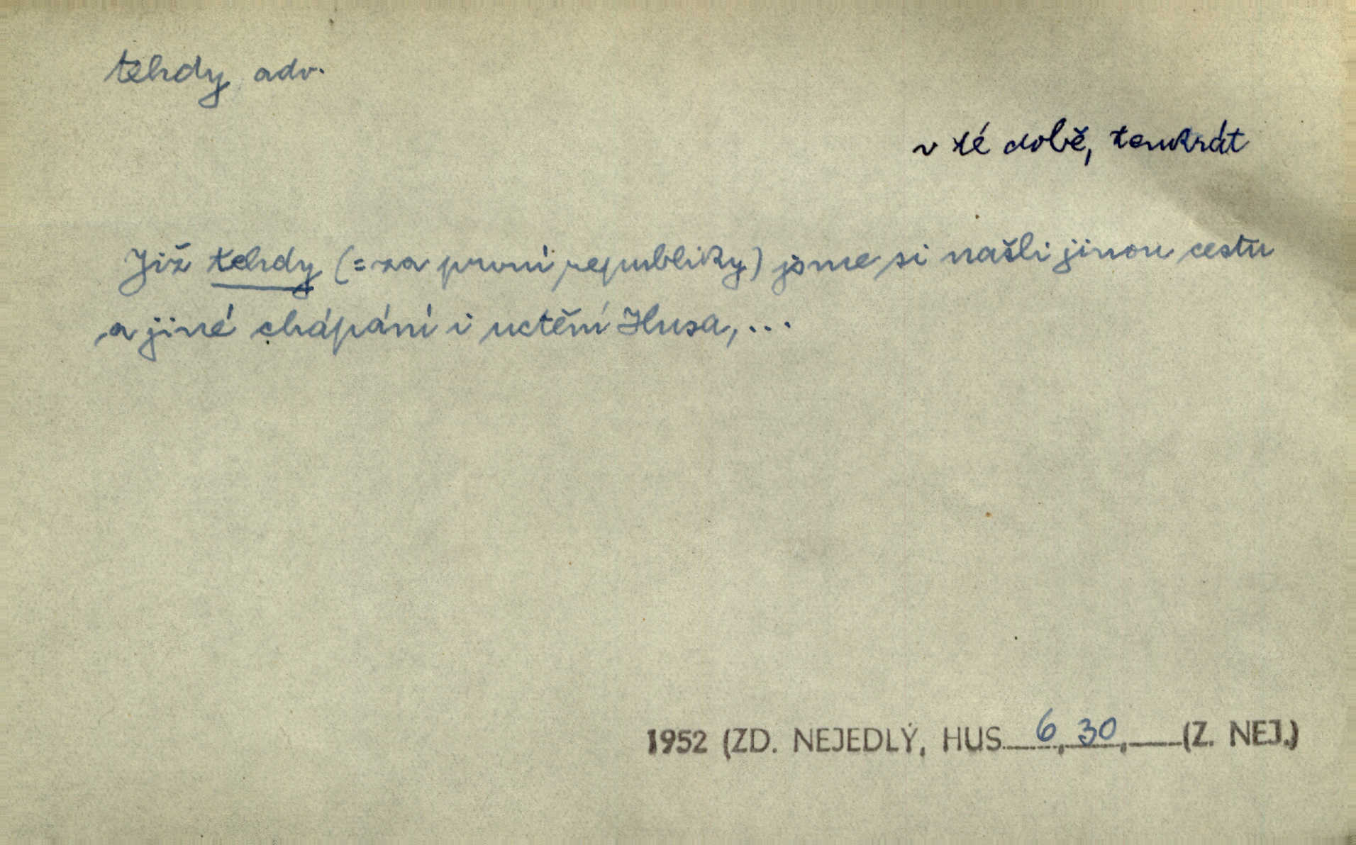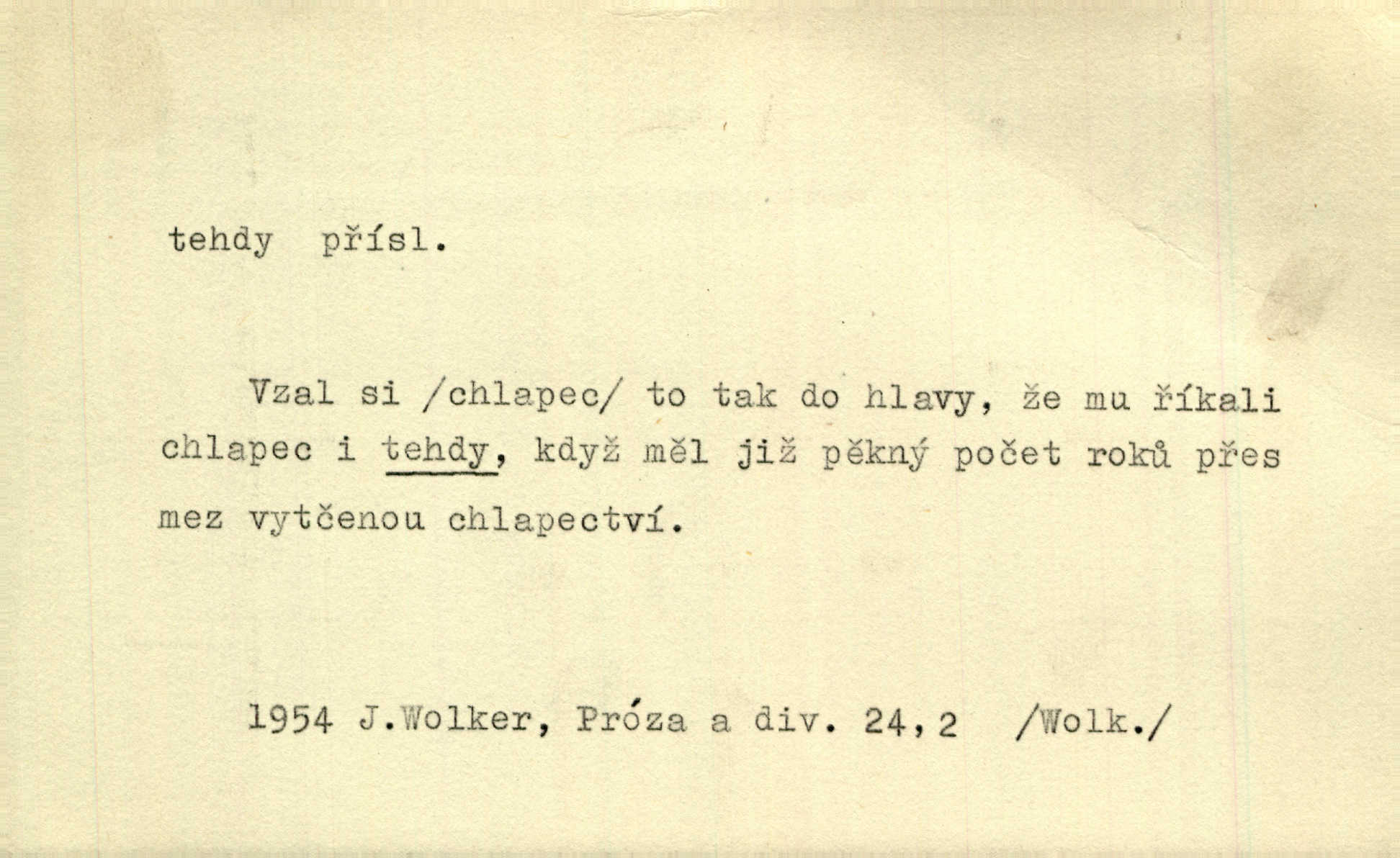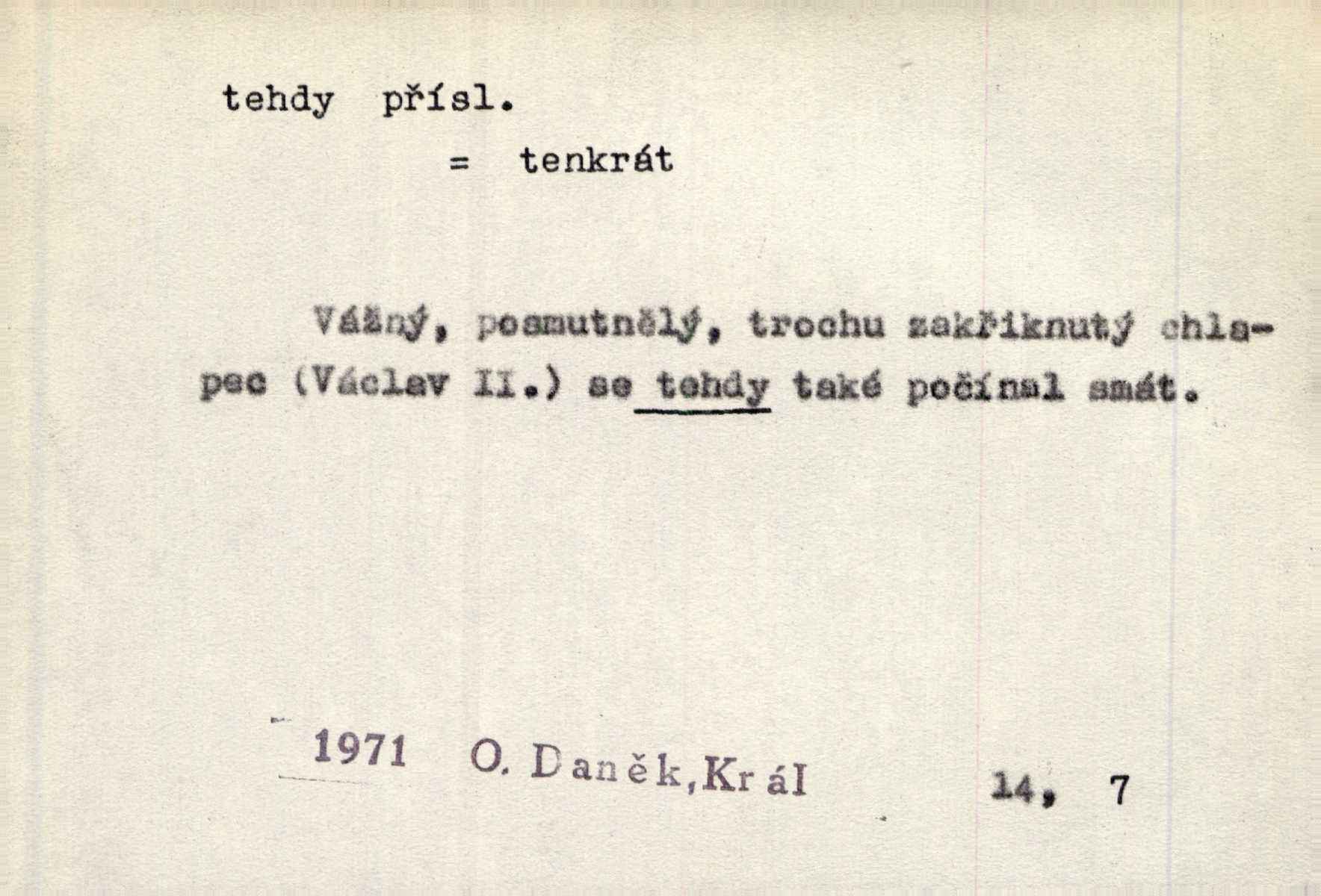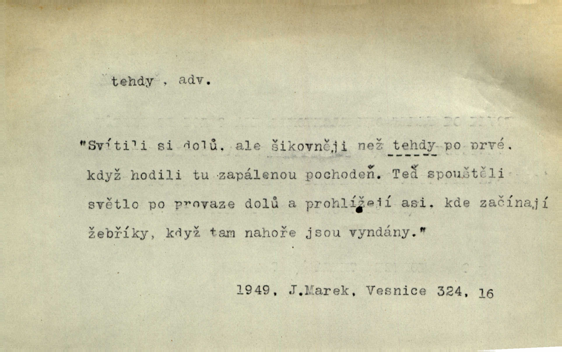 - tehda, tehdáž, tehdy (dial. tehdyvá; zř. tehdys) adv. v oné době, tenkrát, tehdy. Měl jsem tehda při tom prvním a posledním podání ruky jakousi směšnou úzkost. Šim. Jaro tehda záhy a utěšeně se otvíralo. Jir. Lotka byla mladší sestra Fannina, tehdá jedva šestnáctiletá. Klost. Když hrušky zrají, tehdáž se česati mají. Čel. Pražské předměstí právě tehdáž se ponejprve dláždilo. Win. Tehdáž měl jsem rozsáhlé již známosti se staršími i mladšími vlastenci. Ner. Sedlák Květ měl takových knih několik, a to tehdy už něco znamenalo. Třeb. Proč Ti píšu, Jene Maria? Proto, že jsem Tě tehdy miloval, když celý svět se mi ve chmurách jevil. Zey. Když se ti hry nejvíce chce, tehdy přestaň. Čel. Tehdy počaly se jednotlivé paprsky staré osvěty řecké a římské prodírati z rumu. Čech. Jen kdys tehdys mlhami prosvitne slunce. Třeb. To už není jak tehdyvá. Uh.