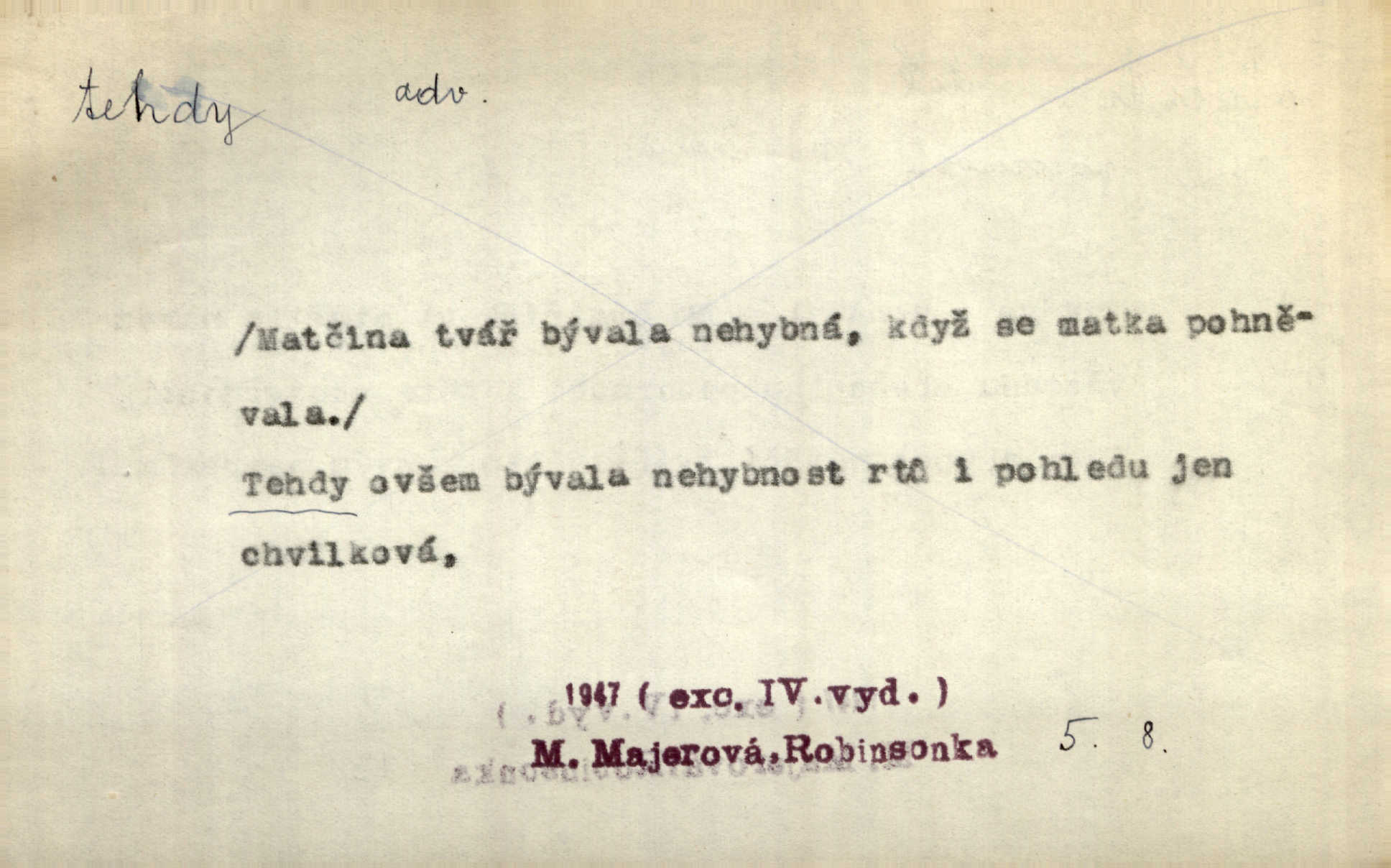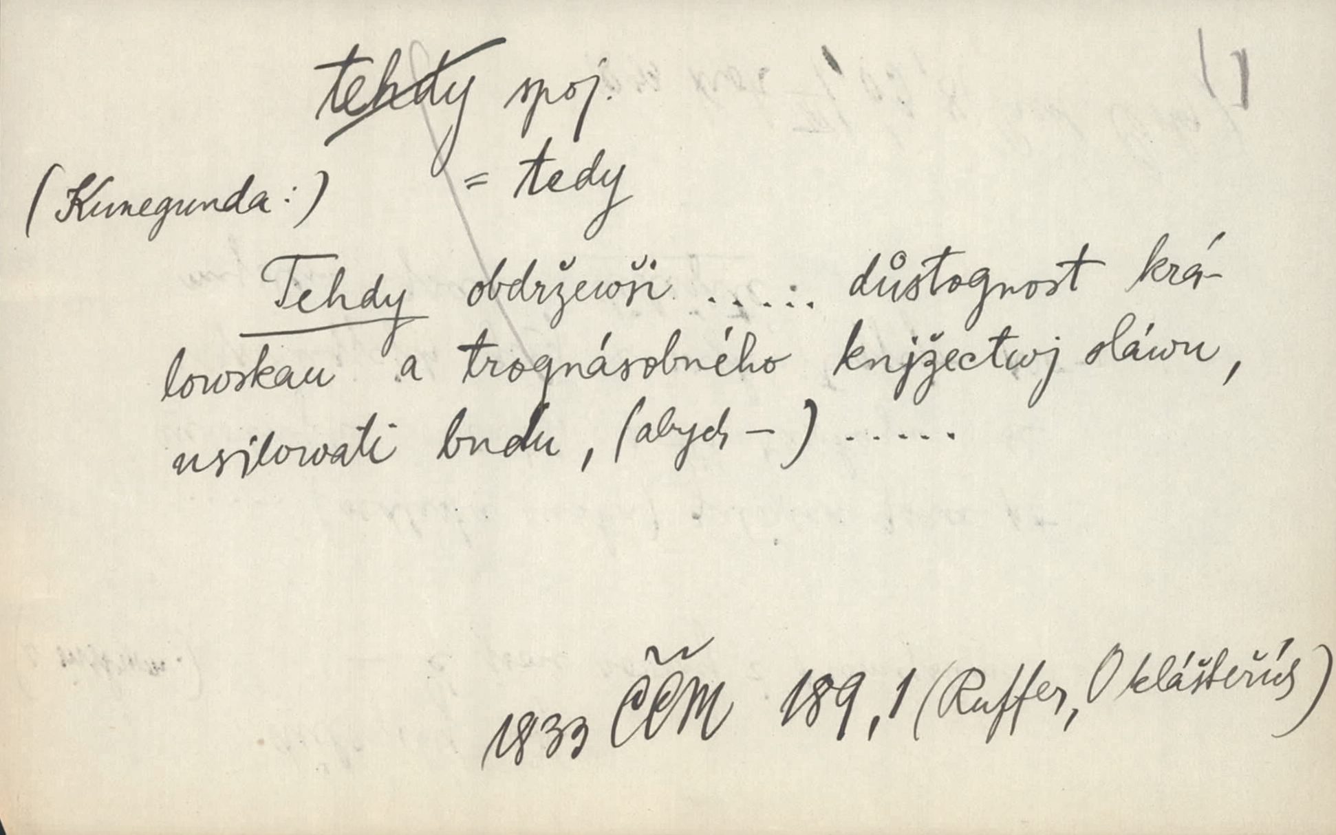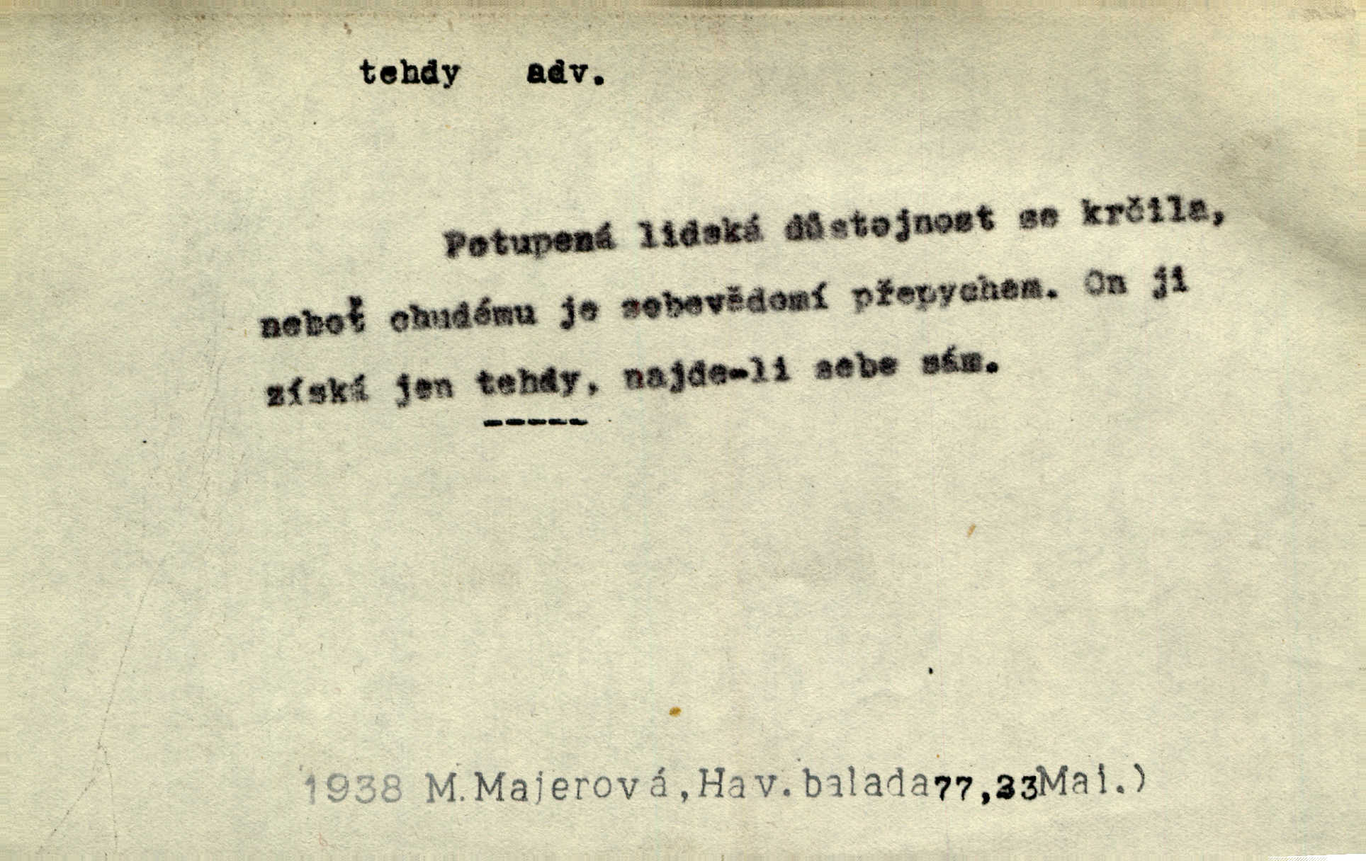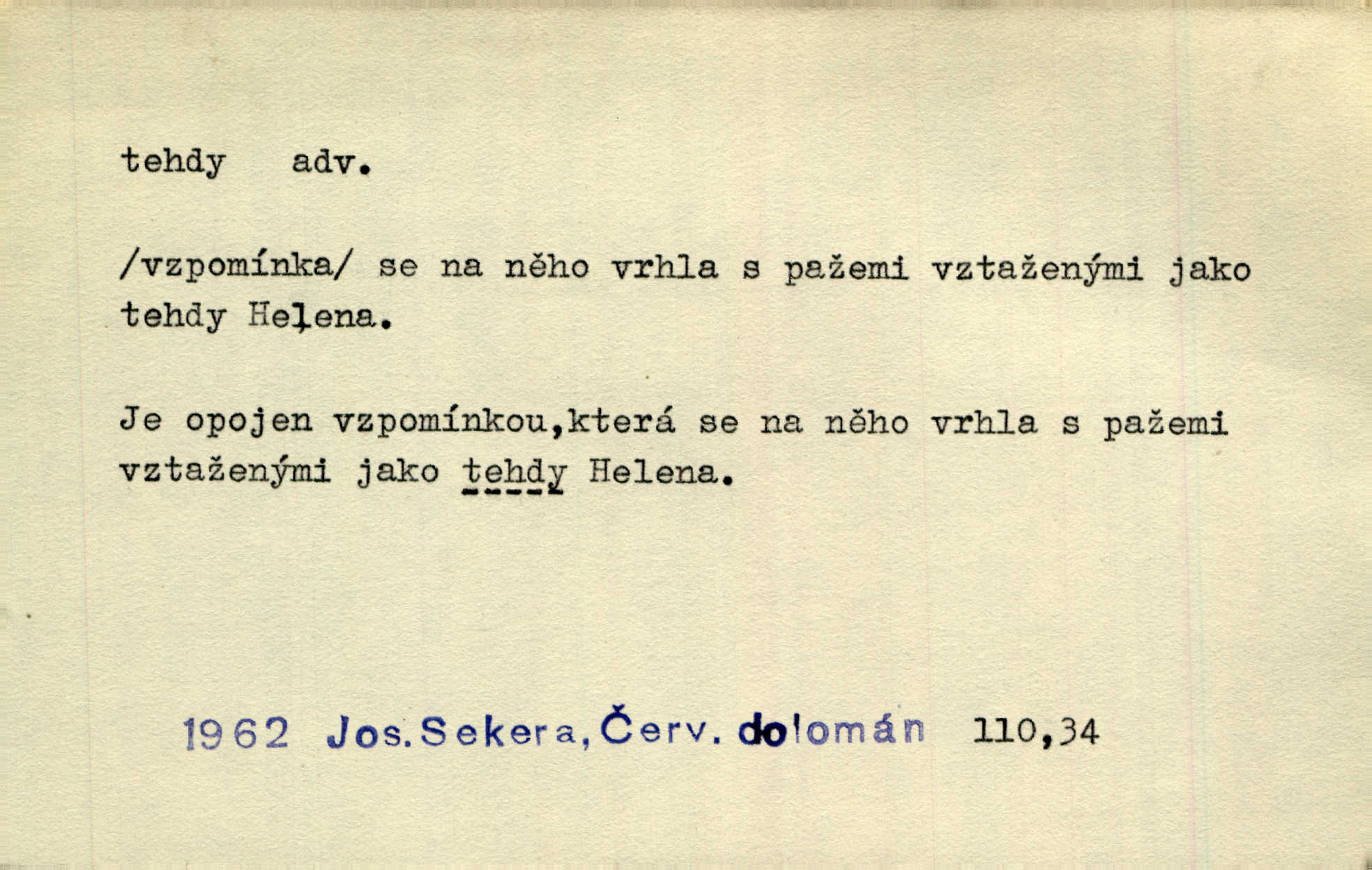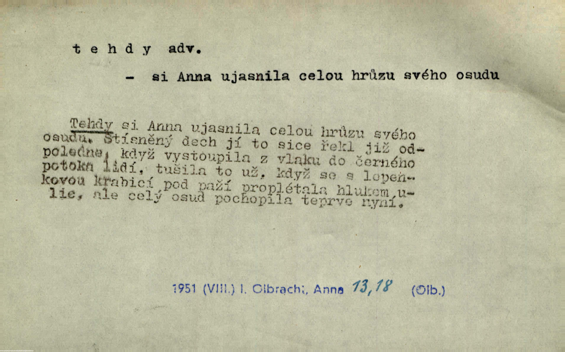 - tehda, tehdáž, tehdy (dial. tehdyvá; zř. tehdys) adv. v oné době, tenkrát, tehdy. Měl jsem tehda při tom prvním a posledním podání ruky jakousi směšnou úzkost. Šim. Jaro tehda záhy a utěšeně se otvíralo. Jir. Lotka byla mladší sestra Fannina, tehdá jedva šestnáctiletá. Klost. Když hrušky zrají, tehdáž se česati mají. Čel. Pražské předměstí právě tehdáž se ponejprve dláždilo. Win. Tehdáž měl jsem rozsáhlé již známosti se staršími i mladšími vlastenci. Ner. Sedlák Květ měl takových knih několik, a to tehdy už něco znamenalo. Třeb. Proč Ti píšu, Jene Maria? Proto, že jsem Tě tehdy miloval, když celý svět se mi ve chmurách jevil. Zey. Když se ti hry nejvíce chce, tehdy přestaň. Čel. Tehdy počaly se jednotlivé paprsky staré osvěty řecké a římské prodírati z rumu. Čech. Jen kdys tehdys mlhami prosvitne slunce. Třeb. To už není jak tehdyvá. Uh.