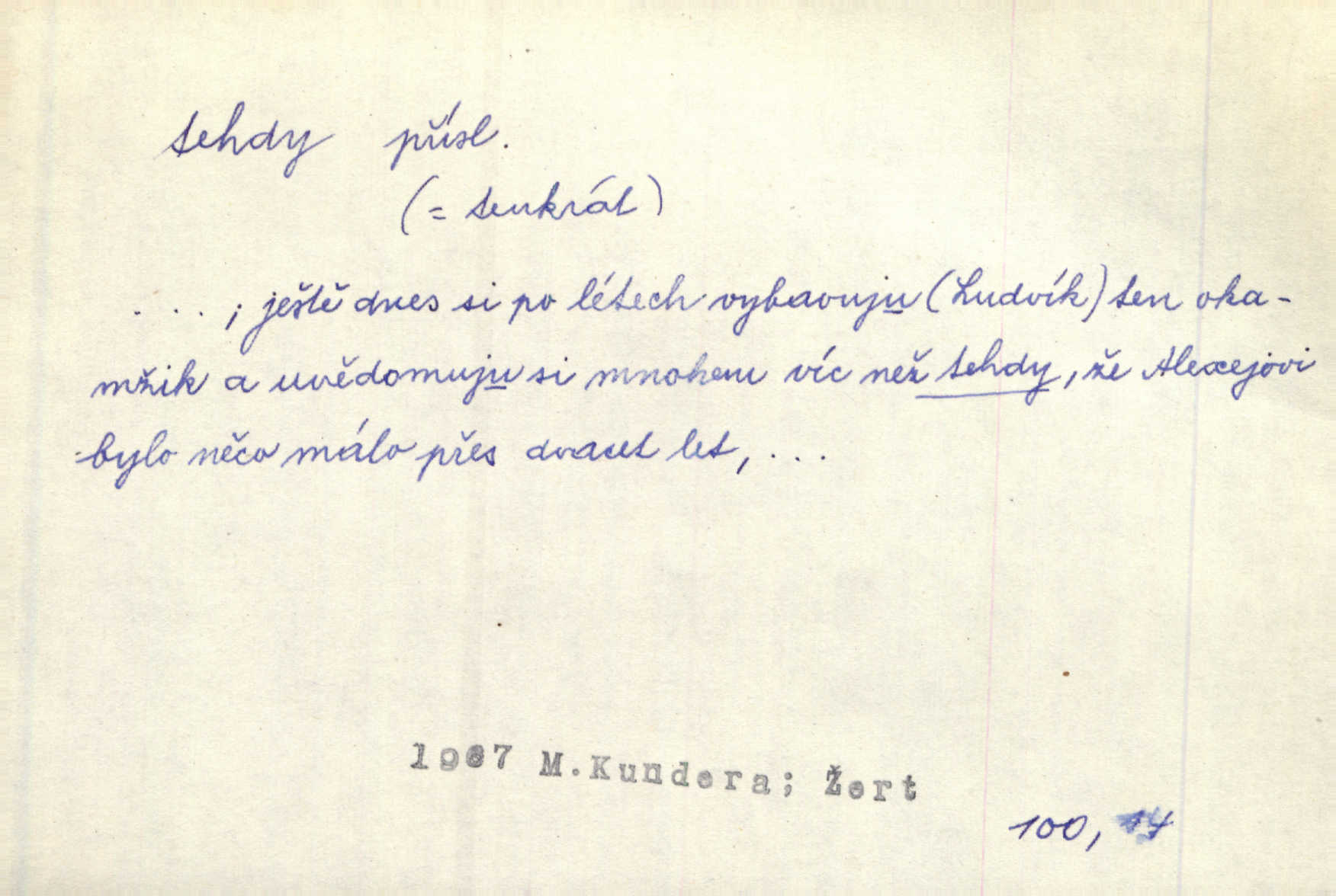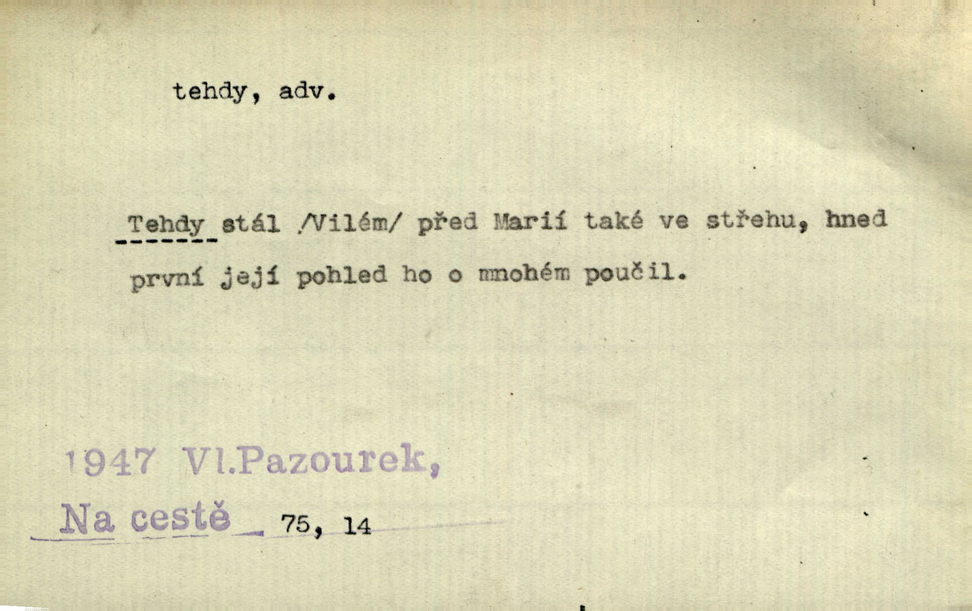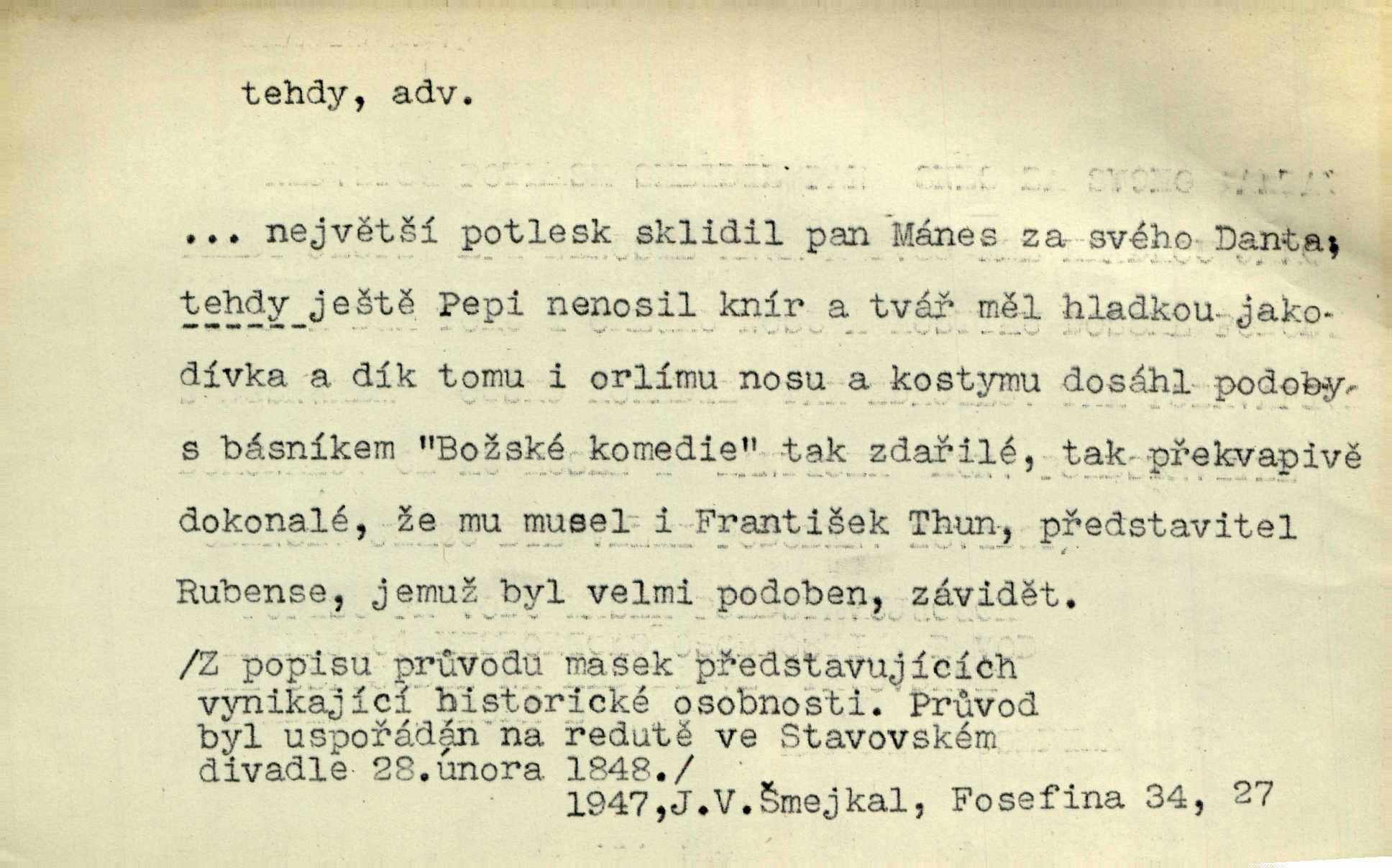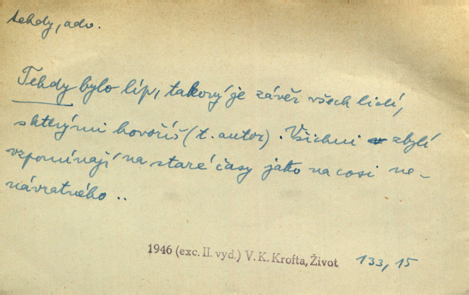- tehda, tehdáž, tehdy (dial. tehdyvá; zř. tehdys) adv. v oné době, tenkrát, tehdy. Měl jsem tehda při tom prvním a posledním podání ruky jakousi směšnou úzkost. Šim. Jaro tehda záhy a utěšeně se otvíralo. Jir. Lotka byla mladší sestra Fannina, tehdá jedva šestnáctiletá. Klost. Když hrušky zrají, tehdáž se česati mají. Čel. Pražské předměstí právě tehdáž se ponejprve dláždilo. Win. Tehdáž měl jsem rozsáhlé již známosti se staršími i mladšími vlastenci. Ner. Sedlák Květ měl takových knih několik, a to tehdy už něco znamenalo. Třeb. Proč Ti píšu, Jene Maria? Proto, že jsem Tě tehdy miloval, když celý svět se mi ve chmurách jevil. Zey. Když se ti hry nejvíce chce, tehdy přestaň. Čel. Tehdy počaly se jednotlivé paprsky staré osvěty řecké a římské prodírati z rumu. Čech. Jen kdys tehdys mlhami prosvitne slunce. Třeb. To už není jak tehdyvá. Uh.