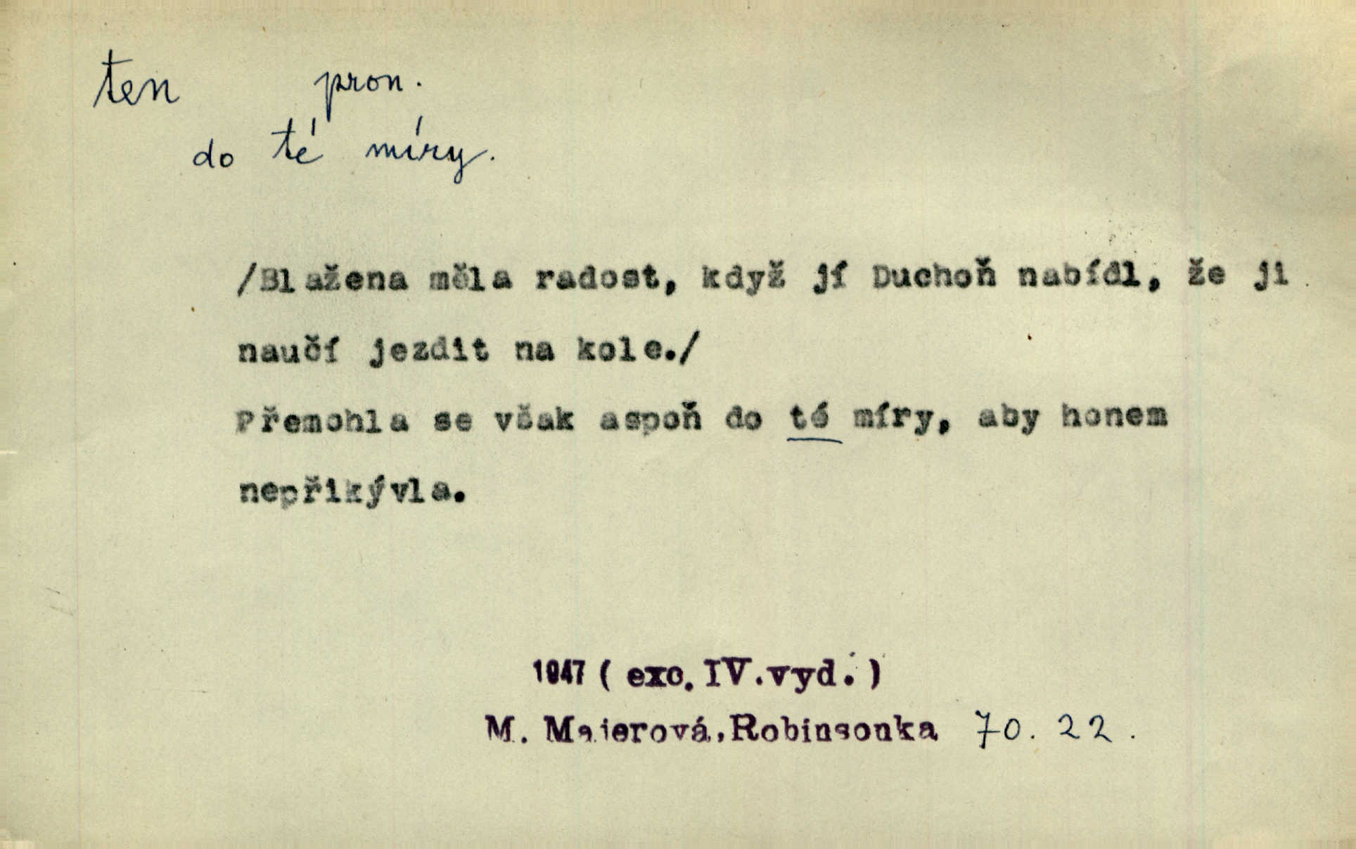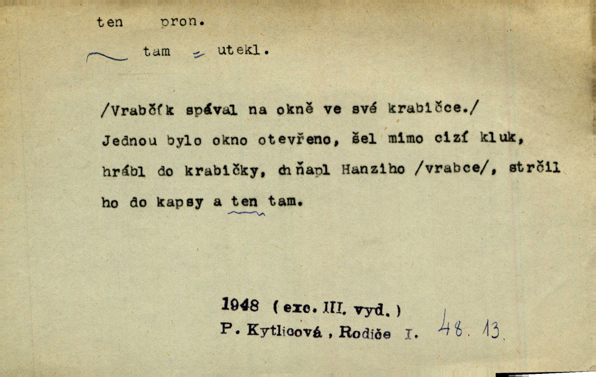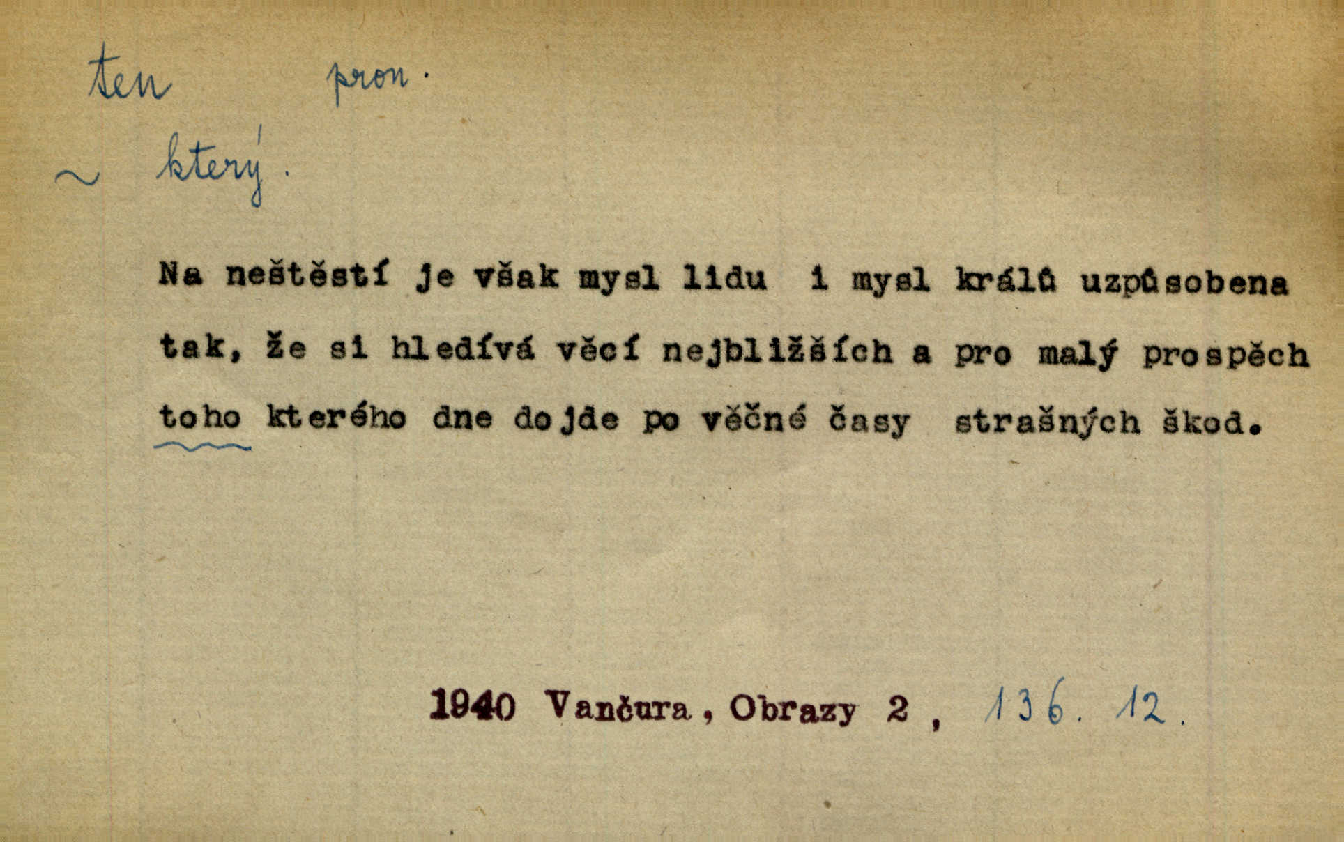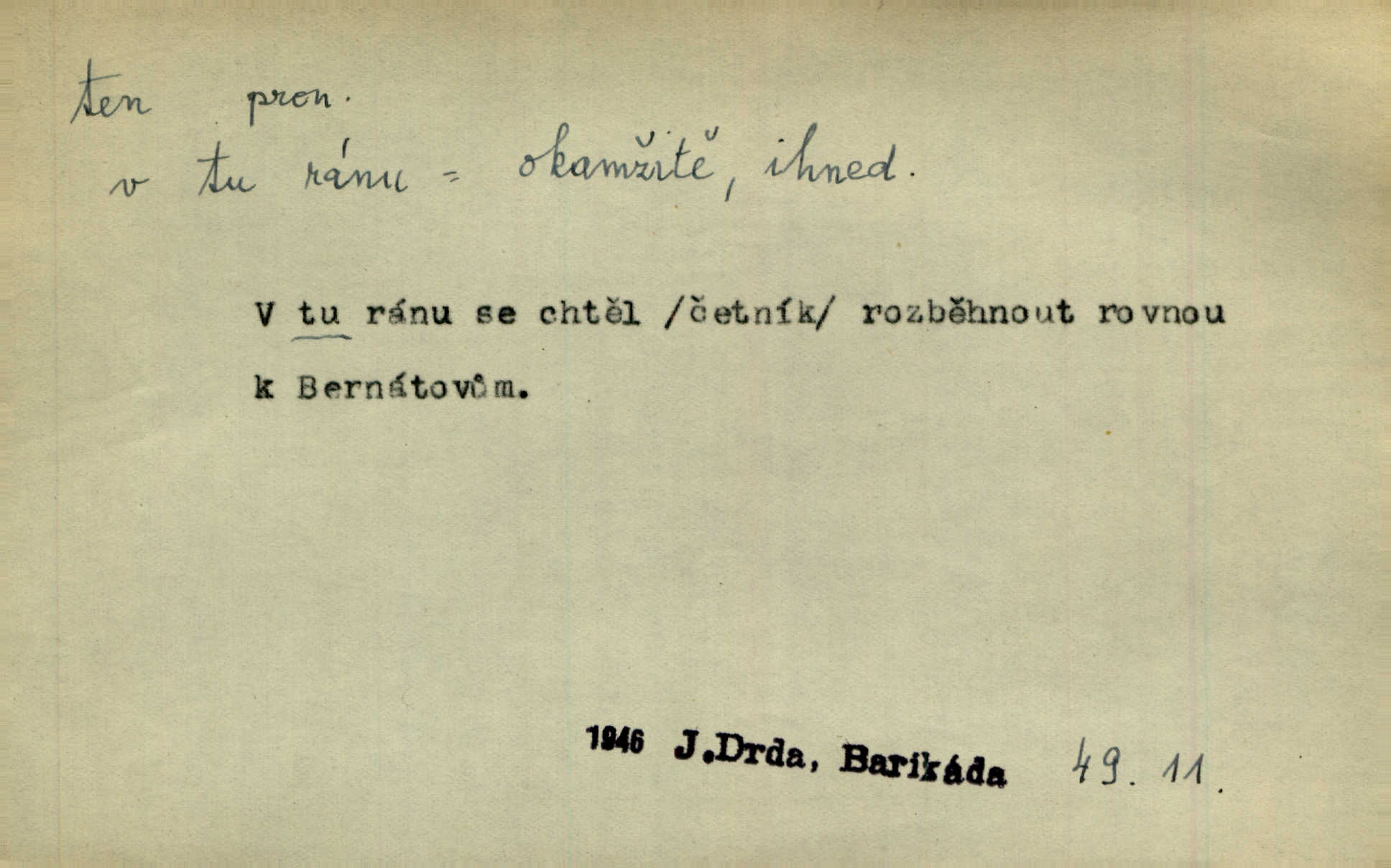 - ten (ta, to) zájm. ukaz. (kniž. poněk. zast. tenť, tentě, tenž, tenže) ukazuje na poblíž stojící n. přítomnou osobu n. věc. „Co jest? Kdo způsobil ten povyk?“ „Cizí rolník — ten tady!‘ odpovídalo několik mužů najednou. Vlastimil. Několik tisíc je tu shromážděného lidu — ti tu z Plzeňska, ti z Bechyňska, tam za nimi jsou Klatovští. Jir. „Myslím, že to je on — „Kdo?“ „Zajícův dub —“ Jir. Bílá se plachta větrem houpá. [Dívka:] „Rychlý to člůnek! blíž a blíže! To on, to on!“ Mácha. [Kněz nahlíží oknem do jizby:] Kolébka to byla, než to černé, co s ní splývalo, co to je? Jir. „Asi hodinu odtud [je osada], tou stranou,“ ukázal Petřík přes střechu. Schulz. To je naše maminka [při představování]. Šim. [Smrt klepe na dveře.] „Kdo to?“ ozval se kovář. Erb. D odkazuje na osobu n. věc, o kterých se mluvilo n. mluví n. které jsou známé. Na boulevart Montmartre je jedna čítárna. Sotvy jsem byl do čítárny té vešel, přiblížila se již přívětivá stařenka. Ner. Zavolali pana učitele, ten mrknuv do vysvědčení — neřekl nic … A. Mrš. Přisedl ke mně suplent Trhaný, ale ten byl celkem nemluva. Šim. Na obou bocích [vozu] visely soudky řetězy spjaté, a v těch bylo zboží. Win. Tak, jarní verše? Co s tím tretem? Ten otřepaný obsah znám … Mach. Tvrdil, že jednobarevní koně se hodí více k dílu, a Rakolubský to zas o bělostrakatých jistil. Jir. Promluv k němu slovo a bude to. Hál. Zná ji [píseň] pouze z doslechu a skoro ani to ne. A. Mrš. „Či byl z nás někdo opilý?“ „To ne!“ Ner. Je to voják a k tomu zdejší. Bozd. „Jste trochu botanik?“ „Ne, prosím, to nejsem.“ Baar. „Jemnostpane, a jak pak — ty ostatní ouly, ty nechají před farou?“ „A to tak, kde pak, aby mně ještě ty také pokácel.“ Jir. Ale že je pan Blanda proti tomu [tančení], jste vy taky proti tomu, to je to! Svob. Antonín se optal na bratra učitele, a bude-li se ženit. „Co tě napadá, ten a ženit.“ Jir. On snad byl toho rána první na svém místě. Merh. Gymnasium bylo té doby pětileté. Zel. V ten ráz rozsvětlilo se mu opět jasně najednou. Maj. Nahnul se k němu [světlu] neopatrně a v té chytly na něm šaty vtom. Herb. D odkazem zesiluje. Jsemť posud ten starý Hanuš z vysokých škol. Šmil. Roku třicátého šestého, když byla ta velká cholera, najímal jsem dělníky na pole. Šmil. Holka je někde s tím svým. K. Čap. To je ta obecní policie? Hanba! Ner. A tu konečně ves! Totě Skuhrov. Jir. Bij, prapore, jen bij, toť osud tvůj — bij dále! Ner. Dorotce se mnohdy i zdálo, přirovnala-li ho k hochům Haberským, že z nich nemá ani jeden tu postavu, ani tu jeho „výřečnost“. Svět. Když vesele prstem zaluskám, je věru v tom více šumu! Ner. D ukazuje na někoho n. něco dále n. předtím blíže určovaného n. rozlišovaného. Jenom ten jest v pravdě šťastný, kdo života užívá. Sab. Kdo na dvou stolicích místo si hledá, ten často na holou zemi sedá. Baar. Komu karty v ruce šustí, toho Pán bůh neopustí. Hol. Já za to nemohu, že tam je jen paprika a roštěná. Šim. Kdo nezahynul, tohož jméno nestojí v dějinách. Bozd. Co ona chce, to musejí v jeho domě všichni chtít. Rub. Co na srdci, to na jazyku. Šmil. Co člověk nerad slyší, tomu nevěří. Šmil. Co krok to deset mil. Erb. Čím takový starý hrnec navře, tím už až do smrti zapáchá. Baar. Co jsme si, to jsme si. Staš. [Matka] se za to před královnou styděla, že dcera její je tak líná. Erb. Nejprvé šlo mi o to, abych se na delší čas před pronásledovateli ukryl. Zey. Čím to, že nezmiňujete se mně o věci. Šmil. Rád jsem tomu byl, že jsem mladé jitro záhy obelstil. Heyd. Dejme tomu, že ne všecko zlé zde dotčené následovati bude z rozvedení sboru. Pal. Ta česť se mi musí dáti, že umím se o svém svátku okázati, kdo jsem. Šmil. Nevraživost na obou stranách vzrostla konečně tou měrou, až vypukla. Win. Bude povděčna, nalezne-li ženicha toho rázu, jak jsem Vám vypsala. Šmil. Srdce mně praví, že jest tomu tak, jak vypravovala. Šmil. Dějinami vnějšími rozumí se vylíčení toho, jak veliké území kdy zaujímal příslušný jazyk. Hujer. Liduška měla do sebe tu chybu, že byla náramně líná. Erb. Na hlavě měl takovou tu beranici, jež u předu končí štítkem. Rais. [Kloboučky] se nosí v Šitbořicích, Bojanovicích na té straně k Brnu; v Rakvicích, Bílovicích na té straně k Břeclavě. Herb. Ten den po svatém Josefu kráčí Hadam do Domažlic k soudu. Baar. Do Kobylího svolán byl poddaný lid — tu neděli po všech svatých. Herb. Přes to, že Krátkému patřil čtvrtlán, poslán byl na volnu. Herb. Mám za to, že Pražané nedají na sebe dlouho čekati. Jan. Nebyla s to promluviti jediného slova. V. Mrš. D u superlativu zdůrazňuje n. rozlišuje, často s citovým zabarvením. Dobře věděl, že si jinou nevezme než tu nejbohatší, nejpřednější, již on sám beztoho také mu vyhlídne. Svět. Začal tu nejtajemnější svou historii, o Lancutském. Jir. Každý to dobře ví, že i ten nejmenší dáreček z lásky je nejmilejší. Čel. Vyjel do Vratislavi s tou nejlepší. Jir. O pravdě této není a nemůže býti ani té nejmenší pochybnosti. Pal. Oči byly na ní také to nejnápadnější. Knap. Nic jiného by nebyl mohl dokázat, to přece ví i ten nejhloupější z nás. Med. Lepšího nemůže si ani ten nejlínější manžel přáti. Lier. D dodává vůbec expresivního zabarvení. Léta letoucí ležela jako ten Lazar a nic ji netěšilo. Poláč. Vidívám Levý Hradec den co den, i ten Řivnáč, jak se za ním mračí. Třeb. „Kdy dojedeme na tu Rychnavu?“ V tom „tu“ bylo cosi nevážného. Jir. Raději si jídla utrhly, jen aby jim zbyl nějaký ten krejcar na mýdlo. Svět.