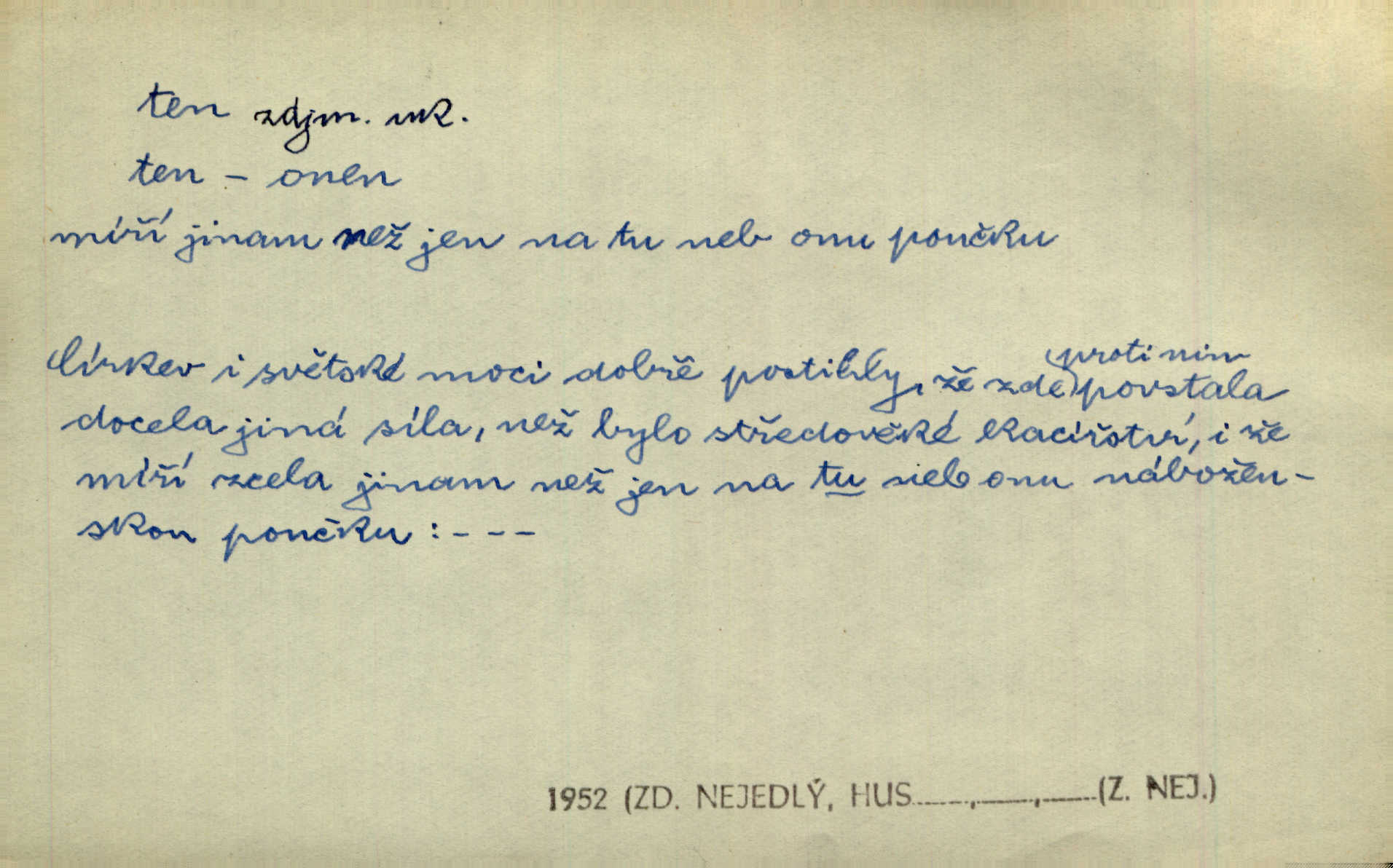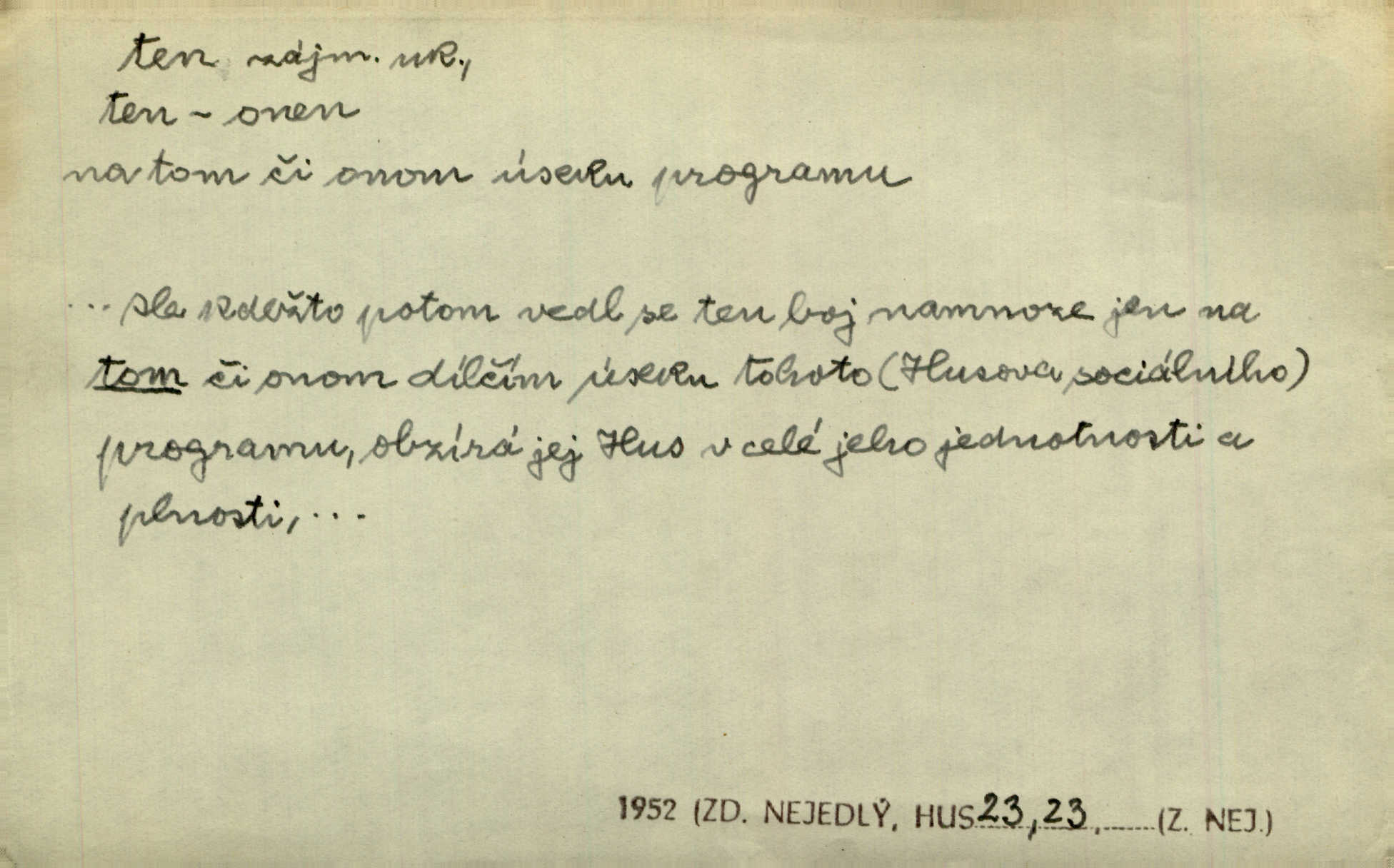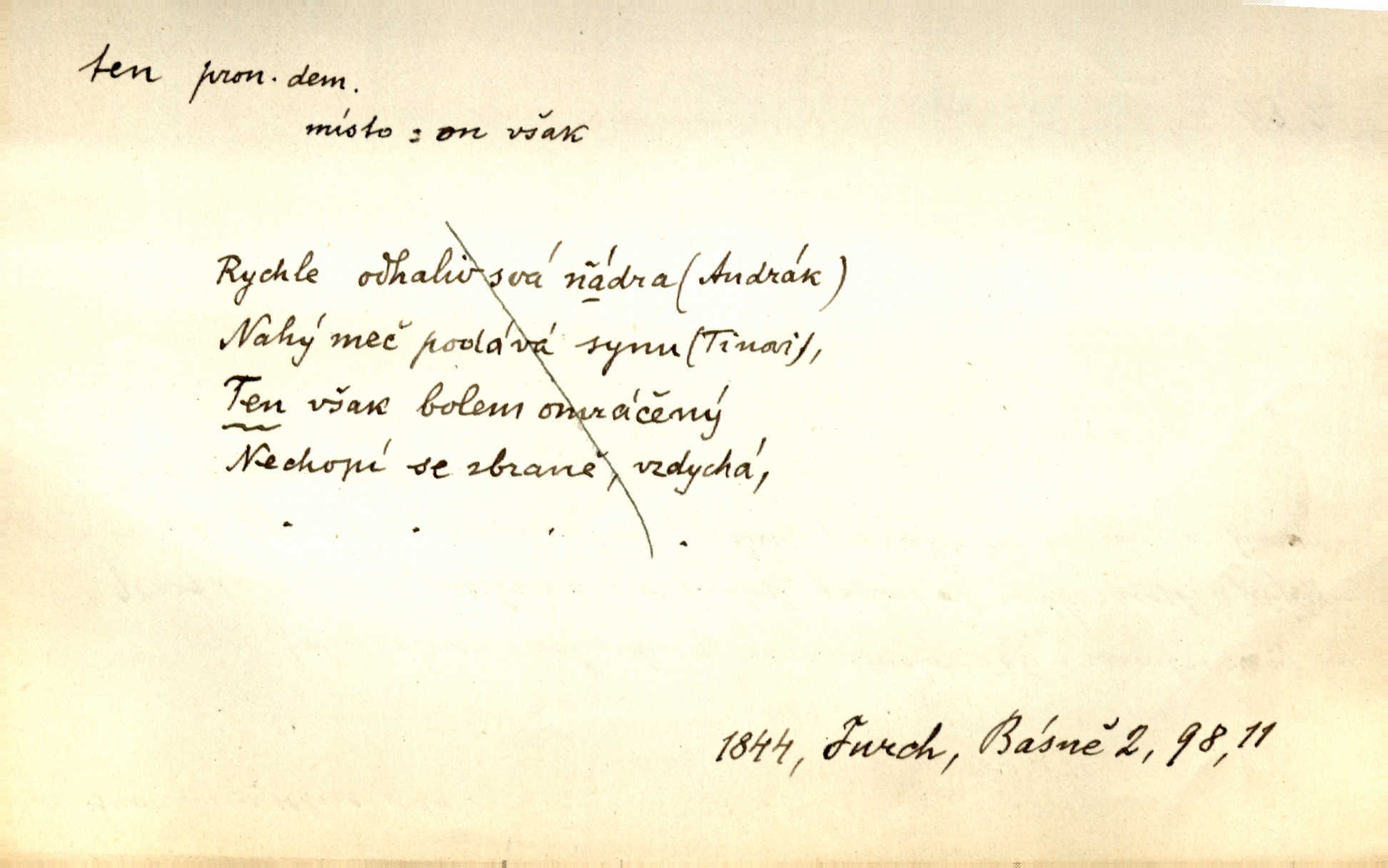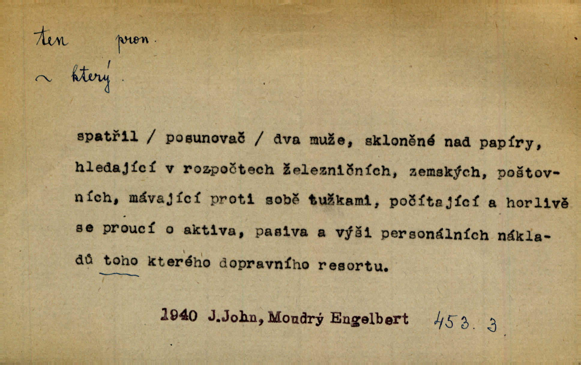 - ten (ta, to) zájm. ukaz. (kniž. poněk. zast. tenť, tentě, tenž, tenže) ukazuje na poblíž stojící n. přítomnou osobu n. věc. „Co jest? Kdo způsobil ten povyk?“ „Cizí rolník — ten tady!‘ odpovídalo několik mužů najednou. Vlastimil. Několik tisíc je tu shromážděného lidu — ti tu z Plzeňska, ti z Bechyňska, tam za nimi jsou Klatovští. Jir. „Myslím, že to je on — „Kdo?“ „Zajícův dub —“ Jir. Bílá se plachta větrem houpá. [Dívka:] „Rychlý to člůnek! blíž a blíže! To on, to on!“ Mácha. [Kněz nahlíží oknem do jizby:] Kolébka to byla, než to černé, co s ní splývalo, co to je? Jir. „Asi hodinu odtud [je osada], tou stranou,“ ukázal Petřík přes střechu. Schulz. To je naše maminka [při představování]. Šim. [Smrt klepe na dveře.] „Kdo to?“ ozval se kovář. Erb. D odkazuje na osobu n. věc, o kterých se mluvilo n. mluví n. které jsou známé. Na boulevart Montmartre je jedna čítárna. Sotvy jsem byl do čítárny té vešel, přiblížila se již přívětivá stařenka. Ner. Zavolali pana učitele, ten mrknuv do vysvědčení — neřekl nic … A. Mrš. Přisedl ke mně suplent Trhaný, ale ten byl celkem nemluva. Šim. Na obou bocích [vozu] visely soudky řetězy spjaté, a v těch bylo zboží. Win. Tak, jarní verše? Co s tím tretem? Ten otřepaný obsah znám … Mach. Tvrdil, že jednobarevní koně se hodí více k dílu, a Rakolubský to zas o bělostrakatých jistil. Jir. Promluv k němu slovo a bude to. Hál. Zná ji [píseň] pouze z doslechu a skoro ani to ne. A. Mrš. „Či byl z nás někdo opilý?“ „To ne!“ Ner. Je to voják a k tomu zdejší. Bozd. „Jste trochu botanik?“ „Ne, prosím, to nejsem.“ Baar. „Jemnostpane, a jak pak — ty ostatní ouly, ty nechají před farou?“ „A to tak, kde pak, aby mně ještě ty také pokácel.“ Jir. Ale že je pan Blanda proti tomu [tančení], jste vy taky proti tomu, to je to! Svob. Antonín se optal na bratra učitele, a bude-li se ženit. „Co tě napadá, ten a ženit.“ Jir. On snad byl toho rána první na svém místě. Merh. Gymnasium bylo té doby pětileté. Zel. V ten ráz rozsvětlilo se mu opět jasně najednou. Maj. Nahnul se k němu [světlu] neopatrně a v té chytly na něm šaty vtom. Herb. D odkazem zesiluje. Jsemť posud ten starý Hanuš z vysokých škol. Šmil. Roku třicátého šestého, když byla ta velká cholera, najímal jsem dělníky na pole. Šmil. Holka je někde s tím svým. K. Čap. To je ta obecní policie? Hanba! Ner. A tu konečně ves! Totě Skuhrov. Jir. Bij, prapore, jen bij, toť osud tvůj — bij dále! Ner. Dorotce se mnohdy i zdálo, přirovnala-li ho k hochům Haberským, že z nich nemá ani jeden tu postavu, ani tu jeho „výřečnost“. Svět. Když vesele prstem zaluskám, je věru v tom více šumu! Ner. D ukazuje na někoho n. něco dále n. předtím blíže určovaného n. rozlišovaného. Jenom ten jest v pravdě šťastný, kdo života užívá. Sab. Kdo na dvou stolicích místo si hledá, ten často na holou zemi sedá. Baar. Komu karty v ruce šustí, toho Pán bůh neopustí. Hol. Já za to nemohu, že tam je jen paprika a roštěná. Šim. Kdo nezahynul, tohož jméno nestojí v dějinách. Bozd. Co ona chce, to musejí v jeho domě všichni chtít. Rub. Co na srdci, to na jazyku. Šmil. Co člověk nerad slyší, tomu nevěří. Šmil. Co krok to deset mil. Erb. Čím takový starý hrnec navře, tím už až do smrti zapáchá. Baar. Co jsme si, to jsme si. Staš. [Matka] se za to před královnou styděla, že dcera její je tak líná. Erb. Nejprvé šlo mi o to, abych se na delší čas před pronásledovateli ukryl. Zey. Čím to, že nezmiňujete se mně o věci. Šmil. Rád jsem tomu byl, že jsem mladé jitro záhy obelstil. Heyd. Dejme tomu, že ne všecko zlé zde dotčené následovati bude z rozvedení sboru. Pal. Ta česť se mi musí dáti, že umím se o svém svátku okázati, kdo jsem. Šmil. Nevraživost na obou stranách vzrostla konečně tou měrou, až vypukla. Win. Bude povděčna, nalezne-li ženicha toho rázu, jak jsem Vám vypsala. Šmil. Srdce mně praví, že jest tomu tak, jak vypravovala. Šmil. Dějinami vnějšími rozumí se vylíčení toho, jak veliké území kdy zaujímal příslušný jazyk. Hujer. Liduška měla do sebe tu chybu, že byla náramně líná. Erb. Na hlavě měl takovou tu beranici, jež u předu končí štítkem. Rais. [Kloboučky] se nosí v Šitbořicích, Bojanovicích na té straně k Brnu; v Rakvicích, Bílovicích na té straně k Břeclavě. Herb. Ten den po svatém Josefu kráčí Hadam do Domažlic k soudu. Baar. Do Kobylího svolán byl poddaný lid — tu neděli po všech svatých. Herb. Přes to, že Krátkému patřil čtvrtlán, poslán byl na volnu. Herb. Mám za to, že Pražané nedají na sebe dlouho čekati. Jan. Nebyla s to promluviti jediného slova. V. Mrš. D u superlativu zdůrazňuje n. rozlišuje, často s citovým zabarvením. Dobře věděl, že si jinou nevezme než tu nejbohatší, nejpřednější, již on sám beztoho také mu vyhlídne. Svět. Začal tu nejtajemnější svou historii, o Lancutském. Jir. Každý to dobře ví, že i ten nejmenší dáreček z lásky je nejmilejší. Čel. Vyjel do Vratislavi s tou nejlepší. Jir. O pravdě této není a nemůže býti ani té nejmenší pochybnosti. Pal. Oči byly na ní také to nejnápadnější. Knap. Nic jiného by nebyl mohl dokázat, to přece ví i ten nejhloupější z nás. Med. Lepšího nemůže si ani ten nejlínější manžel přáti. Lier. D dodává vůbec expresivního zabarvení. Léta letoucí ležela jako ten Lazar a nic ji netěšilo. Poláč. Vidívám Levý Hradec den co den, i ten Řivnáč, jak se za ním mračí. Třeb. „Kdy dojedeme na tu Rychnavu?“ V tom „tu“ bylo cosi nevážného. Jir. Raději si jídla utrhly, jen aby jim zbyl nějaký ten krejcar na mýdlo. Svět.