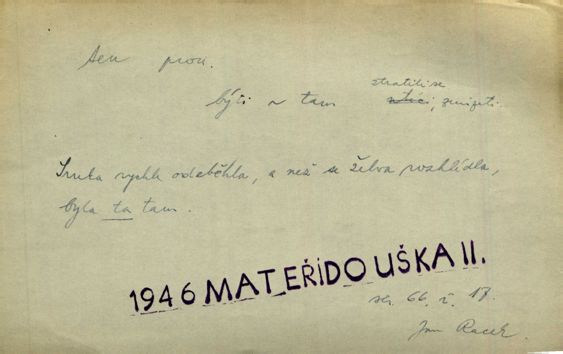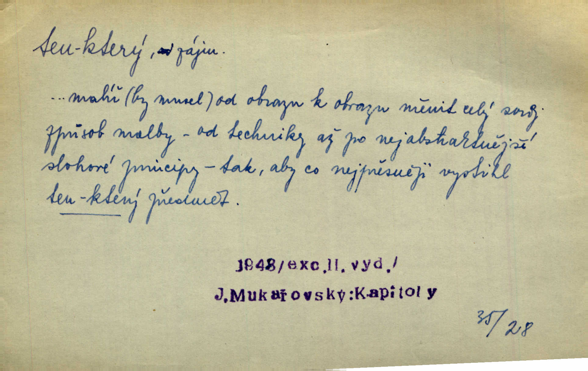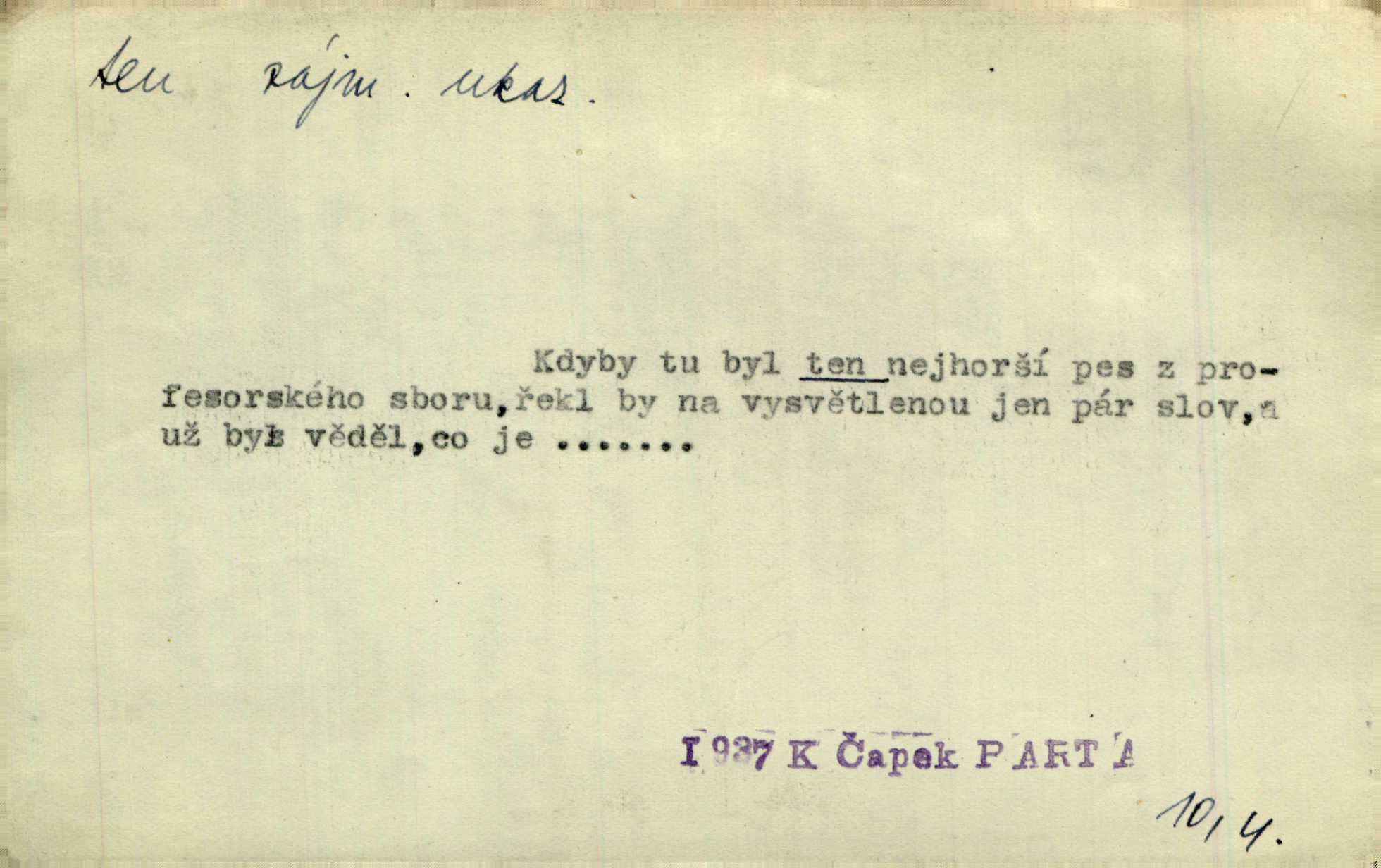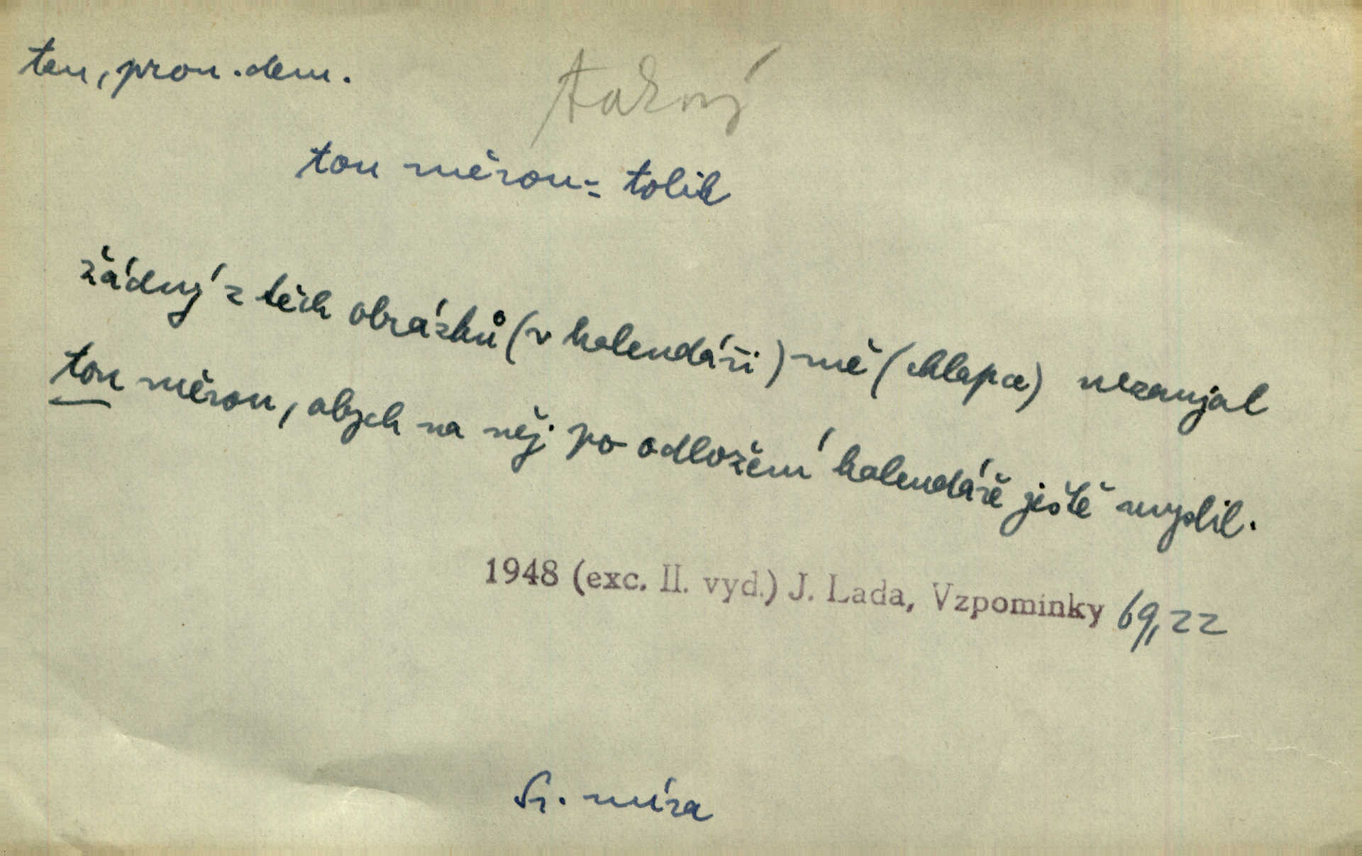 - ten (ta, to) zájm. ukaz. (kniž. poněk. zast. tenť, tentě, tenž, tenže) ukazuje na poblíž stojící n. přítomnou osobu n. věc. „Co jest? Kdo způsobil ten povyk?“ „Cizí rolník — ten tady!‘ odpovídalo několik mužů najednou. Vlastimil. Několik tisíc je tu shromážděného lidu — ti tu z Plzeňska, ti z Bechyňska, tam za nimi jsou Klatovští. Jir. „Myslím, že to je on — „Kdo?“ „Zajícův dub —“ Jir. Bílá se plachta větrem houpá. [Dívka:] „Rychlý to člůnek! blíž a blíže! To on, to on!“ Mácha. [Kněz nahlíží oknem do jizby:] Kolébka to byla, než to černé, co s ní splývalo, co to je? Jir. „Asi hodinu odtud [je osada], tou stranou,“ ukázal Petřík přes střechu. Schulz. To je naše maminka [při představování]. Šim. [Smrt klepe na dveře.] „Kdo to?“ ozval se kovář. Erb. D odkazuje na osobu n. věc, o kterých se mluvilo n. mluví n. které jsou známé. Na boulevart Montmartre je jedna čítárna. Sotvy jsem byl do čítárny té vešel, přiblížila se již přívětivá stařenka. Ner. Zavolali pana učitele, ten mrknuv do vysvědčení — neřekl nic … A. Mrš. Přisedl ke mně suplent Trhaný, ale ten byl celkem nemluva. Šim. Na obou bocích [vozu] visely soudky řetězy spjaté, a v těch bylo zboží. Win. Tak, jarní verše? Co s tím tretem? Ten otřepaný obsah znám … Mach. Tvrdil, že jednobarevní koně se hodí více k dílu, a Rakolubský to zas o bělostrakatých jistil. Jir. Promluv k němu slovo a bude to. Hál. Zná ji [píseň] pouze z doslechu a skoro ani to ne. A. Mrš. „Či byl z nás někdo opilý?“ „To ne!“ Ner. Je to voják a k tomu zdejší. Bozd. „Jste trochu botanik?“ „Ne, prosím, to nejsem.“ Baar. „Jemnostpane, a jak pak — ty ostatní ouly, ty nechají před farou?“ „A to tak, kde pak, aby mně ještě ty také pokácel.“ Jir. Ale že je pan Blanda proti tomu [tančení], jste vy taky proti tomu, to je to! Svob. Antonín se optal na bratra učitele, a bude-li se ženit. „Co tě napadá, ten a ženit.“ Jir. On snad byl toho rána první na svém místě. Merh. Gymnasium bylo té doby pětileté. Zel. V ten ráz rozsvětlilo se mu opět jasně najednou. Maj. Nahnul se k němu [světlu] neopatrně a v té chytly na něm šaty vtom. Herb. D odkazem zesiluje. Jsemť posud ten starý Hanuš z vysokých škol. Šmil. Roku třicátého šestého, když byla ta velká cholera, najímal jsem dělníky na pole. Šmil. Holka je někde s tím svým. K. Čap. To je ta obecní policie? Hanba! Ner. A tu konečně ves! Totě Skuhrov. Jir. Bij, prapore, jen bij, toť osud tvůj — bij dále! Ner. Dorotce se mnohdy i zdálo, přirovnala-li ho k hochům Haberským, že z nich nemá ani jeden tu postavu, ani tu jeho „výřečnost“. Svět. Když vesele prstem zaluskám, je věru v tom více šumu! Ner. D ukazuje na někoho n. něco dále n. předtím blíže určovaného n. rozlišovaného. Jenom ten jest v pravdě šťastný, kdo života užívá. Sab. Kdo na dvou stolicích místo si hledá, ten často na holou zemi sedá. Baar. Komu karty v ruce šustí, toho Pán bůh neopustí. Hol. Já za to nemohu, že tam je jen paprika a roštěná. Šim. Kdo nezahynul, tohož jméno nestojí v dějinách. Bozd. Co ona chce, to musejí v jeho domě všichni chtít. Rub. Co na srdci, to na jazyku. Šmil. Co člověk nerad slyší, tomu nevěří. Šmil. Co krok to deset mil. Erb. Čím takový starý hrnec navře, tím už až do smrti zapáchá. Baar. Co jsme si, to jsme si. Staš. [Matka] se za to před královnou styděla, že dcera její je tak líná. Erb. Nejprvé šlo mi o to, abych se na delší čas před pronásledovateli ukryl. Zey. Čím to, že nezmiňujete se mně o věci. Šmil. Rád jsem tomu byl, že jsem mladé jitro záhy obelstil. Heyd. Dejme tomu, že ne všecko zlé zde dotčené následovati bude z rozvedení sboru. Pal. Ta česť se mi musí dáti, že umím se o svém svátku okázati, kdo jsem. Šmil. Nevraživost na obou stranách vzrostla konečně tou měrou, až vypukla. Win. Bude povděčna, nalezne-li ženicha toho rázu, jak jsem Vám vypsala. Šmil. Srdce mně praví, že jest tomu tak, jak vypravovala. Šmil. Dějinami vnějšími rozumí se vylíčení toho, jak veliké území kdy zaujímal příslušný jazyk. Hujer. Liduška měla do sebe tu chybu, že byla náramně líná. Erb. Na hlavě měl takovou tu beranici, jež u předu končí štítkem. Rais. [Kloboučky] se nosí v Šitbořicích, Bojanovicích na té straně k Brnu; v Rakvicích, Bílovicích na té straně k Břeclavě. Herb. Ten den po svatém Josefu kráčí Hadam do Domažlic k soudu. Baar. Do Kobylího svolán byl poddaný lid — tu neděli po všech svatých. Herb. Přes to, že Krátkému patřil čtvrtlán, poslán byl na volnu. Herb. Mám za to, že Pražané nedají na sebe dlouho čekati. Jan. Nebyla s to promluviti jediného slova. V. Mrš. D u superlativu zdůrazňuje n. rozlišuje, často s citovým zabarvením. Dobře věděl, že si jinou nevezme než tu nejbohatší, nejpřednější, již on sám beztoho také mu vyhlídne. Svět. Začal tu nejtajemnější svou historii, o Lancutském. Jir. Každý to dobře ví, že i ten nejmenší dáreček z lásky je nejmilejší. Čel. Vyjel do Vratislavi s tou nejlepší. Jir. O pravdě této není a nemůže býti ani té nejmenší pochybnosti. Pal. Oči byly na ní také to nejnápadnější. Knap. Nic jiného by nebyl mohl dokázat, to přece ví i ten nejhloupější z nás. Med. Lepšího nemůže si ani ten nejlínější manžel přáti. Lier. D dodává vůbec expresivního zabarvení. Léta letoucí ležela jako ten Lazar a nic ji netěšilo. Poláč. Vidívám Levý Hradec den co den, i ten Řivnáč, jak se za ním mračí. Třeb. „Kdy dojedeme na tu Rychnavu?“ V tom „tu“ bylo cosi nevážného. Jir. Raději si jídla utrhly, jen aby jim zbyl nějaký ten krejcar na mýdlo. Svět.