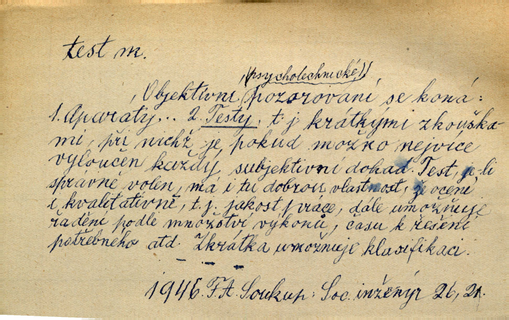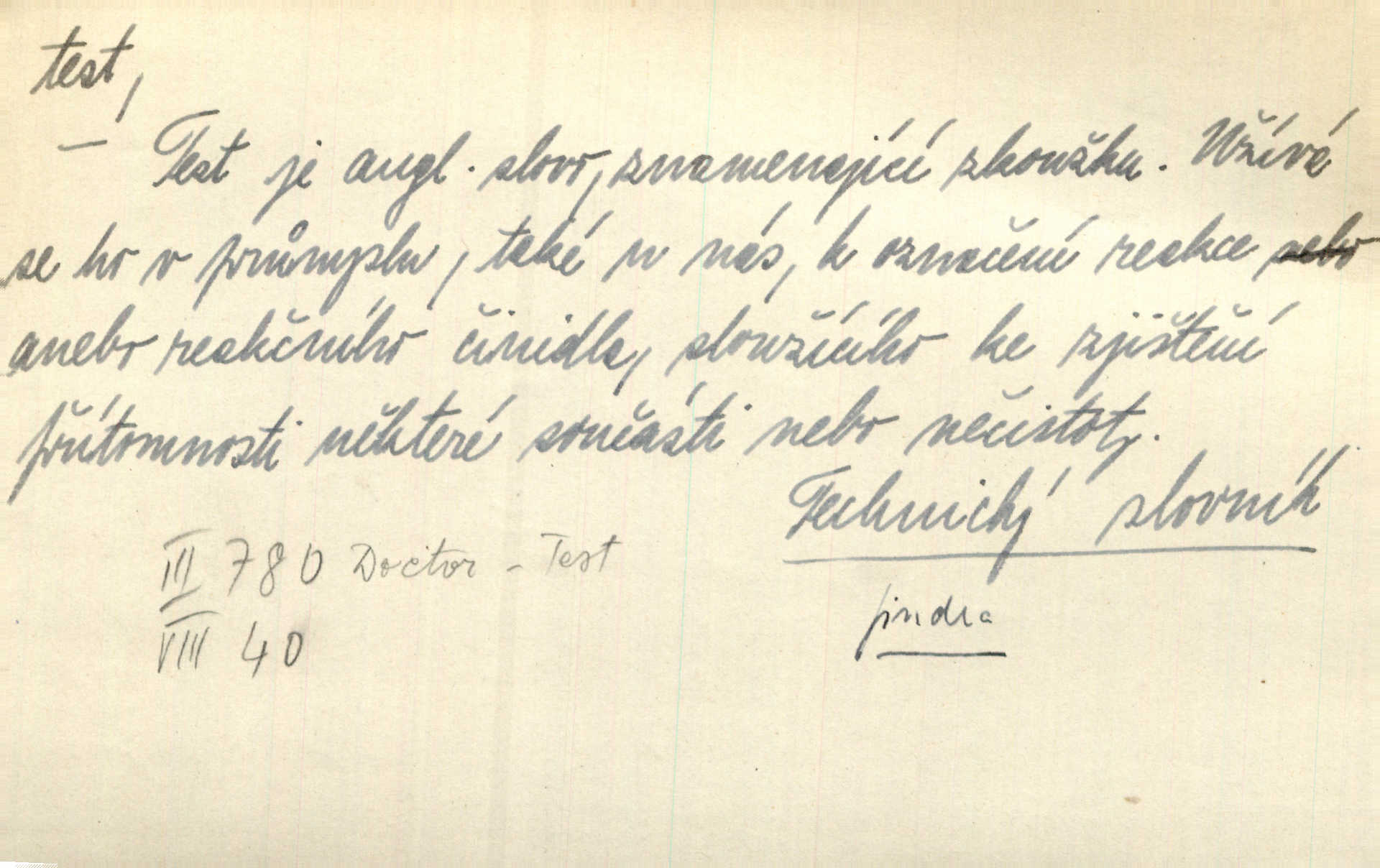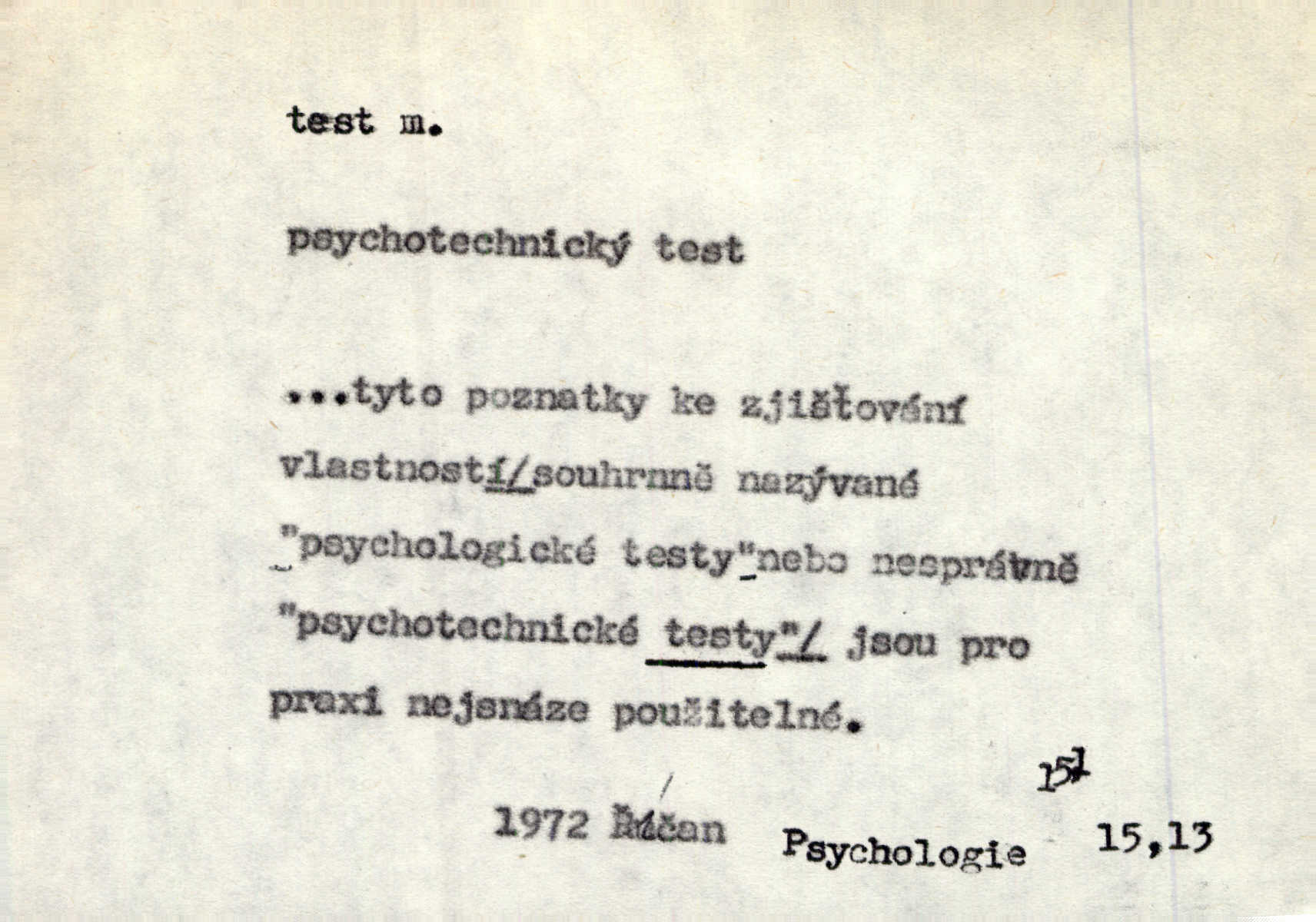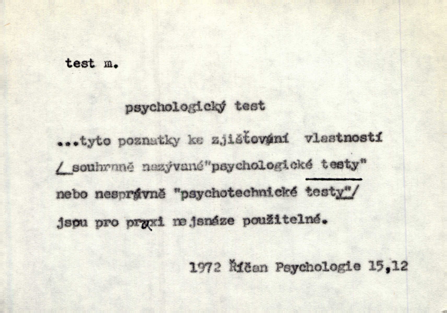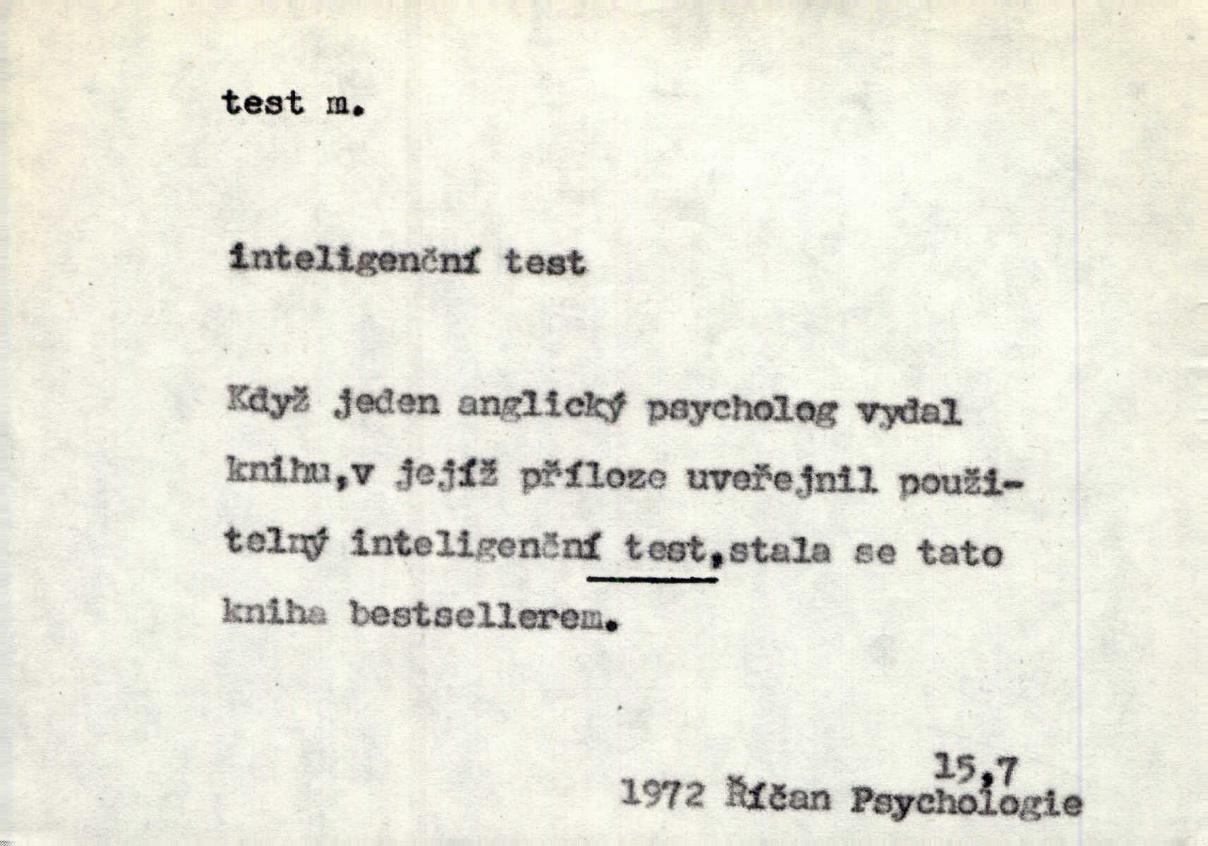 - test, -u m. psych., škol. druh zkoušky, kterou se měřil domněle stupeň inteligence n. zjišťovaly vědomosti. Tech. (v průmyslu) zkouška materiálu, jíž se zjišťuje přítomnost některé součásti n. nečistoty. Biol. test bakteriální stanovení určitého znaku n. charakteristické skupiny znaků určitého mikroba. Práv. potvrzení, osvědčení, zprav. o návštěvě přednášek (na vysoké škole), kursů a pod.