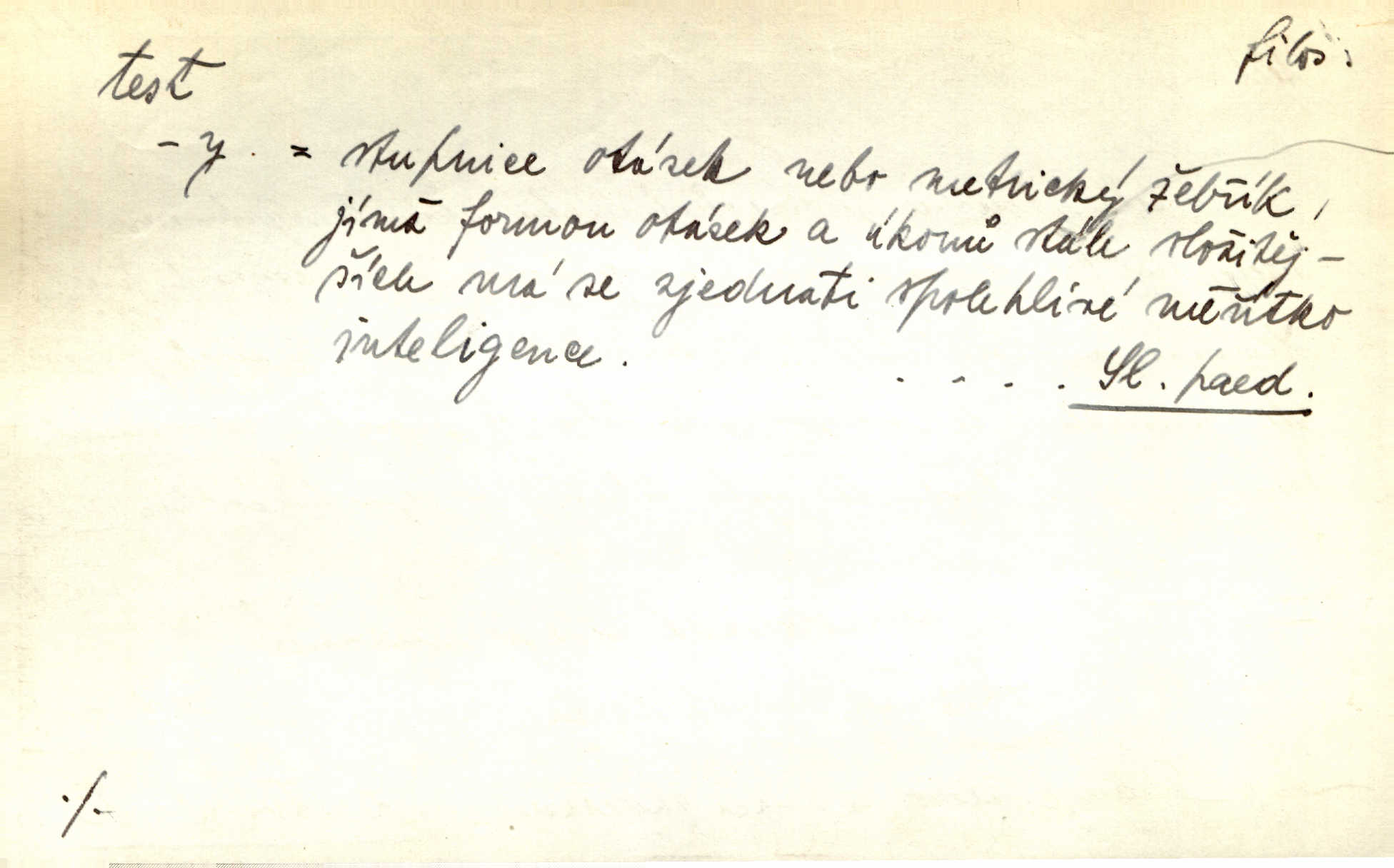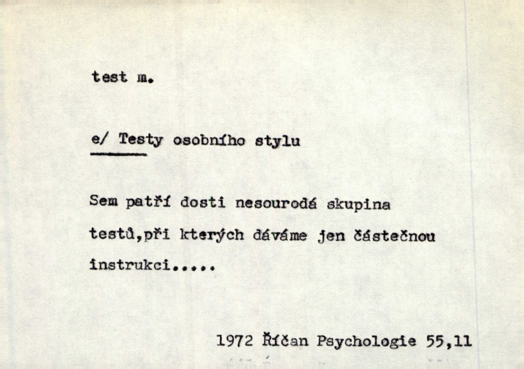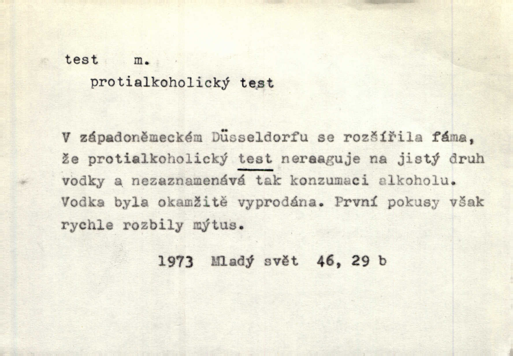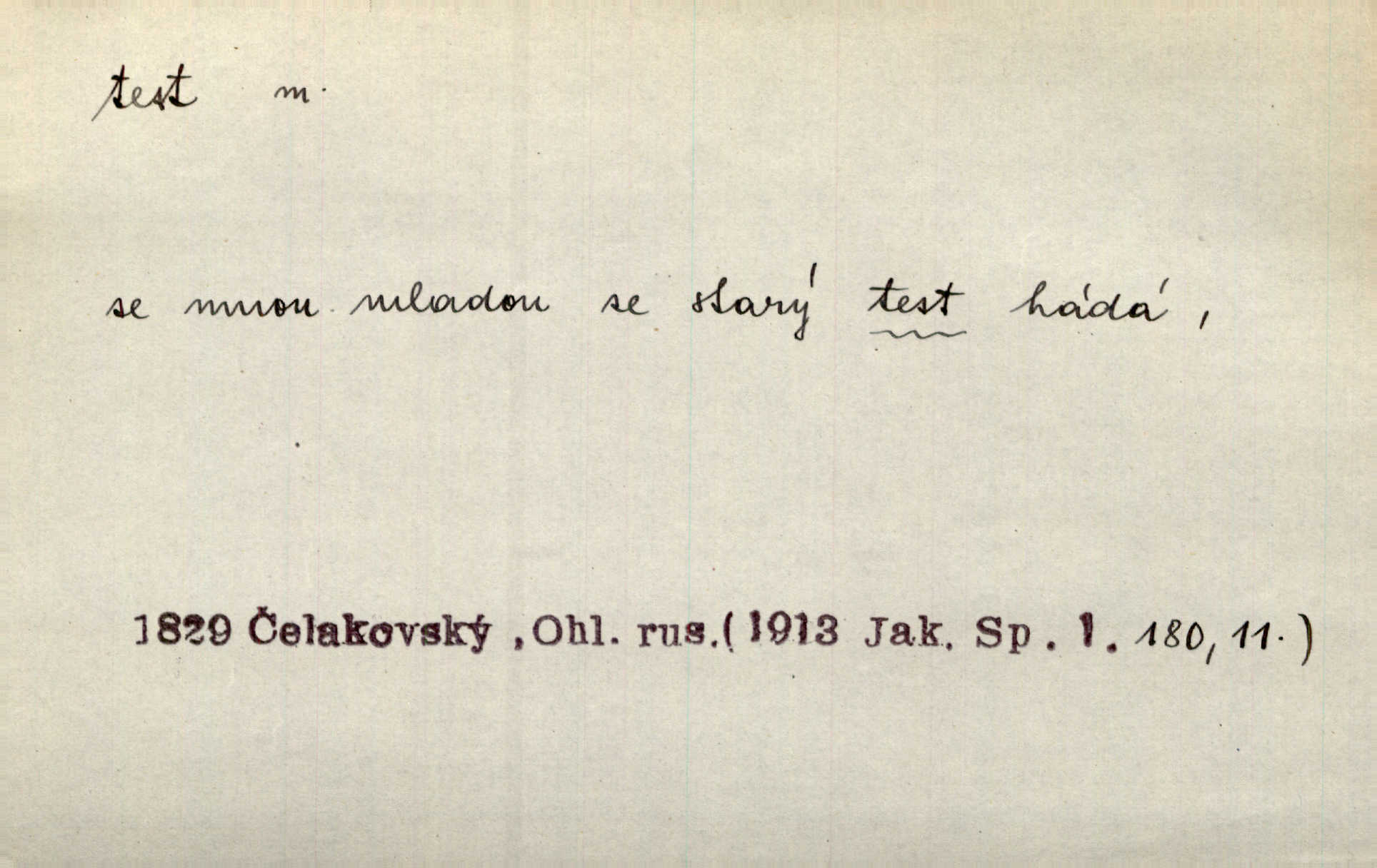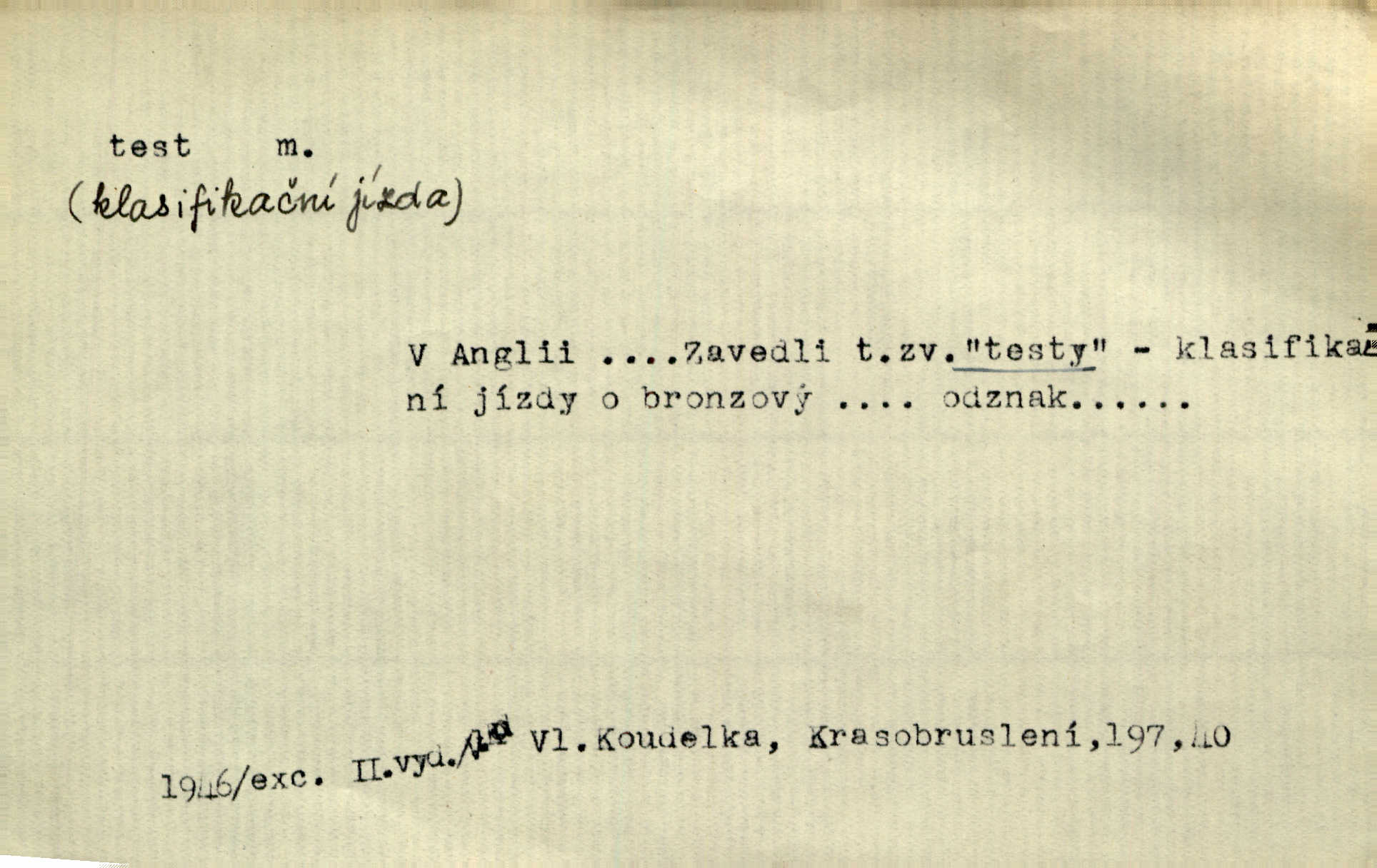- test, -u m. psych., škol. druh zkoušky, kterou se měřil domněle stupeň inteligence n. zjišťovaly vědomosti. Tech. (v průmyslu) zkouška materiálu, jíž se zjišťuje přítomnost některé součásti n. nečistoty. Biol. test bakteriální stanovení určitého znaku n. charakteristické skupiny znaků určitého mikroba. Práv. potvrzení, osvědčení, zprav. o návštěvě přednášek (na vysoké škole), kursů a pod.