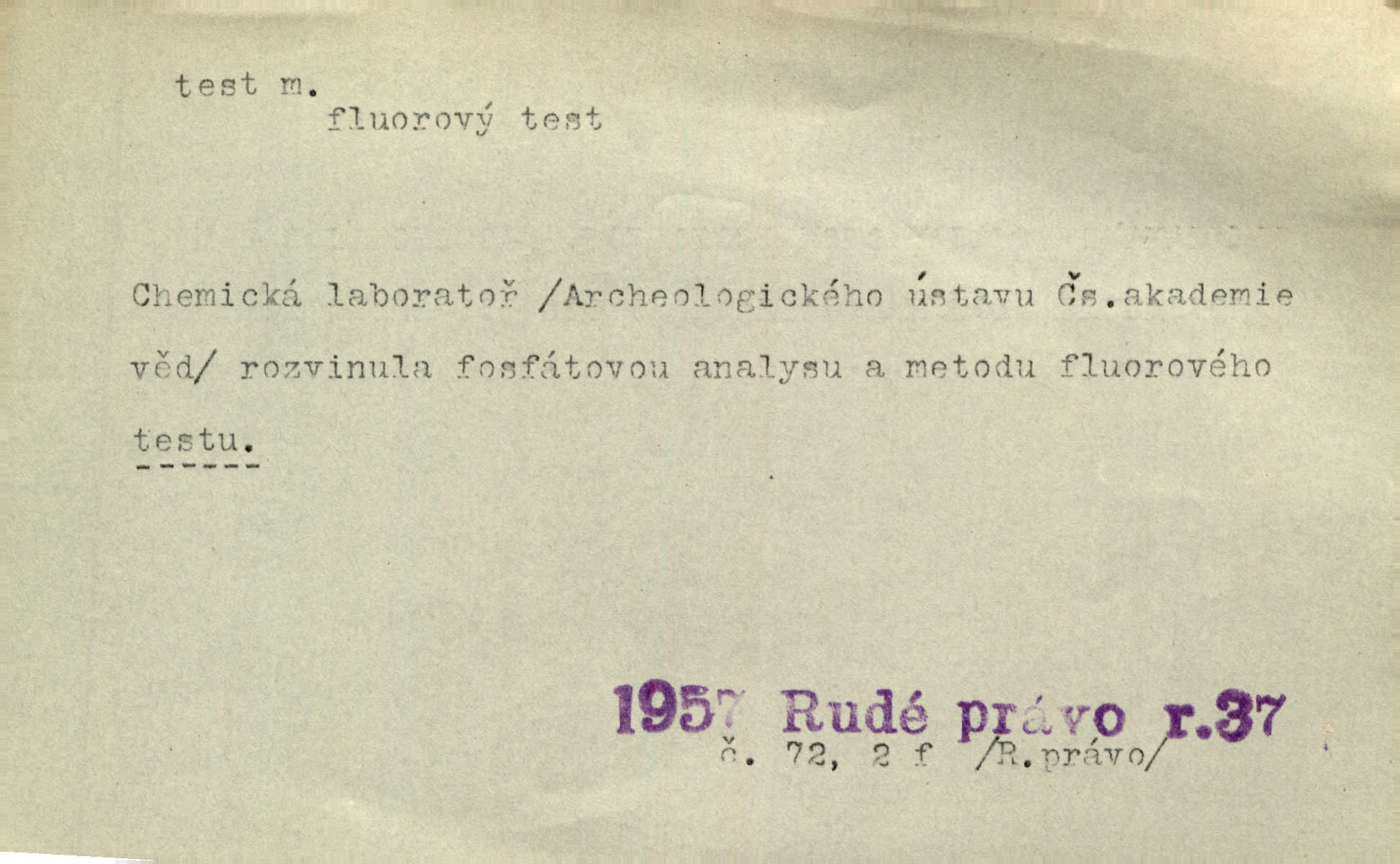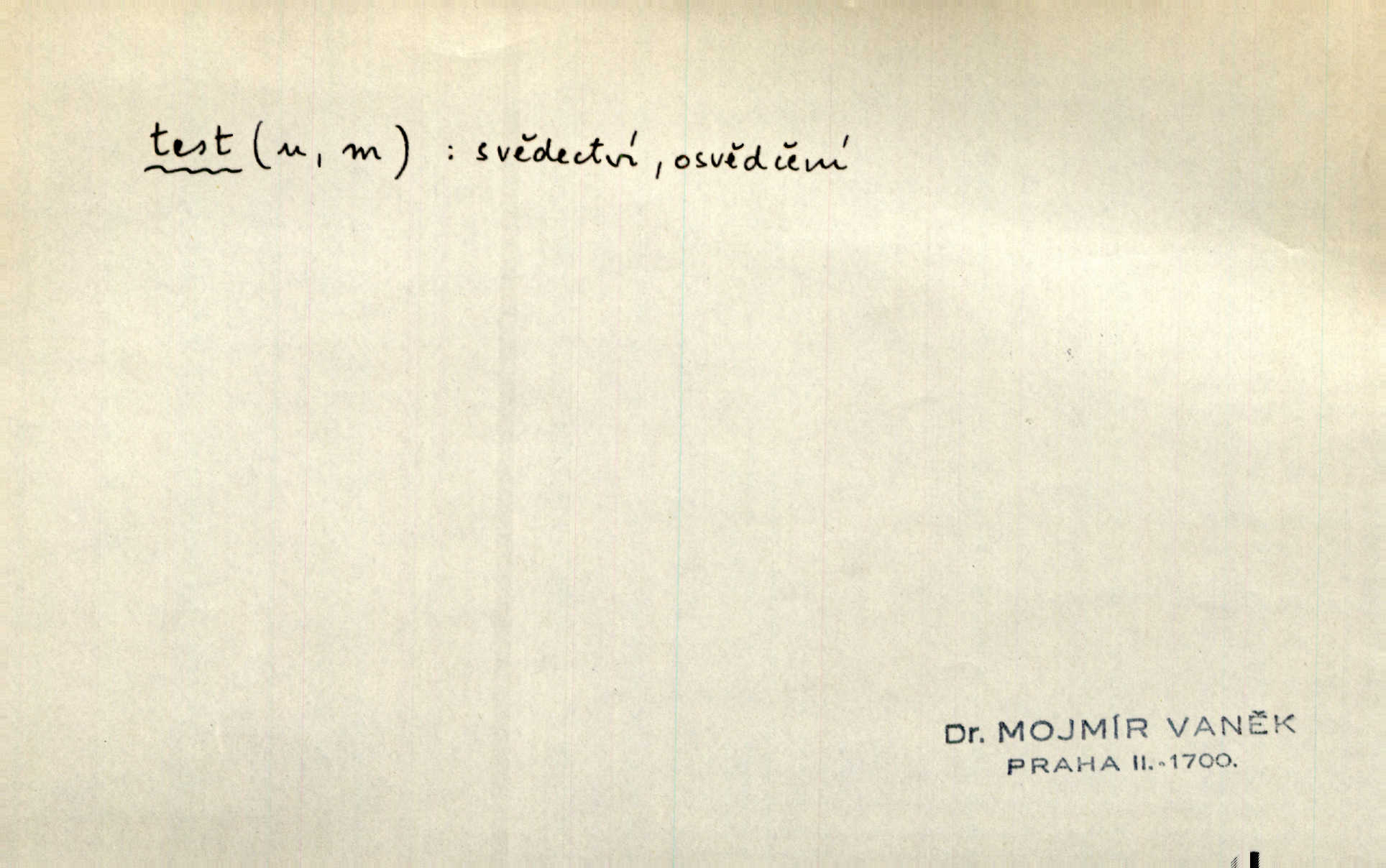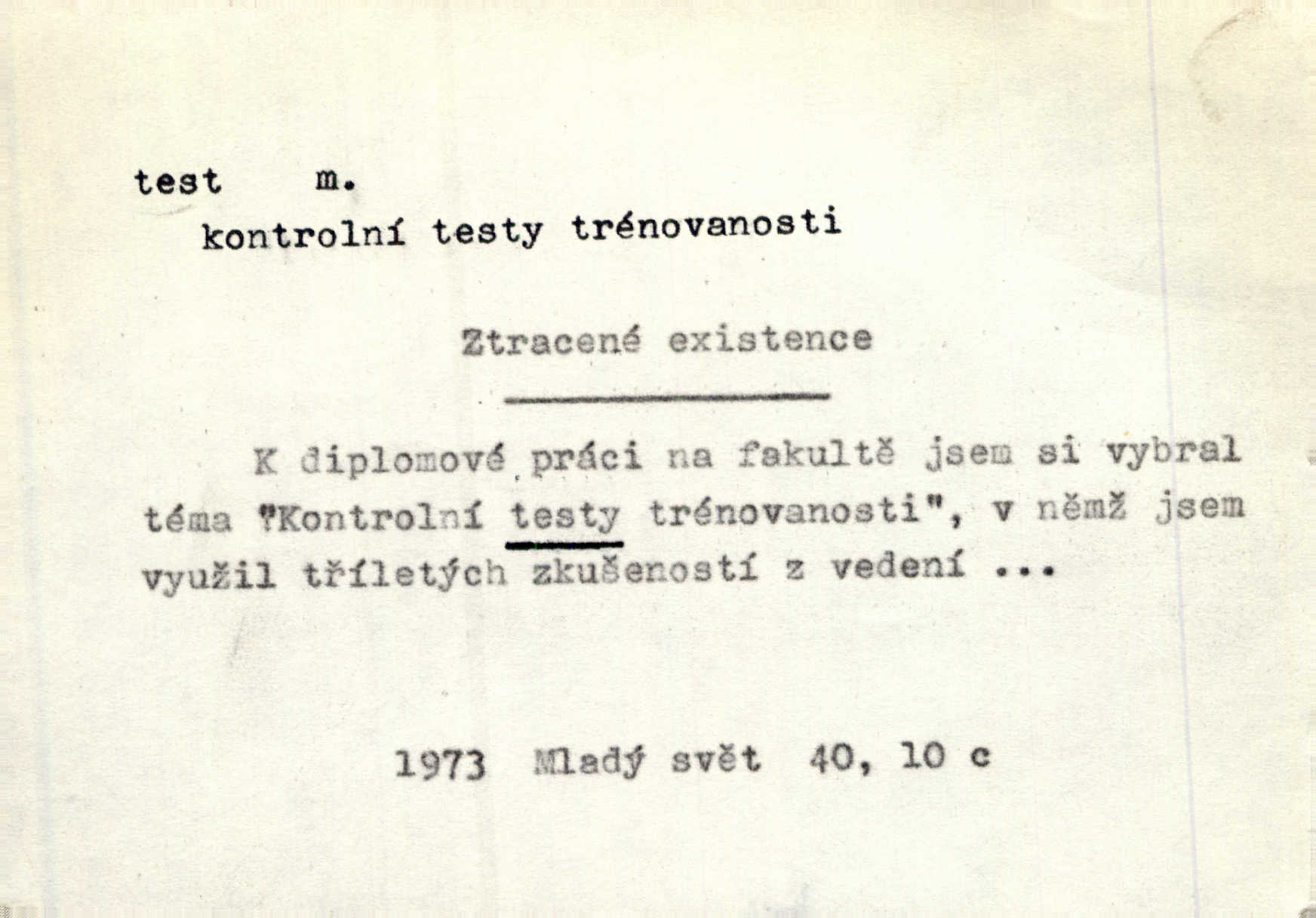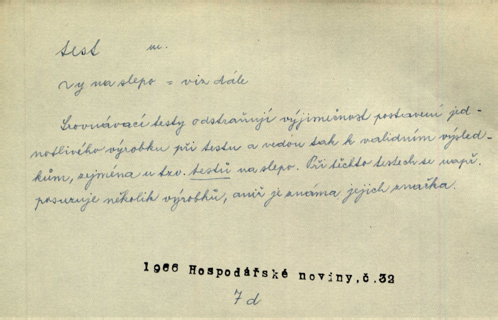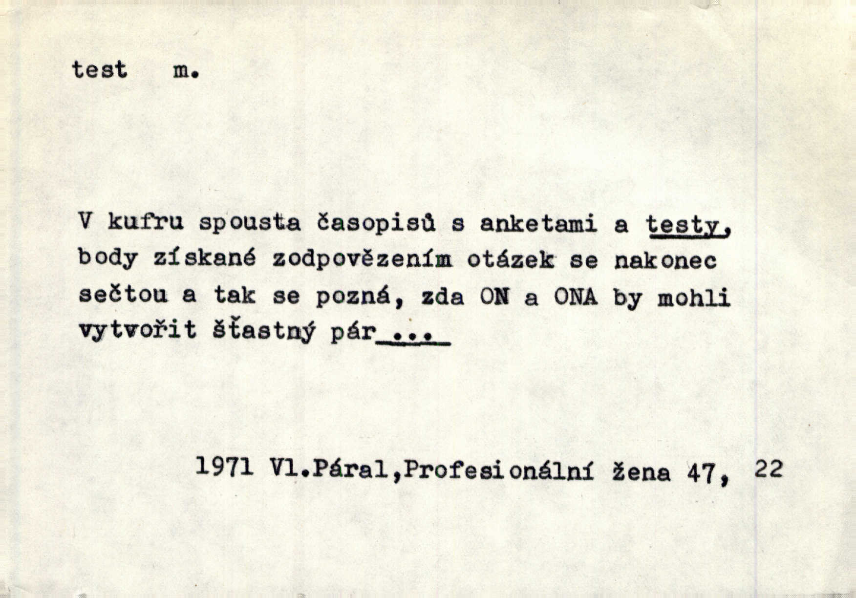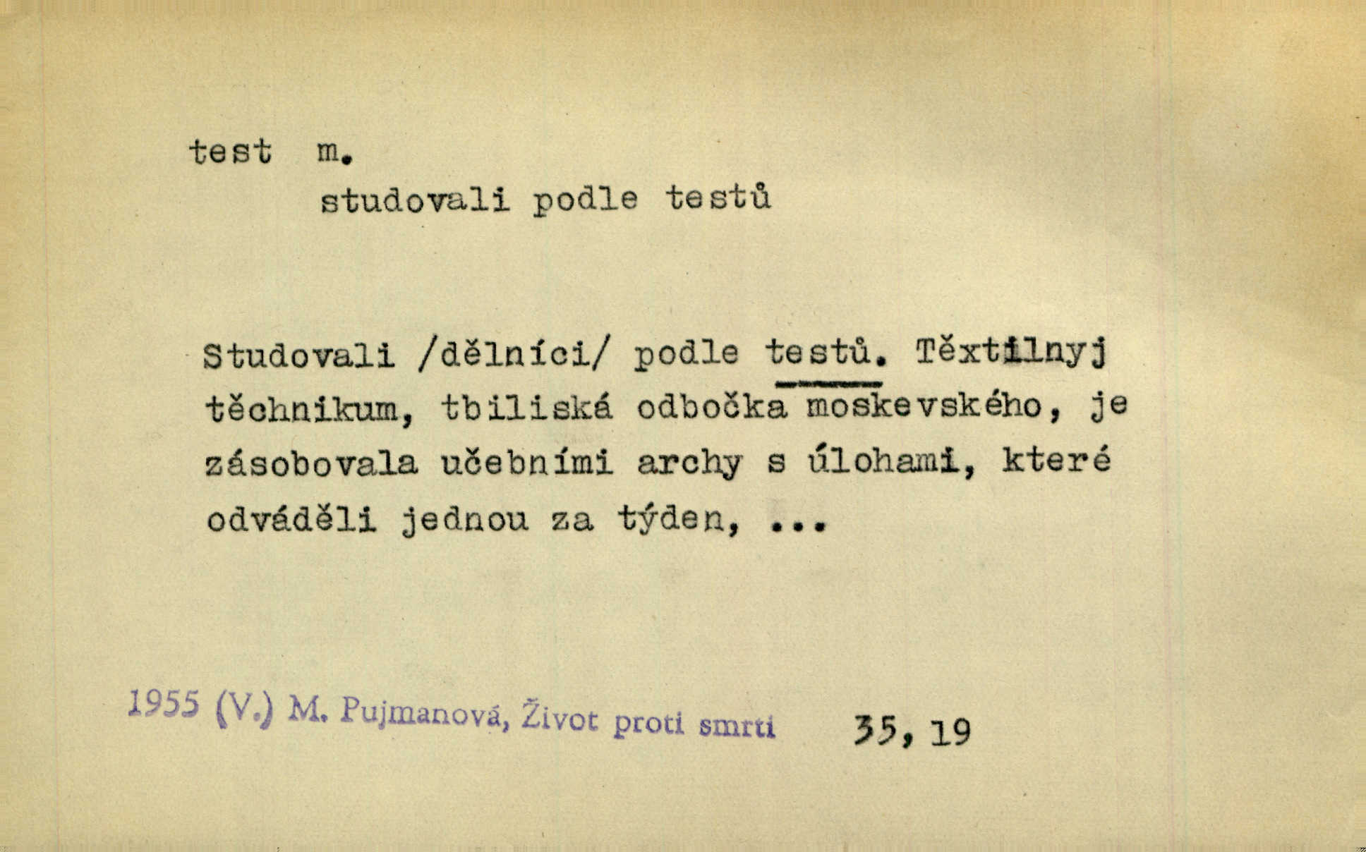 - test, -u m. psych., škol. druh zkoušky, kterou se měřil domněle stupeň inteligence n. zjišťovaly vědomosti. Tech. (v průmyslu) zkouška materiálu, jíž se zjišťuje přítomnost některé součásti n. nečistoty. Biol. test bakteriální stanovení určitého znaku n. charakteristické skupiny znaků určitého mikroba. Práv. potvrzení, osvědčení, zprav. o návštěvě přednášek (na vysoké škole), kursů a pod.