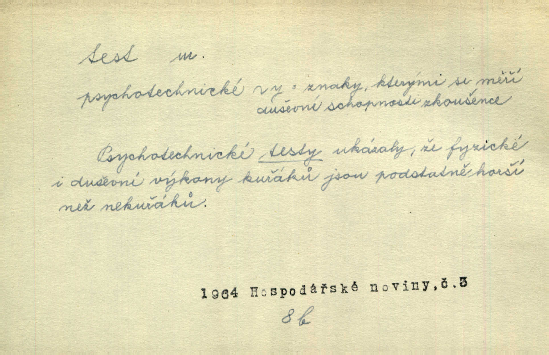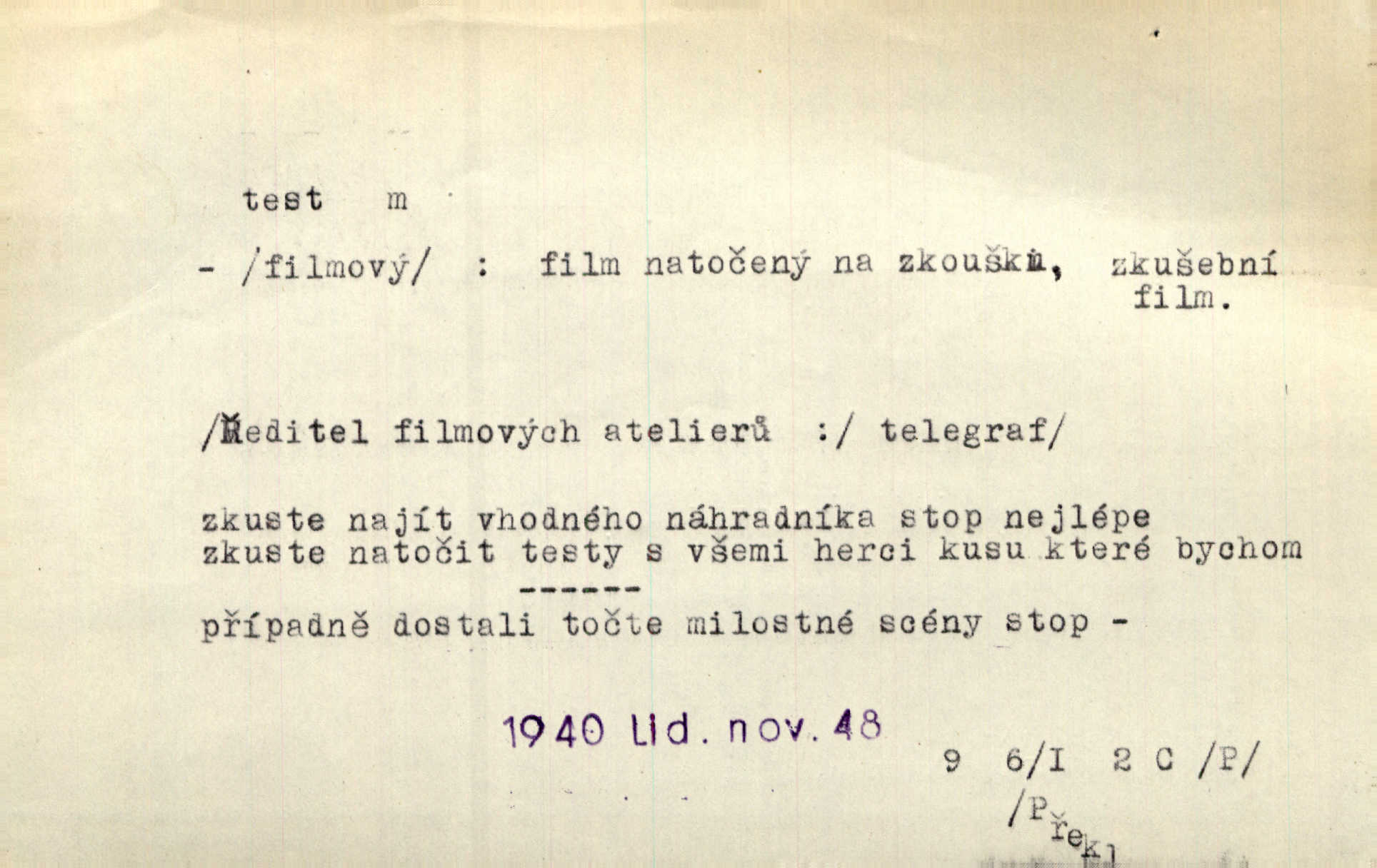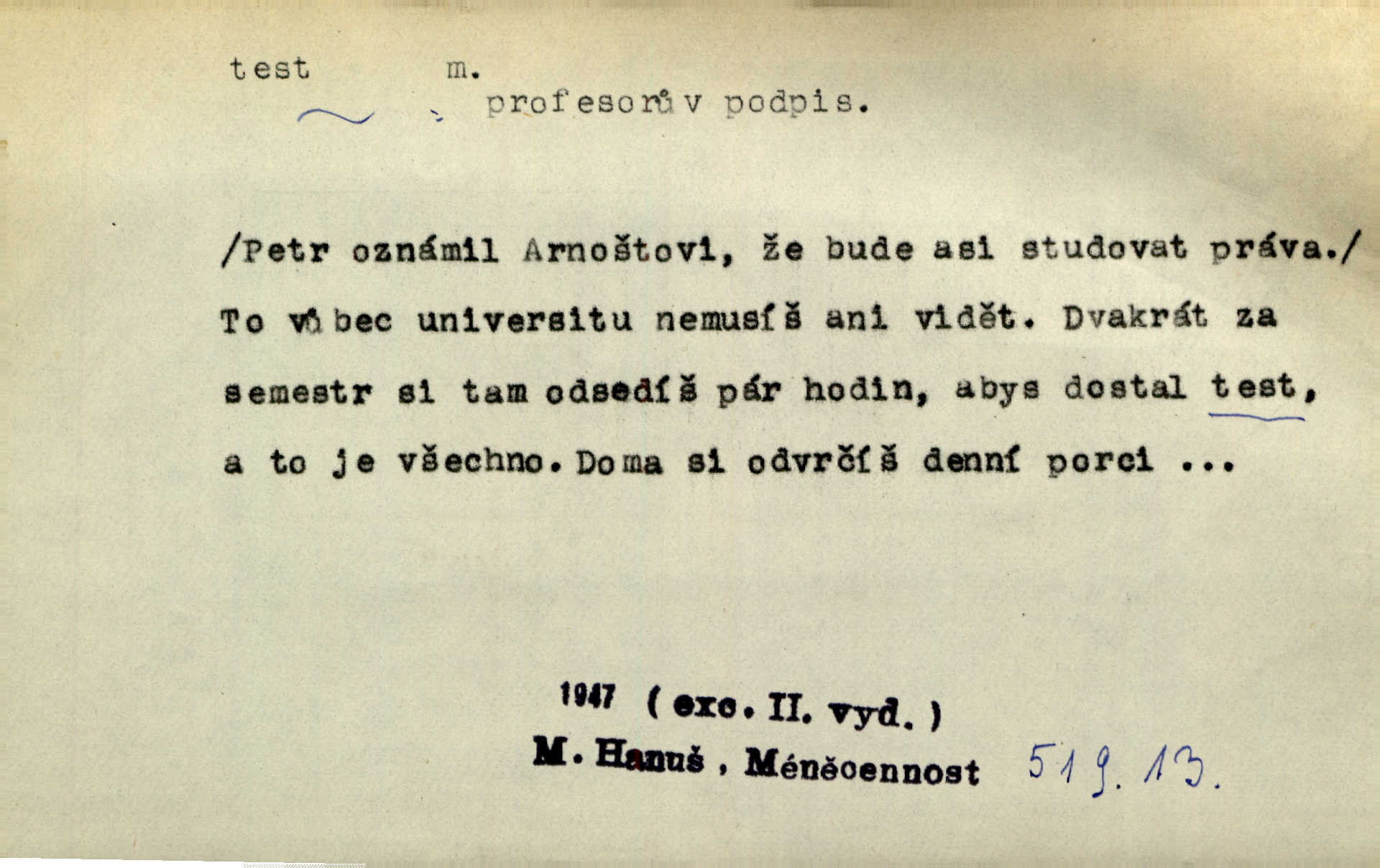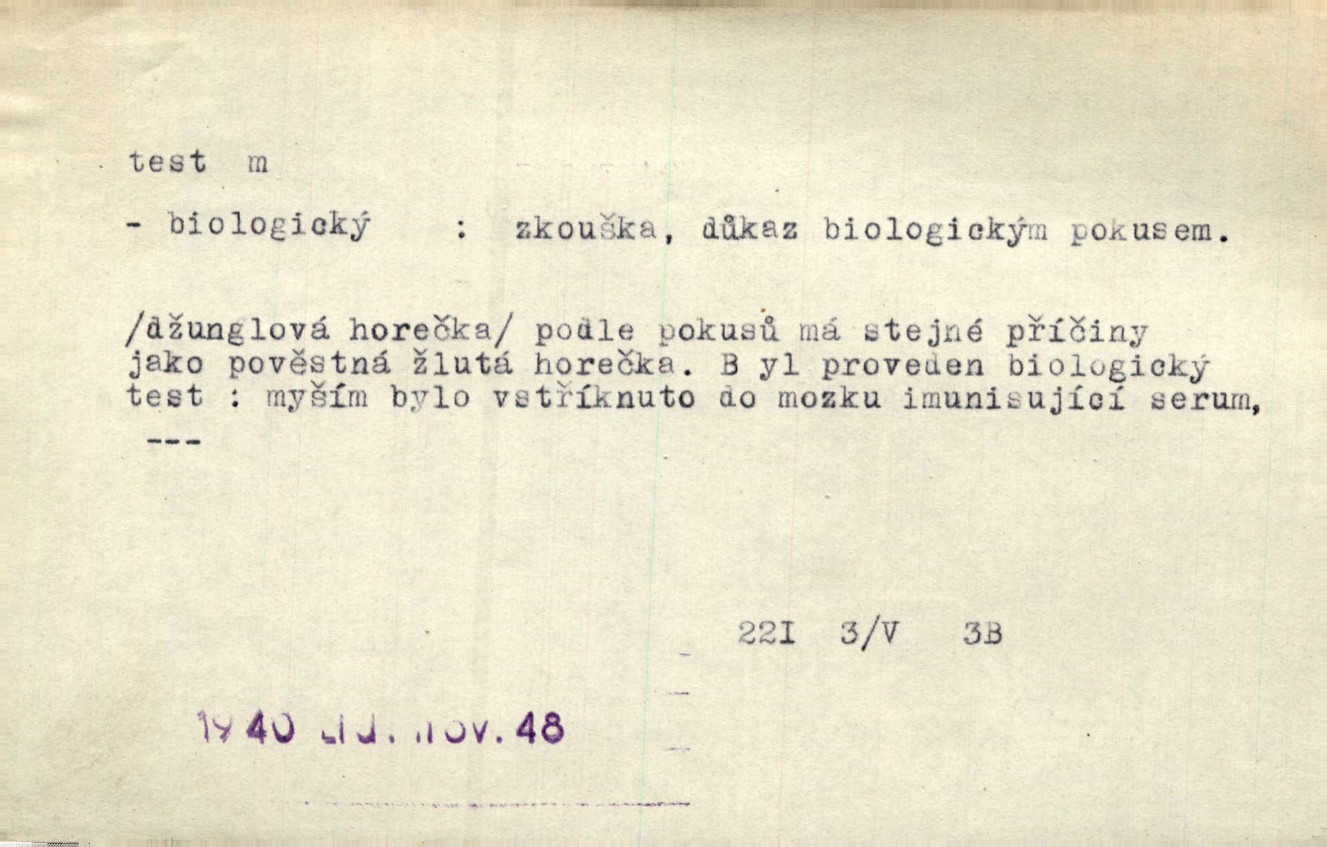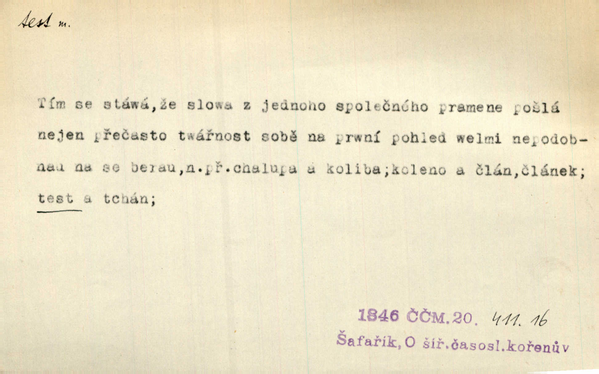 - test, -u m. psych., škol. druh zkoušky, kterou se měřil domněle stupeň inteligence n. zjišťovaly vědomosti. Tech. (v průmyslu) zkouška materiálu, jíž se zjišťuje přítomnost některé součásti n. nečistoty. Biol. test bakteriální stanovení určitého znaku n. charakteristické skupiny znaků určitého mikroba. Práv. potvrzení, osvědčení, zprav. o návštěvě přednášek (na vysoké škole), kursů a pod.