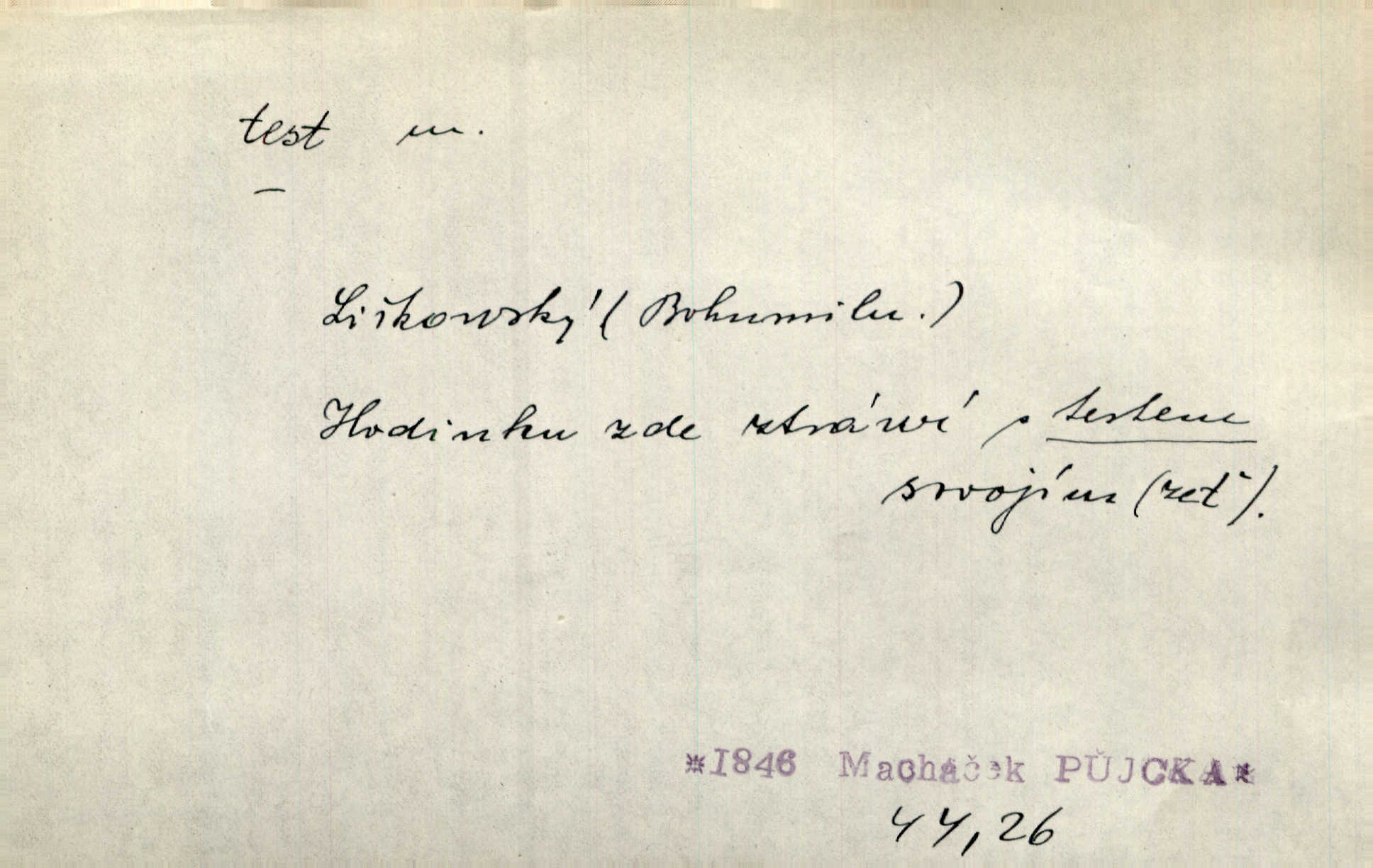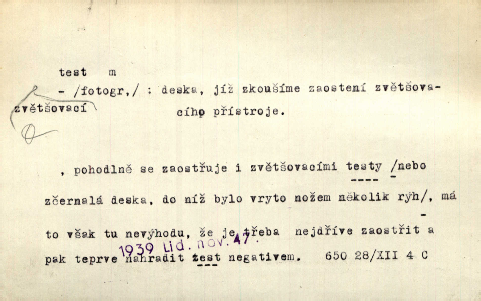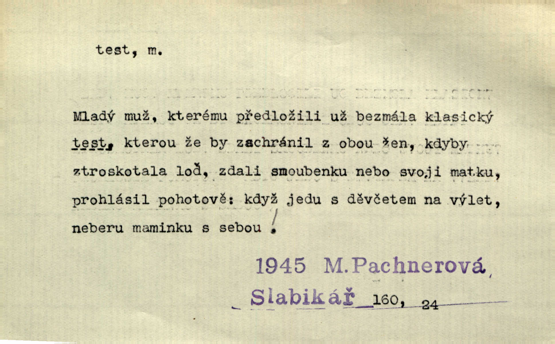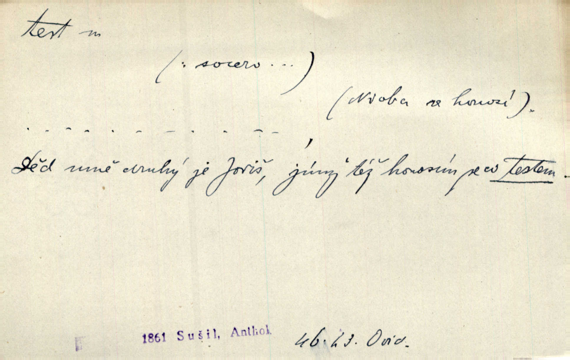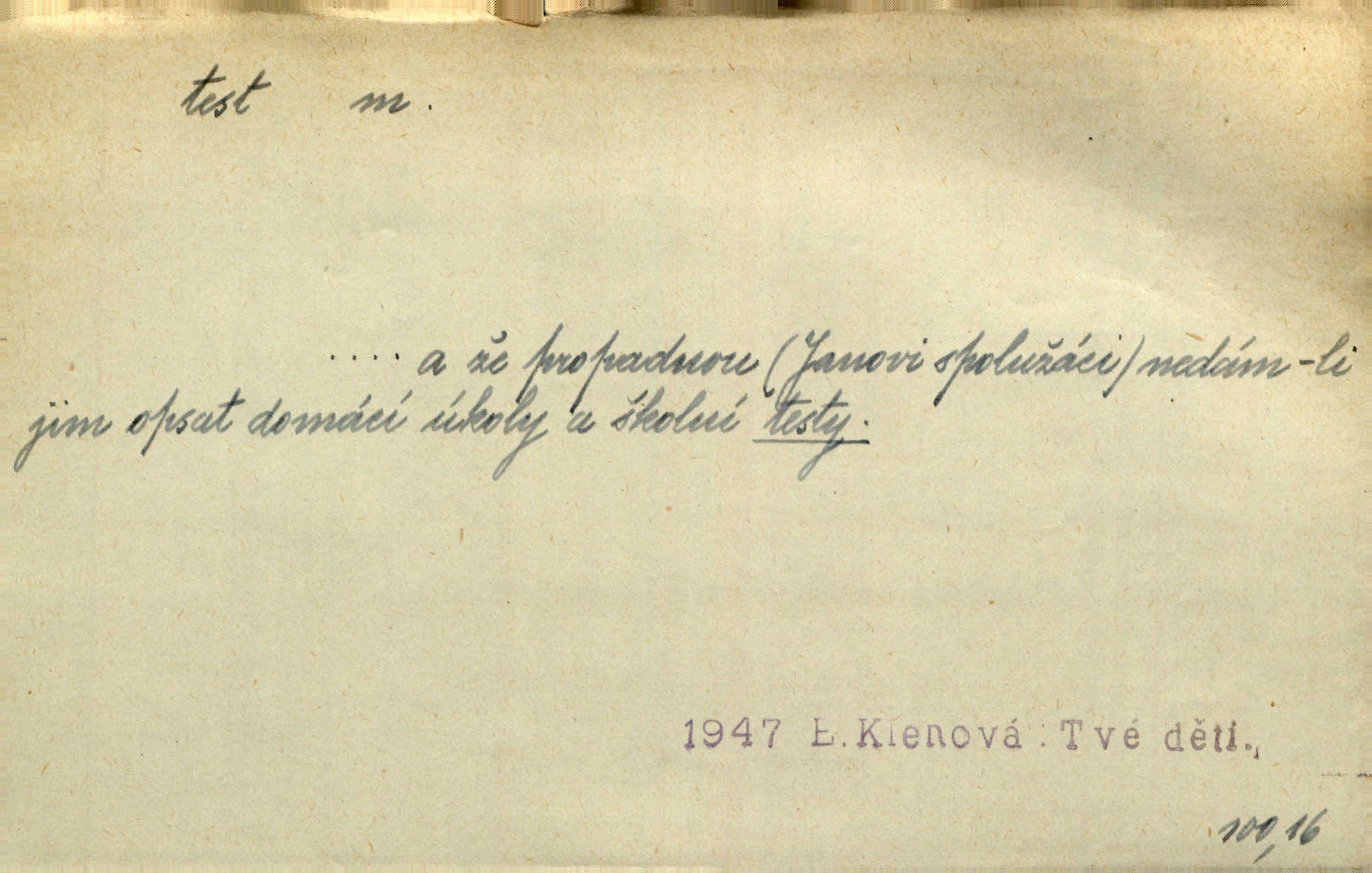 - test, -u m. psych., škol. druh zkoušky, kterou se měřil domněle stupeň inteligence n. zjišťovaly vědomosti. Tech. (v průmyslu) zkouška materiálu, jíž se zjišťuje přítomnost některé součásti n. nečistoty. Biol. test bakteriální stanovení určitého znaku n. charakteristické skupiny znaků určitého mikroba. Práv. potvrzení, osvědčení, zprav. o návštěvě přednášek (na vysoké škole), kursů a pod.