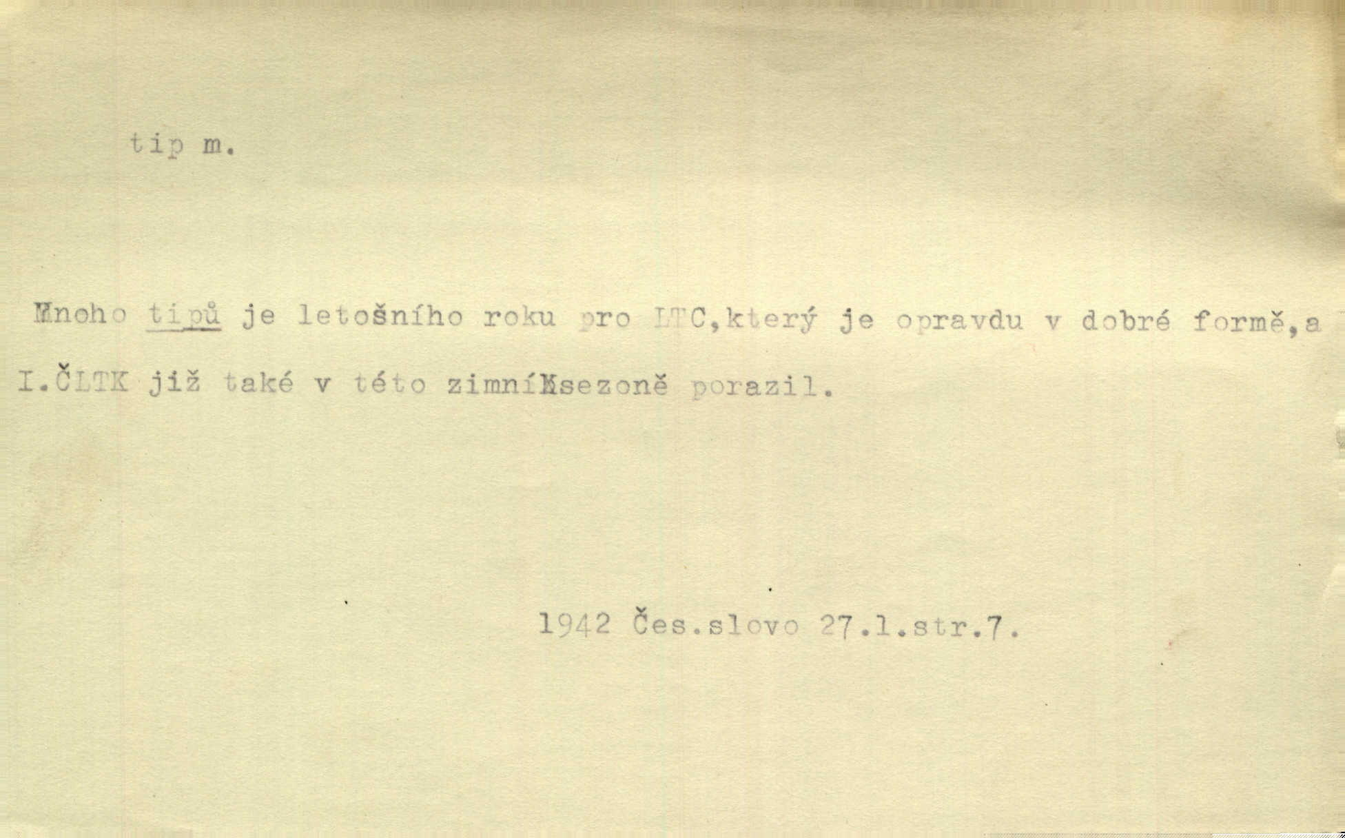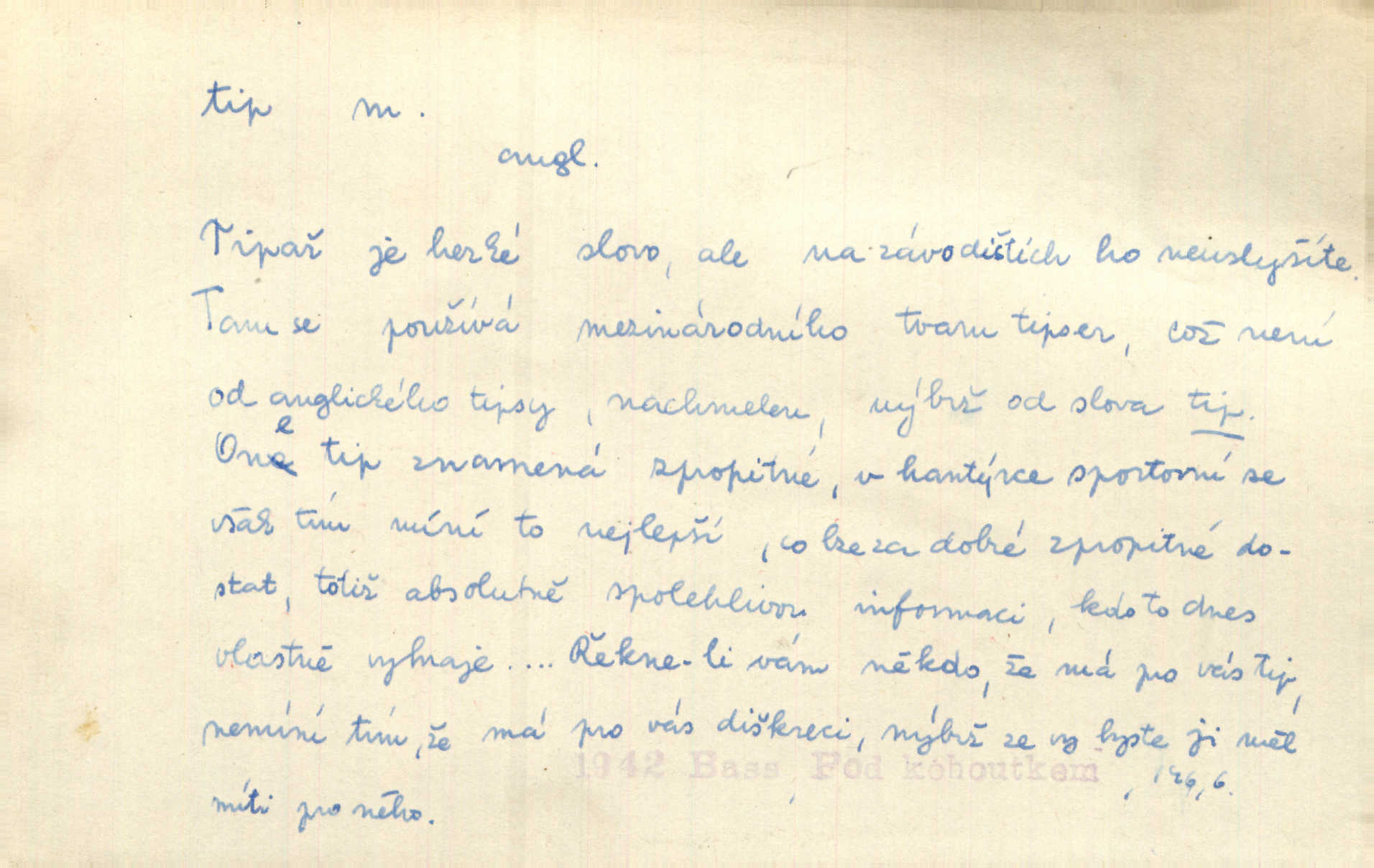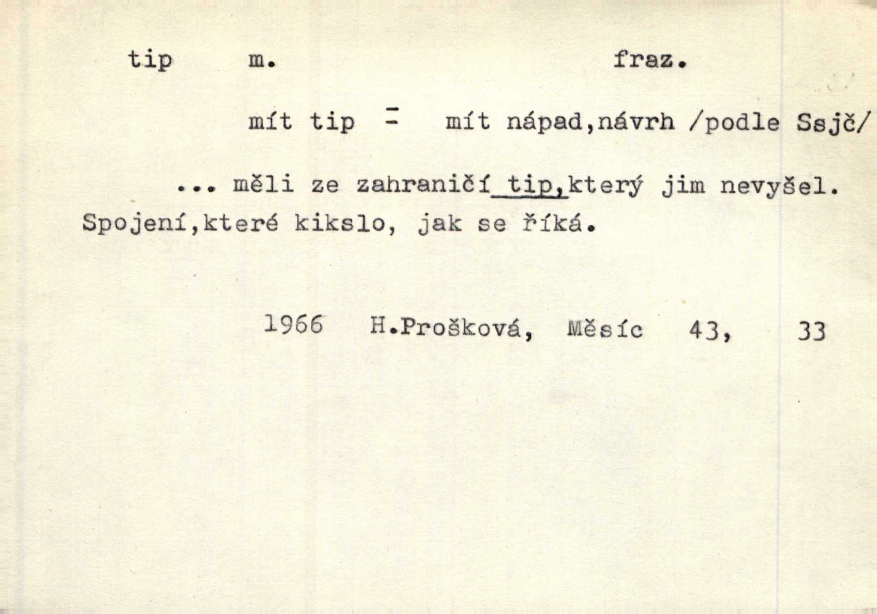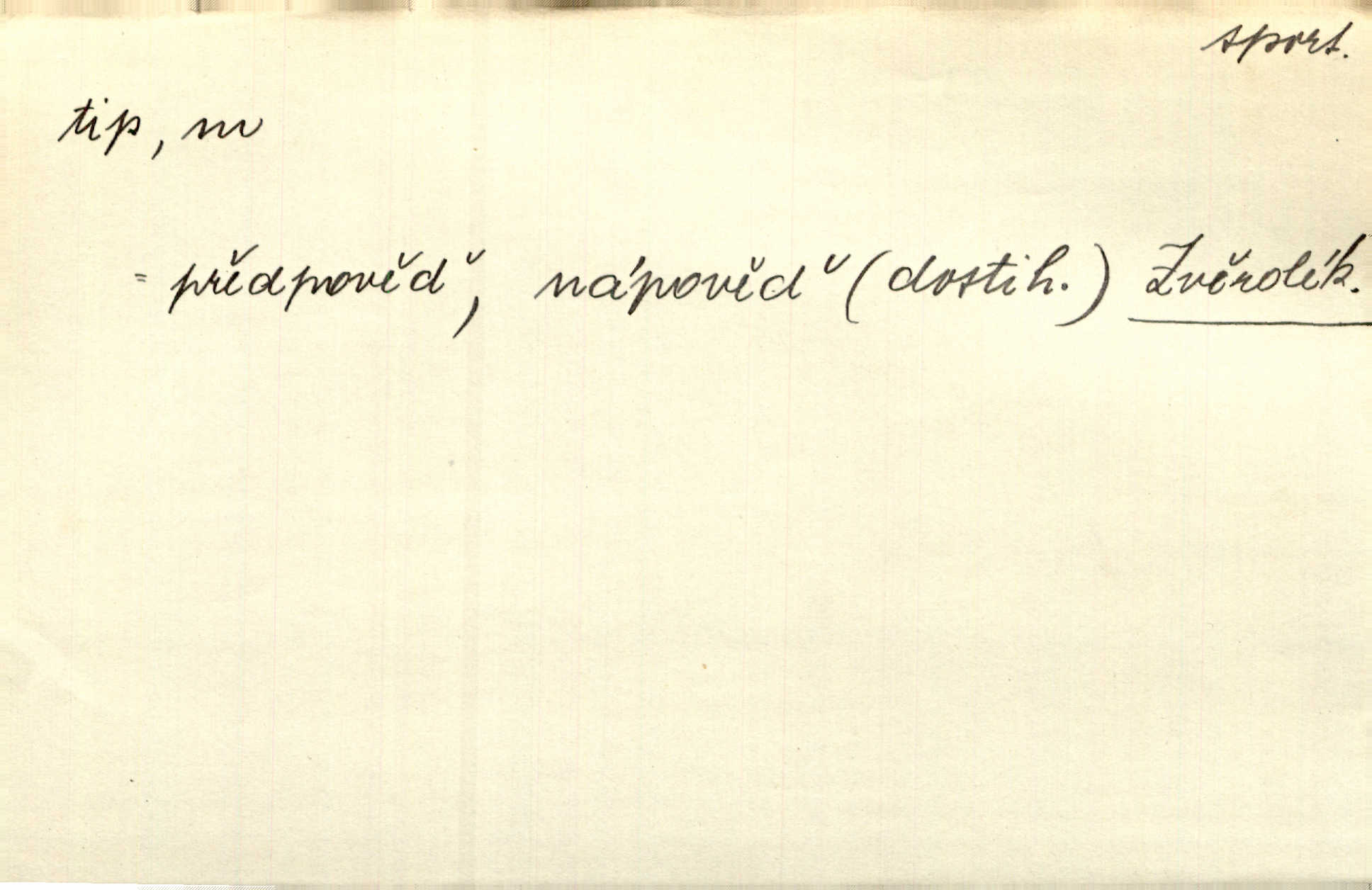 - tip (vysl. typ), -u m. pokyn, upozornění na možnost výhry (ve sportu, sázkách a j.). Váš bratr mi pomoh, já vám za to dal tendle tip. Vl. Proch. Mnoho tipů je letošního roku pro LTC, který je opravdu v dobré formě. Čes. sl. Lyžaři pronášeli své tipy a úvahy o chancích jednotlivých závodníků. Hvězda. Sport. (v sázkařství) předpokládané vítězství v závodech. — V. t. typ.