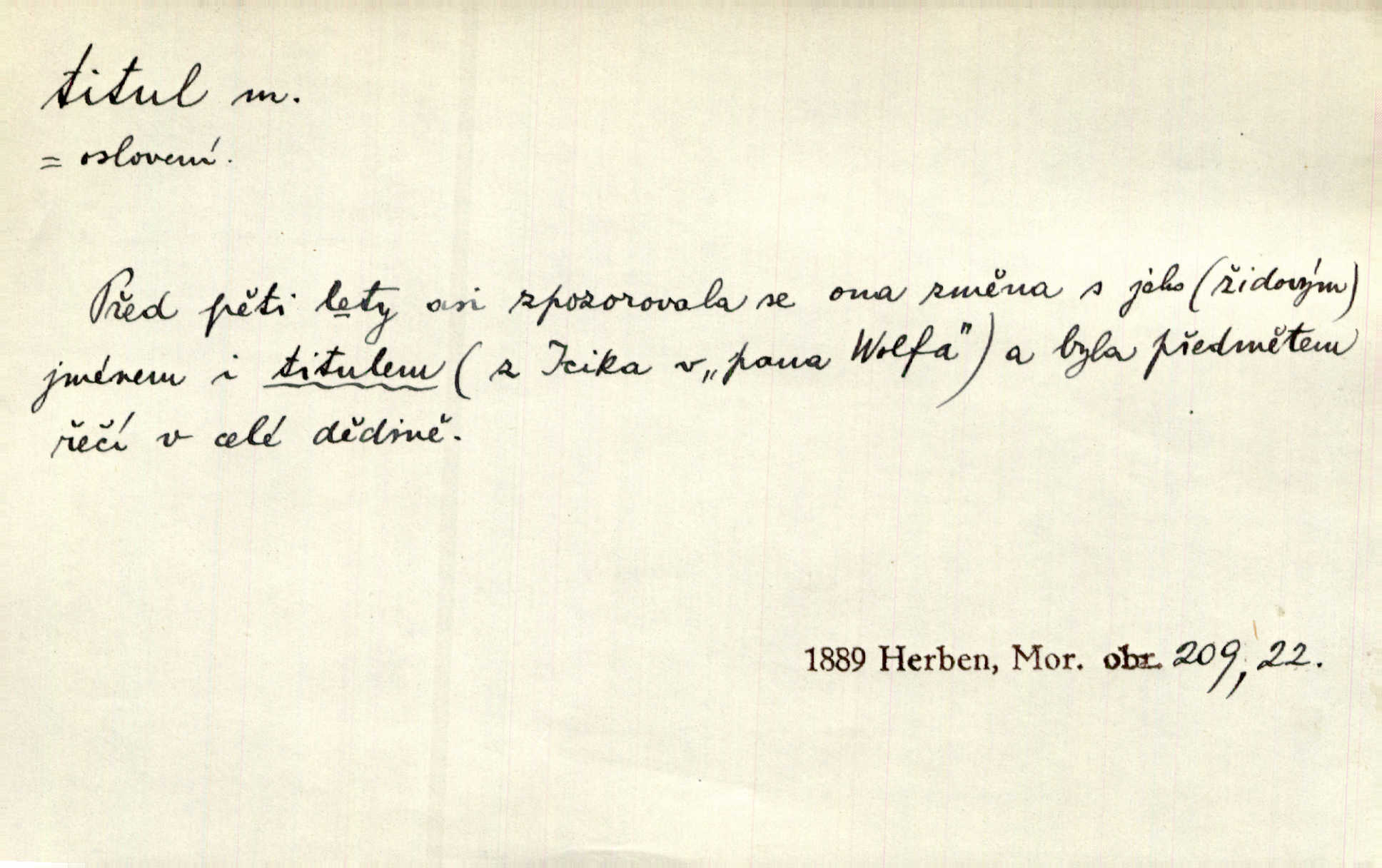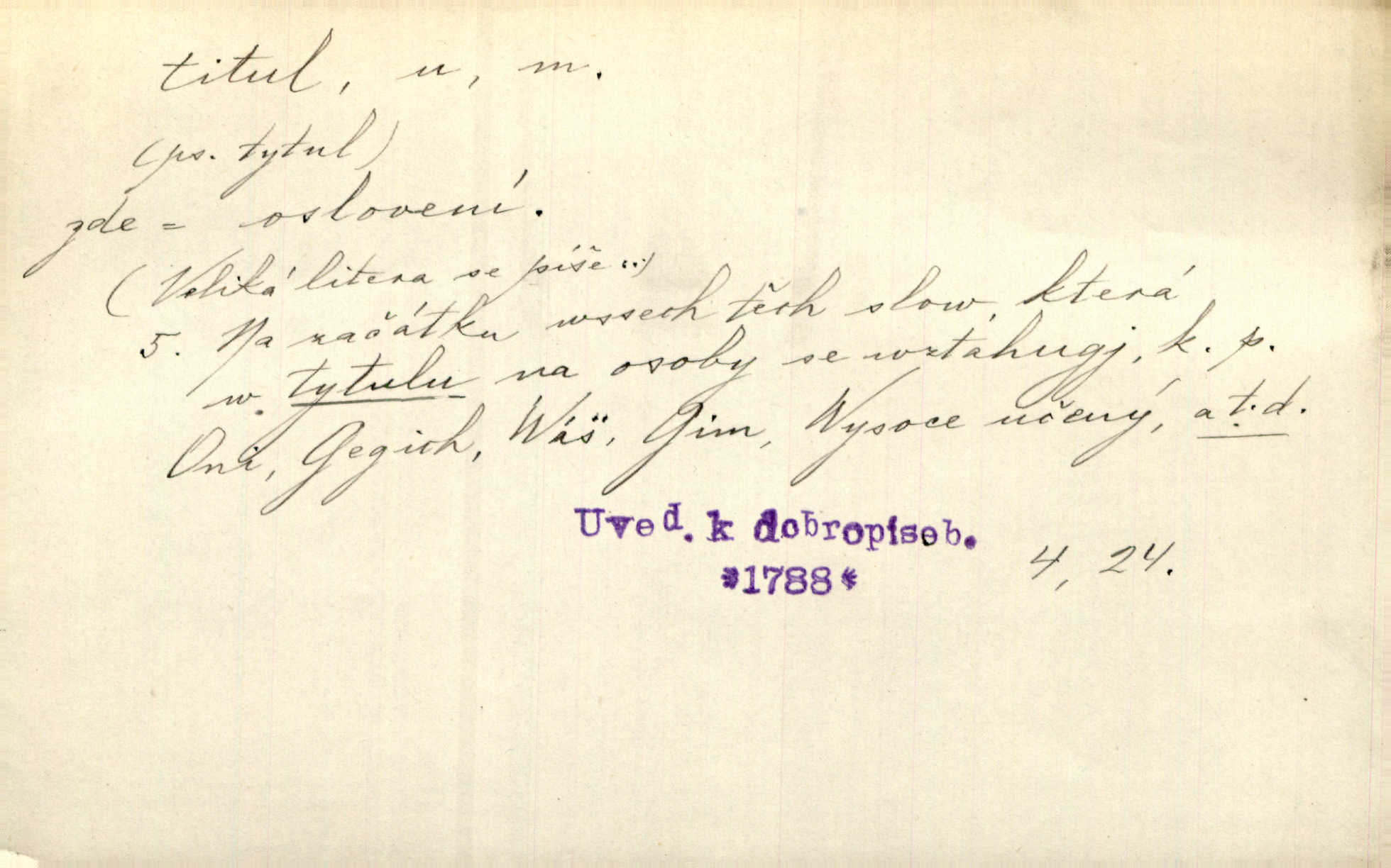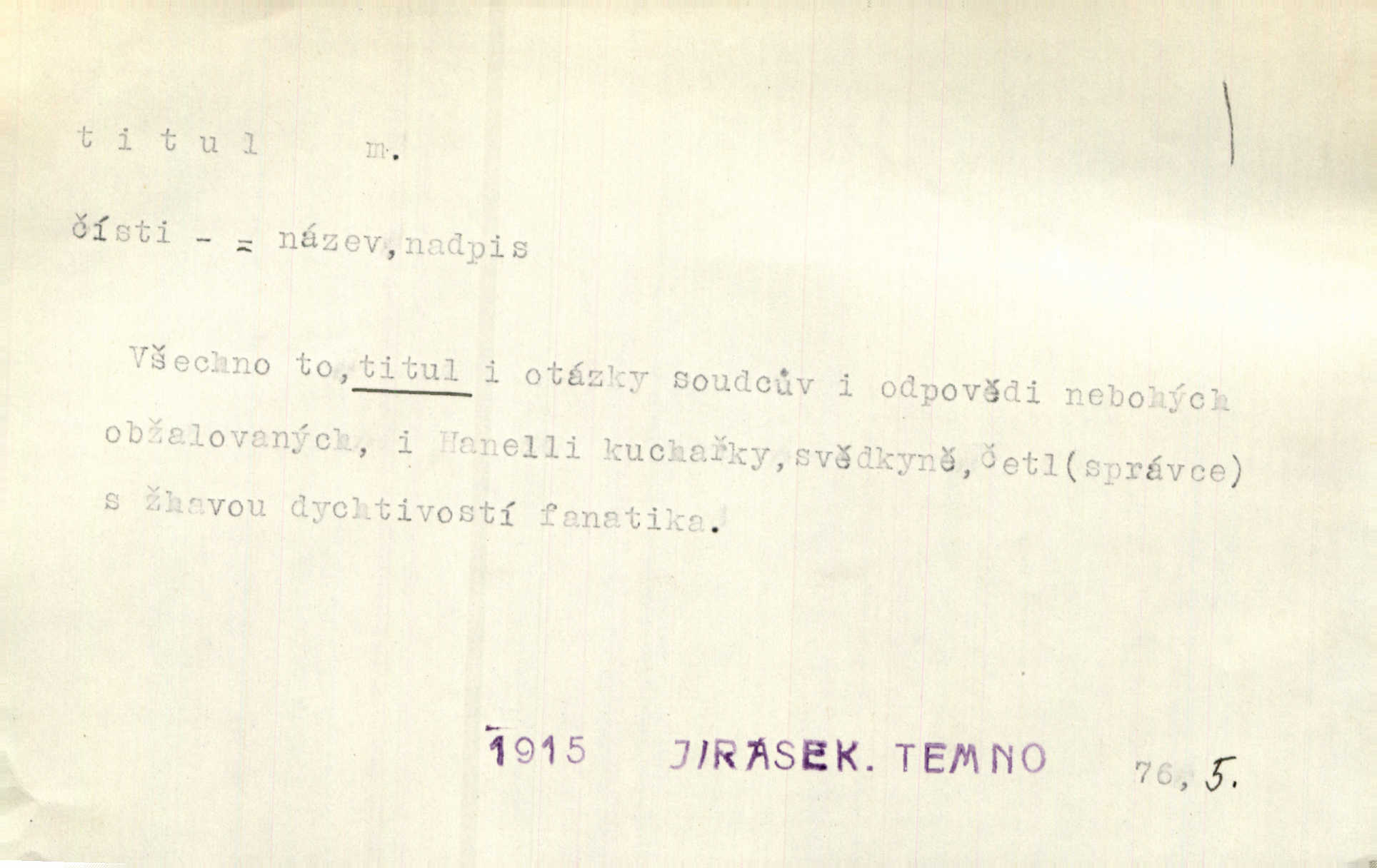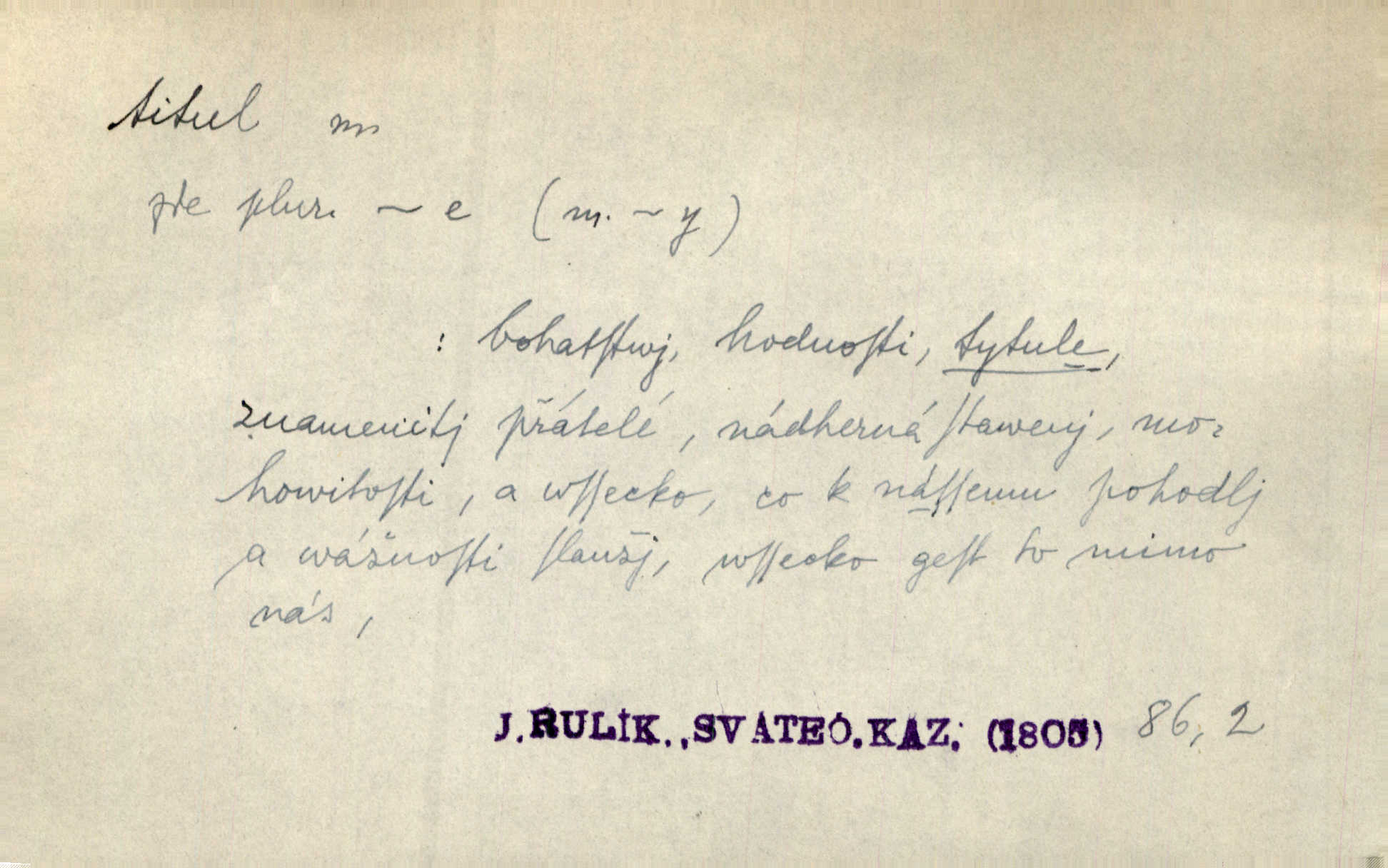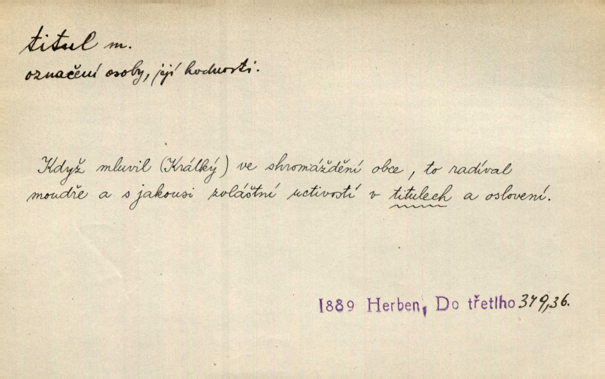 - titul (vysl. ty-), -u m. název hodnosti, postavení nějaké osoby; oslovení, pojmenování nějaké osoby. Albrecht přijal na se titul krále Římského. Pal. Mnozí generálové položili základ k rodovému jmění i k titulům, jichž potomci až dosud užívají. Rez. Znal jen tituly důstojníků a několika jiných pánů. Jir. Když Herites vystoupil z lékárny, oslovil jsem ho titulem „pane lékárníku“. Jir. Prostým občanům lichotilo zasedat u jednoho stolu se vzdělanci s akademickým titulem. Lum. Mladý hodinář řekl to dvorně, po městsku, s titulem „panna“. Jir. Na titul královny plesu zdála se mu činit největší nároky Cilka. V. Mrš. Žert. Již zdaleka přivítal běšínský pán svého čeledína hromobitím titulů, mezi nimiž hulvát a halama nejvyšší hodnosti naznačovaly nadávek. Čech. Při tom dostalo se pateru Amandovi za jeho umění léčebné nejednoho titulu málo lichotivého. Jir. D název, nadpis knihy n. jednotlivých jejích částí, článků a pod. Mezi spisy Chelčického vřaditi lze traktát vepsaný bez zvláštních titulů čili nadpisů. Goll. Titul knihy objasňuje se v předmluvě. Jir. List u desky byl utržen a s ním větší část titulu. Jir. Jej všecko znepokojuje, odtud trefný titul jeho první knihy. Vrch. D odstavec, oddíl v zákonech a p. Každý díl rozpočtu rozdělen je na kapitoly, tituly a pododdělení. Čes. pol. Obsáhlý rozdíl druhý jednající o poměrech právních dělí se na 3 tituly. Ath. D Kniž. důvod, odůvodnění. Konečně přestaly tyto nesmyslné státní výdaje z titulu „naléhavosti poměrů“. Výb. Pěvecká povinnost byla po něm vymáhána z titulu starostenské moci. Kop. Začneme přehlídku díla Alfreda de Vigny básněmi. Nebylo již od počátku pochybnosti, že v nich jest hlavní titul slávy básníkovy i jeho významu. Vrch. Práv. pravní důvod, nárok, právo na něco.