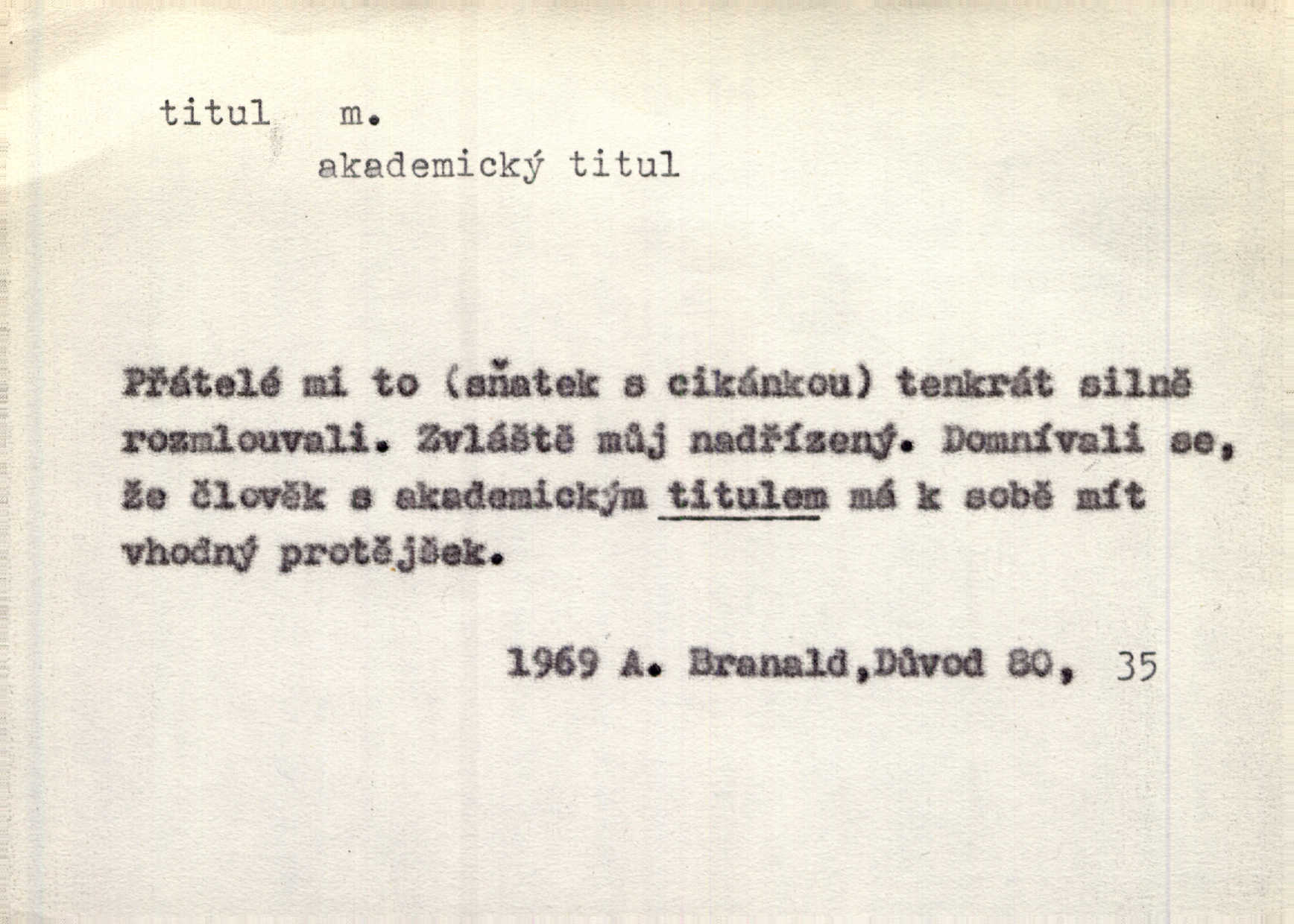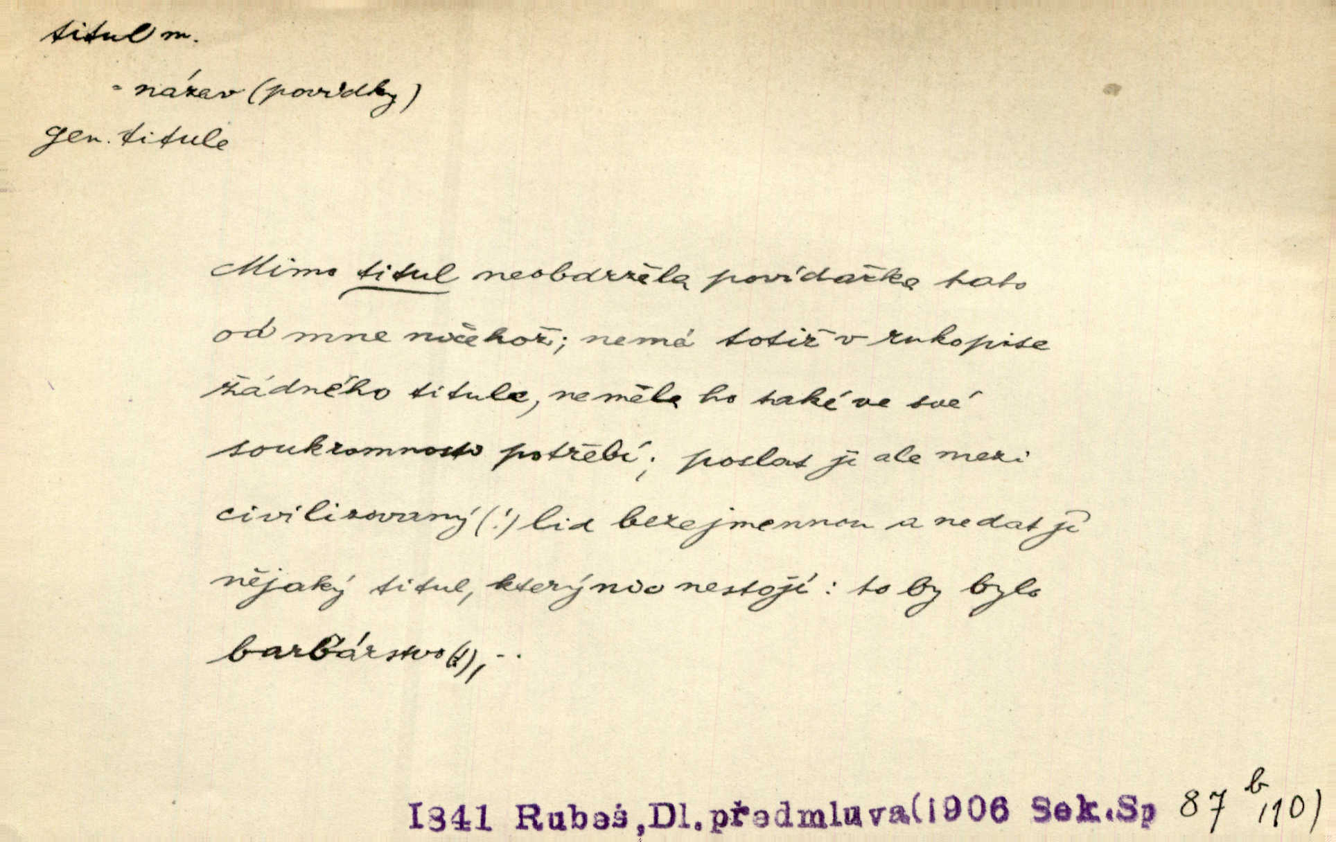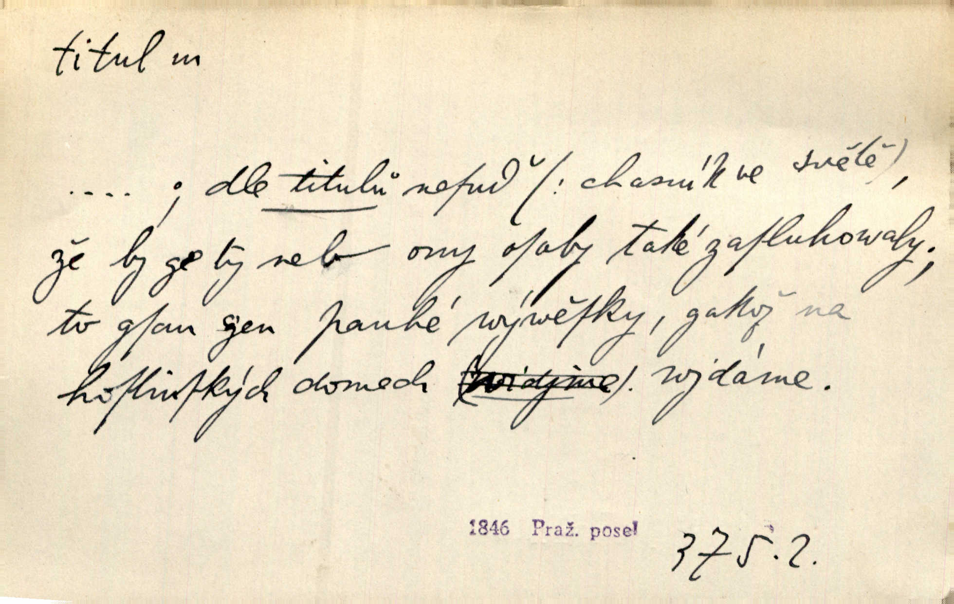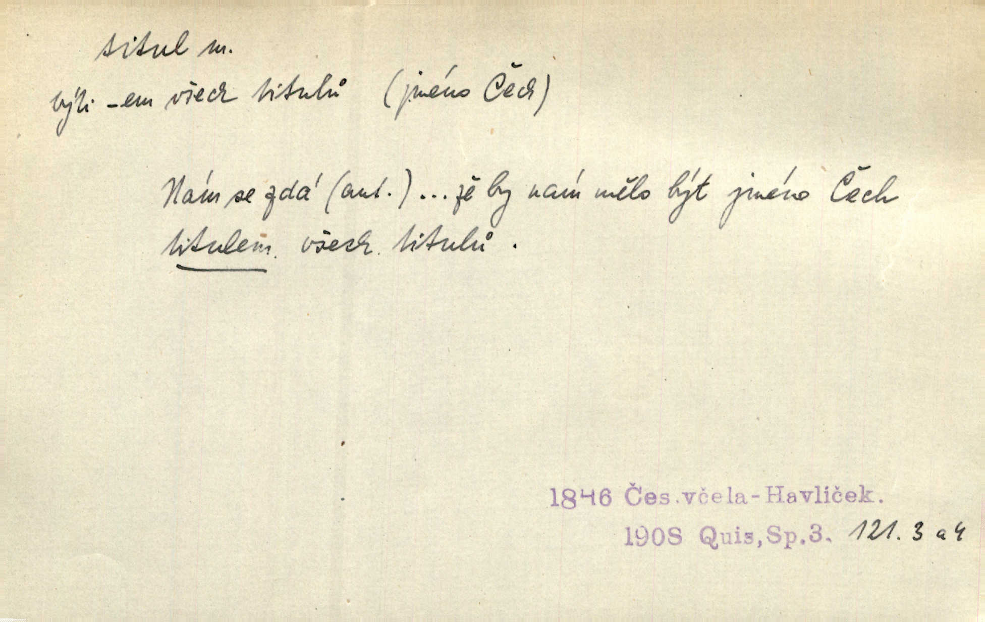 - titul (vysl. ty-), -u m. název hodnosti, postavení nějaké osoby; oslovení, pojmenování nějaké osoby. Albrecht přijal na se titul krále Římského. Pal. Mnozí generálové položili základ k rodovému jmění i k titulům, jichž potomci až dosud užívají. Rez. Znal jen tituly důstojníků a několika jiných pánů. Jir. Když Herites vystoupil z lékárny, oslovil jsem ho titulem „pane lékárníku“. Jir. Prostým občanům lichotilo zasedat u jednoho stolu se vzdělanci s akademickým titulem. Lum. Mladý hodinář řekl to dvorně, po městsku, s titulem „panna“. Jir. Na titul královny plesu zdála se mu činit největší nároky Cilka. V. Mrš. Žert. Již zdaleka přivítal běšínský pán svého čeledína hromobitím titulů, mezi nimiž hulvát a halama nejvyšší hodnosti naznačovaly nadávek. Čech. Při tom dostalo se pateru Amandovi za jeho umění léčebné nejednoho titulu málo lichotivého. Jir. D název, nadpis knihy n. jednotlivých jejích částí, článků a pod. Mezi spisy Chelčického vřaditi lze traktát vepsaný bez zvláštních titulů čili nadpisů. Goll. Titul knihy objasňuje se v předmluvě. Jir. List u desky byl utržen a s ním větší část titulu. Jir. Jej všecko znepokojuje, odtud trefný titul jeho první knihy. Vrch. D odstavec, oddíl v zákonech a p. Každý díl rozpočtu rozdělen je na kapitoly, tituly a pododdělení. Čes. pol. Obsáhlý rozdíl druhý jednající o poměrech právních dělí se na 3 tituly. Ath. D Kniž. důvod, odůvodnění. Konečně přestaly tyto nesmyslné státní výdaje z titulu „naléhavosti poměrů“. Výb. Pěvecká povinnost byla po něm vymáhána z titulu starostenské moci. Kop. Začneme přehlídku díla Alfreda de Vigny básněmi. Nebylo již od počátku pochybnosti, že v nich jest hlavní titul slávy básníkovy i jeho významu. Vrch. Práv. pravní důvod, nárok, právo na něco.