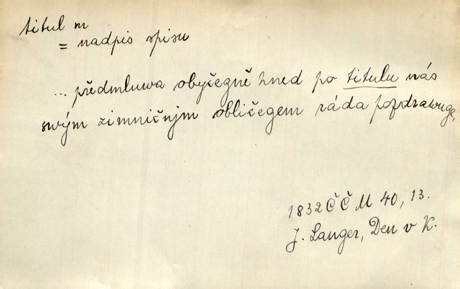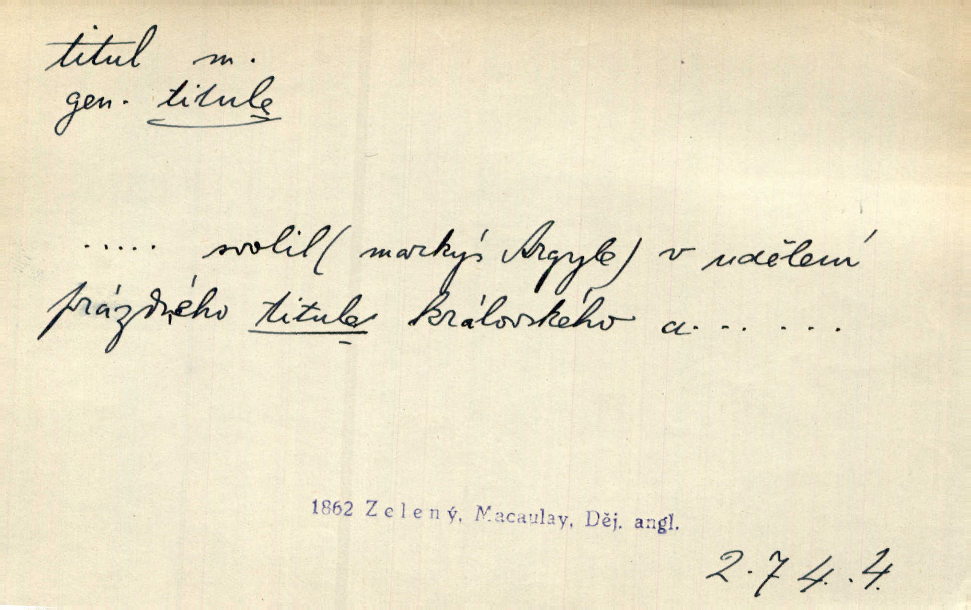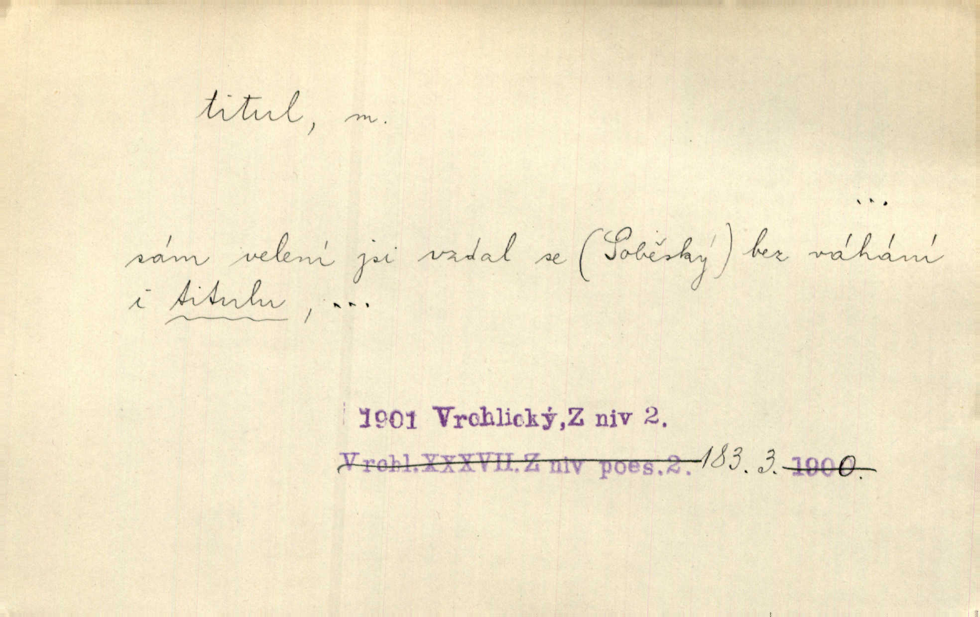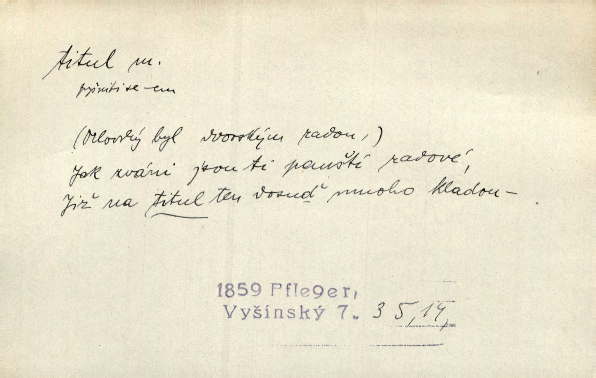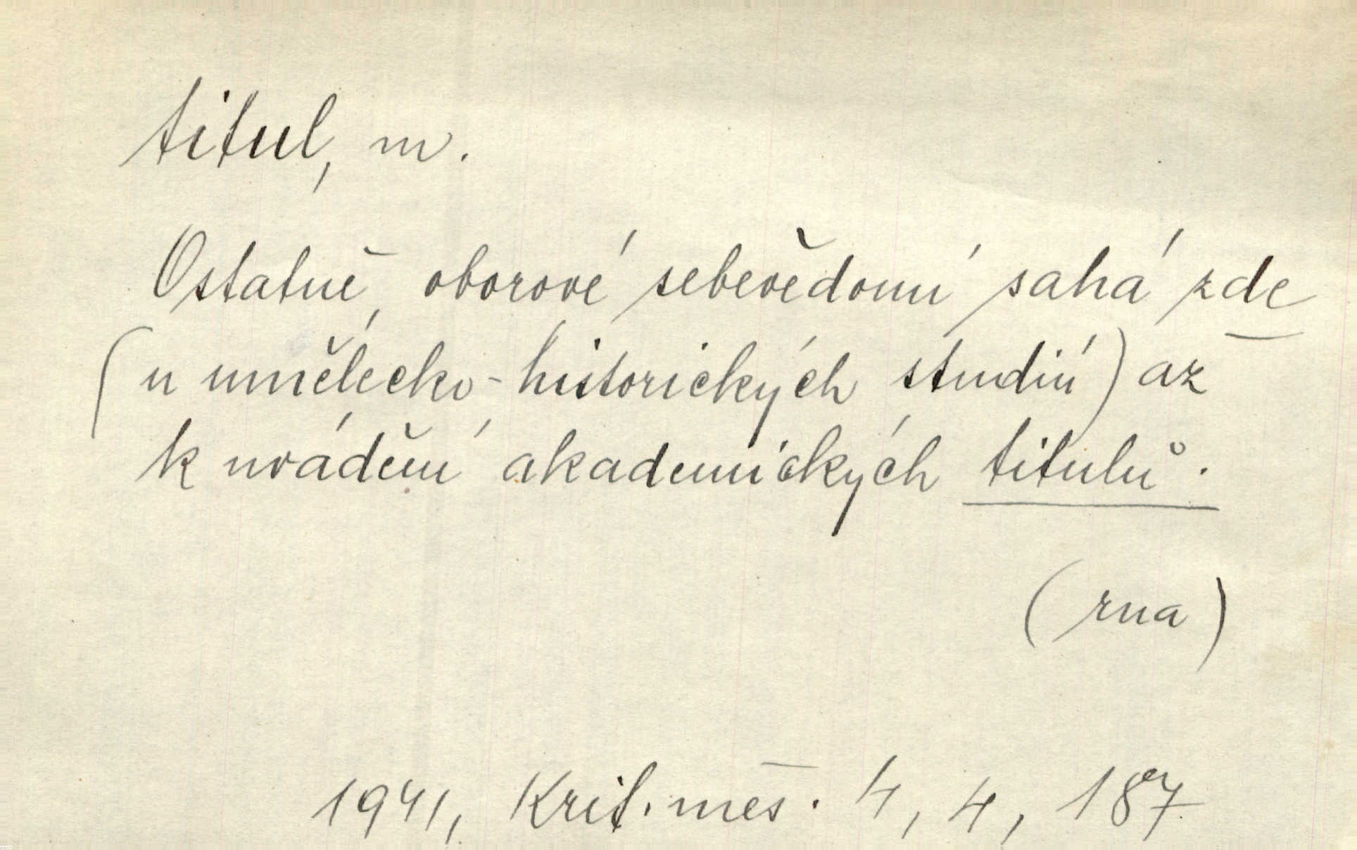 - titul (vysl. ty-), -u m. název hodnosti, postavení nějaké osoby; oslovení, pojmenování nějaké osoby. Albrecht přijal na se titul krále Římského. Pal. Mnozí generálové položili základ k rodovému jmění i k titulům, jichž potomci až dosud užívají. Rez. Znal jen tituly důstojníků a několika jiných pánů. Jir. Když Herites vystoupil z lékárny, oslovil jsem ho titulem „pane lékárníku“. Jir. Prostým občanům lichotilo zasedat u jednoho stolu se vzdělanci s akademickým titulem. Lum. Mladý hodinář řekl to dvorně, po městsku, s titulem „panna“. Jir. Na titul královny plesu zdála se mu činit největší nároky Cilka. V. Mrš. Žert. Již zdaleka přivítal běšínský pán svého čeledína hromobitím titulů, mezi nimiž hulvát a halama nejvyšší hodnosti naznačovaly nadávek. Čech. Při tom dostalo se pateru Amandovi za jeho umění léčebné nejednoho titulu málo lichotivého. Jir. D název, nadpis knihy n. jednotlivých jejích částí, článků a pod. Mezi spisy Chelčického vřaditi lze traktát vepsaný bez zvláštních titulů čili nadpisů. Goll. Titul knihy objasňuje se v předmluvě. Jir. List u desky byl utržen a s ním větší část titulu. Jir. Jej všecko znepokojuje, odtud trefný titul jeho první knihy. Vrch. D odstavec, oddíl v zákonech a p. Každý díl rozpočtu rozdělen je na kapitoly, tituly a pododdělení. Čes. pol. Obsáhlý rozdíl druhý jednající o poměrech právních dělí se na 3 tituly. Ath. D Kniž. důvod, odůvodnění. Konečně přestaly tyto nesmyslné státní výdaje z titulu „naléhavosti poměrů“. Výb. Pěvecká povinnost byla po něm vymáhána z titulu starostenské moci. Kop. Začneme přehlídku díla Alfreda de Vigny básněmi. Nebylo již od počátku pochybnosti, že v nich jest hlavní titul slávy básníkovy i jeho významu. Vrch. Práv. pravní důvod, nárok, právo na něco.