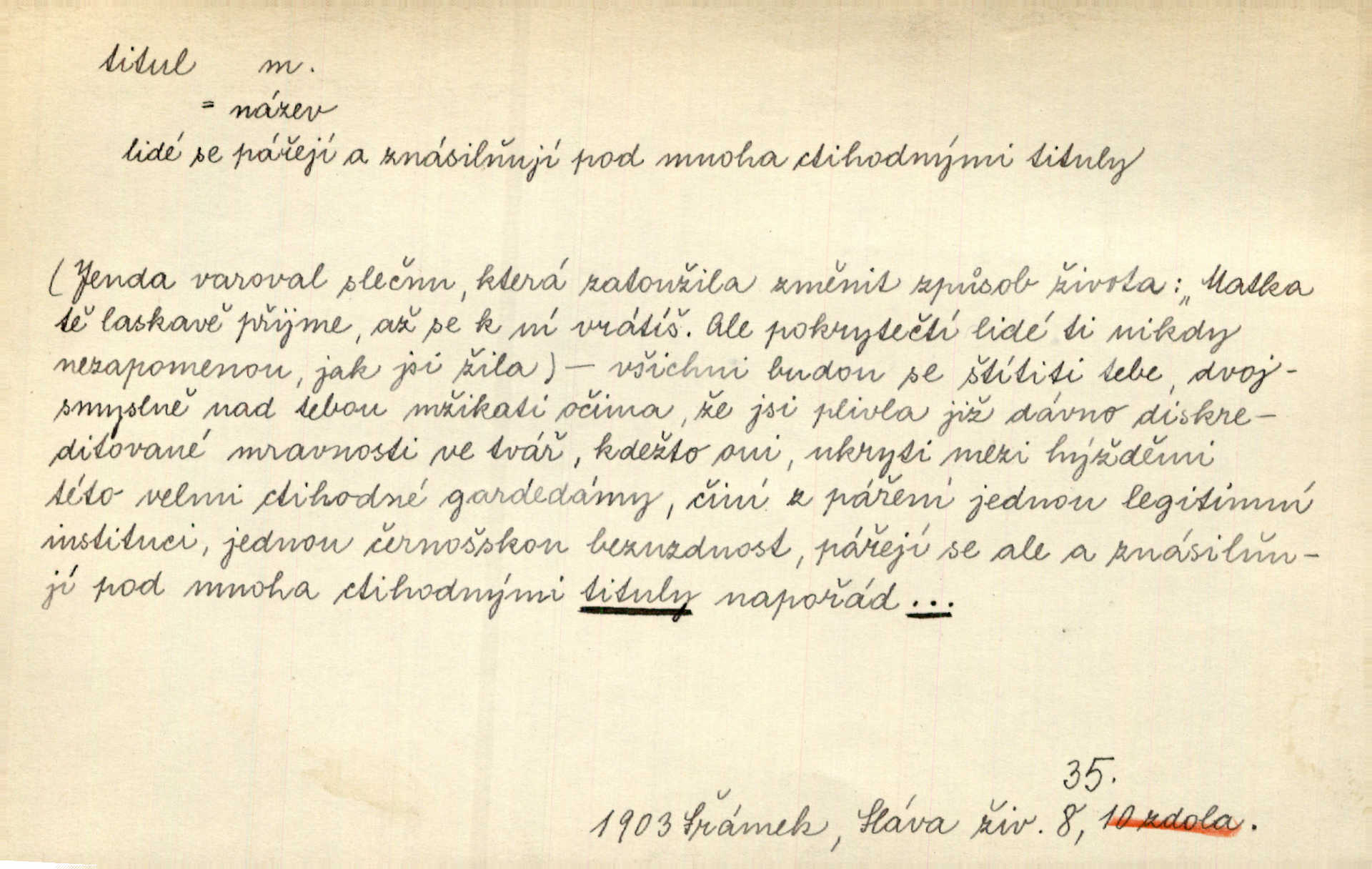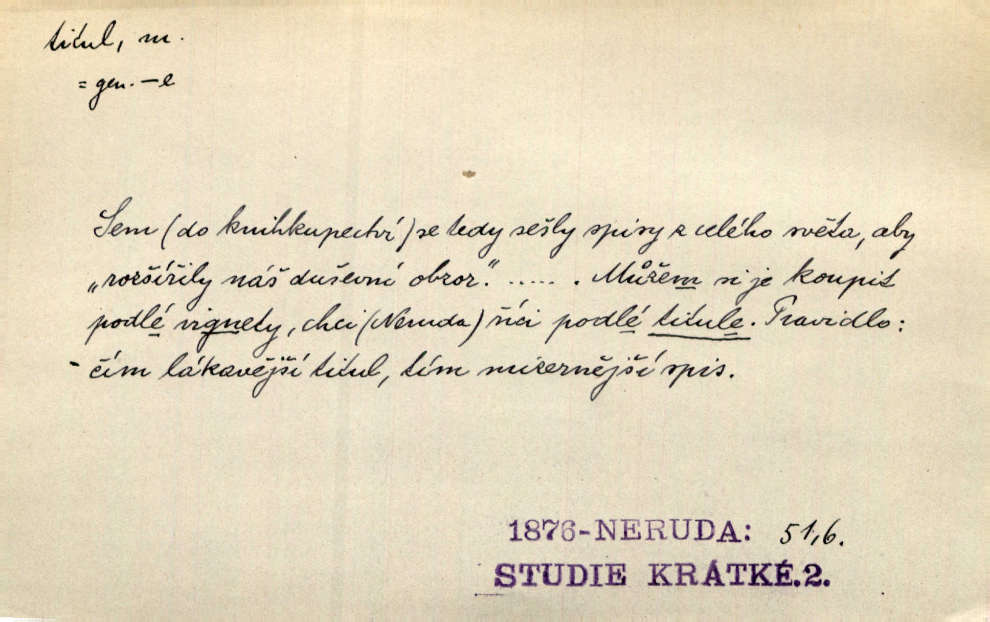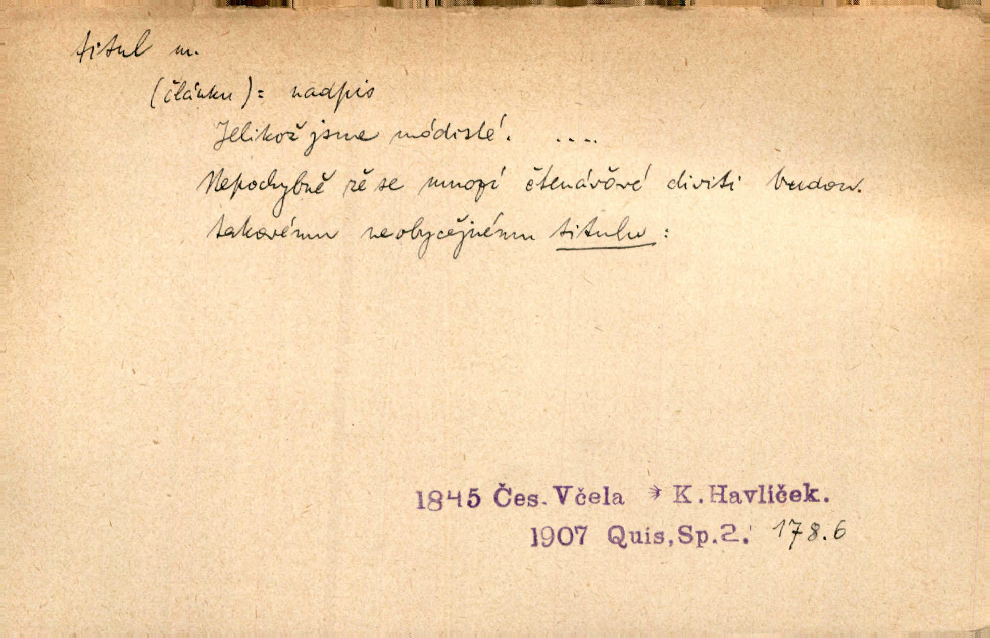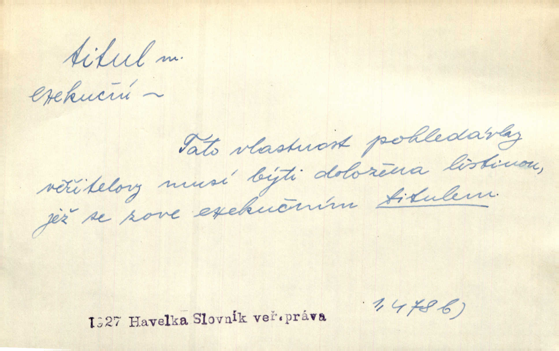 - titul (vysl. ty-), -u m. název hodnosti, postavení nějaké osoby; oslovení, pojmenování nějaké osoby. Albrecht přijal na se titul krále Římského. Pal. Mnozí generálové položili základ k rodovému jmění i k titulům, jichž potomci až dosud užívají. Rez. Znal jen tituly důstojníků a několika jiných pánů. Jir. Když Herites vystoupil z lékárny, oslovil jsem ho titulem „pane lékárníku“. Jir. Prostým občanům lichotilo zasedat u jednoho stolu se vzdělanci s akademickým titulem. Lum. Mladý hodinář řekl to dvorně, po městsku, s titulem „panna“. Jir. Na titul královny plesu zdála se mu činit největší nároky Cilka. V. Mrš. Žert. Již zdaleka přivítal běšínský pán svého čeledína hromobitím titulů, mezi nimiž hulvát a halama nejvyšší hodnosti naznačovaly nadávek. Čech. Při tom dostalo se pateru Amandovi za jeho umění léčebné nejednoho titulu málo lichotivého. Jir. D název, nadpis knihy n. jednotlivých jejích částí, článků a pod. Mezi spisy Chelčického vřaditi lze traktát vepsaný bez zvláštních titulů čili nadpisů. Goll. Titul knihy objasňuje se v předmluvě. Jir. List u desky byl utržen a s ním větší část titulu. Jir. Jej všecko znepokojuje, odtud trefný titul jeho první knihy. Vrch. D odstavec, oddíl v zákonech a p. Každý díl rozpočtu rozdělen je na kapitoly, tituly a pododdělení. Čes. pol. Obsáhlý rozdíl druhý jednající o poměrech právních dělí se na 3 tituly. Ath. D Kniž. důvod, odůvodnění. Konečně přestaly tyto nesmyslné státní výdaje z titulu „naléhavosti poměrů“. Výb. Pěvecká povinnost byla po něm vymáhána z titulu starostenské moci. Kop. Začneme přehlídku díla Alfreda de Vigny básněmi. Nebylo již od počátku pochybnosti, že v nich jest hlavní titul slávy básníkovy i jeho významu. Vrch. Práv. pravní důvod, nárok, právo na něco.