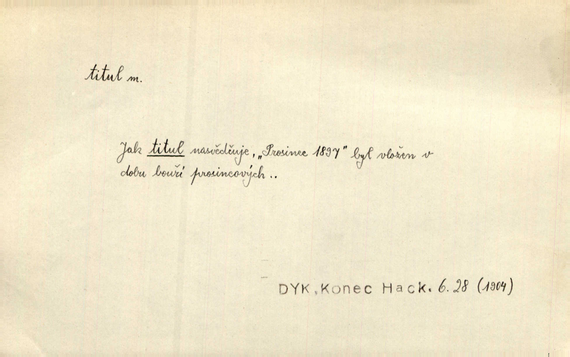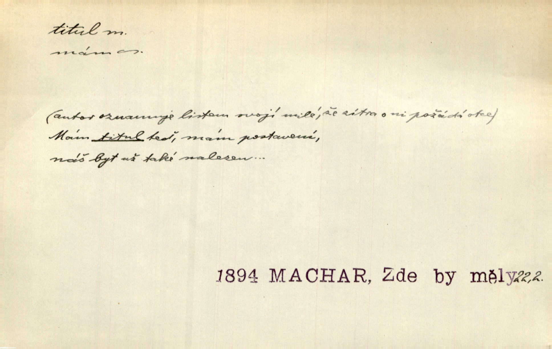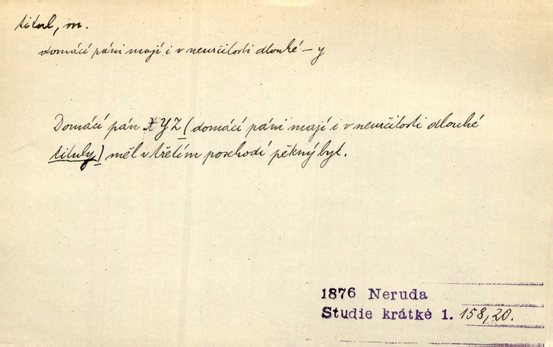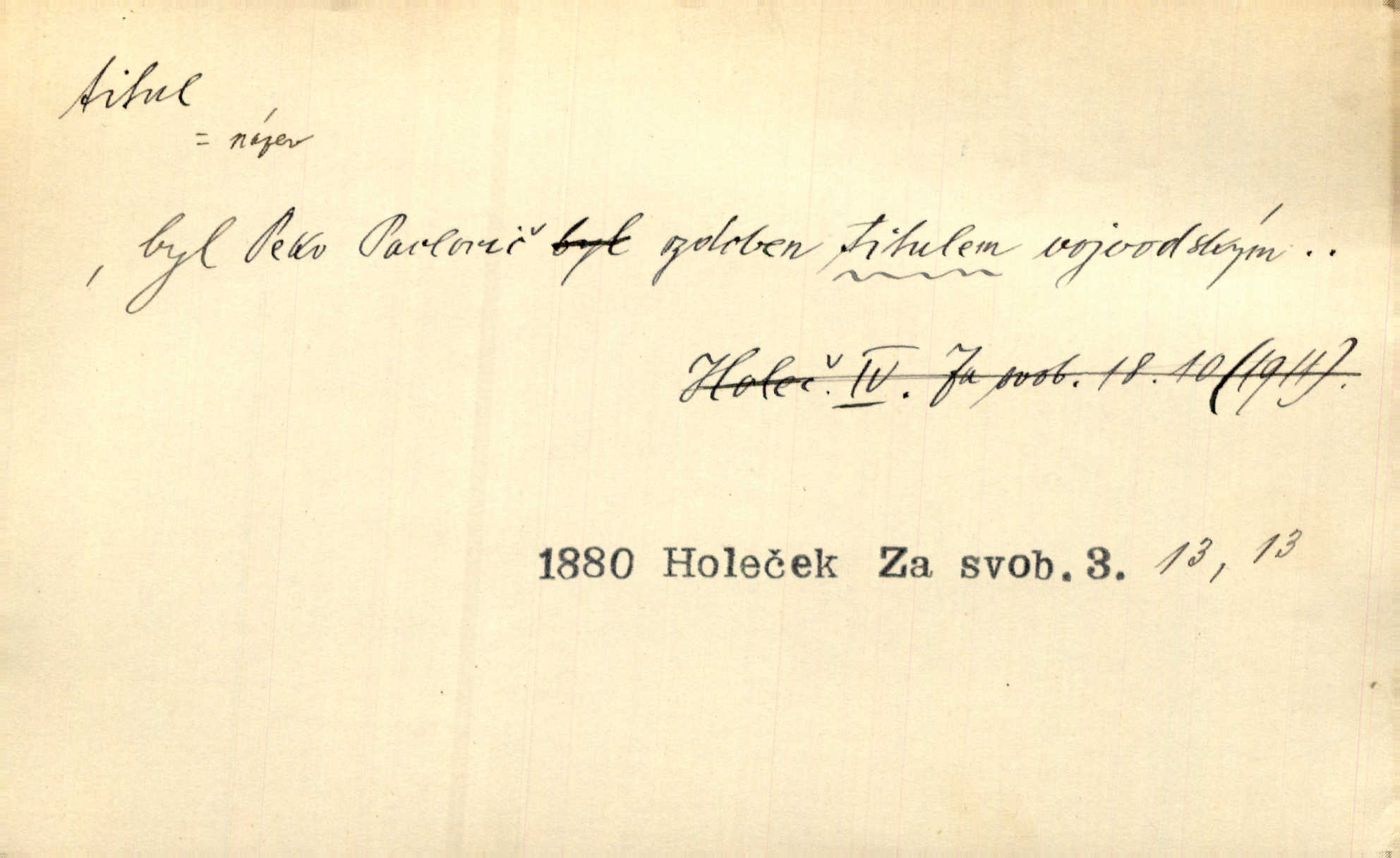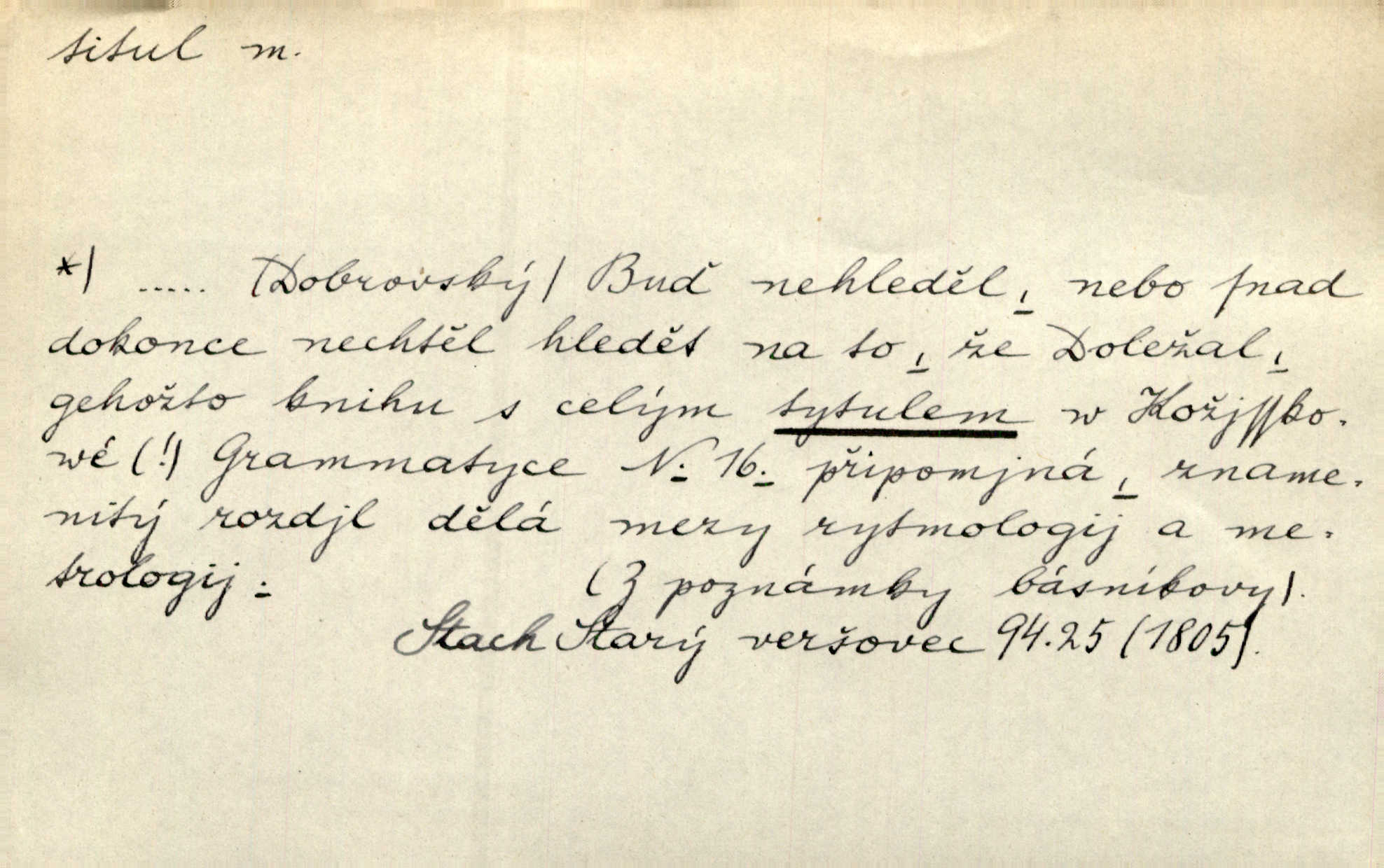 - titul (vysl. ty-), -u m. název hodnosti, postavení nějaké osoby; oslovení, pojmenování nějaké osoby. Albrecht přijal na se titul krále Římského. Pal. Mnozí generálové položili základ k rodovému jmění i k titulům, jichž potomci až dosud užívají. Rez. Znal jen tituly důstojníků a několika jiných pánů. Jir. Když Herites vystoupil z lékárny, oslovil jsem ho titulem „pane lékárníku“. Jir. Prostým občanům lichotilo zasedat u jednoho stolu se vzdělanci s akademickým titulem. Lum. Mladý hodinář řekl to dvorně, po městsku, s titulem „panna“. Jir. Na titul královny plesu zdála se mu činit největší nároky Cilka. V. Mrš. Žert. Již zdaleka přivítal běšínský pán svého čeledína hromobitím titulů, mezi nimiž hulvát a halama nejvyšší hodnosti naznačovaly nadávek. Čech. Při tom dostalo se pateru Amandovi za jeho umění léčebné nejednoho titulu málo lichotivého. Jir. D název, nadpis knihy n. jednotlivých jejích částí, článků a pod. Mezi spisy Chelčického vřaditi lze traktát vepsaný bez zvláštních titulů čili nadpisů. Goll. Titul knihy objasňuje se v předmluvě. Jir. List u desky byl utržen a s ním větší část titulu. Jir. Jej všecko znepokojuje, odtud trefný titul jeho první knihy. Vrch. D odstavec, oddíl v zákonech a p. Každý díl rozpočtu rozdělen je na kapitoly, tituly a pododdělení. Čes. pol. Obsáhlý rozdíl druhý jednající o poměrech právních dělí se na 3 tituly. Ath. D Kniž. důvod, odůvodnění. Konečně přestaly tyto nesmyslné státní výdaje z titulu „naléhavosti poměrů“. Výb. Pěvecká povinnost byla po něm vymáhána z titulu starostenské moci. Kop. Začneme přehlídku díla Alfreda de Vigny básněmi. Nebylo již od počátku pochybnosti, že v nich jest hlavní titul slávy básníkovy i jeho významu. Vrch. Práv. pravní důvod, nárok, právo na něco.