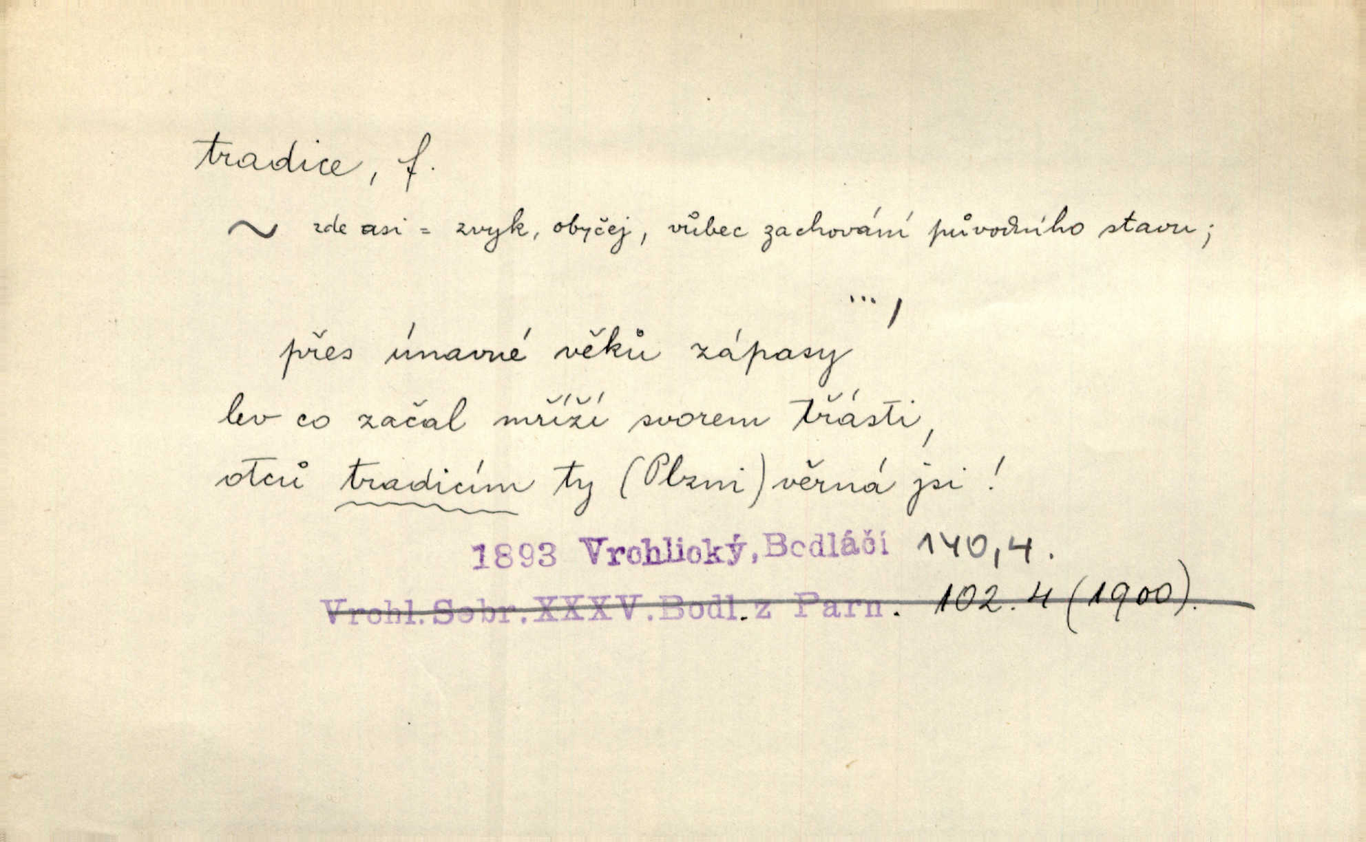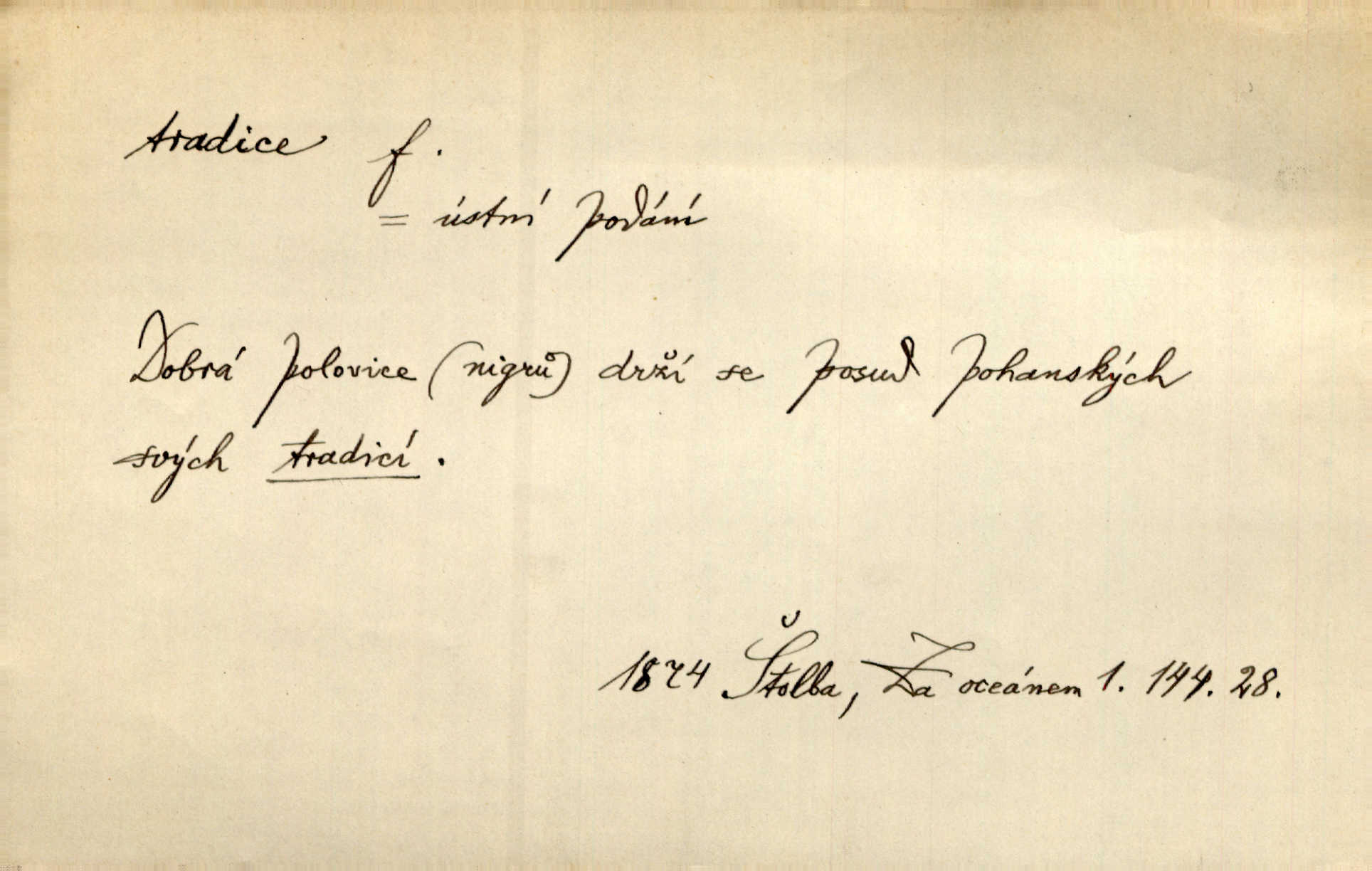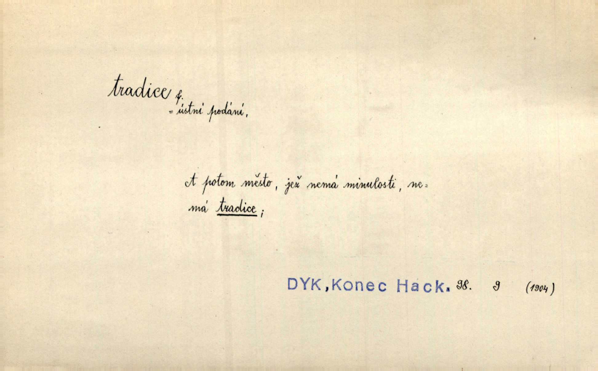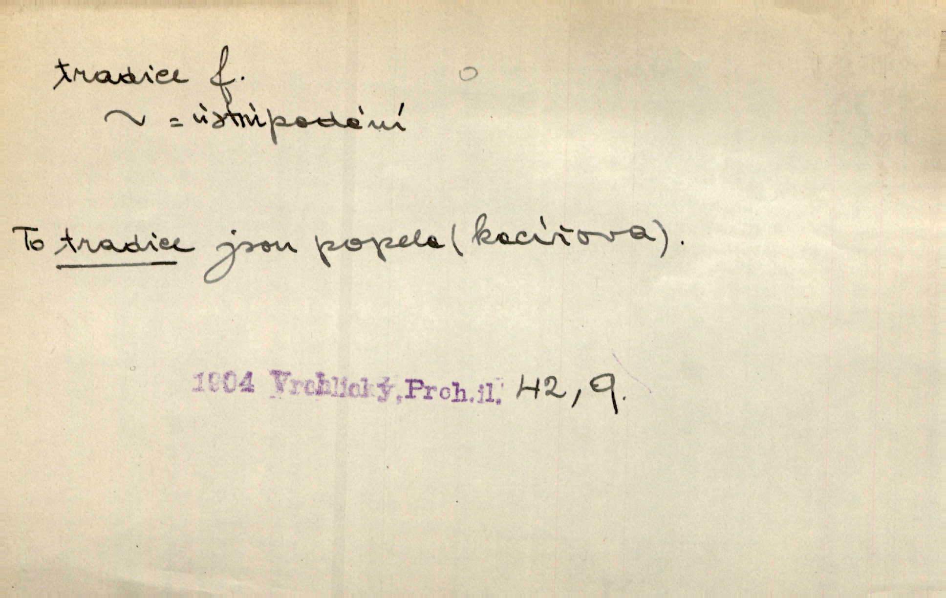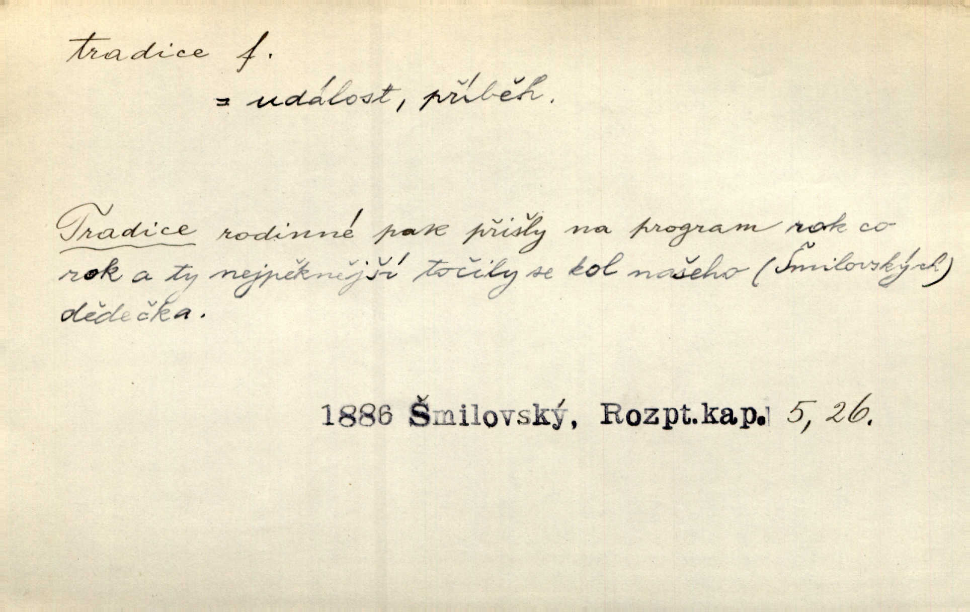 - tradice, -e (zast. tradicie, -ie, tradicí, -í) (vysl. -y-) f. souhrn zvyklostí, obyčejů, názorů, myšlenek a pod. přecházející s jedné generace na druhou a tvořící souvislý vztah k minulosti. Vážila si svých dědů, všechny ty rodinné tradice byly jí posvátny. Herrm. Chtěla, aby se dcera vdala zase do chalupy, do poměrů odpovídajících dávným zdejším tradicím. Šlej. Náš pan Devátý byl narozen již v Čechách, ale tradice a přesvědčení jeho byly po otci i po matce francouzské a republikánské. Staš. [Vlastenci] za žádnou cenu nedali se odtrhnouti od živé tradice svých dob. V. Mrš. [Ariosto byl] příliš svérázný, než aby byl se staral o ducha tradic zašlých věků. Zey. [Matěj z Janova] držev se vždy podstatného základu církevní tradicie, nemohl ovšem důležité váhy míti. Pal. Vzpomeňme, že to byl u nás prvý Jiří Wolker, kdo hlásal návrat k české tradici, zejména k Erbenovi. Čteme. Spor Starých s Moderními rozbil staré tradice. Tille. D Práv. skutečné n. formální odevzdání věci movité, jímž se převádí její vlastnictví s jedné osoby na druhou. D zprávy přenášené obyč. ústně s pokolení na pokolení, ústní podání. Malé obezděné návrší jest dle tradice bývalá vinice sv. Vácslava. Zap. Ti [tři králové] z dálných přišli zemí, ale jiné jich bylo vzezření, než z doby dětství a z běžných si je tradic představujem. Vrch. [Pulkava] také první jal se kontrolovati tradicí českou starými německými zprávami. Pal. Círk. [u katolíků] pramen křesťanského učení, který není obsažen v Písmě svatém, ústní podání.