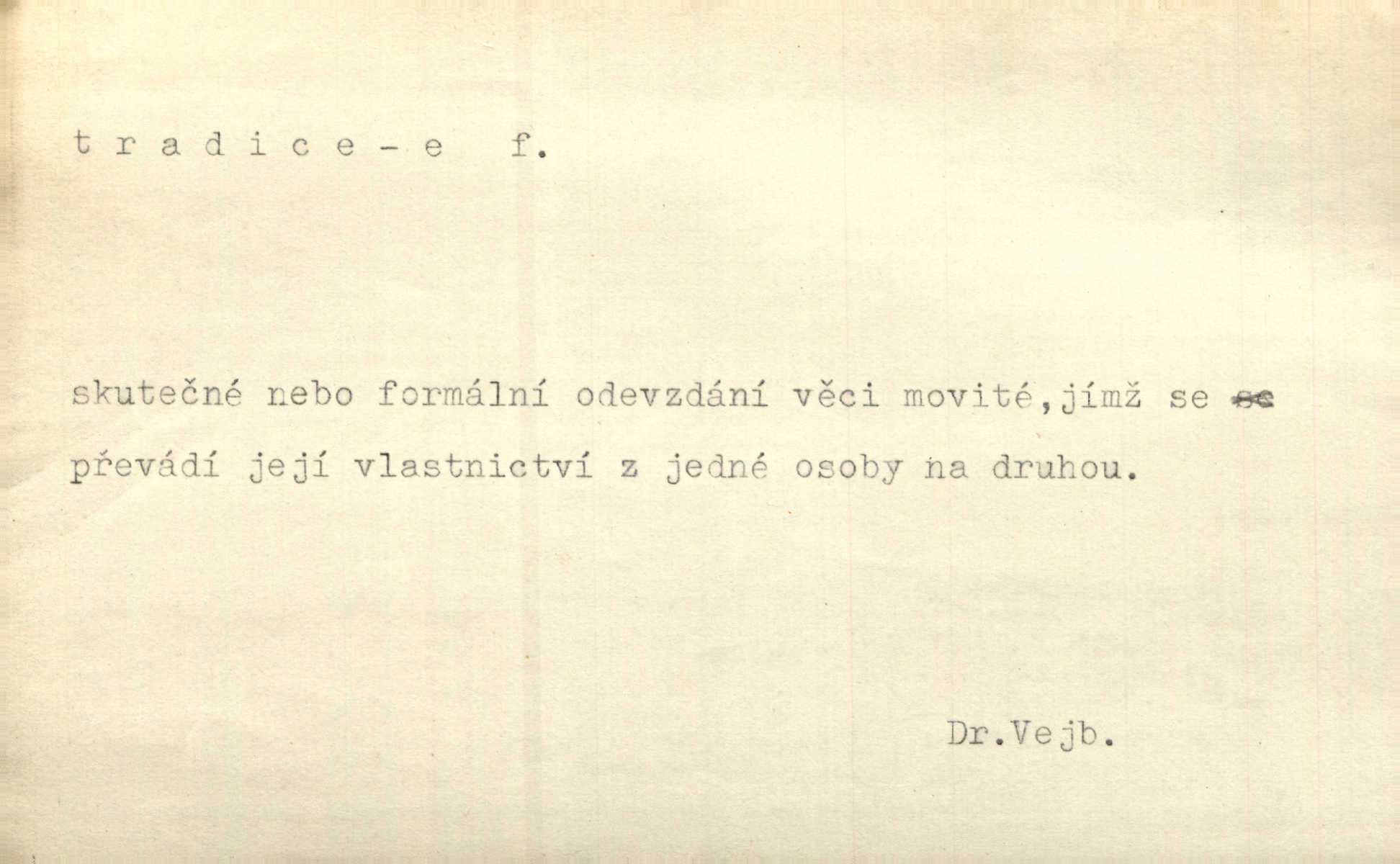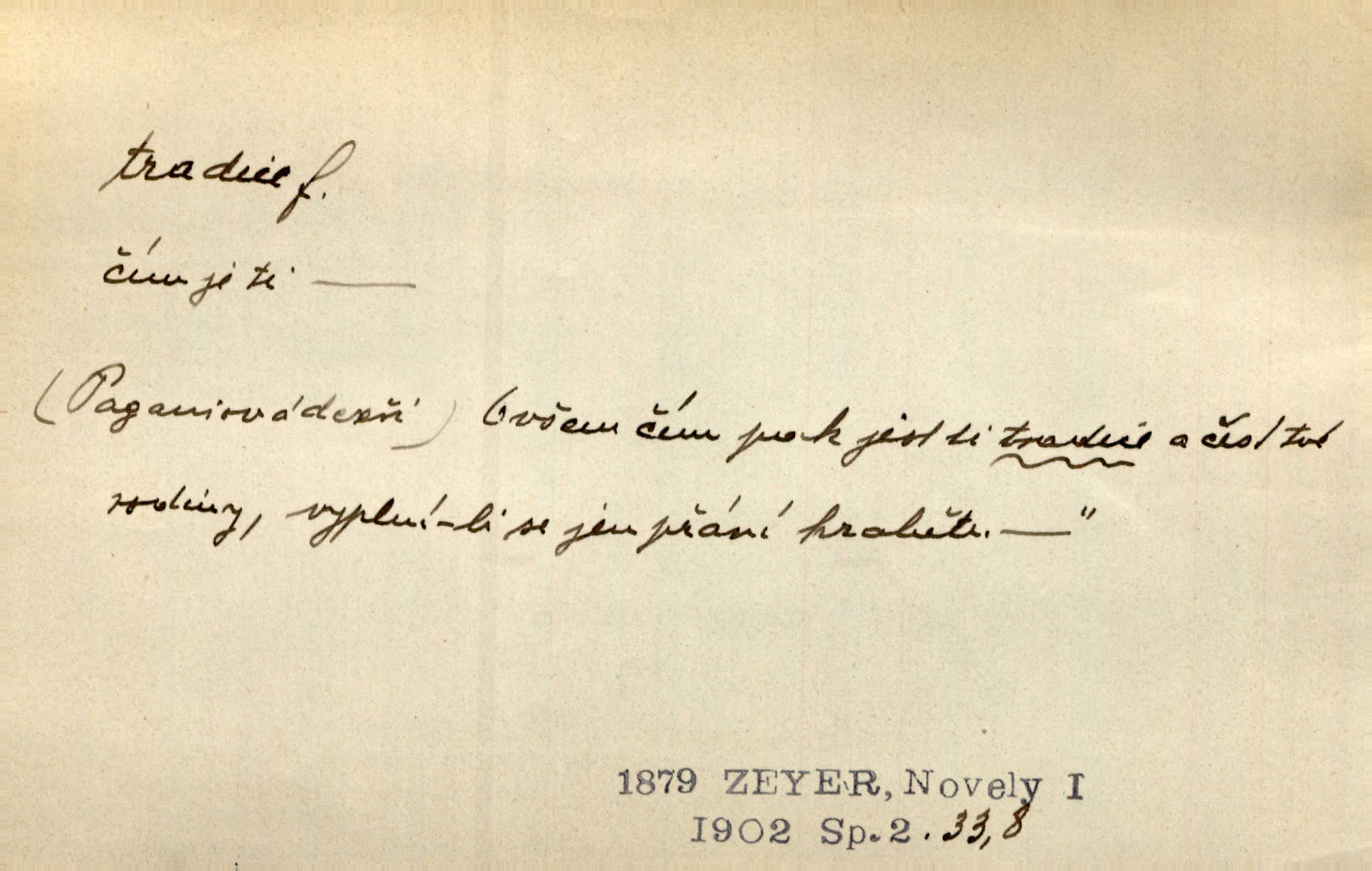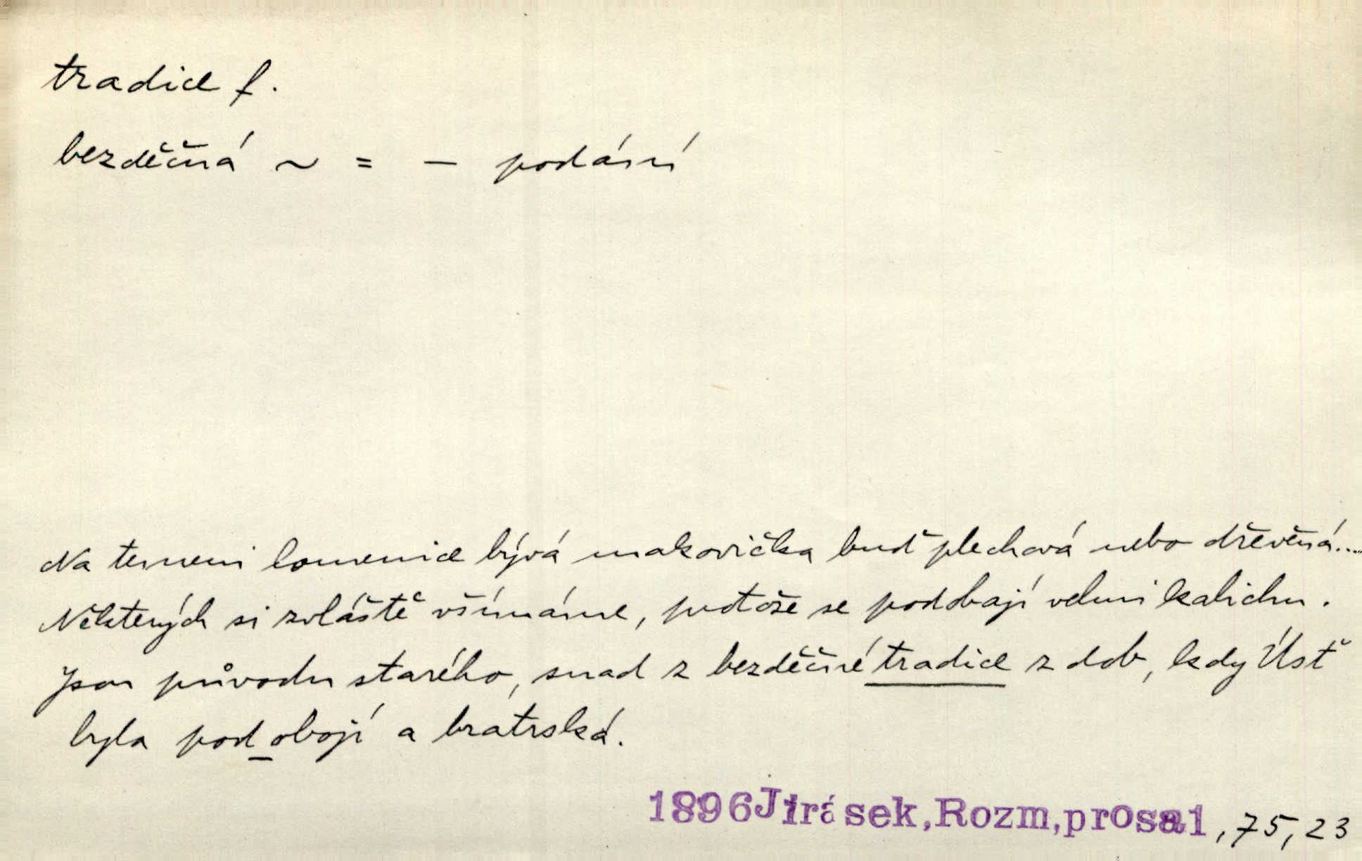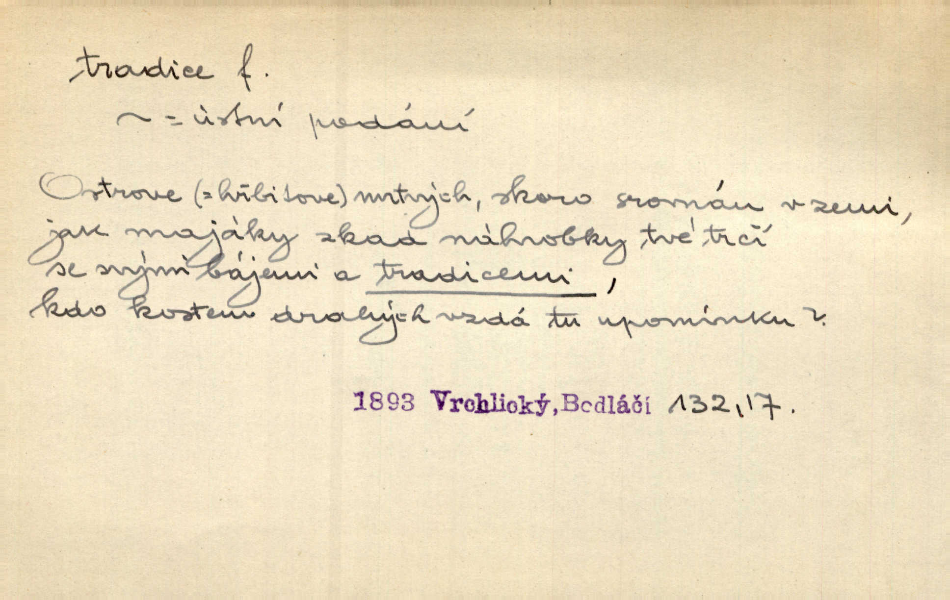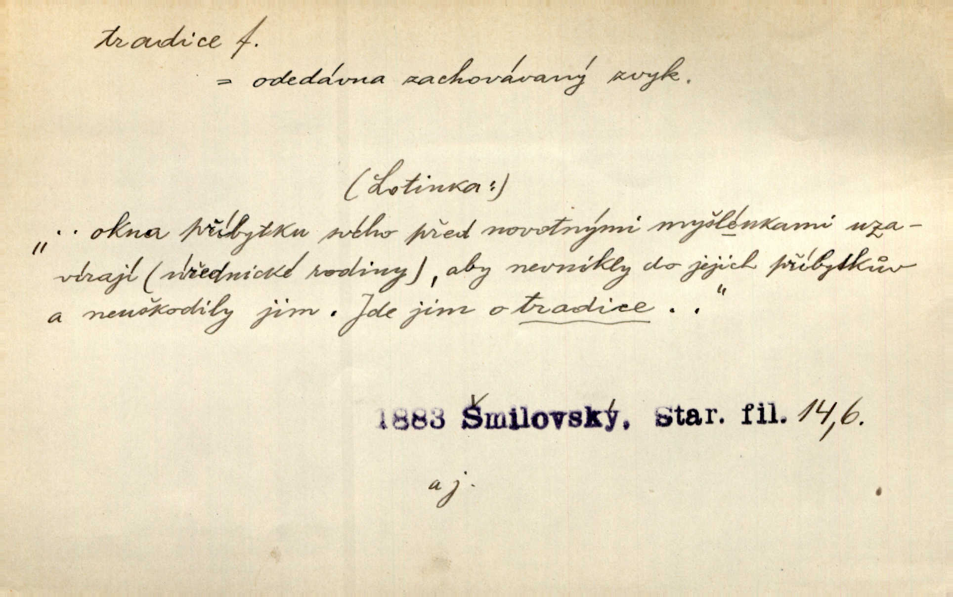 - tradice, -e (zast. tradicie, -ie, tradicí, -í) (vysl. -y-) f. souhrn zvyklostí, obyčejů, názorů, myšlenek a pod. přecházející s jedné generace na druhou a tvořící souvislý vztah k minulosti. Vážila si svých dědů, všechny ty rodinné tradice byly jí posvátny. Herrm. Chtěla, aby se dcera vdala zase do chalupy, do poměrů odpovídajících dávným zdejším tradicím. Šlej. Náš pan Devátý byl narozen již v Čechách, ale tradice a přesvědčení jeho byly po otci i po matce francouzské a republikánské. Staš. [Vlastenci] za žádnou cenu nedali se odtrhnouti od živé tradice svých dob. V. Mrš. [Ariosto byl] příliš svérázný, než aby byl se staral o ducha tradic zašlých věků. Zey. [Matěj z Janova] držev se vždy podstatného základu církevní tradicie, nemohl ovšem důležité váhy míti. Pal. Vzpomeňme, že to byl u nás prvý Jiří Wolker, kdo hlásal návrat k české tradici, zejména k Erbenovi. Čteme. Spor Starých s Moderními rozbil staré tradice. Tille. D Práv. skutečné n. formální odevzdání věci movité, jímž se převádí její vlastnictví s jedné osoby na druhou. D zprávy přenášené obyč. ústně s pokolení na pokolení, ústní podání. Malé obezděné návrší jest dle tradice bývalá vinice sv. Vácslava. Zap. Ti [tři králové] z dálných přišli zemí, ale jiné jich bylo vzezření, než z doby dětství a z běžných si je tradic představujem. Vrch. [Pulkava] také první jal se kontrolovati tradicí českou starými německými zprávami. Pal. Círk. [u katolíků] pramen křesťanského učení, který není obsažen v Písmě svatém, ústní podání.