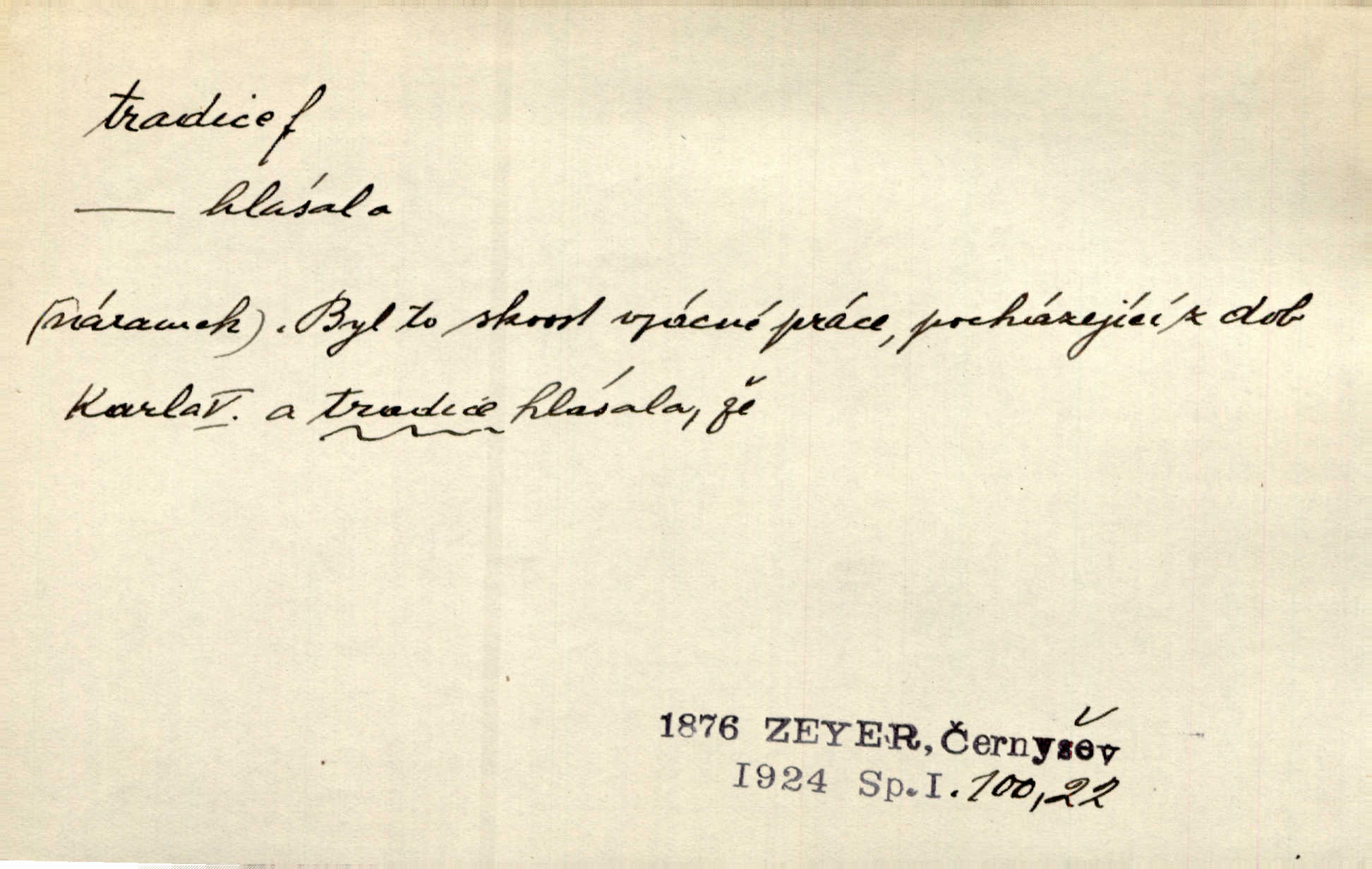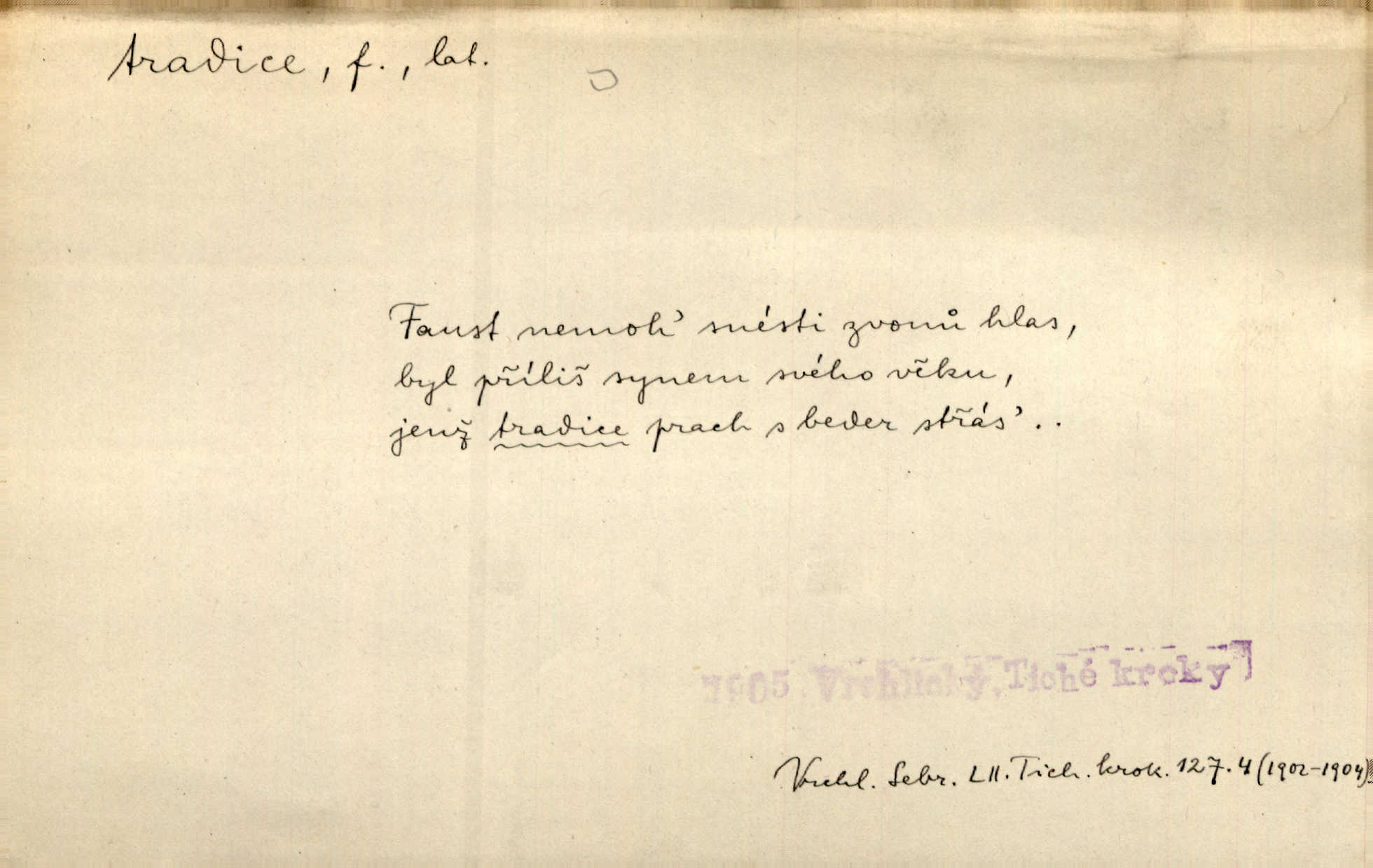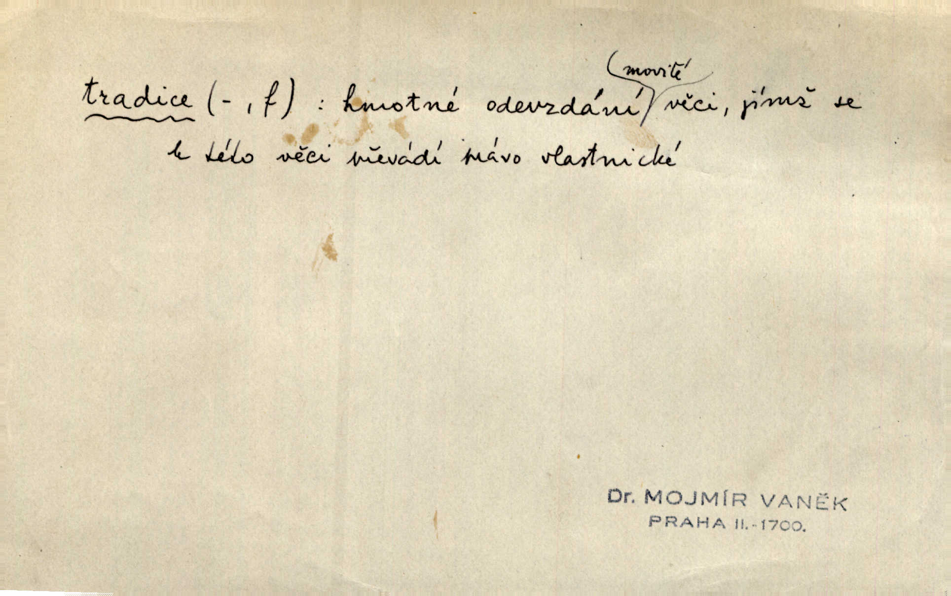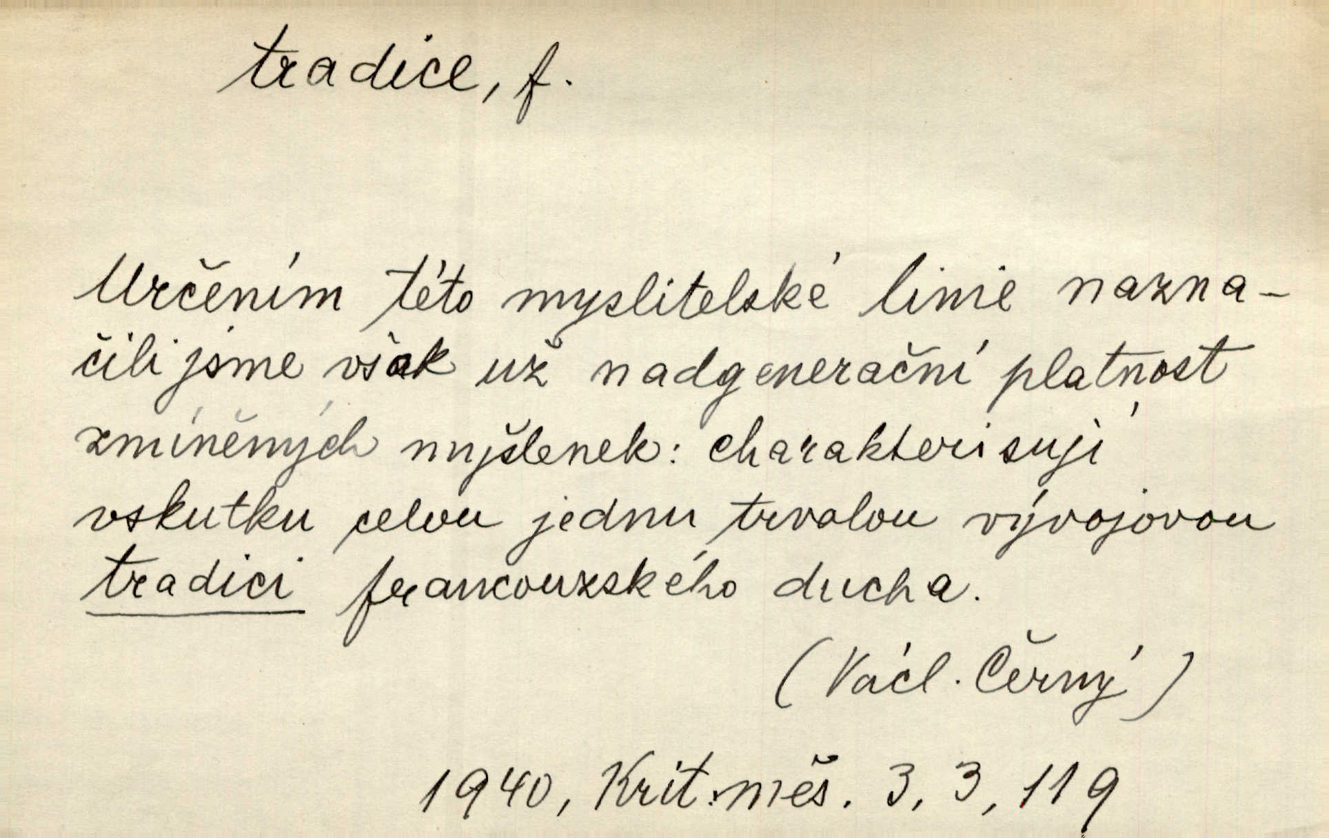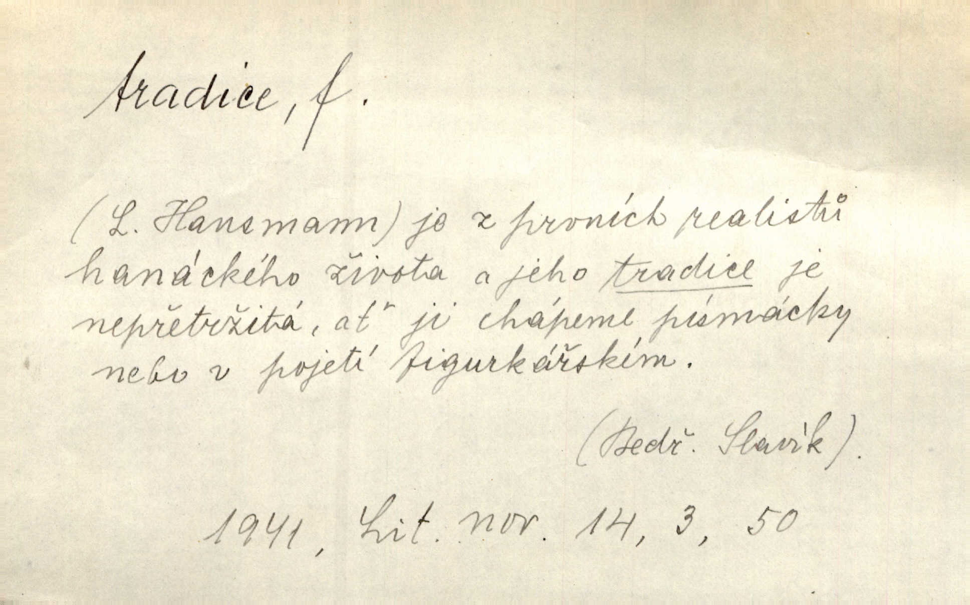 - tradice, -e (zast. tradicie, -ie, tradicí, -í) (vysl. -y-) f. souhrn zvyklostí, obyčejů, názorů, myšlenek a pod. přecházející s jedné generace na druhou a tvořící souvislý vztah k minulosti. Vážila si svých dědů, všechny ty rodinné tradice byly jí posvátny. Herrm. Chtěla, aby se dcera vdala zase do chalupy, do poměrů odpovídajících dávným zdejším tradicím. Šlej. Náš pan Devátý byl narozen již v Čechách, ale tradice a přesvědčení jeho byly po otci i po matce francouzské a republikánské. Staš. [Vlastenci] za žádnou cenu nedali se odtrhnouti od živé tradice svých dob. V. Mrš. [Ariosto byl] příliš svérázný, než aby byl se staral o ducha tradic zašlých věků. Zey. [Matěj z Janova] držev se vždy podstatného základu církevní tradicie, nemohl ovšem důležité váhy míti. Pal. Vzpomeňme, že to byl u nás prvý Jiří Wolker, kdo hlásal návrat k české tradici, zejména k Erbenovi. Čteme. Spor Starých s Moderními rozbil staré tradice. Tille. D Práv. skutečné n. formální odevzdání věci movité, jímž se převádí její vlastnictví s jedné osoby na druhou. D zprávy přenášené obyč. ústně s pokolení na pokolení, ústní podání. Malé obezděné návrší jest dle tradice bývalá vinice sv. Vácslava. Zap. Ti [tři králové] z dálných přišli zemí, ale jiné jich bylo vzezření, než z doby dětství a z běžných si je tradic představujem. Vrch. [Pulkava] také první jal se kontrolovati tradicí českou starými německými zprávami. Pal. Círk. [u katolíků] pramen křesťanského učení, který není obsažen v Písmě svatém, ústní podání.