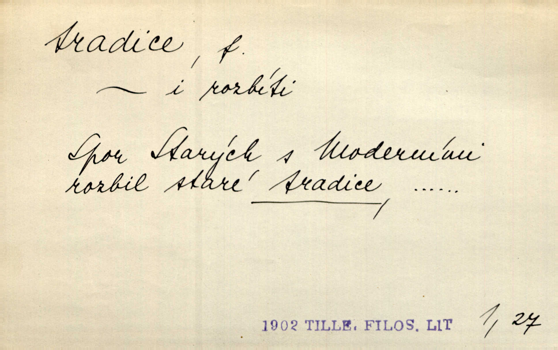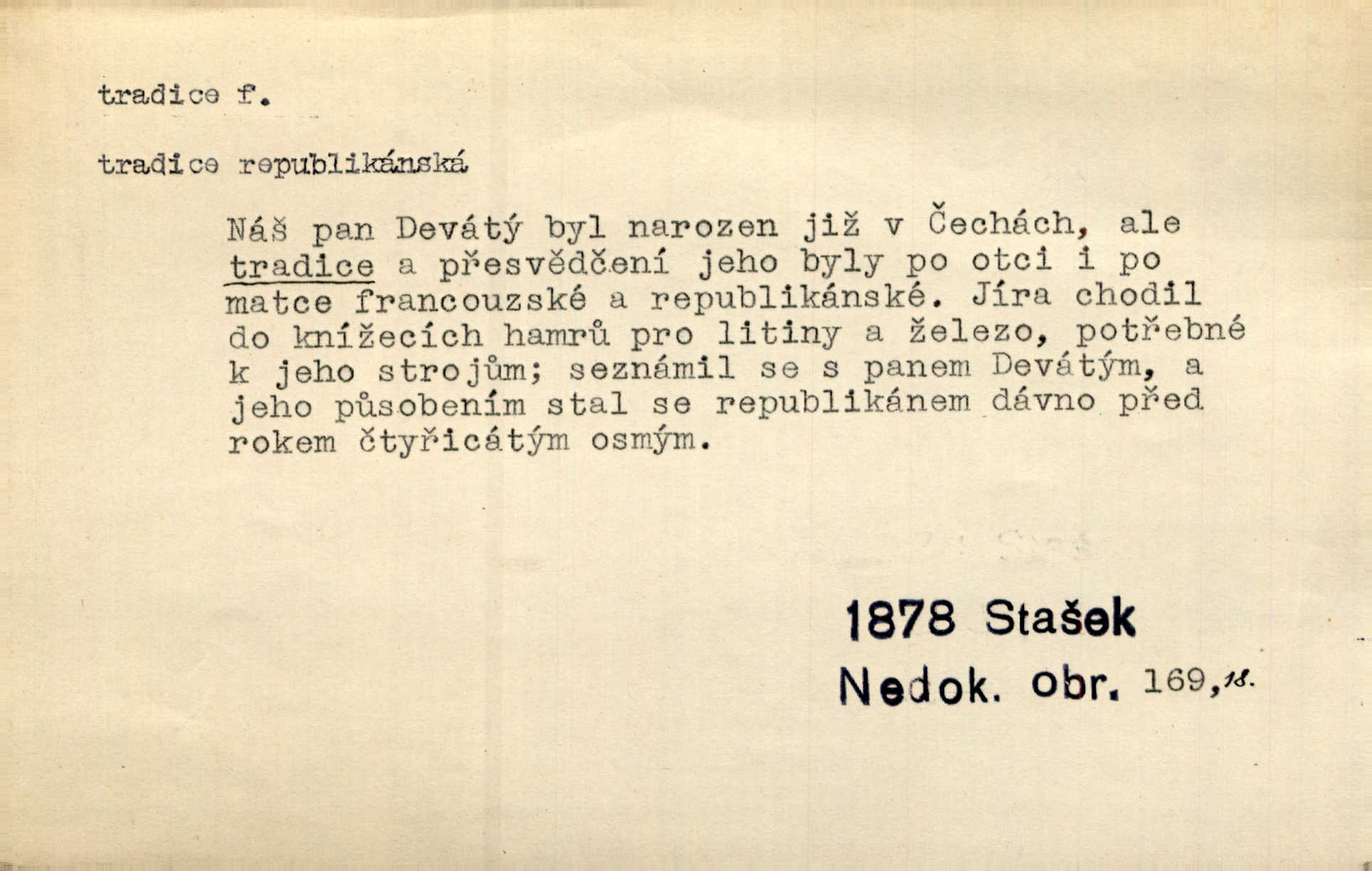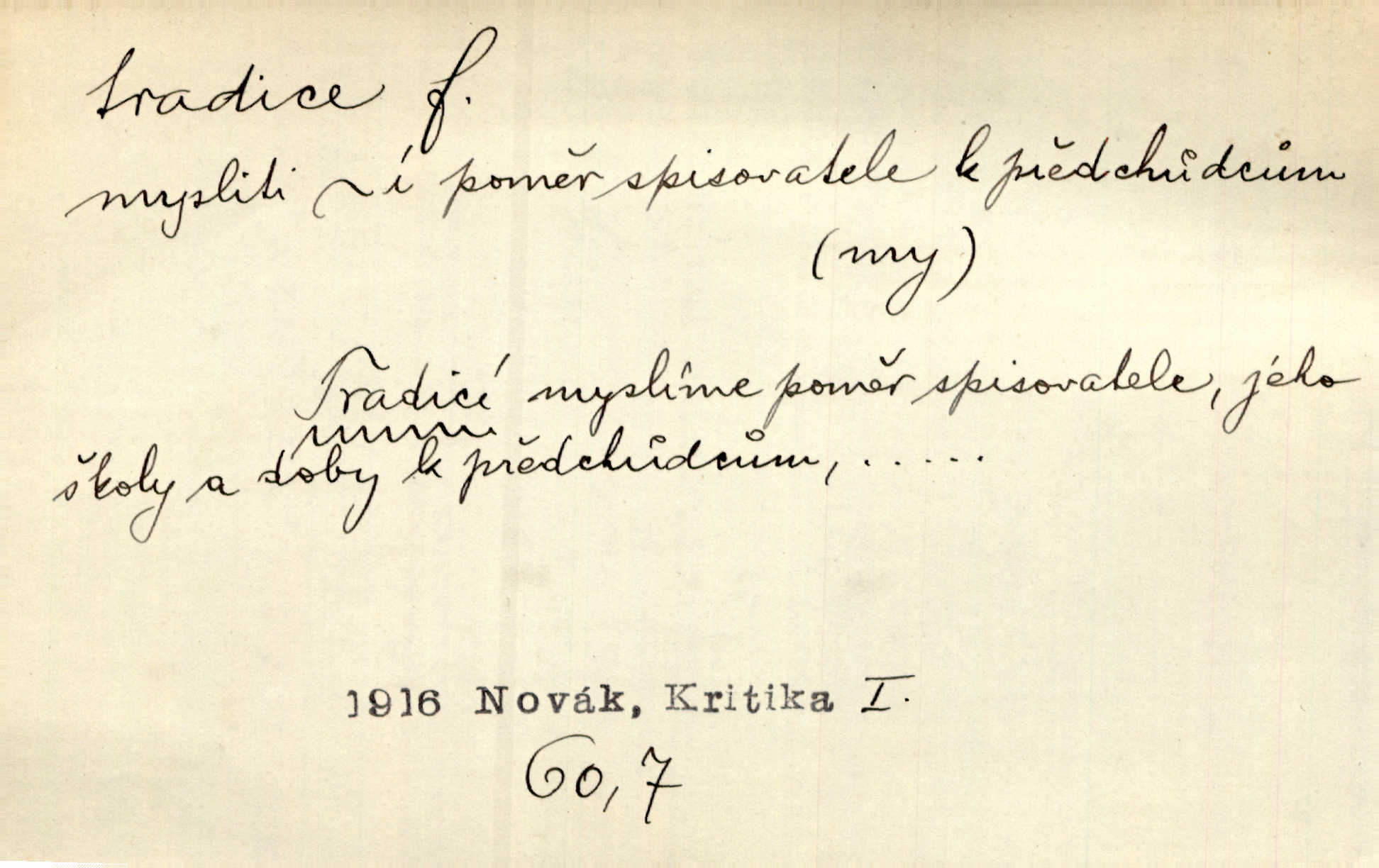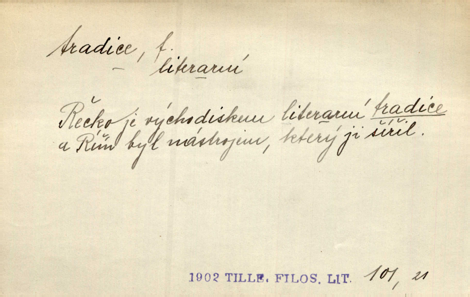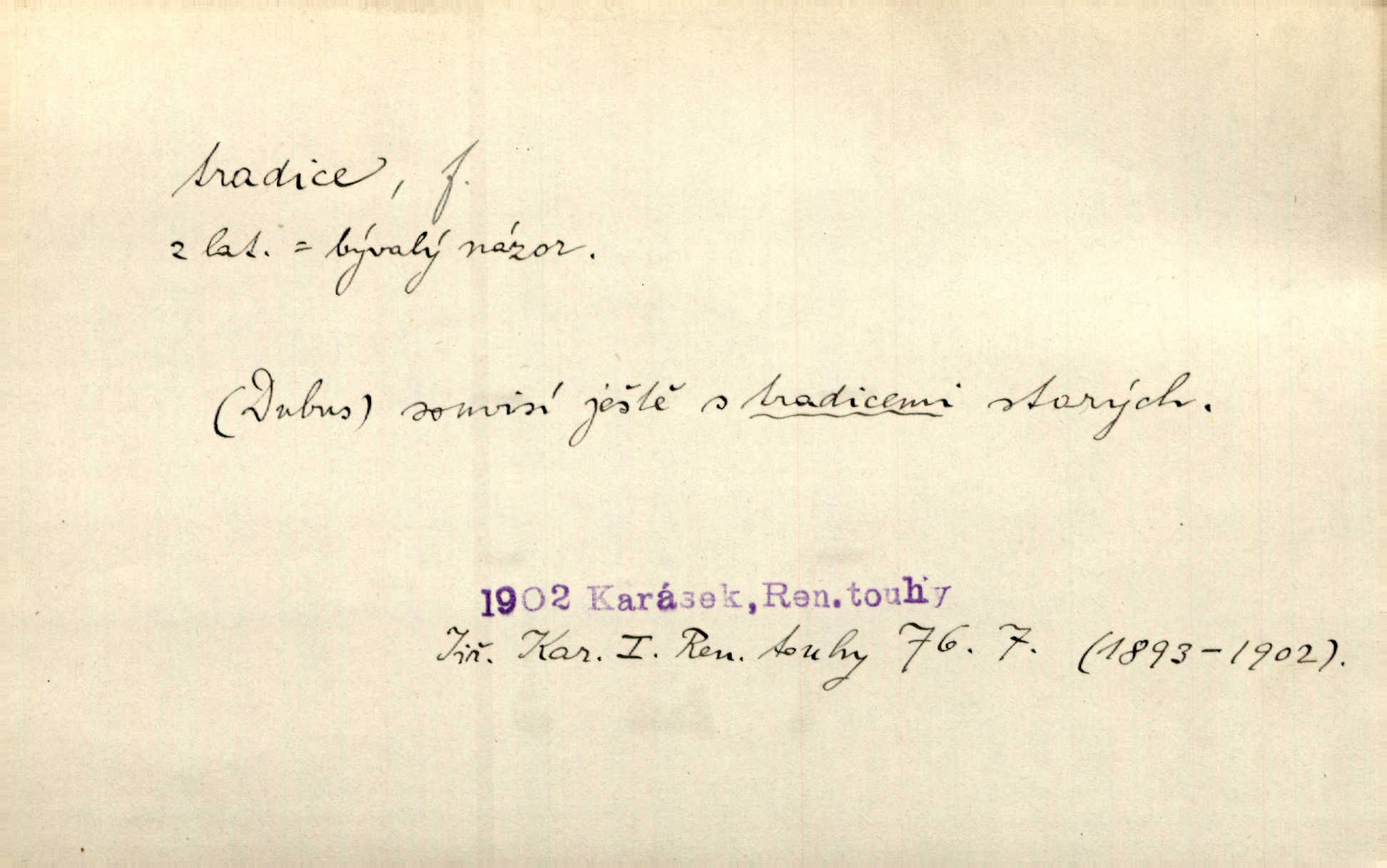 - tradice, -e (zast. tradicie, -ie, tradicí, -í) (vysl. -y-) f. souhrn zvyklostí, obyčejů, názorů, myšlenek a pod. přecházející s jedné generace na druhou a tvořící souvislý vztah k minulosti. Vážila si svých dědů, všechny ty rodinné tradice byly jí posvátny. Herrm. Chtěla, aby se dcera vdala zase do chalupy, do poměrů odpovídajících dávným zdejším tradicím. Šlej. Náš pan Devátý byl narozen již v Čechách, ale tradice a přesvědčení jeho byly po otci i po matce francouzské a republikánské. Staš. [Vlastenci] za žádnou cenu nedali se odtrhnouti od živé tradice svých dob. V. Mrš. [Ariosto byl] příliš svérázný, než aby byl se staral o ducha tradic zašlých věků. Zey. [Matěj z Janova] držev se vždy podstatného základu církevní tradicie, nemohl ovšem důležité váhy míti. Pal. Vzpomeňme, že to byl u nás prvý Jiří Wolker, kdo hlásal návrat k české tradici, zejména k Erbenovi. Čteme. Spor Starých s Moderními rozbil staré tradice. Tille. D Práv. skutečné n. formální odevzdání věci movité, jímž se převádí její vlastnictví s jedné osoby na druhou. D zprávy přenášené obyč. ústně s pokolení na pokolení, ústní podání. Malé obezděné návrší jest dle tradice bývalá vinice sv. Vácslava. Zap. Ti [tři králové] z dálných přišli zemí, ale jiné jich bylo vzezření, než z doby dětství a z běžných si je tradic představujem. Vrch. [Pulkava] také první jal se kontrolovati tradicí českou starými německými zprávami. Pal. Círk. [u katolíků] pramen křesťanského učení, který není obsažen v Písmě svatém, ústní podání.