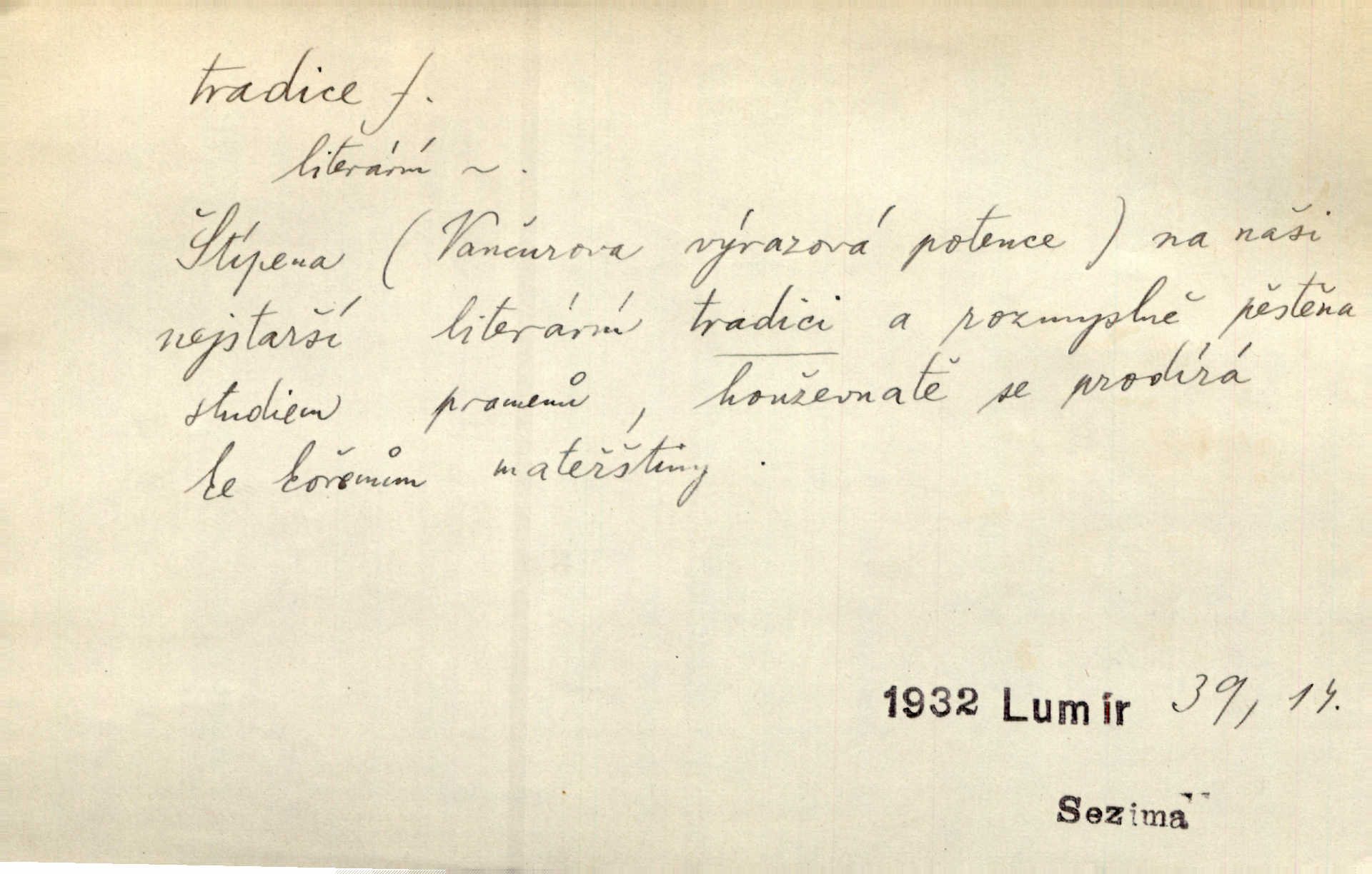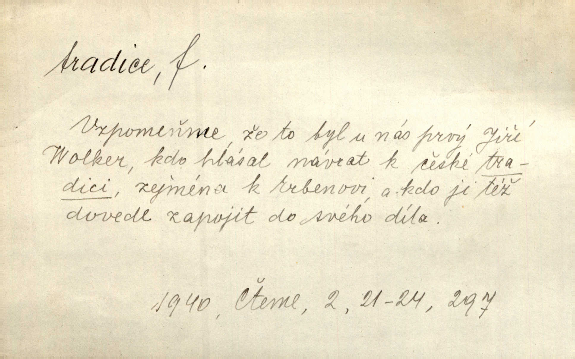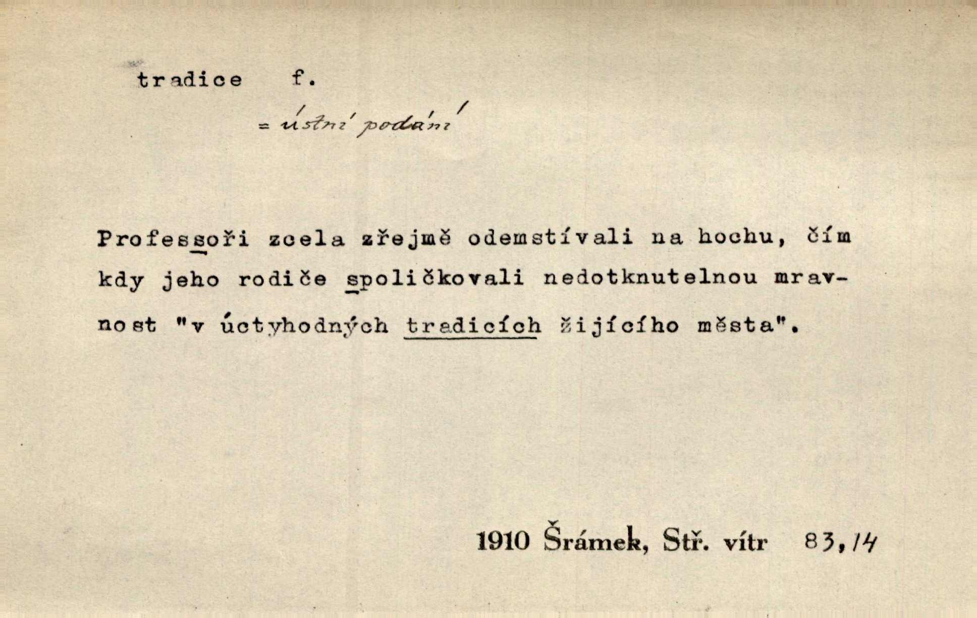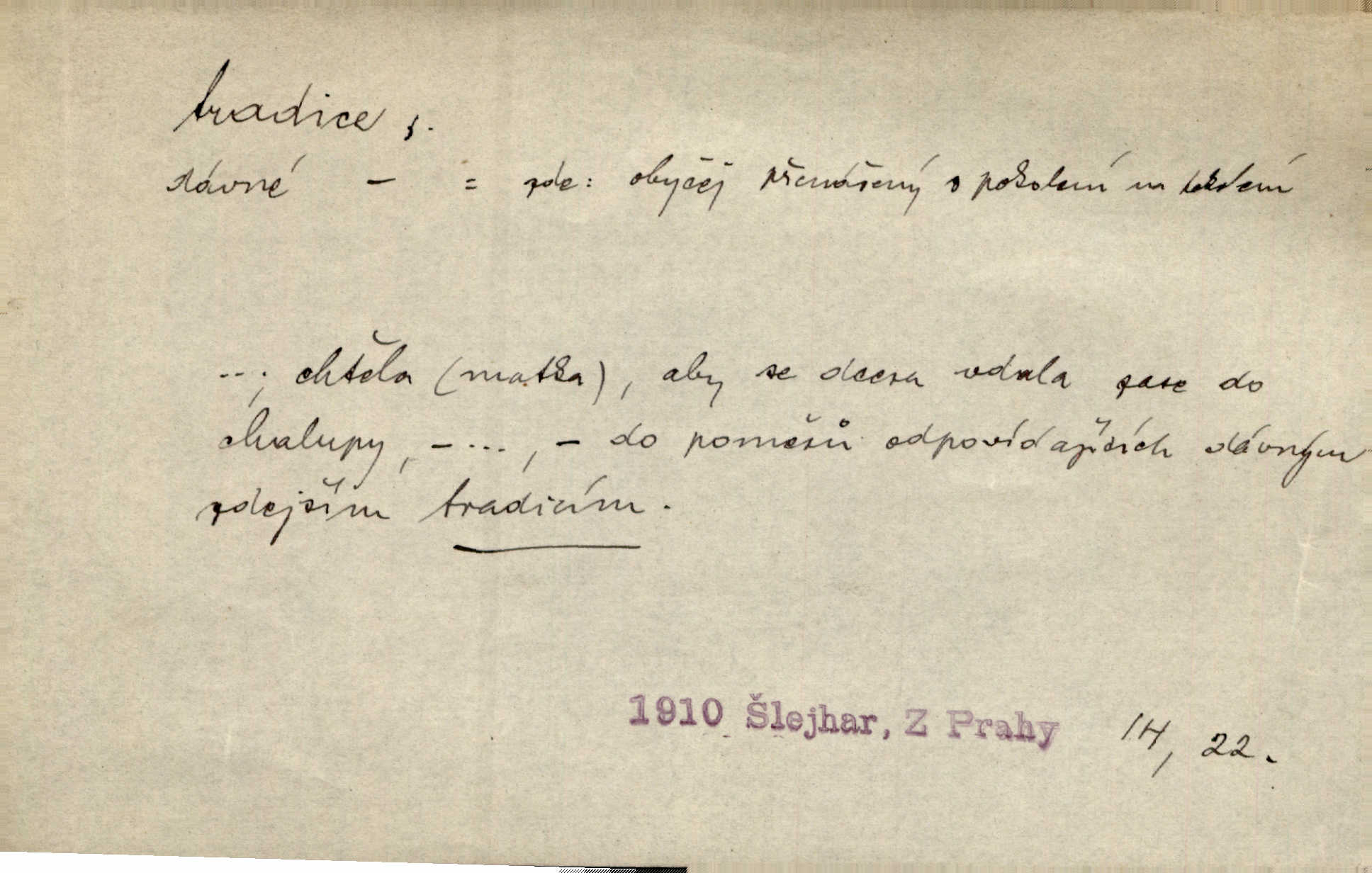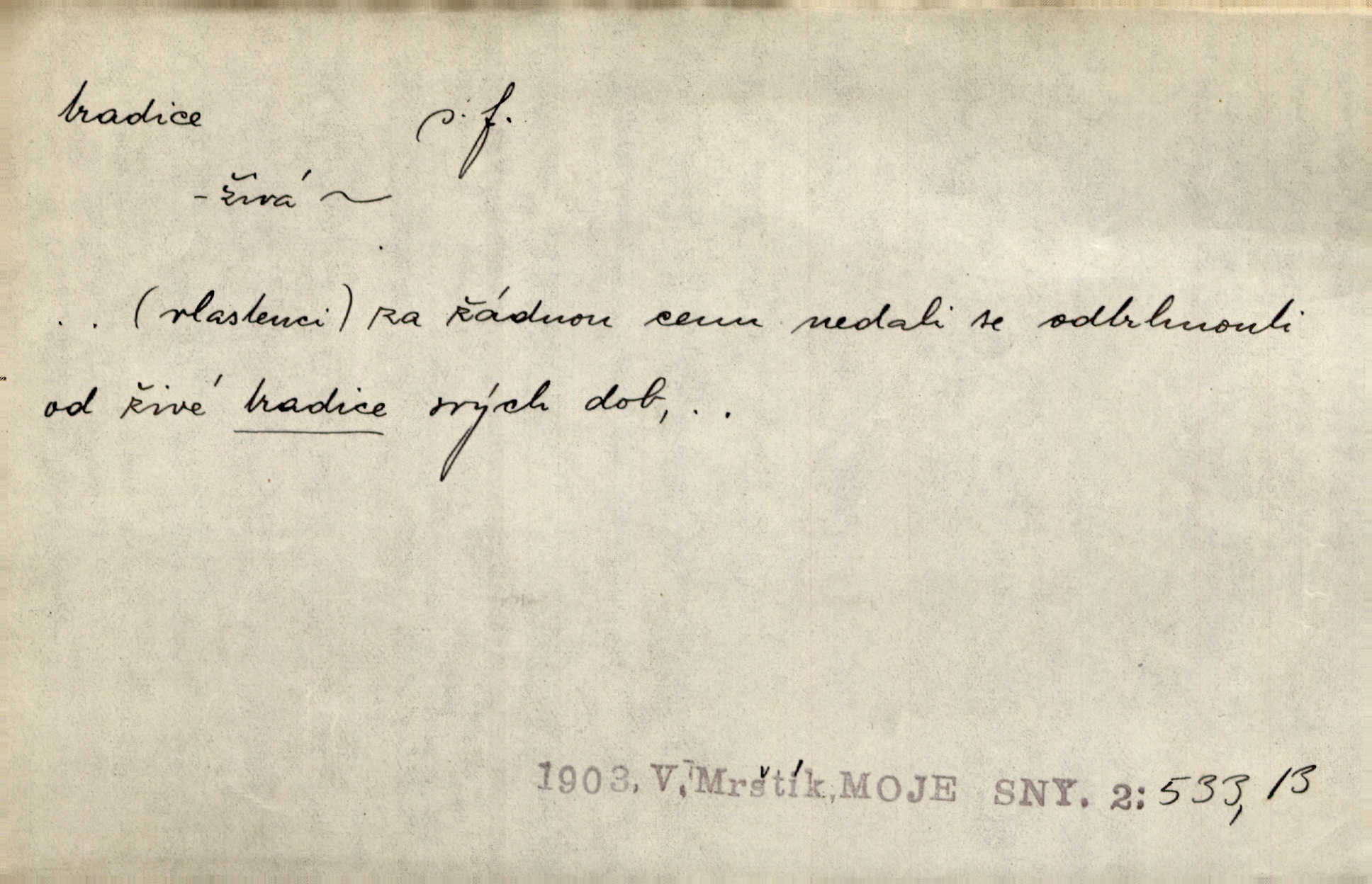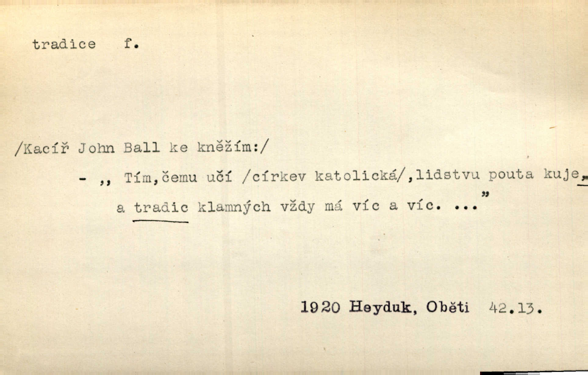 - tradice, -e (zast. tradicie, -ie, tradicí, -í) (vysl. -y-) f. souhrn zvyklostí, obyčejů, názorů, myšlenek a pod. přecházející s jedné generace na druhou a tvořící souvislý vztah k minulosti. Vážila si svých dědů, všechny ty rodinné tradice byly jí posvátny. Herrm. Chtěla, aby se dcera vdala zase do chalupy, do poměrů odpovídajících dávným zdejším tradicím. Šlej. Náš pan Devátý byl narozen již v Čechách, ale tradice a přesvědčení jeho byly po otci i po matce francouzské a republikánské. Staš. [Vlastenci] za žádnou cenu nedali se odtrhnouti od živé tradice svých dob. V. Mrš. [Ariosto byl] příliš svérázný, než aby byl se staral o ducha tradic zašlých věků. Zey. [Matěj z Janova] držev se vždy podstatného základu církevní tradicie, nemohl ovšem důležité váhy míti. Pal. Vzpomeňme, že to byl u nás prvý Jiří Wolker, kdo hlásal návrat k české tradici, zejména k Erbenovi. Čteme. Spor Starých s Moderními rozbil staré tradice. Tille. D Práv. skutečné n. formální odevzdání věci movité, jímž se převádí její vlastnictví s jedné osoby na druhou. D zprávy přenášené obyč. ústně s pokolení na pokolení, ústní podání. Malé obezděné návrší jest dle tradice bývalá vinice sv. Vácslava. Zap. Ti [tři králové] z dálných přišli zemí, ale jiné jich bylo vzezření, než z doby dětství a z běžných si je tradic představujem. Vrch. [Pulkava] také první jal se kontrolovati tradicí českou starými německými zprávami. Pal. Círk. [u katolíků] pramen křesťanského učení, který není obsažen v Písmě svatém, ústní podání.